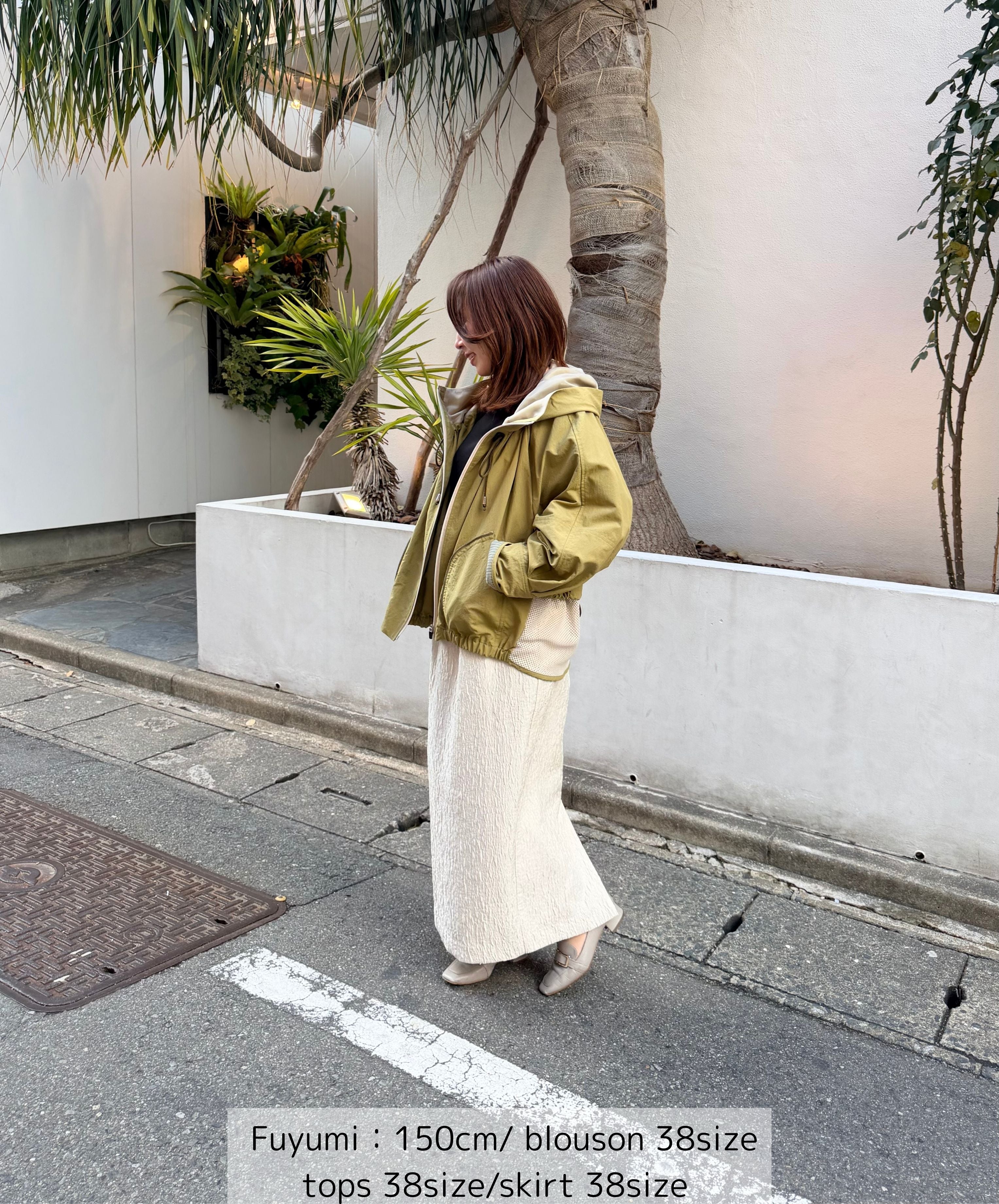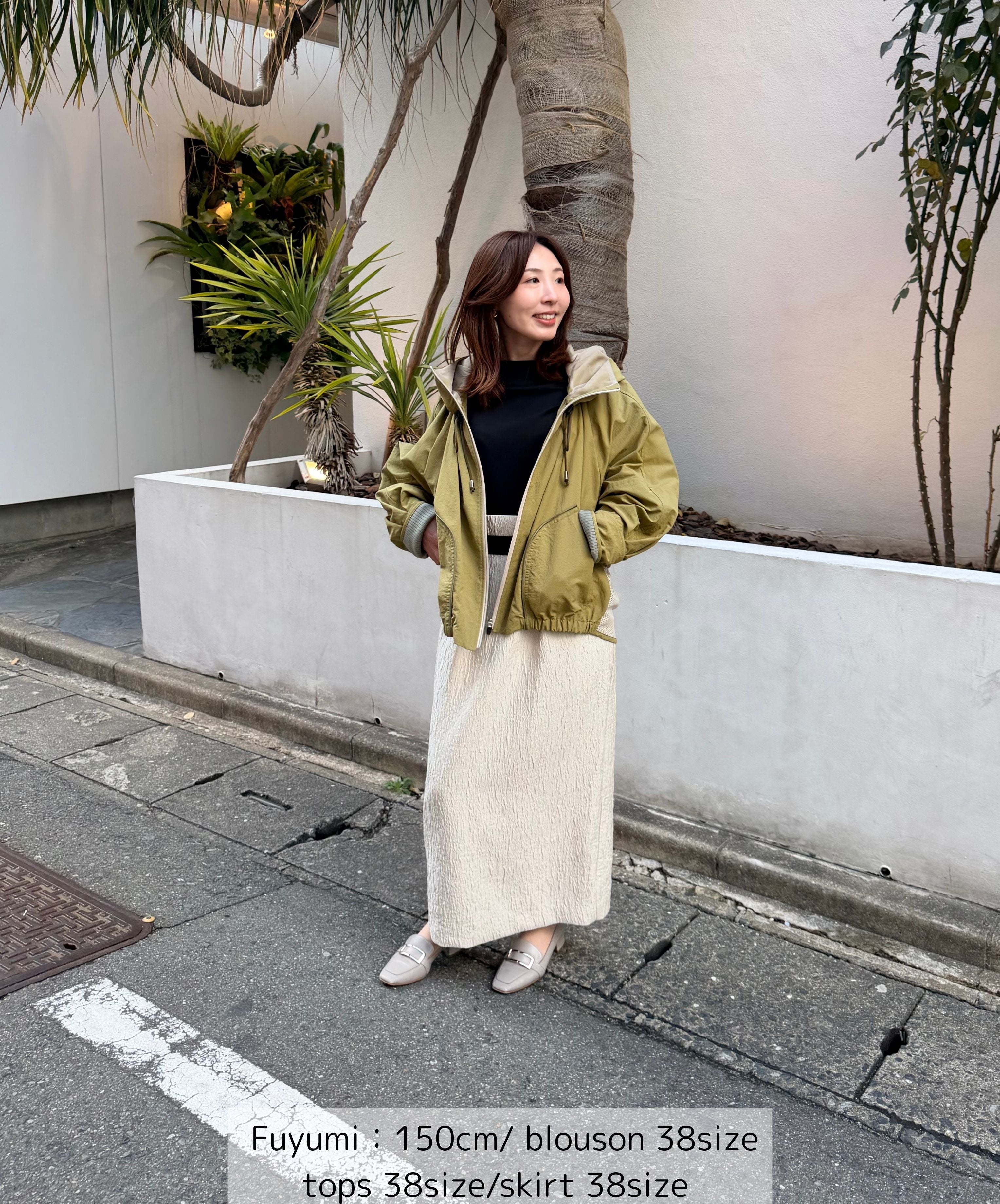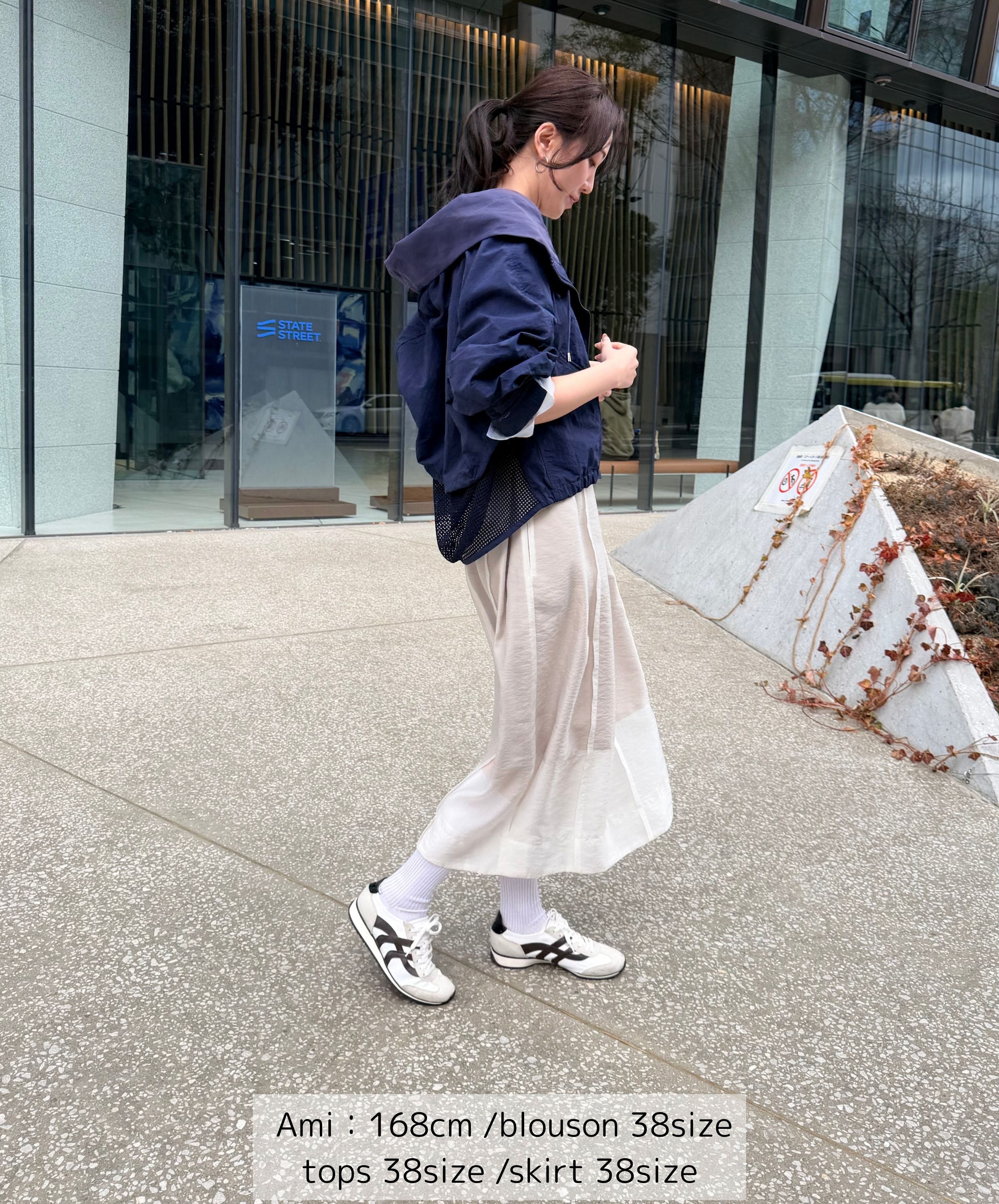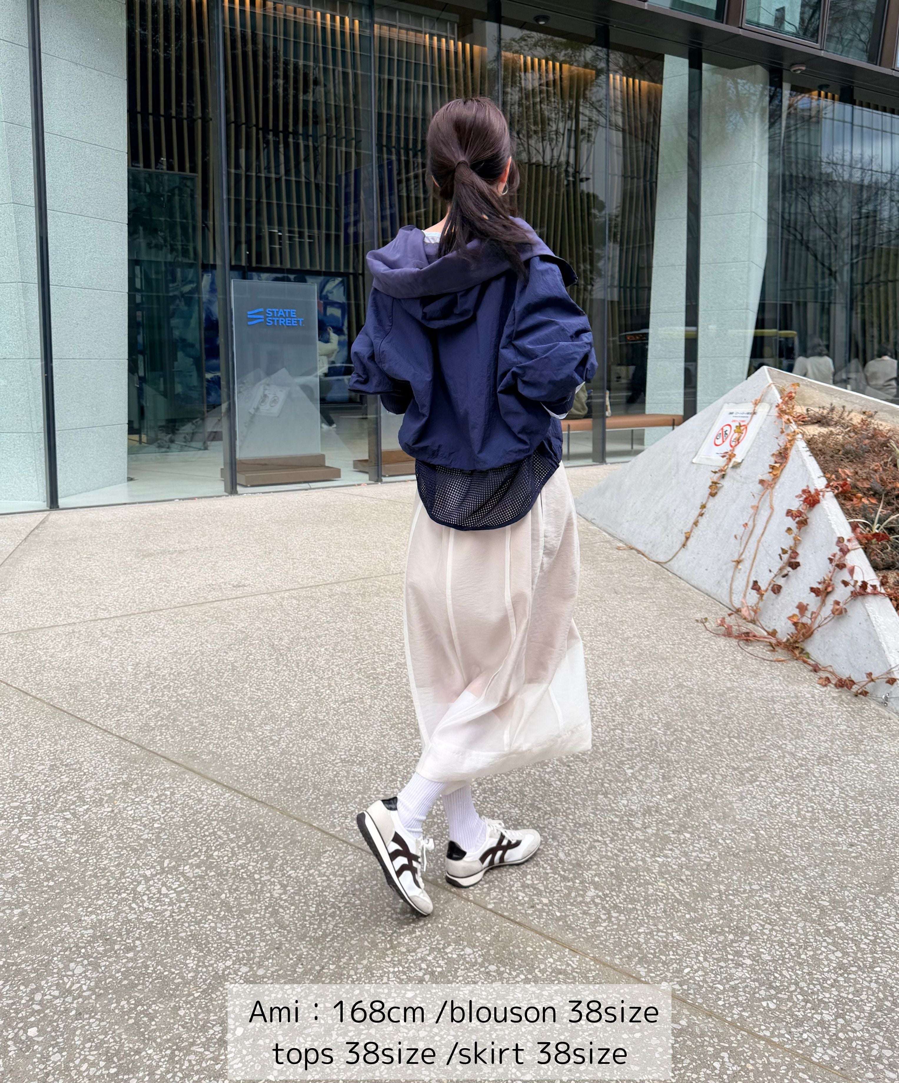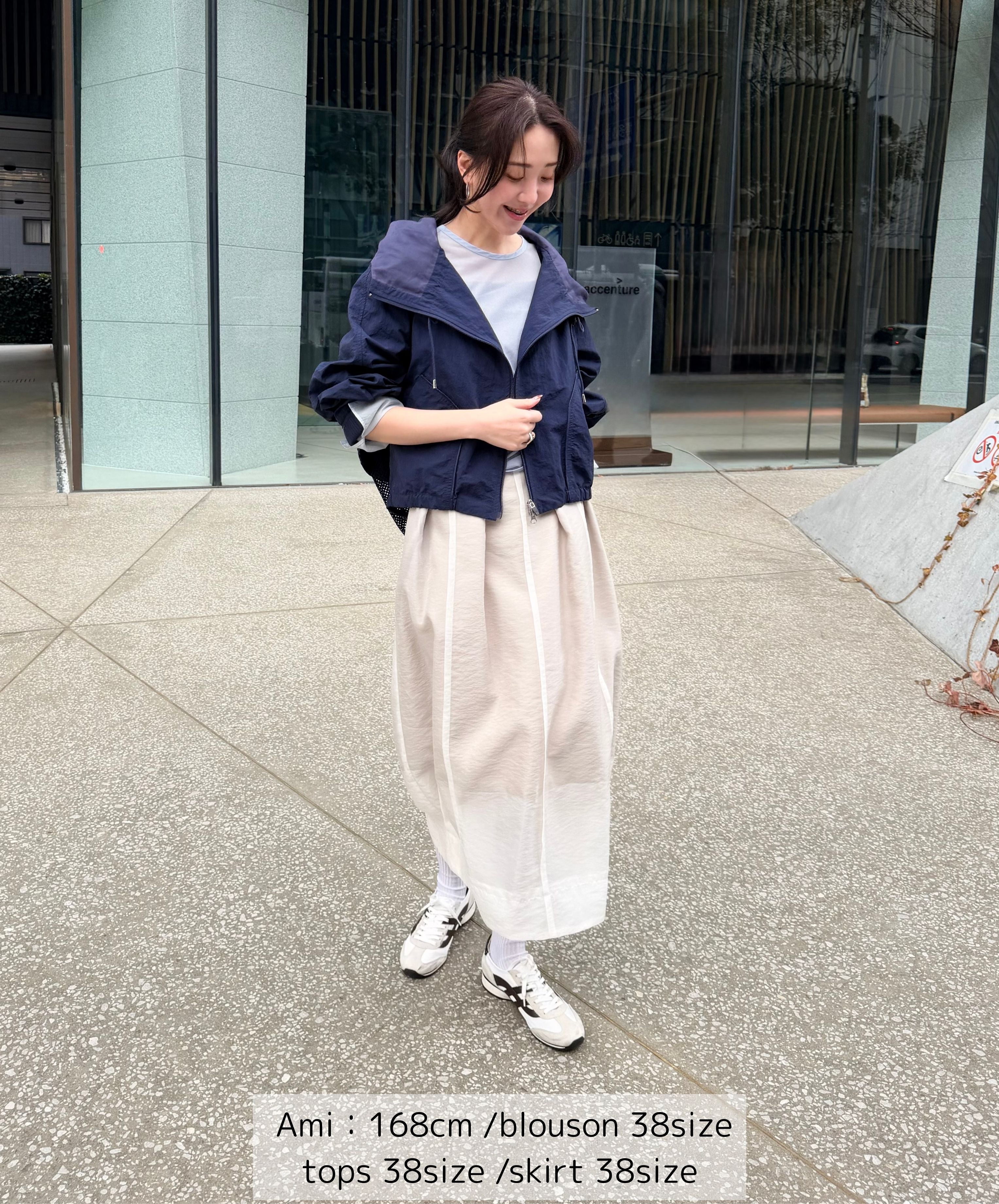 着心地も見た目にも軽い印象のフード型ブルゾン。こだわりのフードには透けが美しいオーガンジーをドッキングし、顔まわりに春らしい透明感をプラスし、繊細で柔らかな印象に見せてくれます。表地には光沢のないナイロンを使用し、スポーティになりすぎないデザインに。撥水加工が施され汚れがつきにくいのもアクティブに着回せるポイントです。首元のギャザーや丸みのある袖も相まってフェミニンなムードで、ドルマンスリーブ型でアームホールが大きいため、厚手のインナーなど、かさばりやごわつきも気にせず着用いただけます。