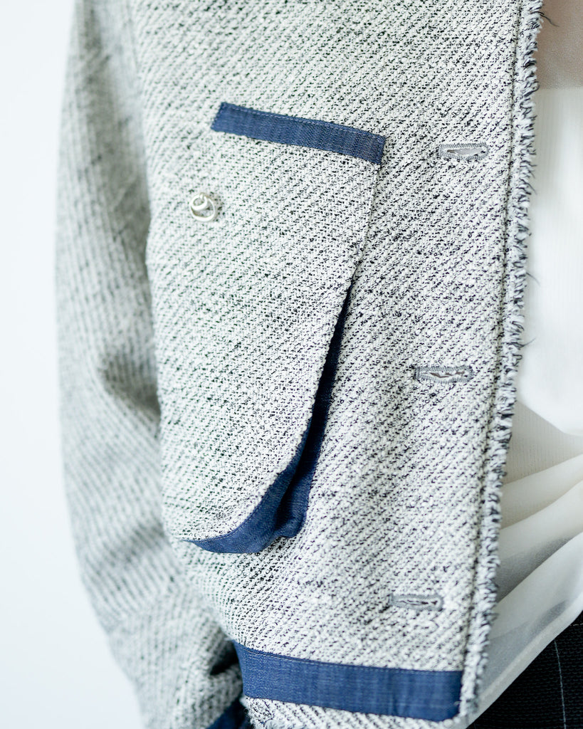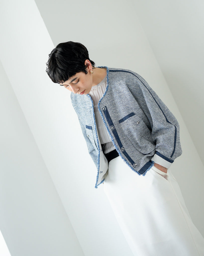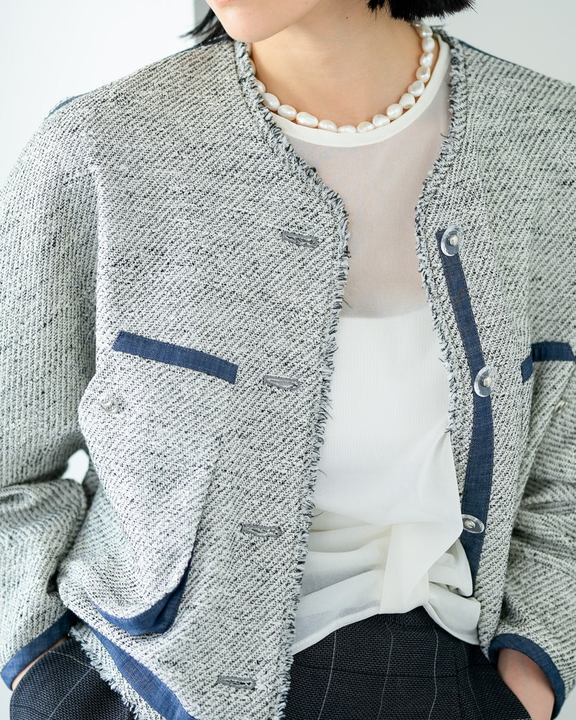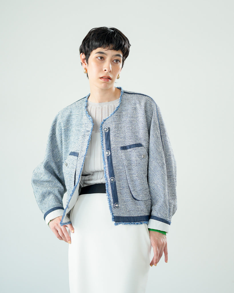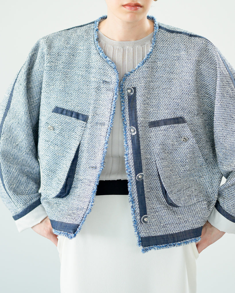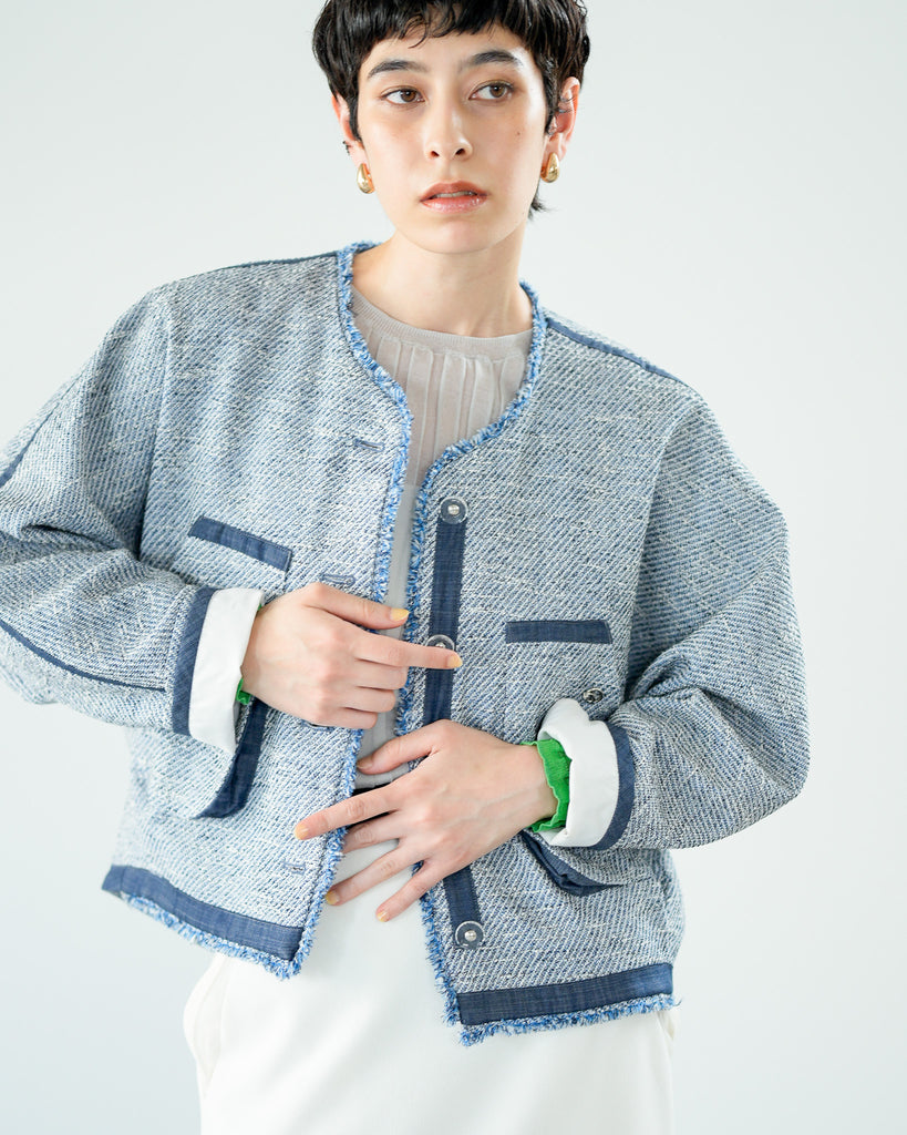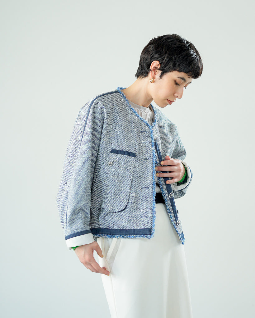 国内有数の毛織物の産地、尾州で丁寧に織り上げられた美しいツイードツイル生地を使用したデザインジャケット。綿やポリエステル、アクリルのスラブ糸が織りなす、上品で涼やかな表情が魅力のツイードです。前身頃から衿ぐりには、生地の耳(セルビッチ)を活かしたフリンジを施し、素材の魅力を最大限に引き出しました。(※フリンジの長さにはバラつきが出ることもあります。)買い付けた、インポートのクリアボタンが透明感のある表情でスタイルにアクセントを添えます。シャンブレー生地をドッキングすることで気負わずに着れるジャケットに仕立てました。見た目以上に軽い着心地で、カジュアルさとツイードのエレガンスが絶妙に組み合わさり、どんなシーンでも活躍する一着です。