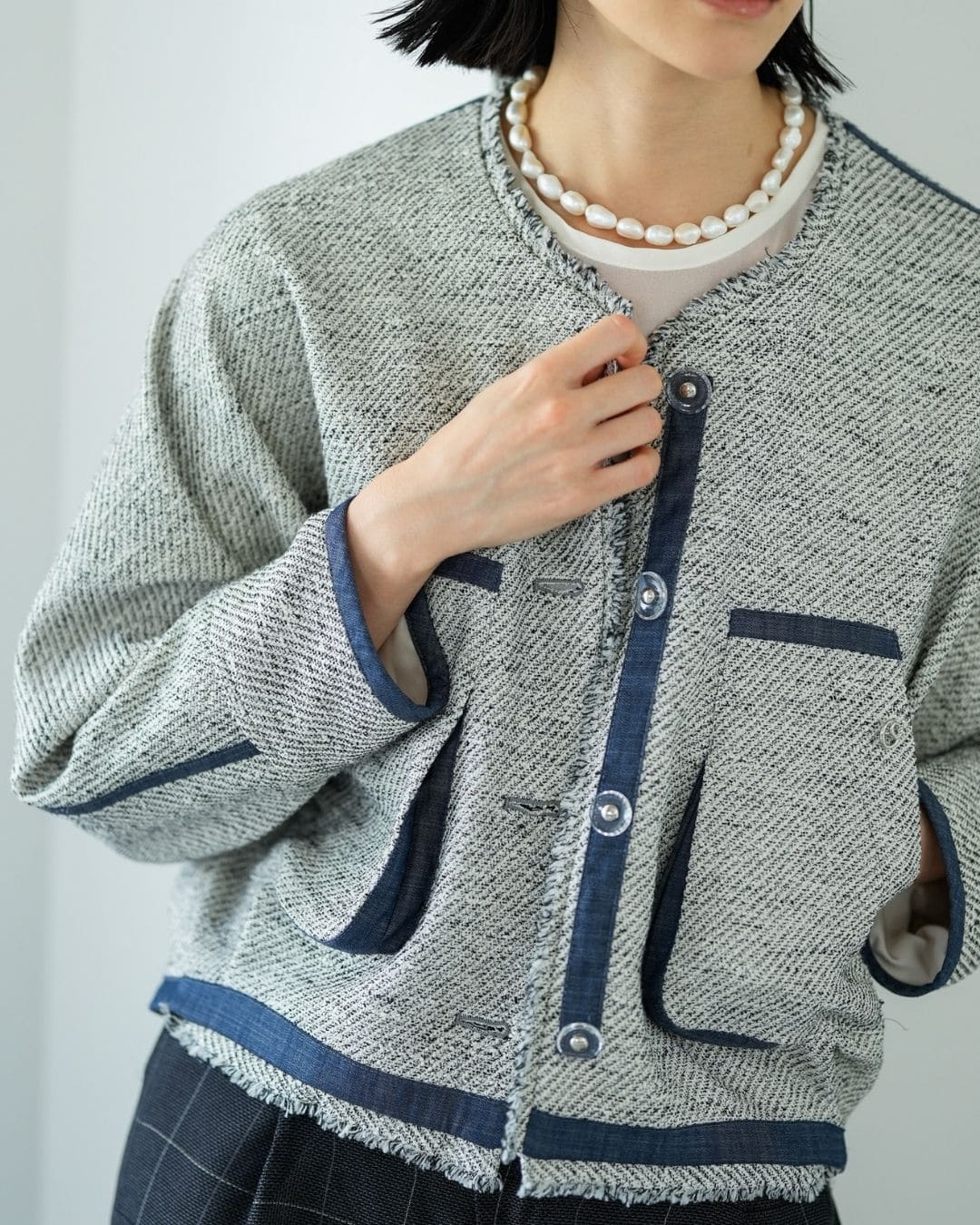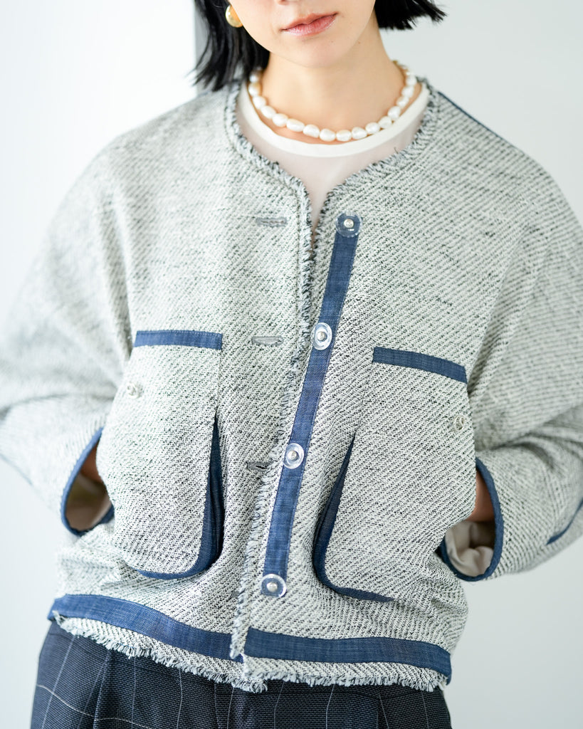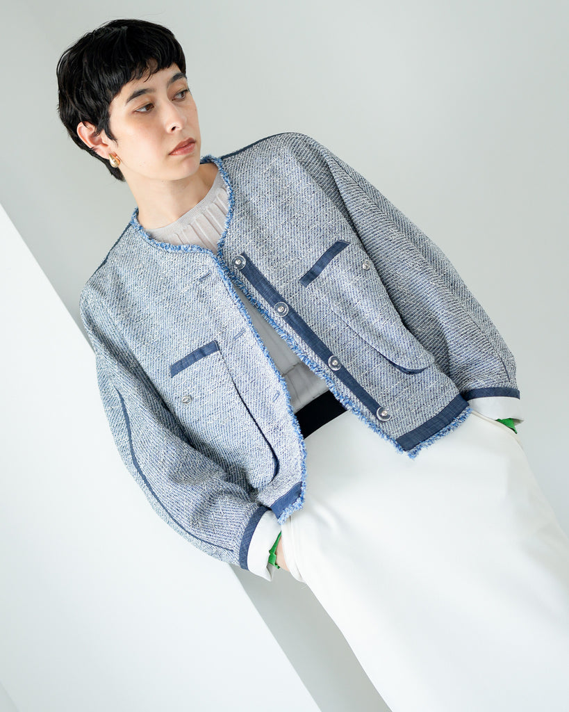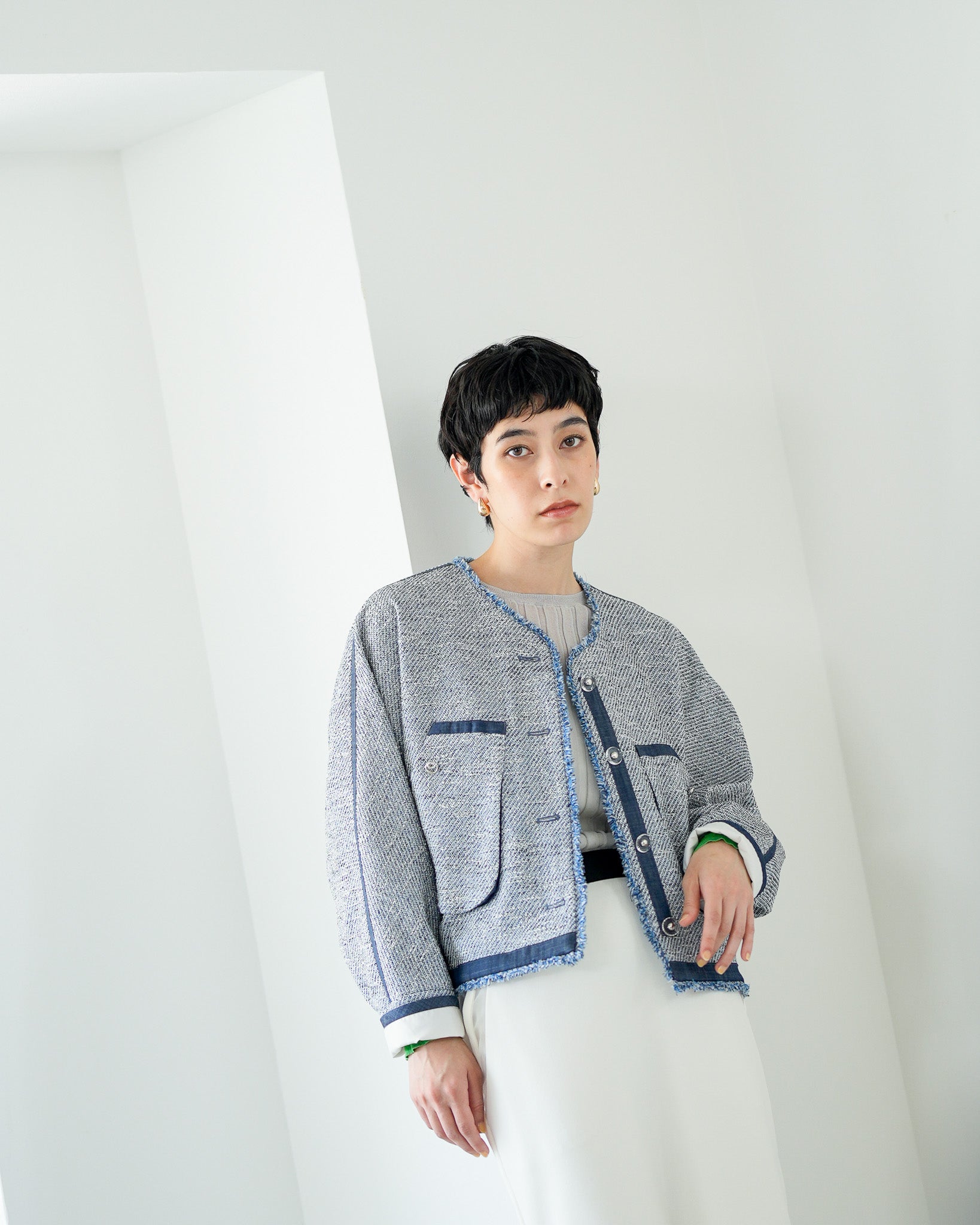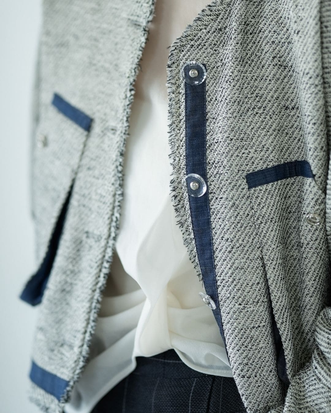 国内有数の毛織物の産地、尾州で丁寧に織り上げられた美しいツイードツイル生地を使用したデザインジャケット。綿やポリエステル、アクリルのスラブ糸が織りなす、上品で涼やかな表情が魅力のツイードです。前身頃から衿ぐりには、生地の耳(セルビッチ)を活かしたフリンジを施し、素材の魅力を最大限に引き出しました。(※フリンジの長さにはバラつきが出ることもあります。)買い付けた、インポートのクリアボタンが透明感のある表情でスタイルにアクセントを添えます。シャンブレー生地をドッキングすることで気負わずに着れるジャケットに仕立てました。見た目以上に軽い着心地で、カジュアルさとツイードのエレガンスが絶妙に組み合わさり、どんなシーンでも活躍する一着です。
