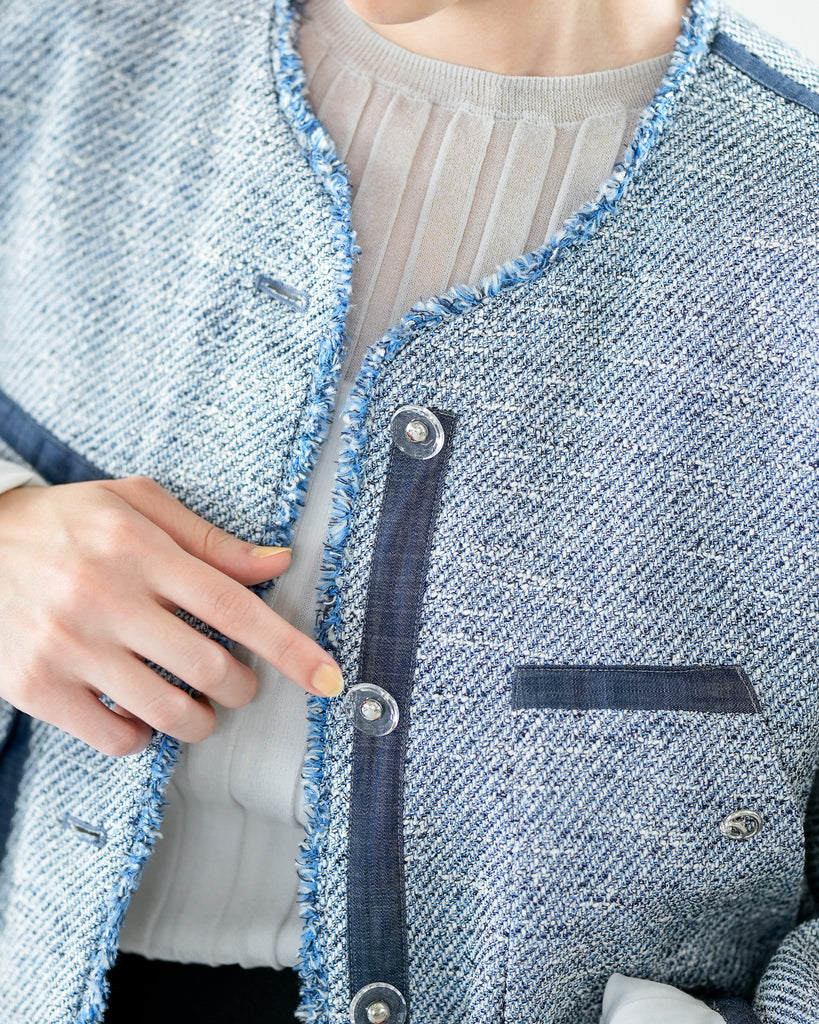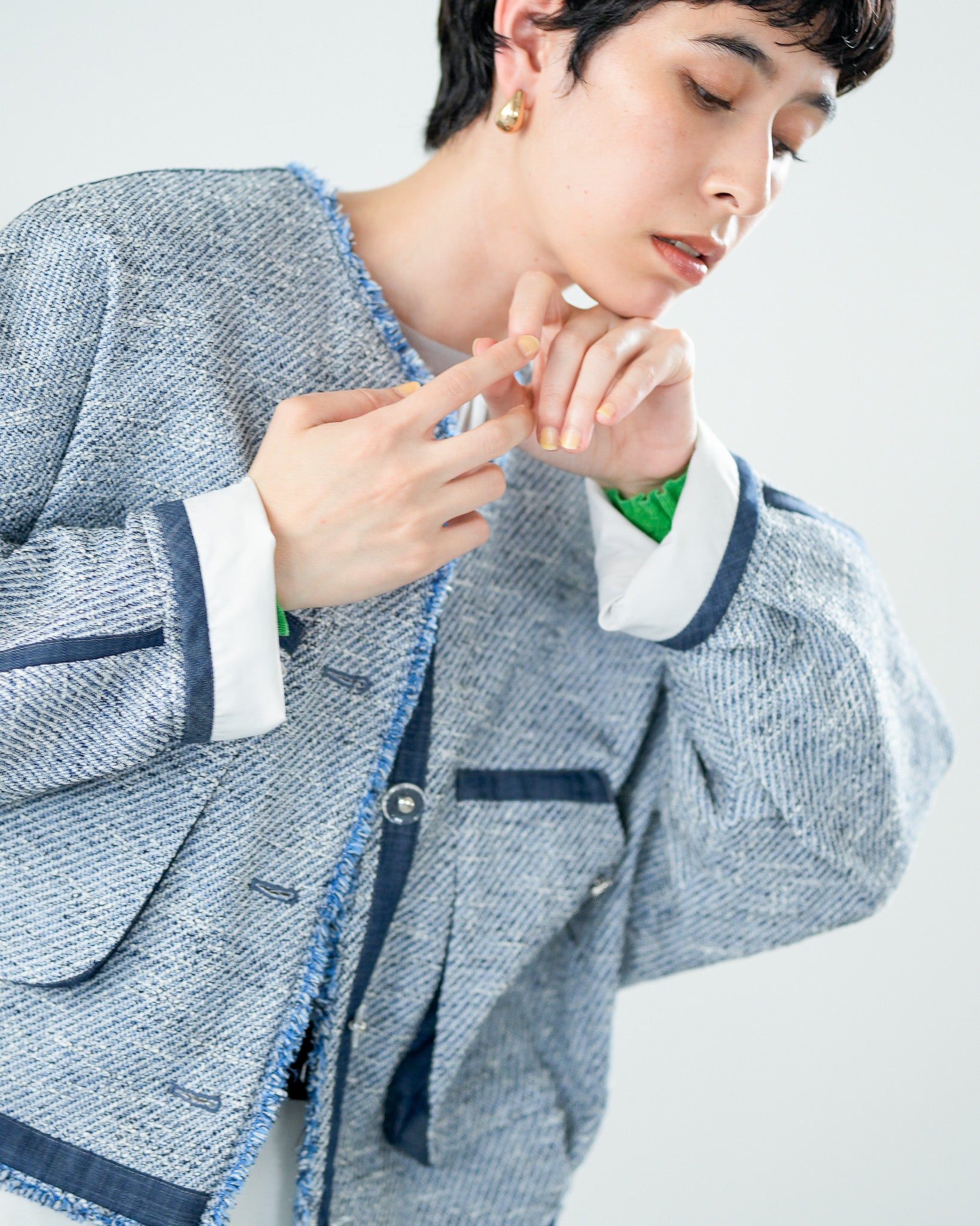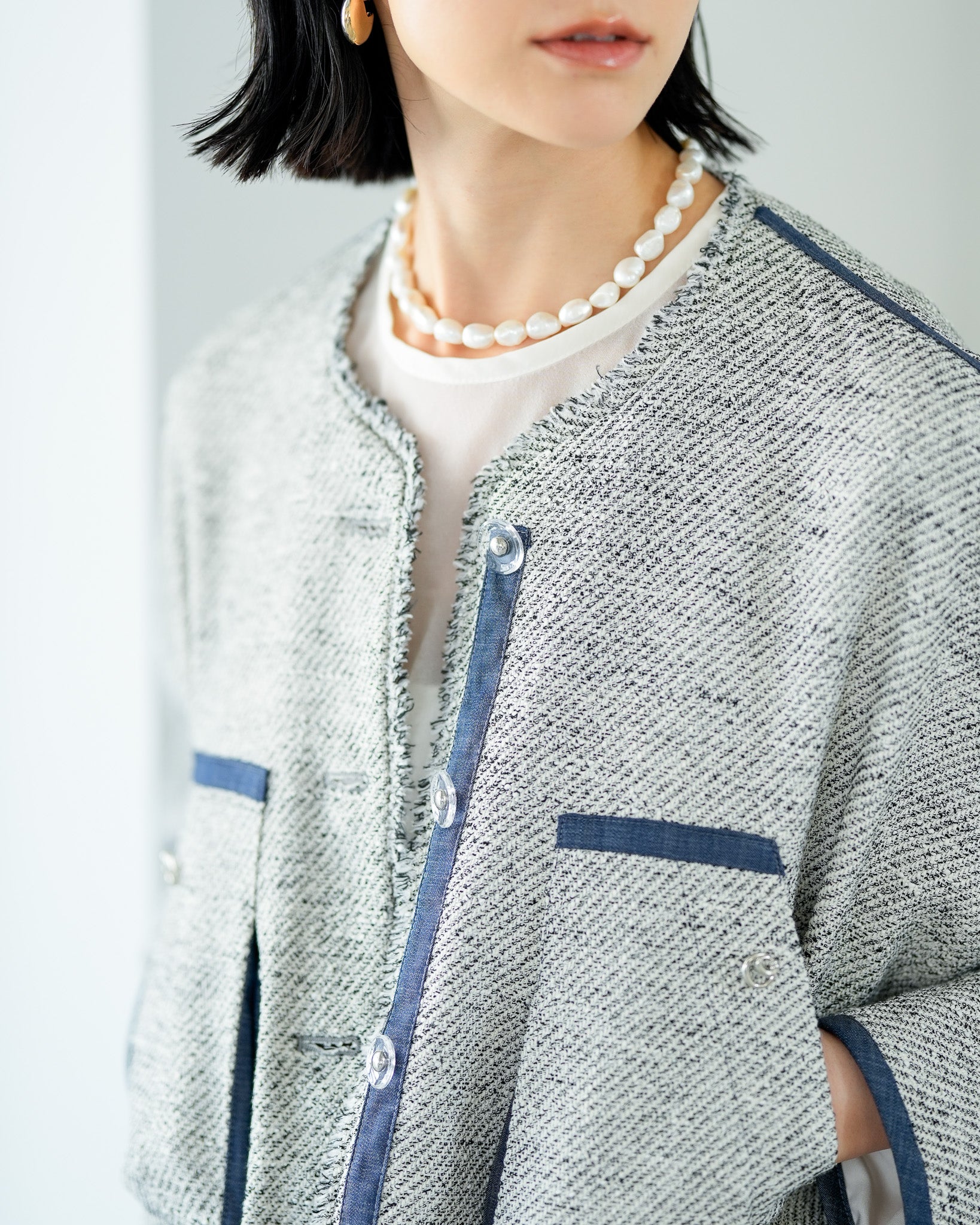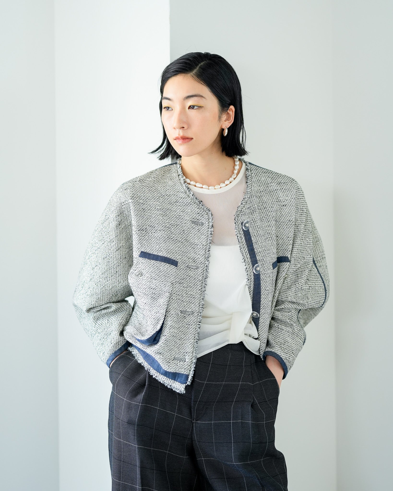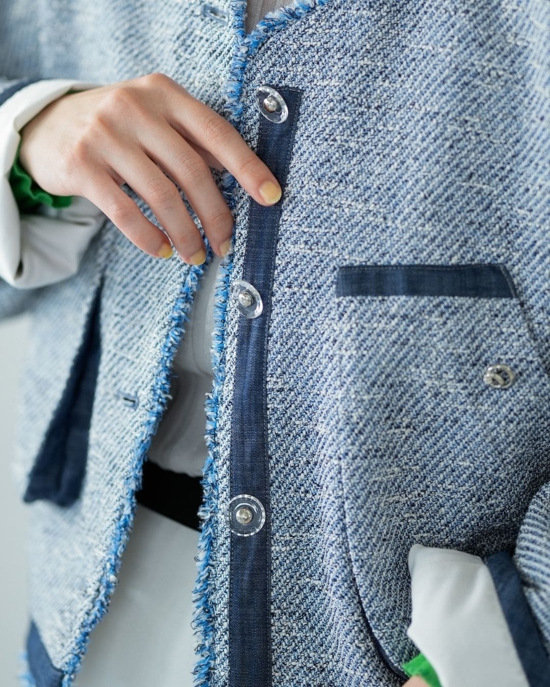 国内有数の毛織物の産地、尾州で丁寧に織り上げられた美しいツイードツイル生地を使用したデザインジャケット。綿やポリエステル、アクリルのスラブ糸が織りなす、上品で涼やかな表情が魅力のツイードです。前身頃から衿ぐりには、生地の耳(セルビッチ)を活かしたフリンジを施し、素材の魅力を最大限に引き出しました。(※フリンジの長さにはバラつきが出ることもあります。)買い付けた、インポートのクリアボタンが透明感のある表情でスタイルにアクセントを添えます。シャンブレー生地をドッキングすることで気負わずに着れるジャケットに仕立てました。見た目以上に軽い着心地で、カジュアルさとツイードのエレガンスが絶妙に組み合わさり、どんなシーンでも活躍する一着です。