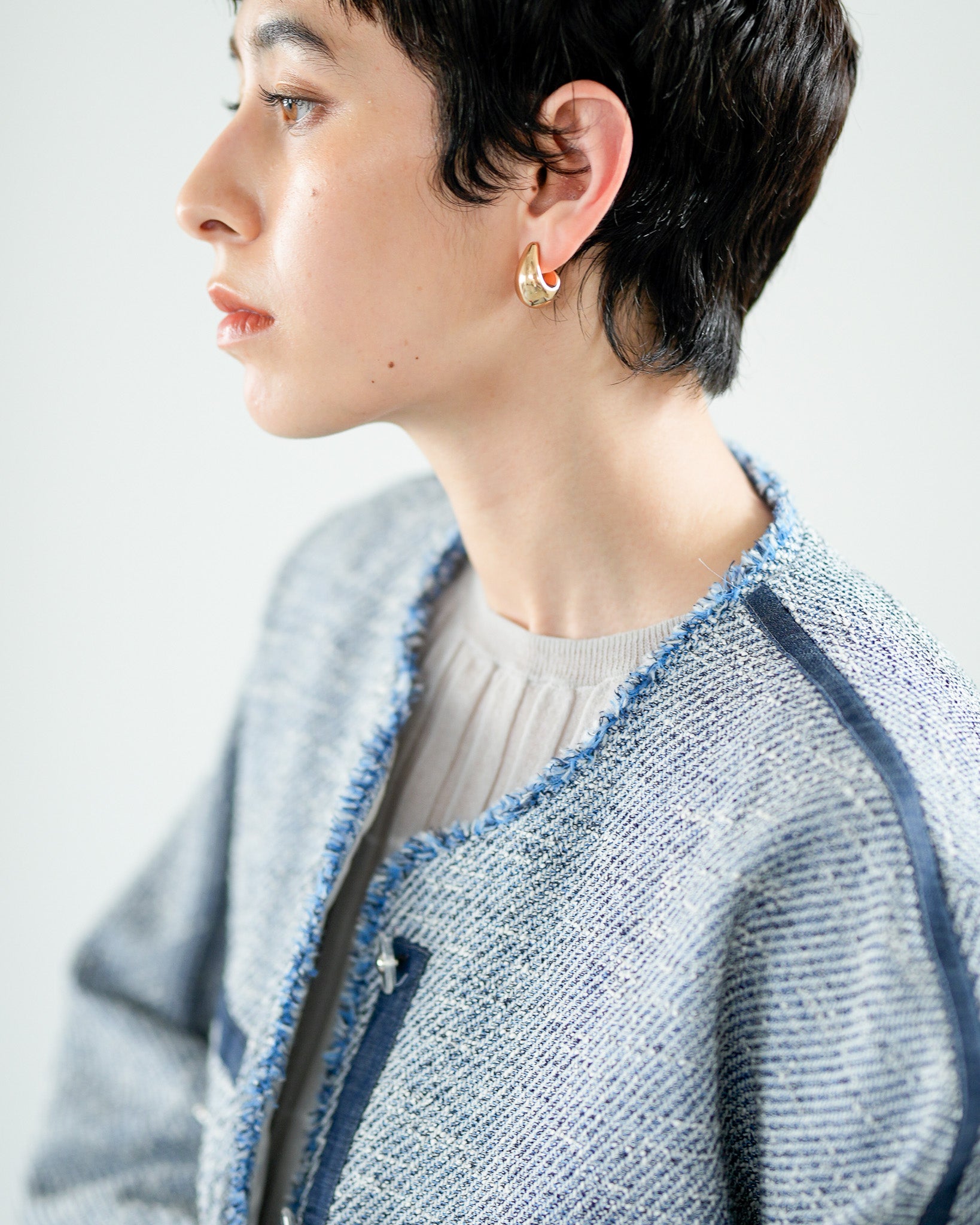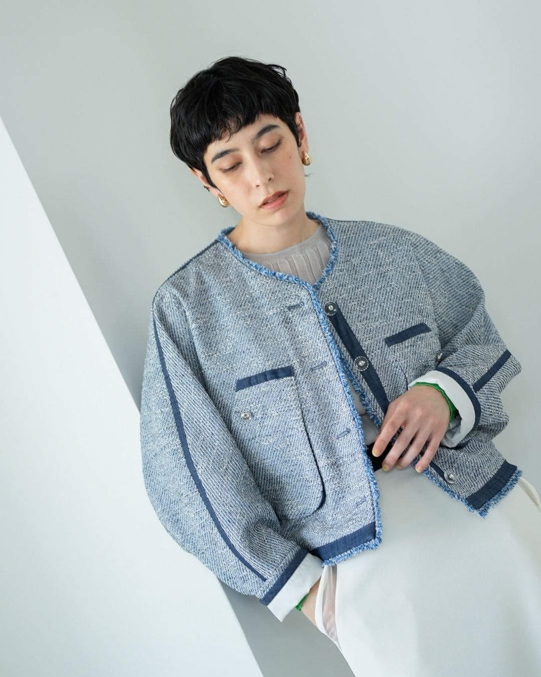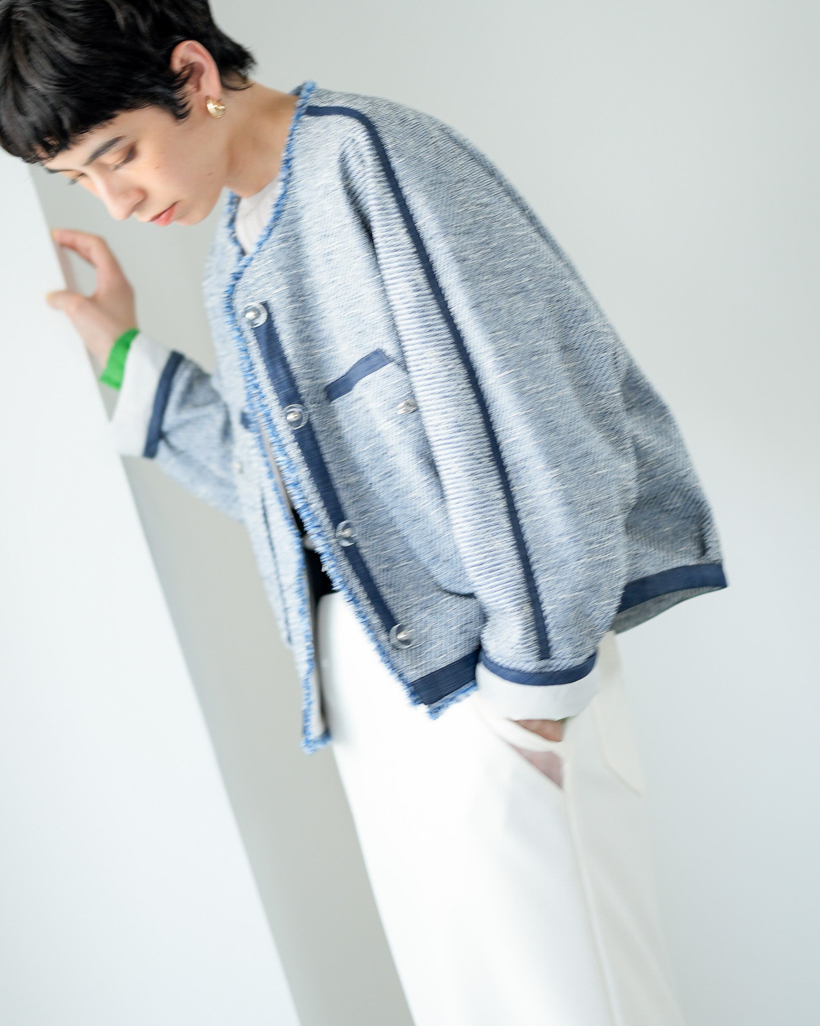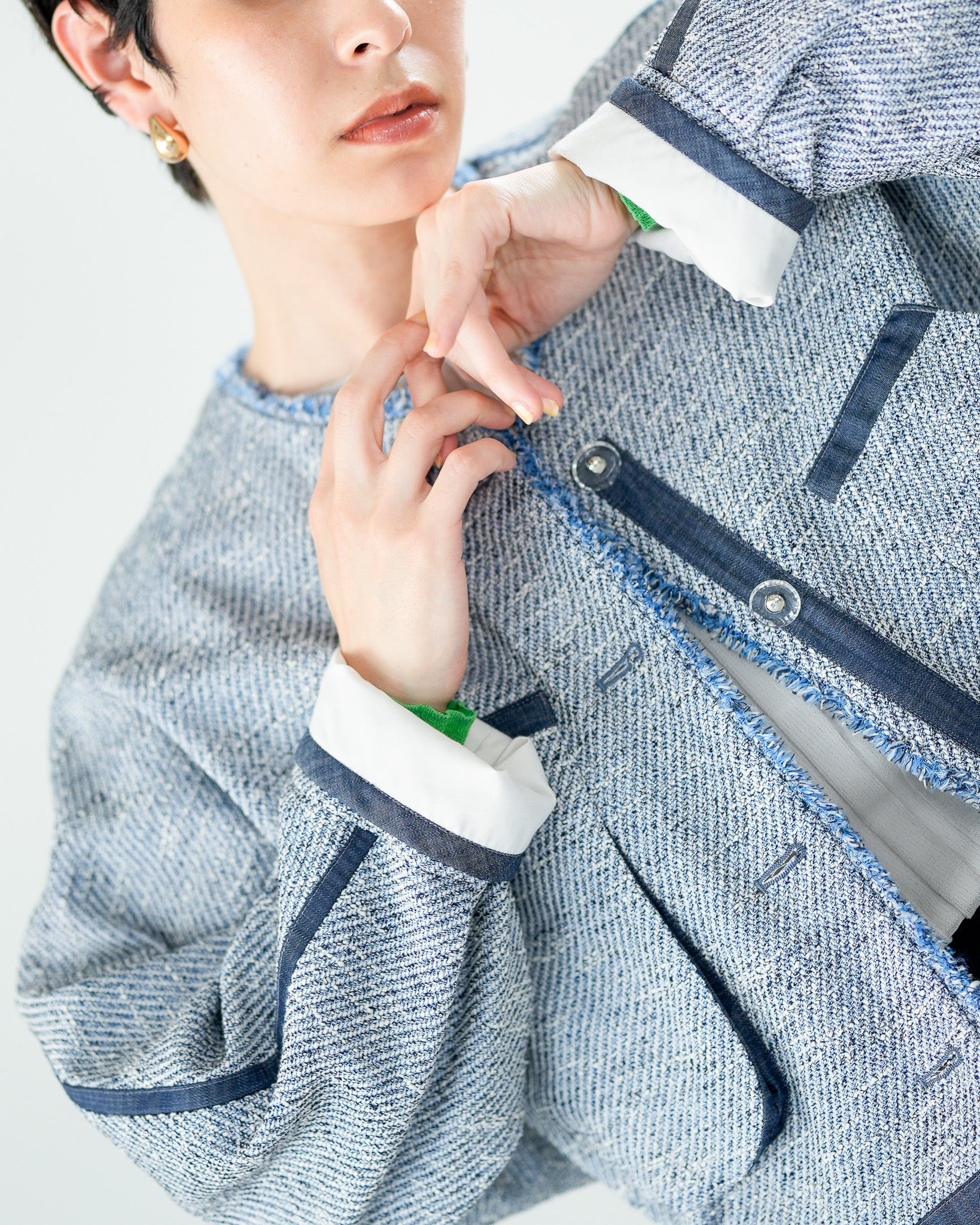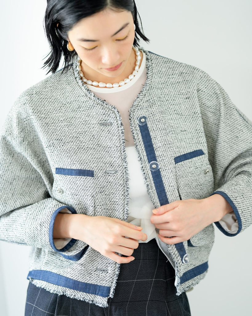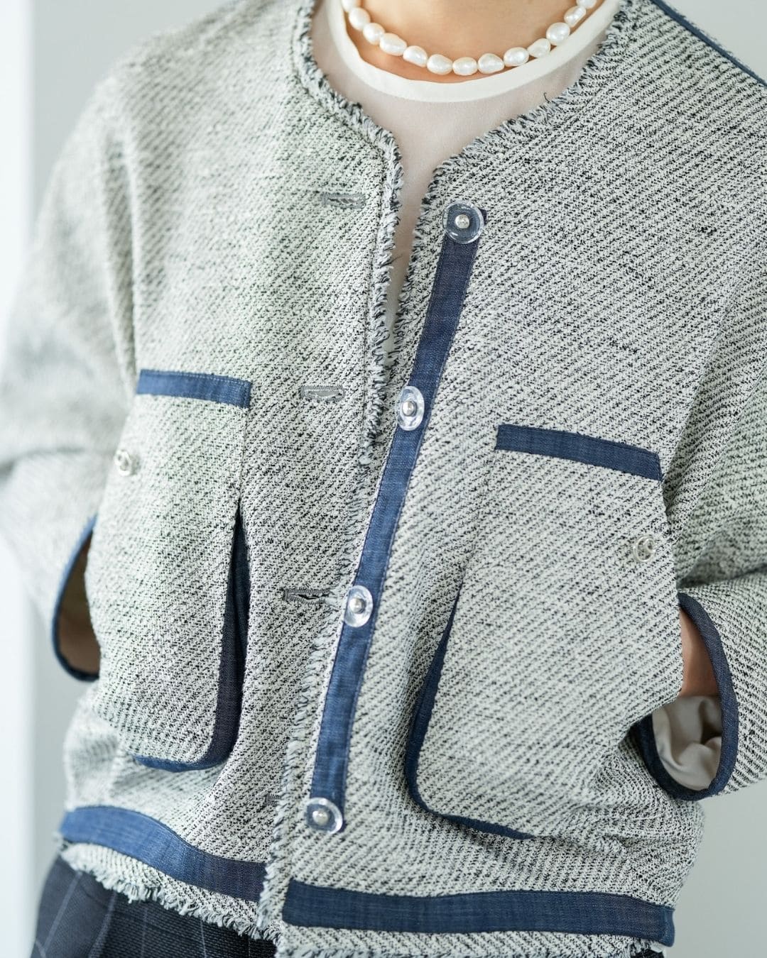 国内有数の毛織物の産地、尾州で丁寧に織り上げられた美しいツイードツイル生地を使用したデザインジャケット。綿やポリエステル、アクリルのスラブ糸が織りなす、上品で涼やかな表情が魅力のツイードです。前身頃から衿ぐりには、生地の耳(セルビッチ)を活かしたフリンジを施し、素材の魅力を最大限に引き出しました。(※フリンジの長さにはバラつきが出ることもあります。)買い付けた、インポートのクリアボタンが透明感のある表情でスタイルにアクセントを添えます。シャンブレー生地をドッキングすることで気負わずに着れるジャケットに仕立てました。見た目以上に軽い着心地で、カジュアルさとツイードのエレガンスが絶妙に組み合わさり、どんなシーンでも活躍する一着です。