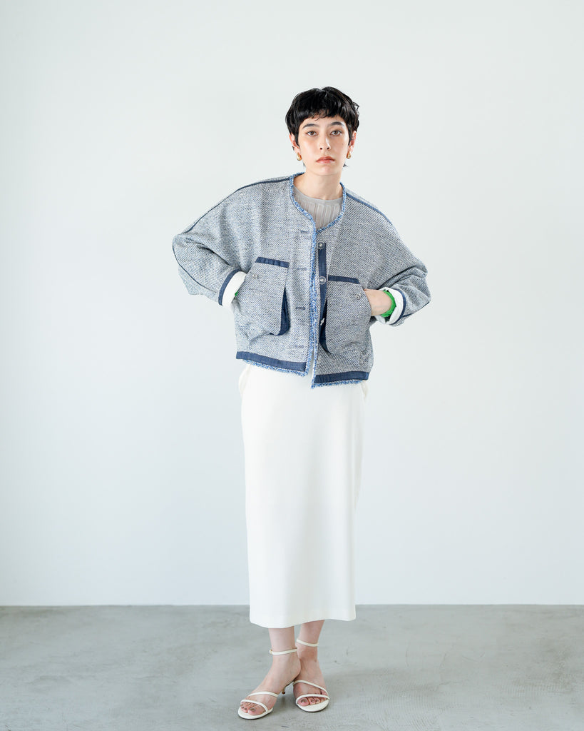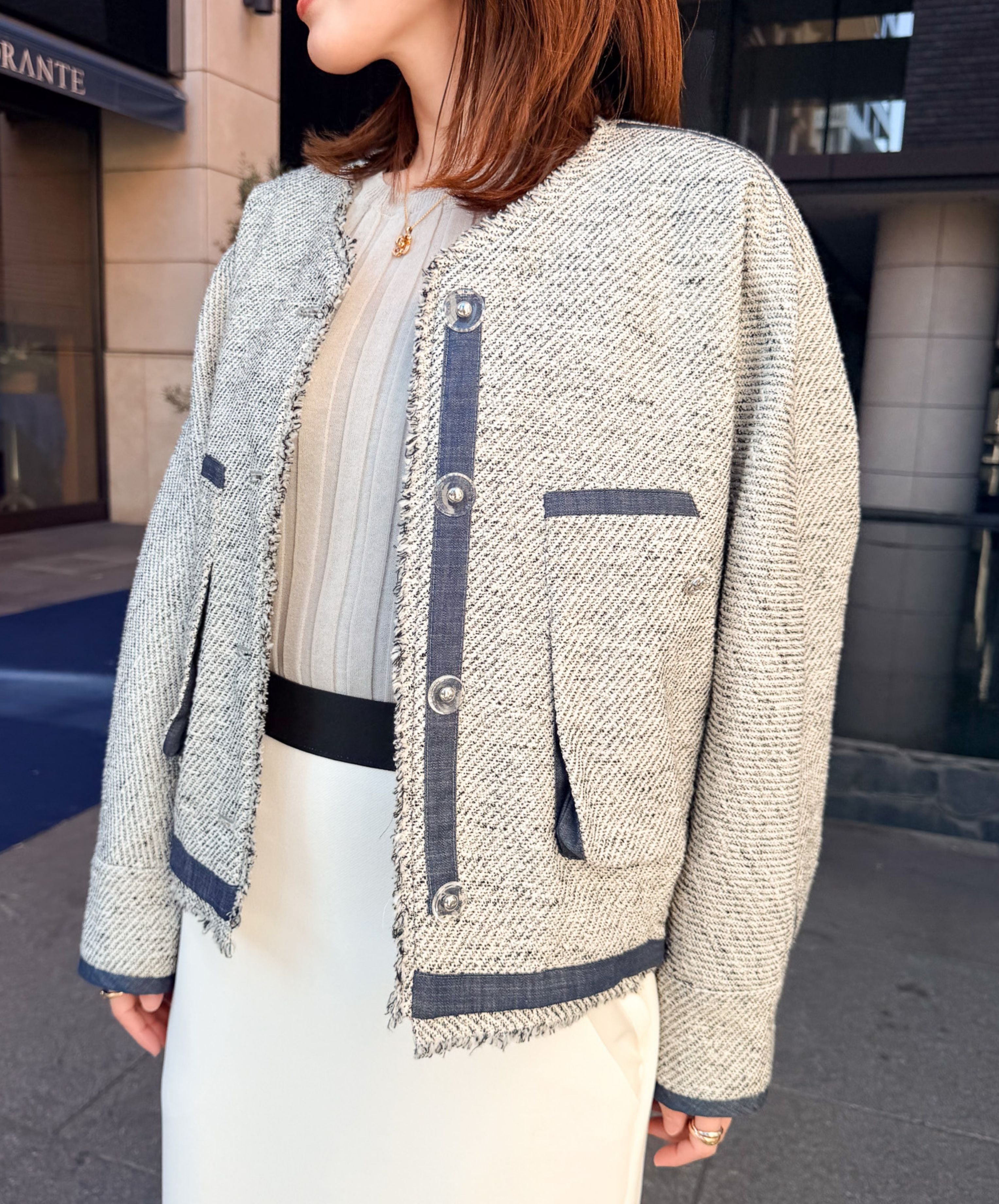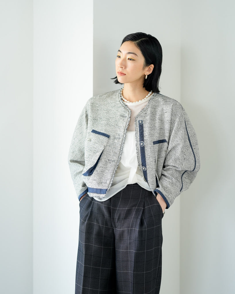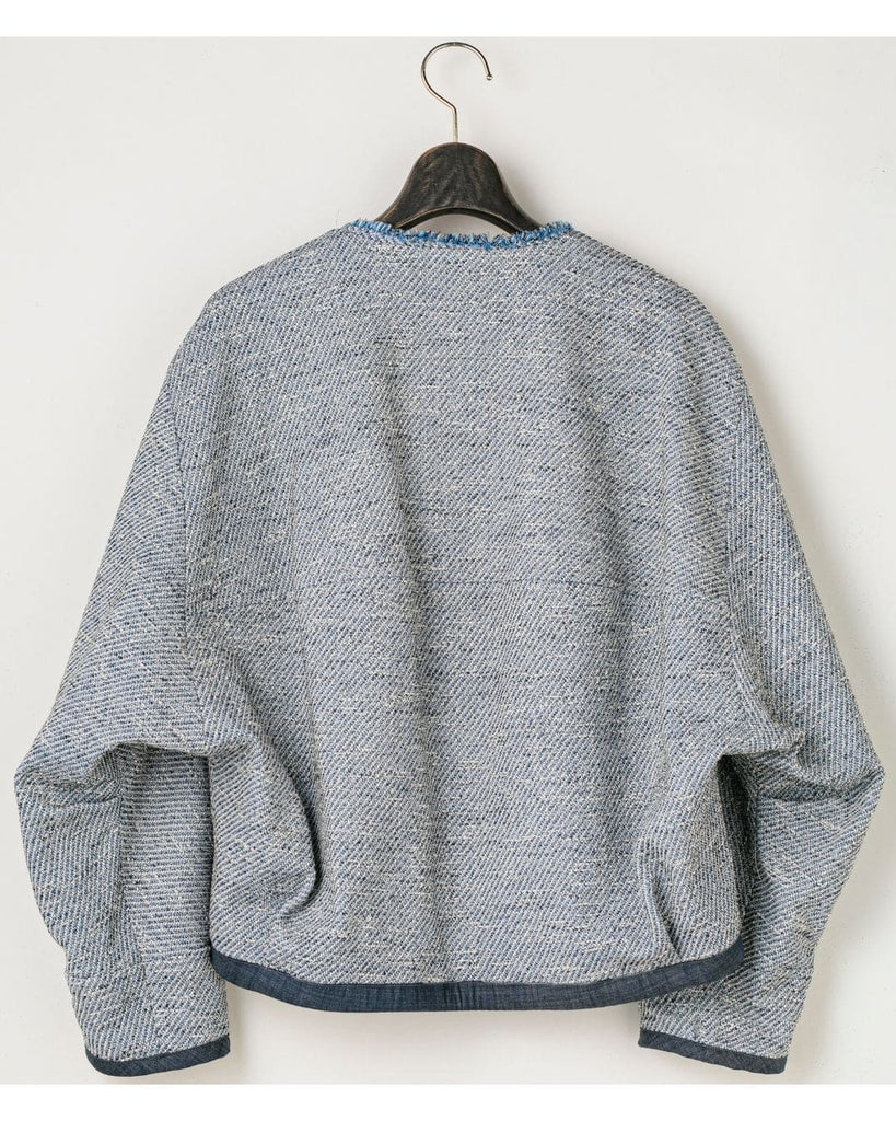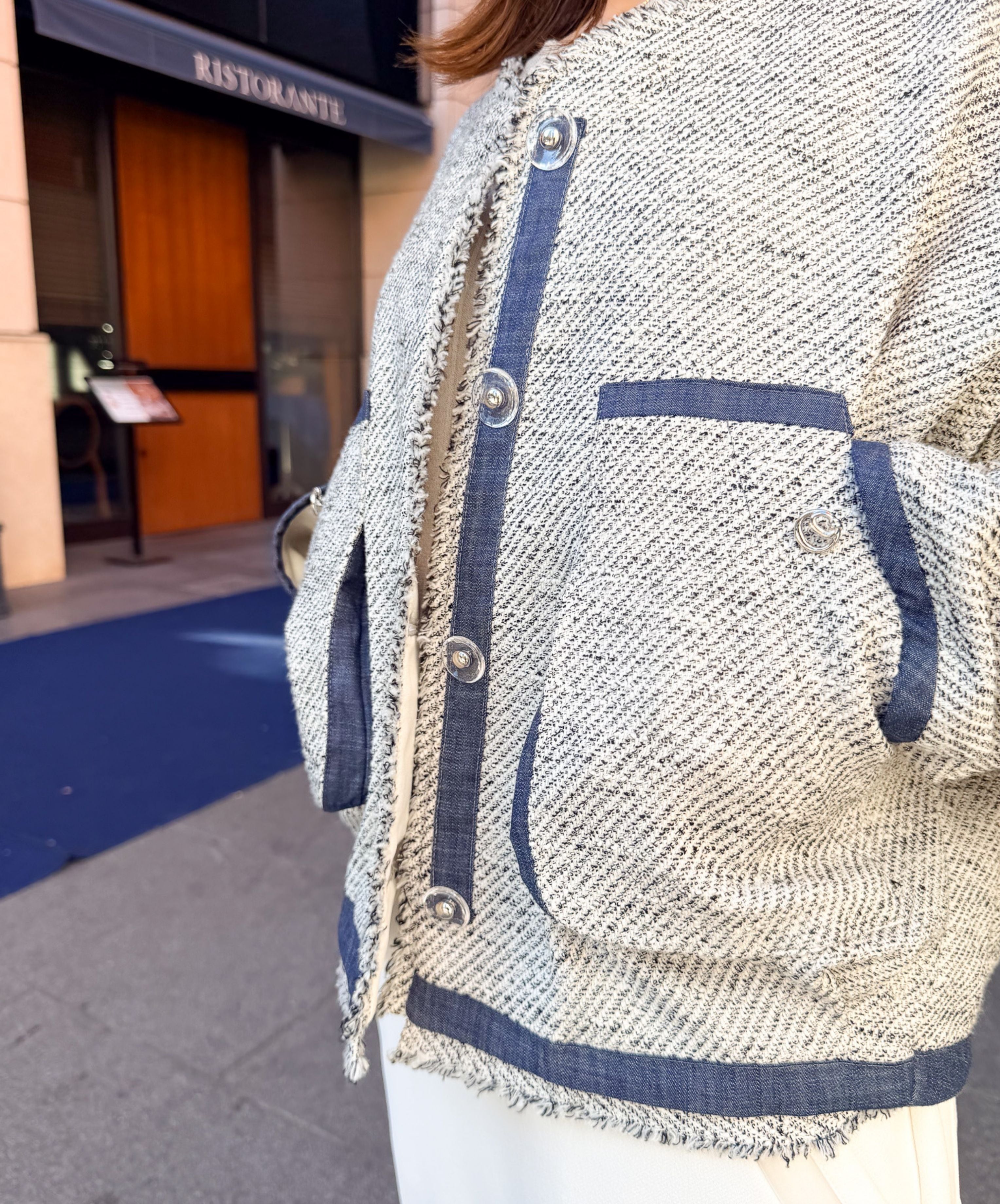 国内有数の毛織物の産地、尾州で丁寧に織り上げられた美しいツイードツイル生地を使用したデザインジャケット。綿やポリエステル、アクリルのスラブ糸が織りなす、上品で涼やかな表情が魅力のツイードです。前身頃から衿ぐりには、生地の耳(セルビッチ)を活かしたフリンジを施し、素材の魅力を最大限に引き出しました。(※フリンジの長さにはバラつきが出ることもあります。)買い付けた、インポートのクリアボタンが透明感のある表情でスタイルにアクセントを添えます。シャンブレー生地をドッキングすることで気負わずに着れるジャケットに仕立てました。見た目以上に軽い着心地で、カジュアルさとツイードのエレガンスが絶妙に組み合わさり、どんなシーンでも活躍する一着です。