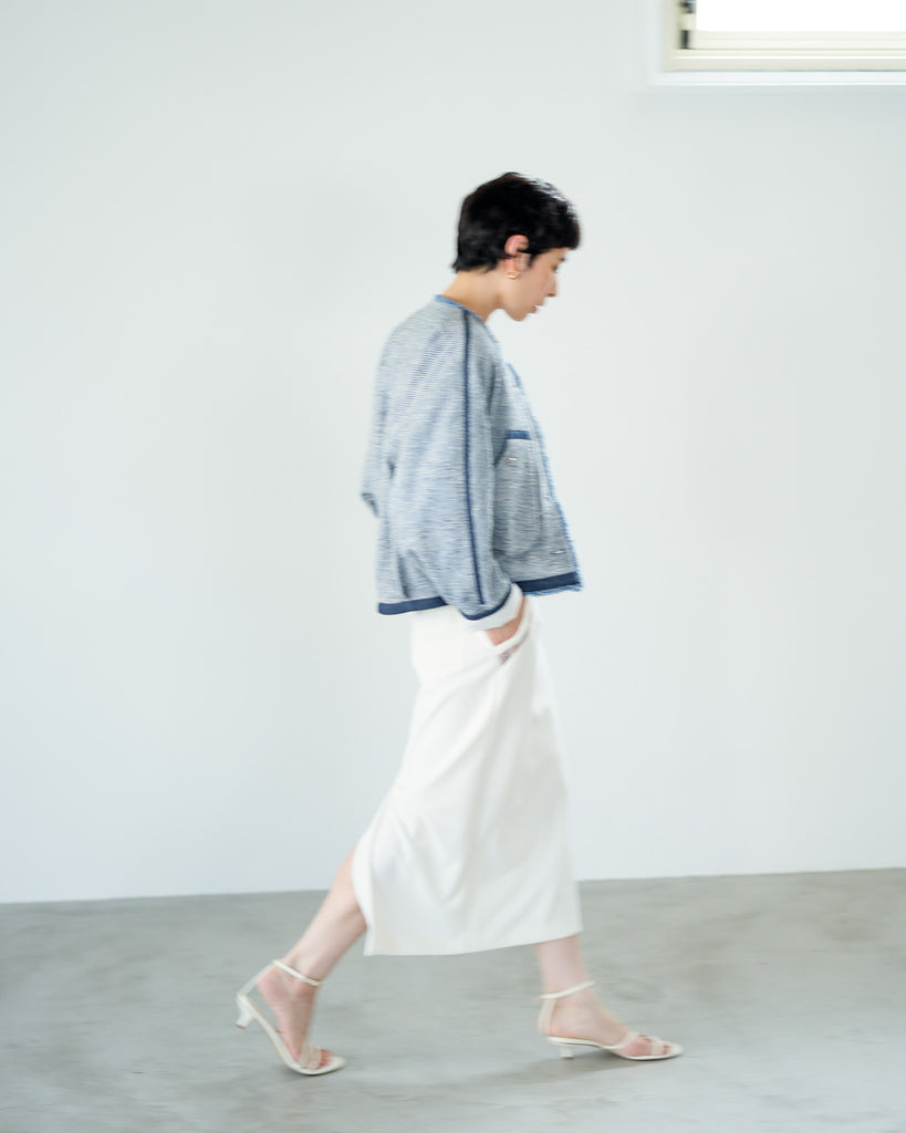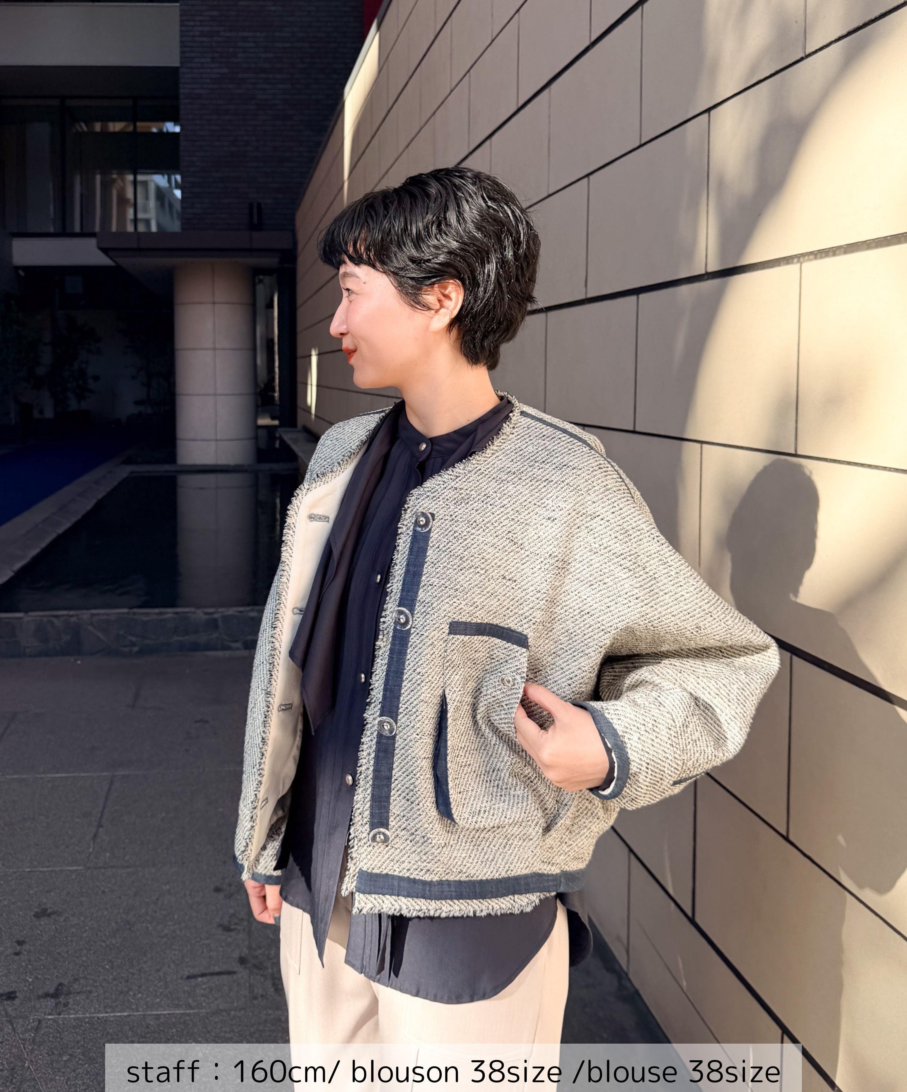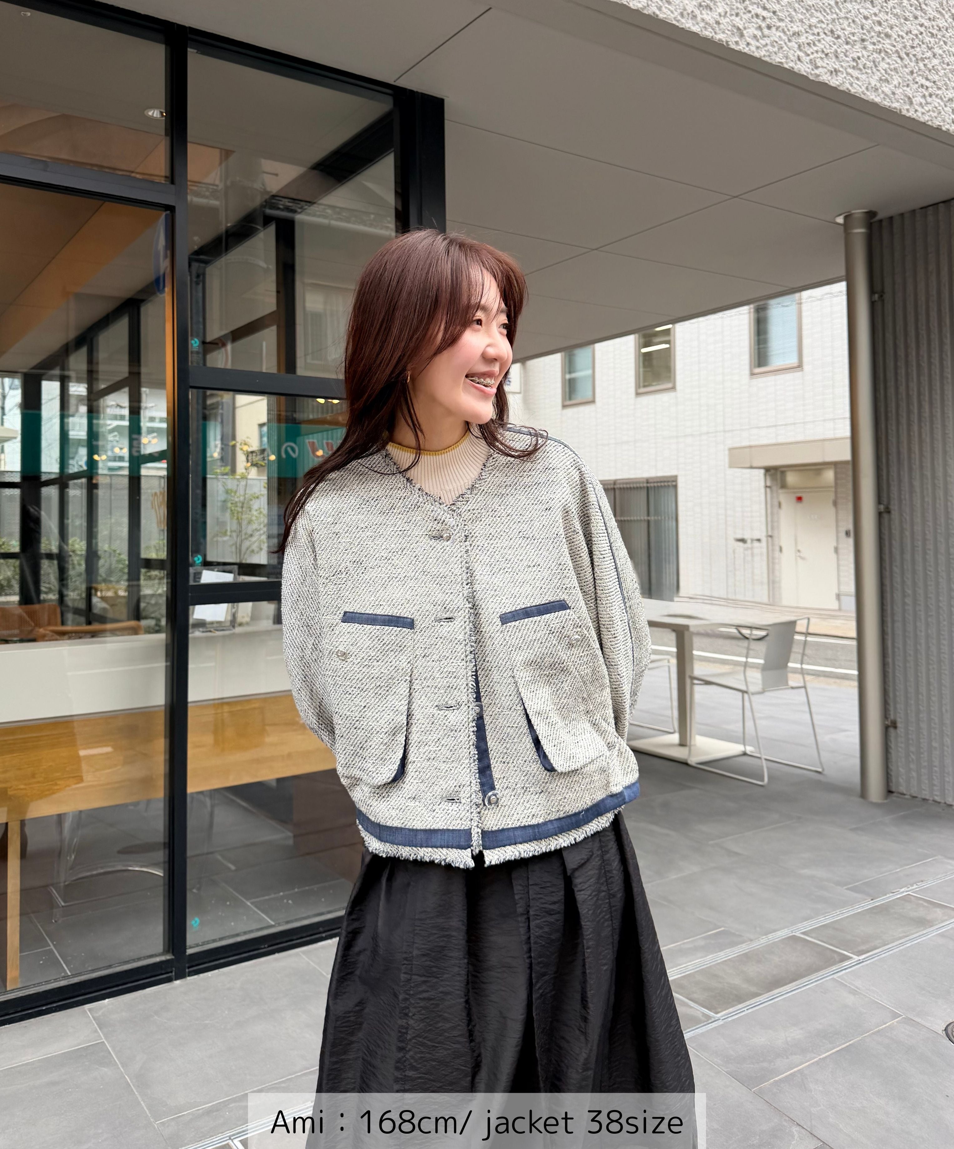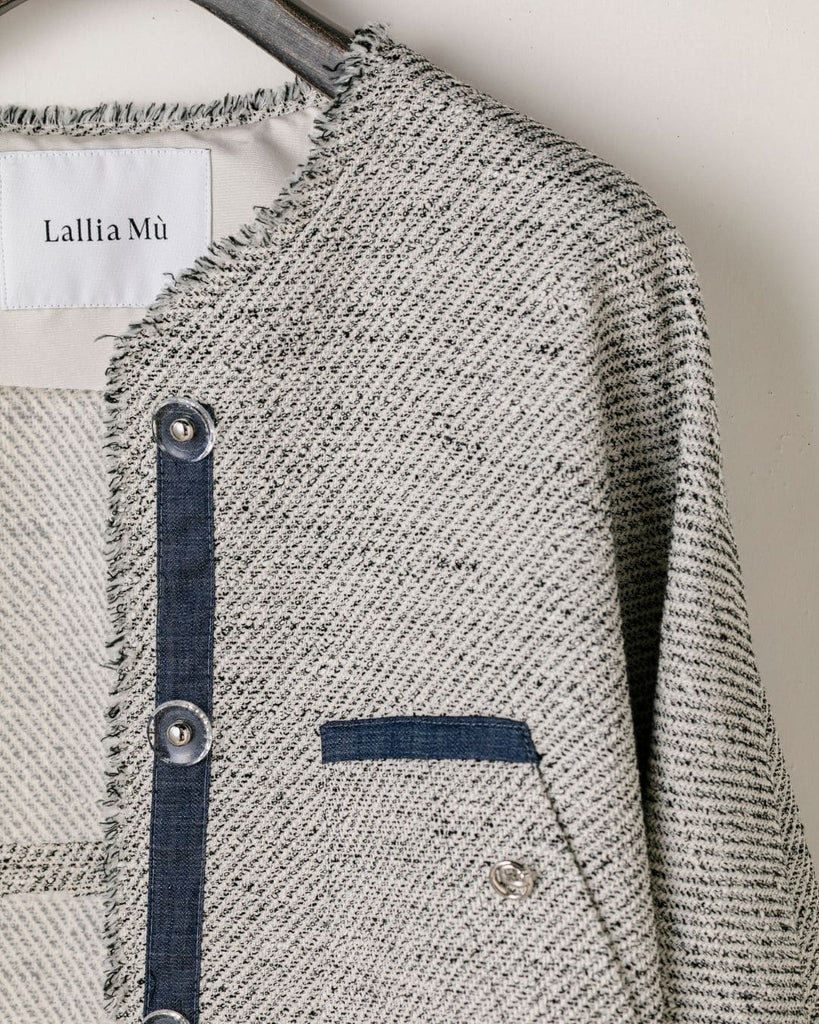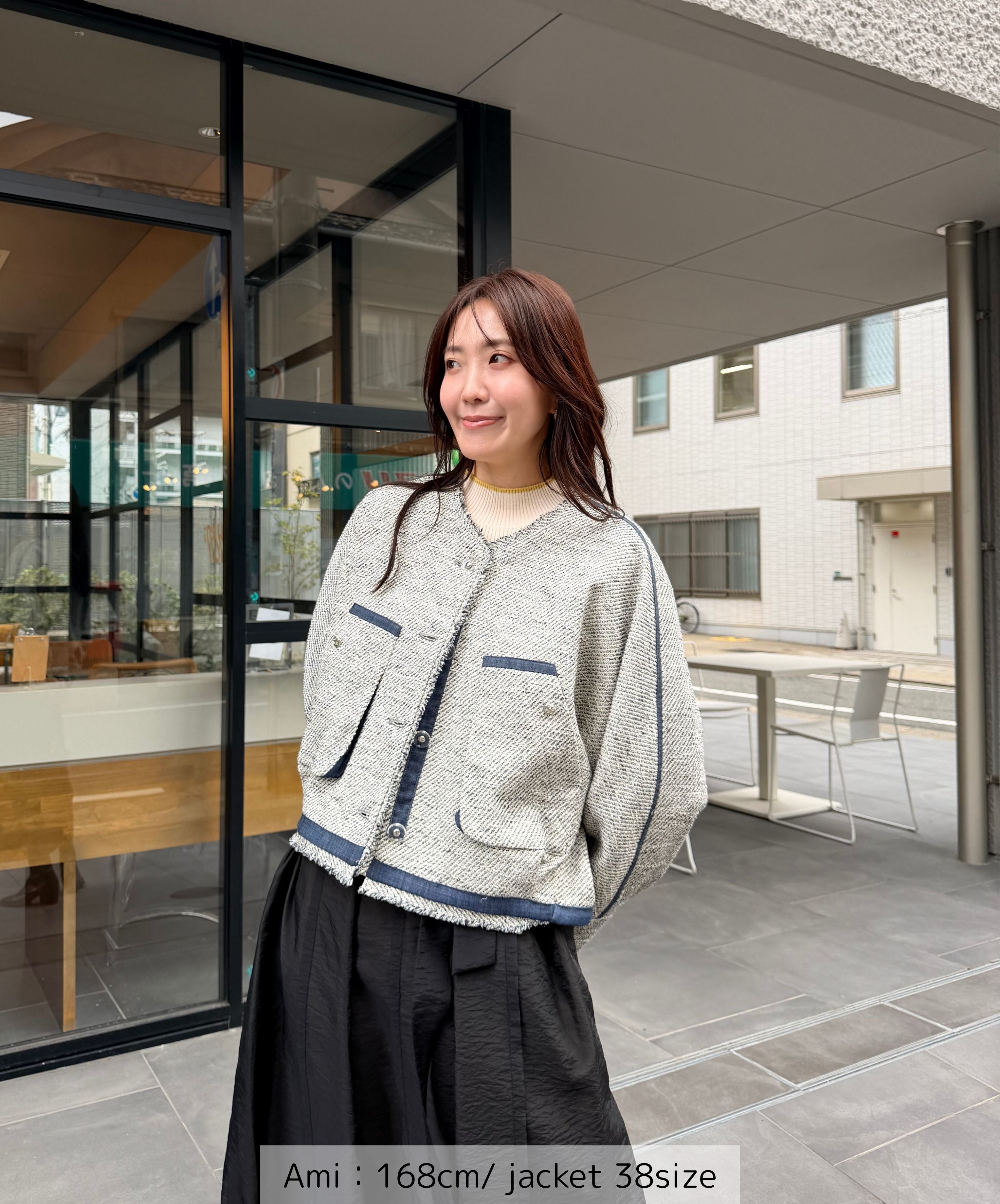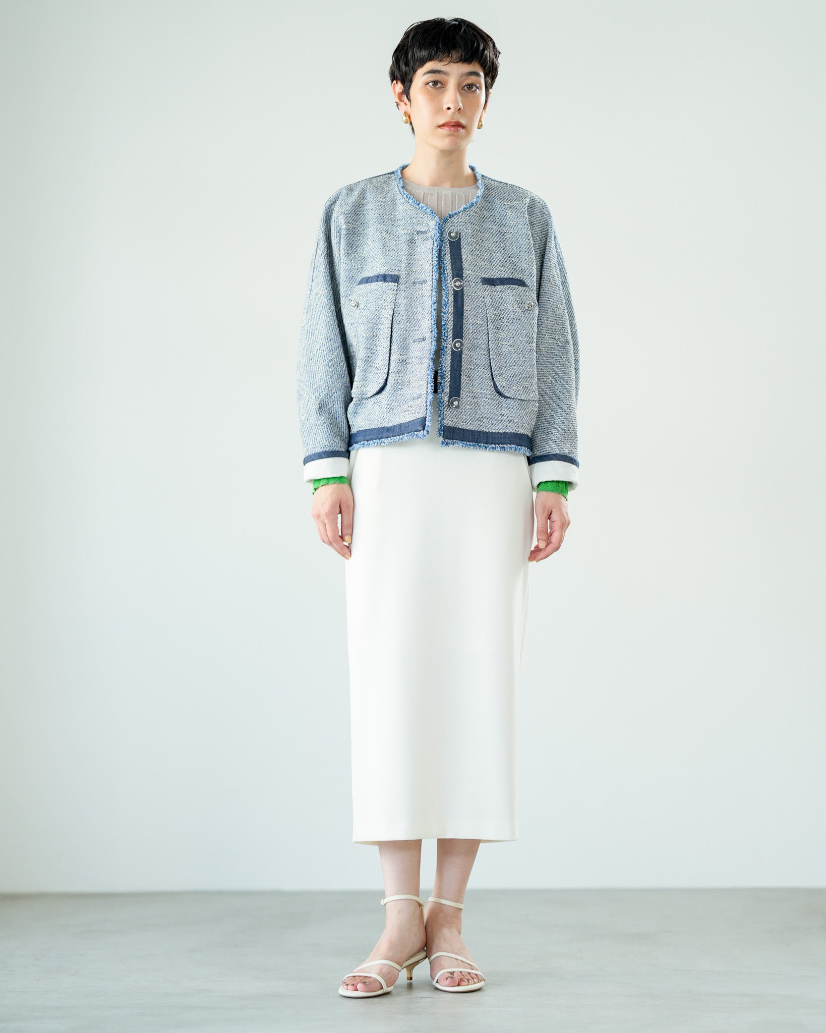 国内有数の毛織物の産地、尾州で丁寧に織り上げられた美しいツイードツイル生地を使用したデザインジャケット。綿やポリエステル、アクリルのスラブ糸が織りなす、上品で涼やかな表情が魅力のツイードです。前身頃から衿ぐりには、生地の耳(セルビッチ)を活かしたフリンジを施し、素材の魅力を最大限に引き出しました。(※フリンジの長さにはバラつきが出ることもあります。)買い付けた、インポートのクリアボタンが透明感のある表情でスタイルにアクセントを添えます。シャンブレー生地をドッキングすることで気負わずに着れるジャケットに仕立てました。見た目以上に軽い着心地で、カジュアルさとツイードのエレガンスが絶妙に組み合わさり、どんなシーンでも活躍する一着です。