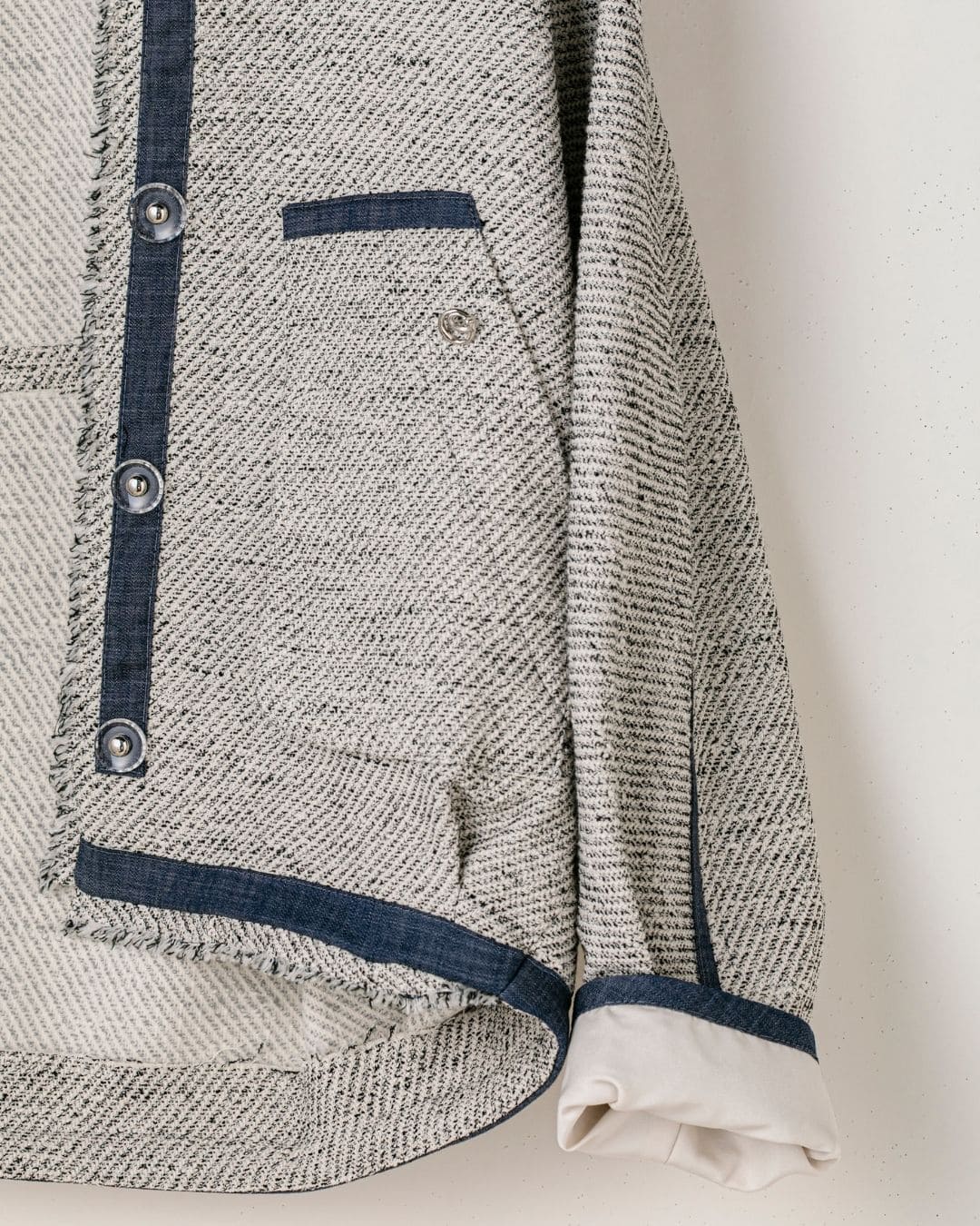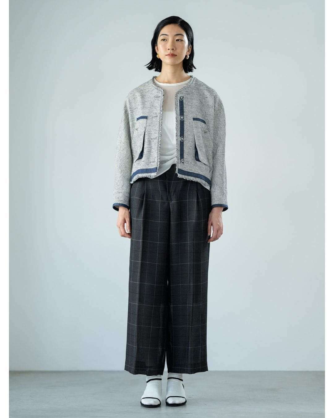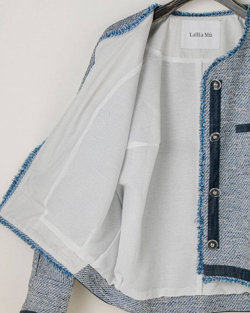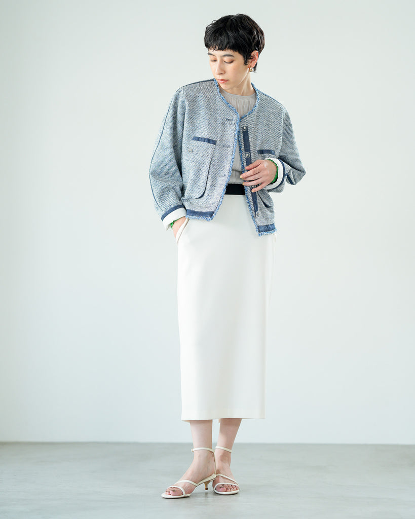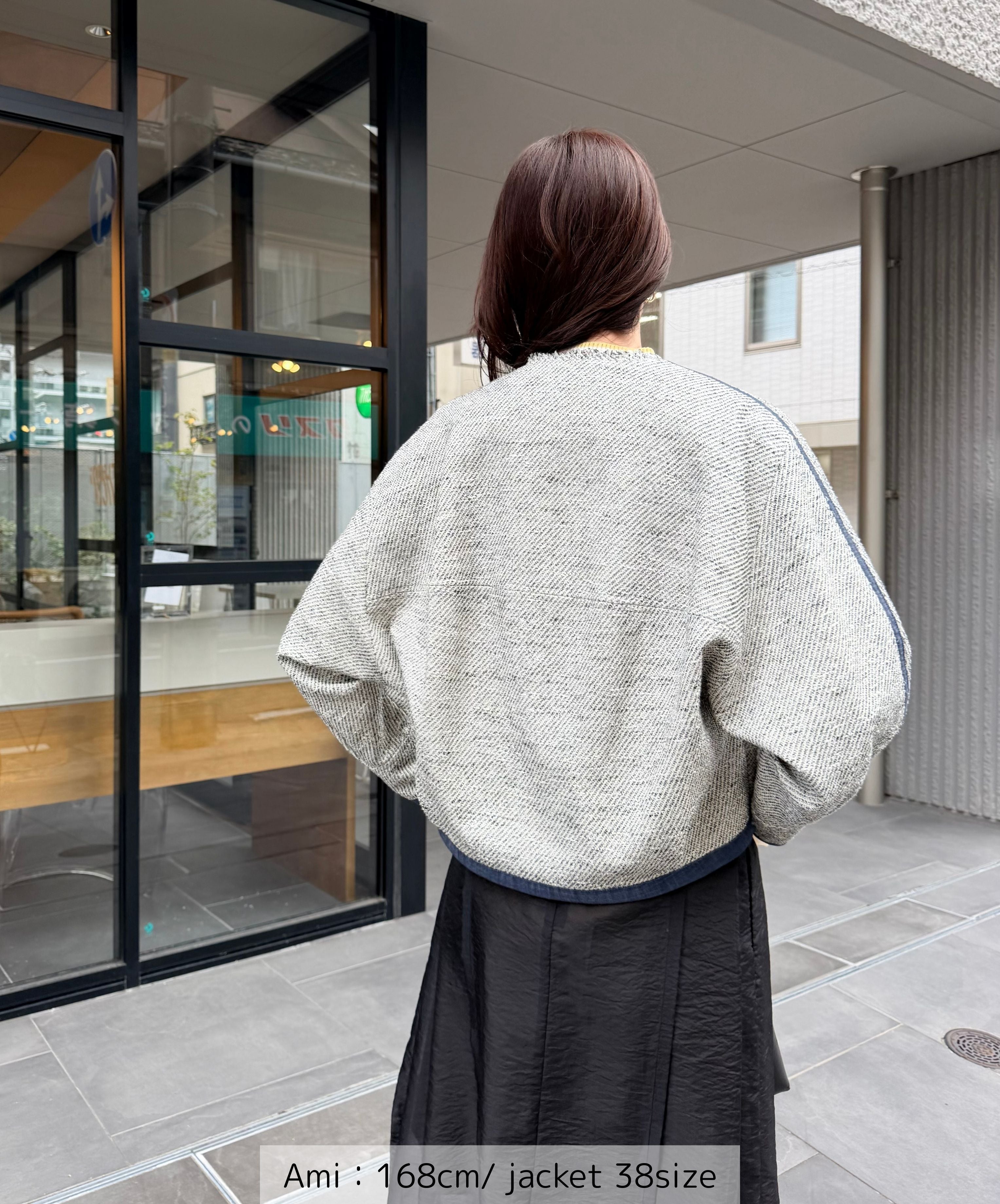 国内有数の毛織物の産地、尾州で丁寧に織り上げられた美しいツイードツイル生地を使用したデザインジャケット。綿やポリエステル、アクリルのスラブ糸が織りなす、上品で涼やかな表情が魅力のツイードです。前身頃から衿ぐりには、生地の耳(セルビッチ)を活かしたフリンジを施し、素材の魅力を最大限に引き出しました。(※フリンジの長さにはバラつきが出ることもあります。)買い付けた、インポートのクリアボタンが透明感のある表情でスタイルにアクセントを添えます。シャンブレー生地をドッキングすることで気負わずに着れるジャケットに仕立てました。見た目以上に軽い着心地で、カジュアルさとツイードのエレガンスが絶妙に組み合わさり、どんなシーンでも活躍する一着です。