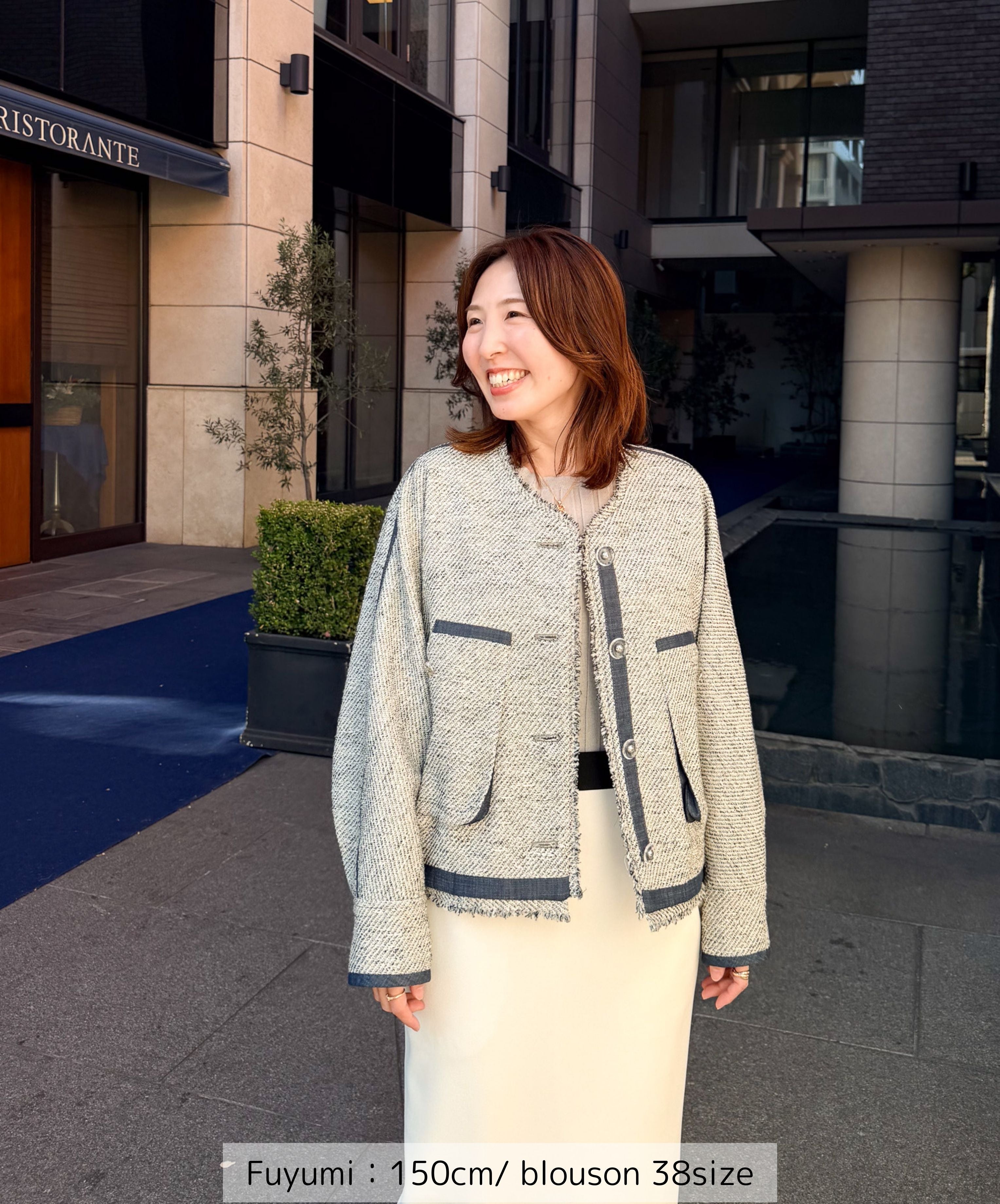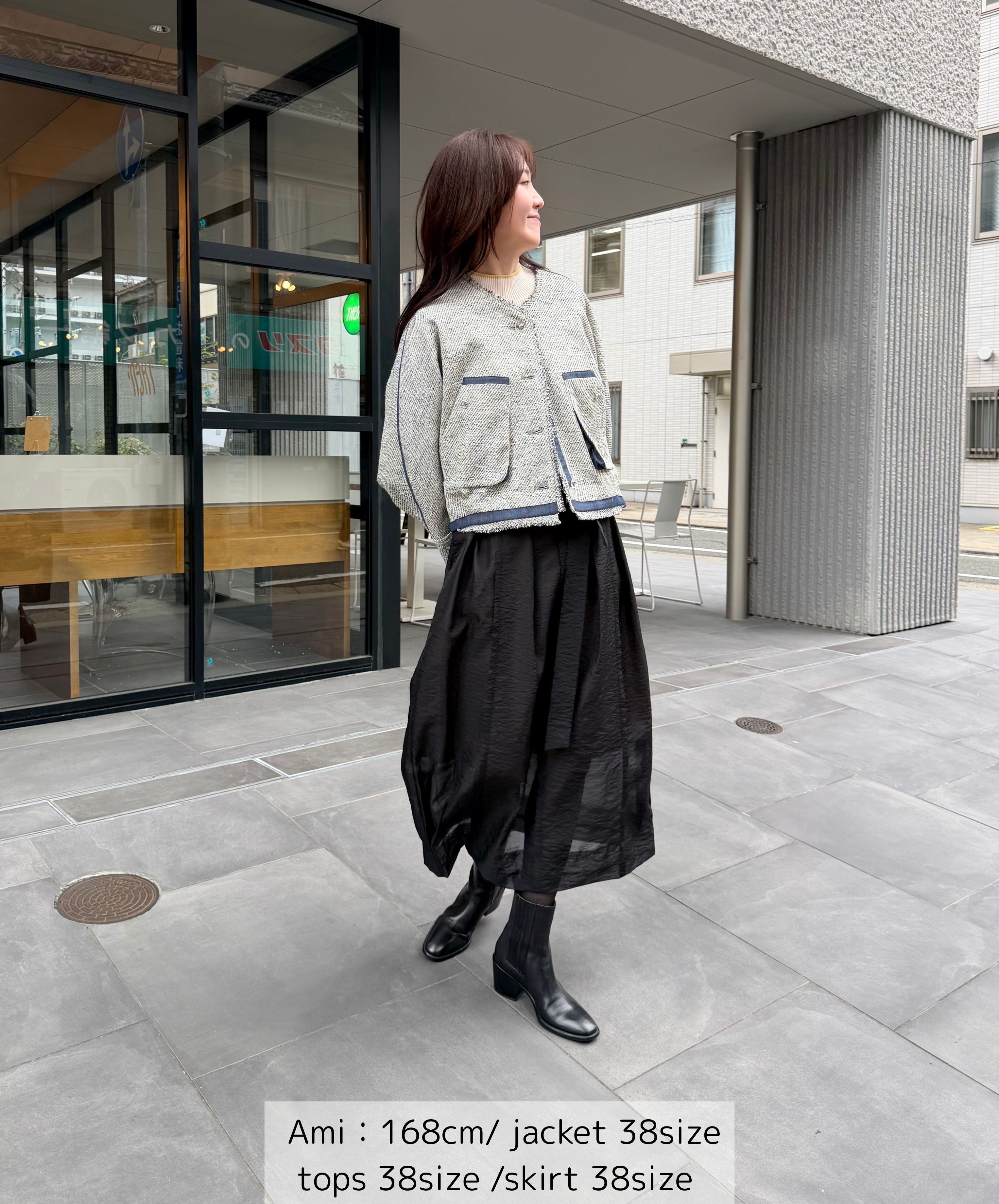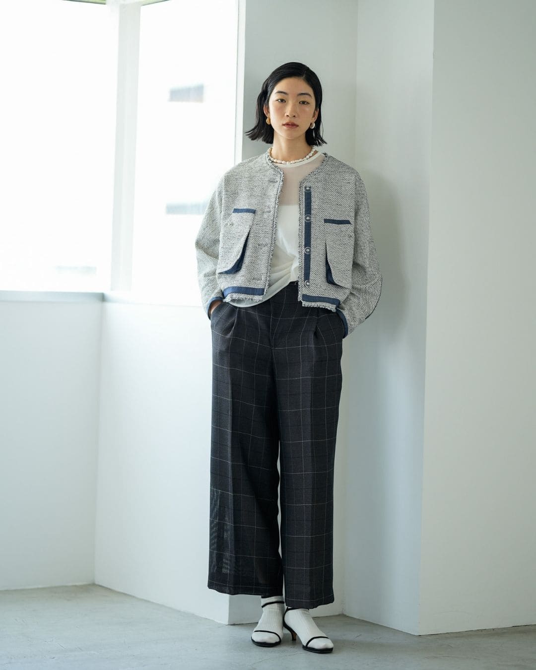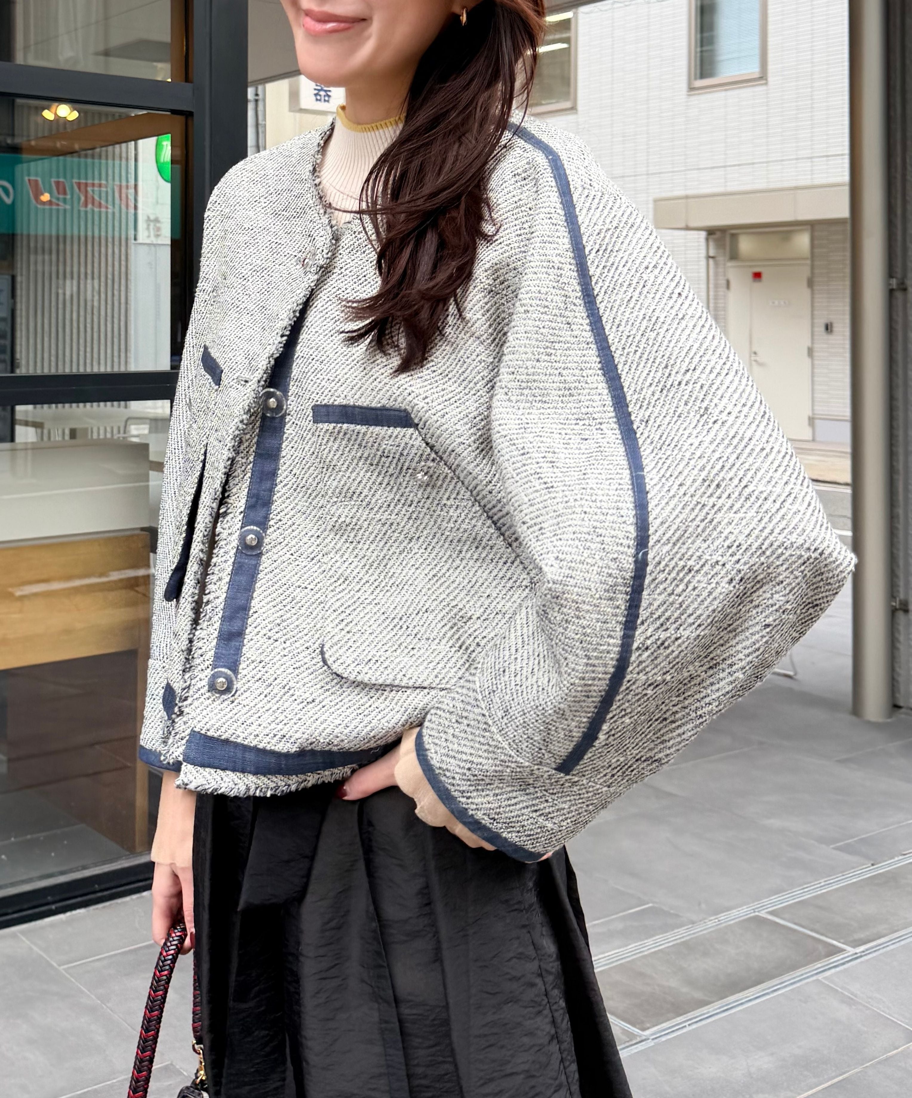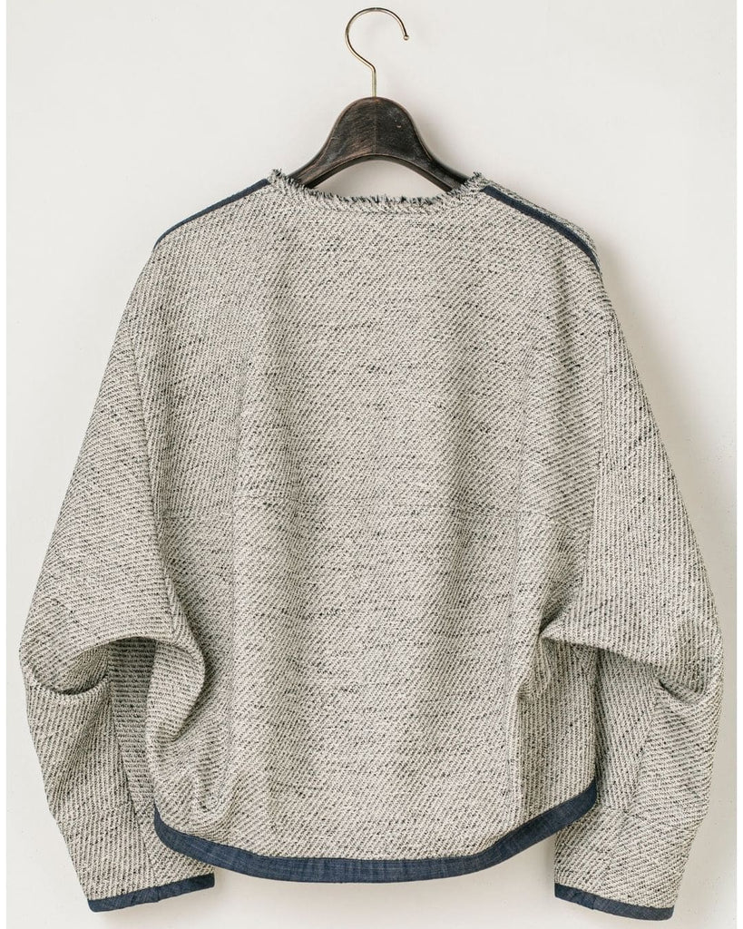 国内有数の毛織物の産地、尾州で丁寧に織り上げられた美しいツイードツイル生地を使用したデザインジャケット。綿やポリエステル、アクリルのスラブ糸が織りなす、上品で涼やかな表情が魅力のツイードです。前身頃から衿ぐりには、生地の耳(セルビッチ)を活かしたフリンジを施し、素材の魅力を最大限に引き出しました。(※フリンジの長さにはバラつきが出ることもあります。)買い付けた、インポートのクリアボタンが透明感のある表情でスタイルにアクセントを添えます。シャンブレー生地をドッキングすることで気負わずに着れるジャケットに仕立てました。見た目以上に軽い着心地で、カジュアルさとツイードのエレガンスが絶妙に組み合わさり、どんなシーンでも活躍する一着です。