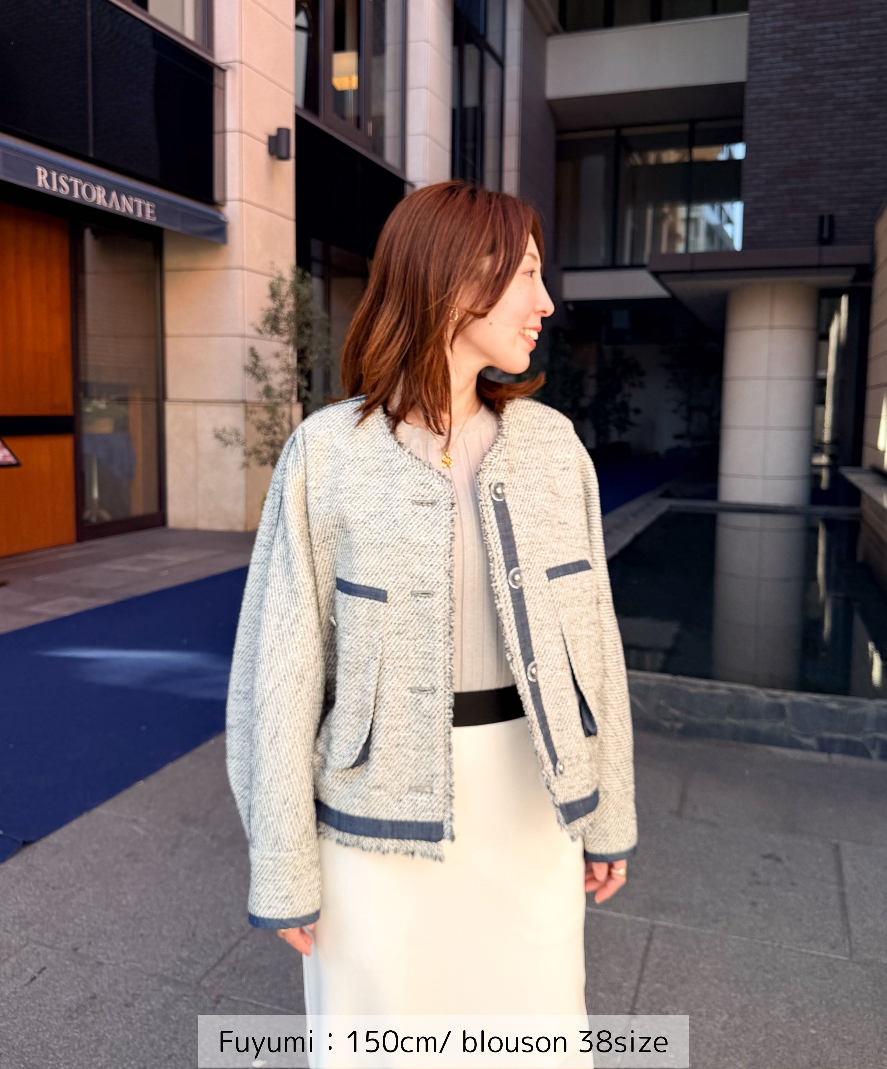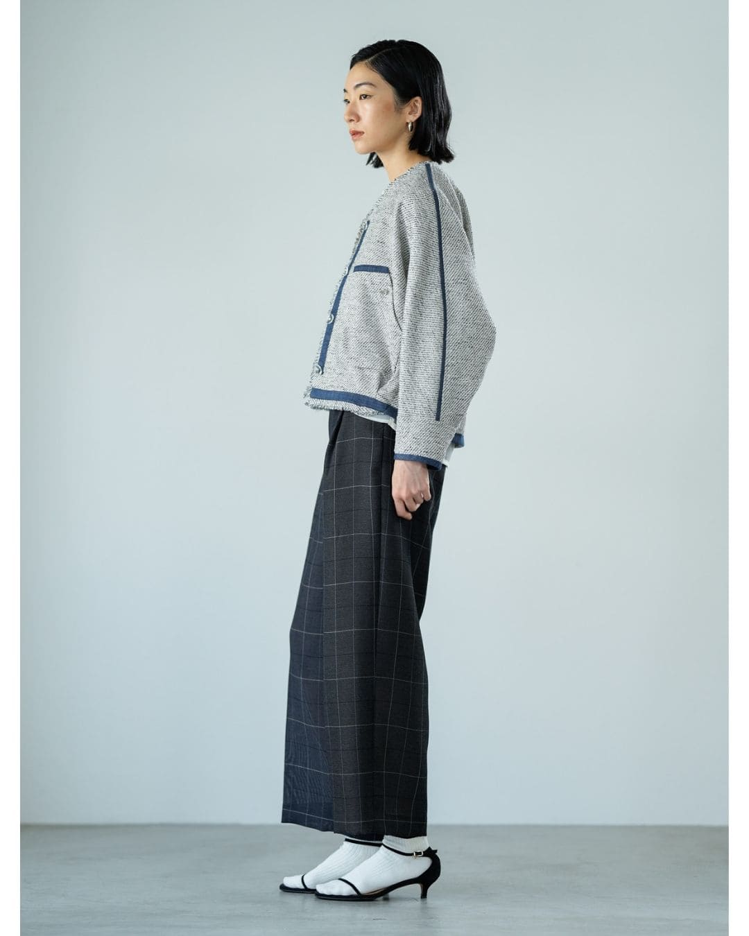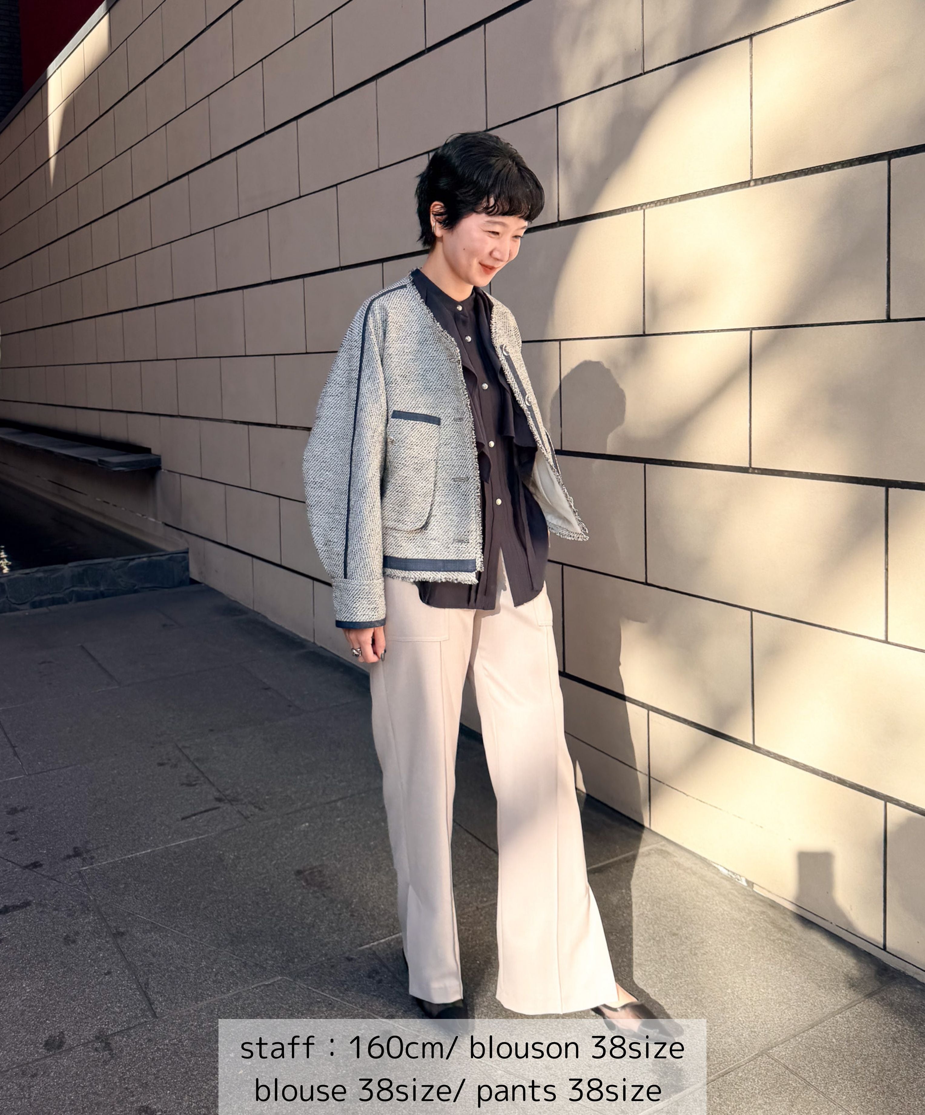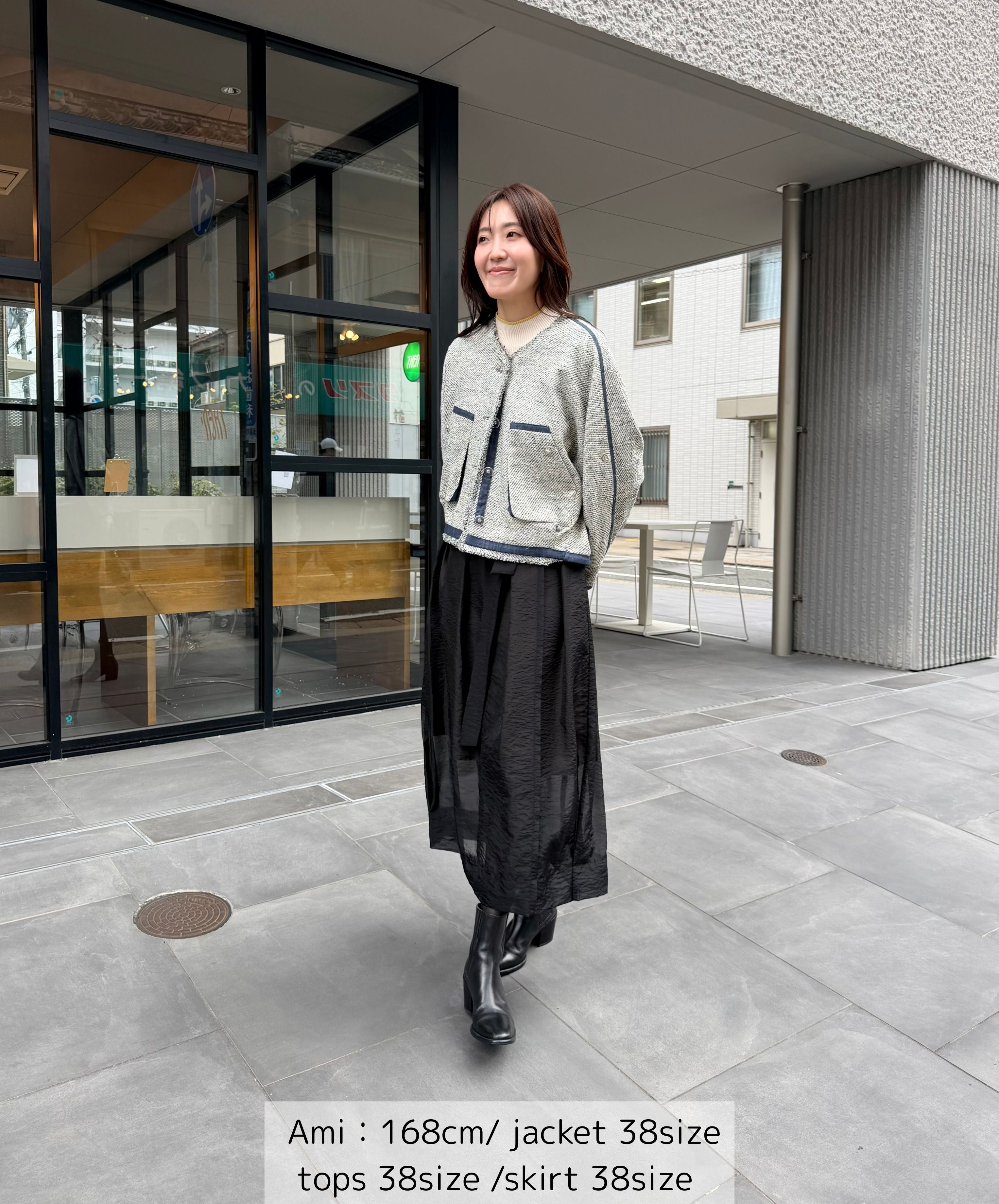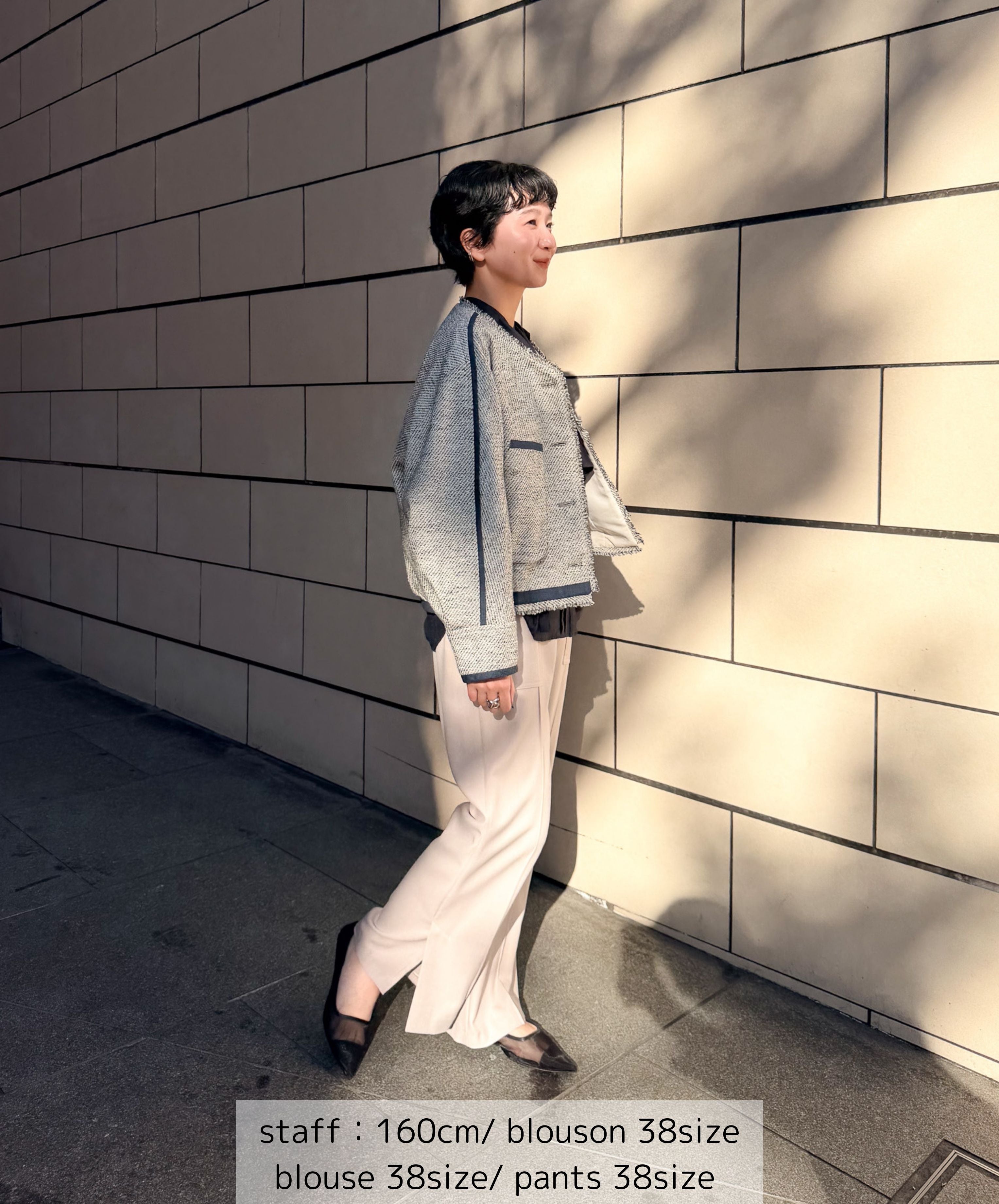 国内有数の毛織物の産地、尾州で丁寧に織り上げられた美しいツイードツイル生地を使用したデザインジャケット。綿やポリエステル、アクリルのスラブ糸が織りなす、上品で涼やかな表情が魅力のツイードです。前身頃から衿ぐりには、生地の耳(セルビッチ)を活かしたフリンジを施し、素材の魅力を最大限に引き出しました。(※フリンジの長さにはバラつきが出ることもあります。)買い付けた、インポートのクリアボタンが透明感のある表情でスタイルにアクセントを添えます。シャンブレー生地をドッキングすることで気負わずに着れるジャケットに仕立てました。見た目以上に軽い着心地で、カジュアルさとツイードのエレガンスが絶妙に組み合わさり、どんなシーンでも活躍する一着です。