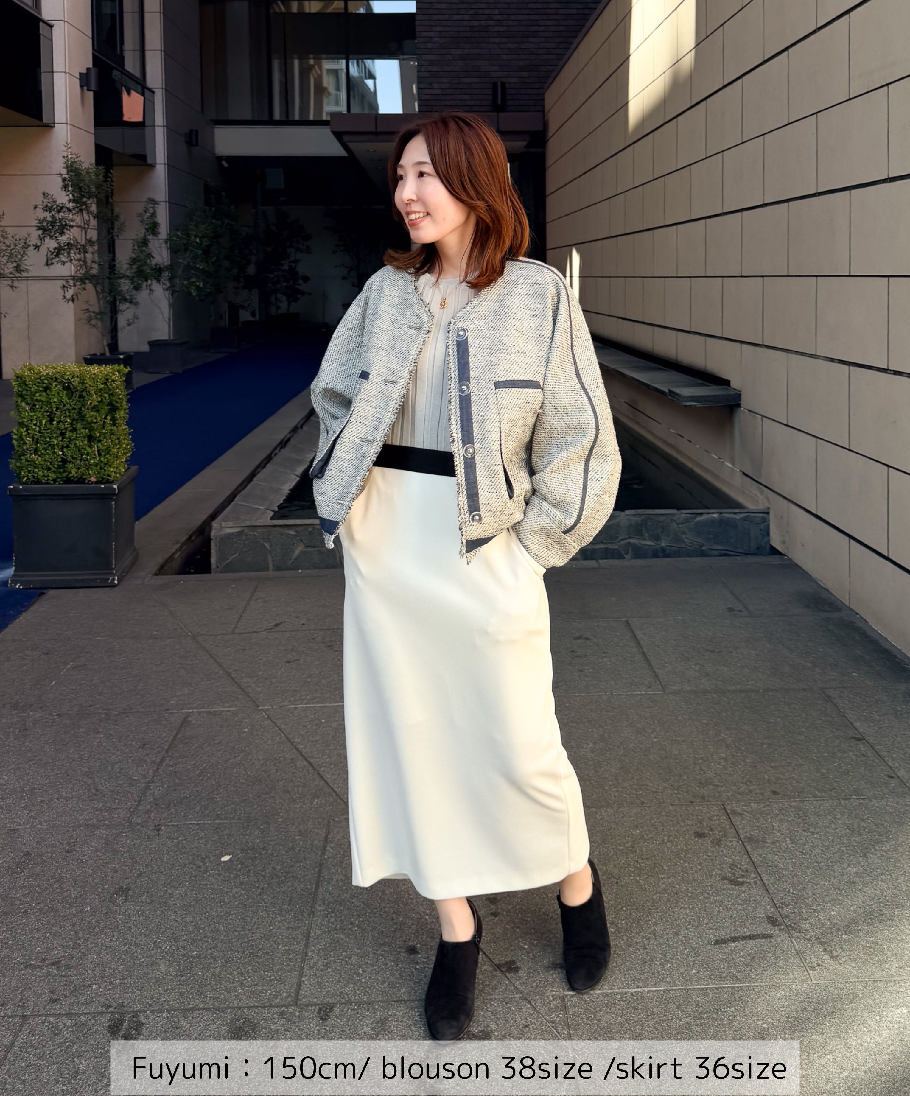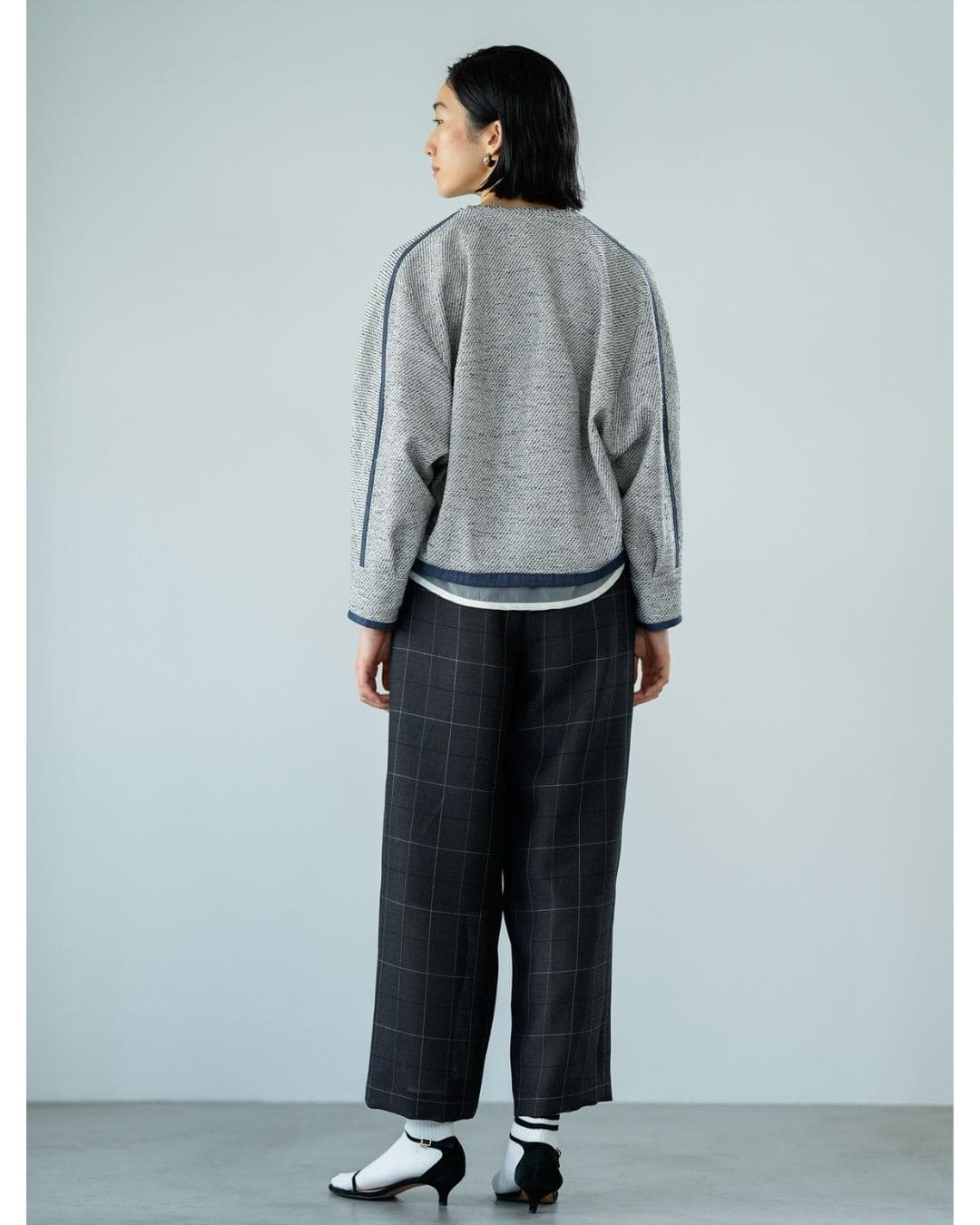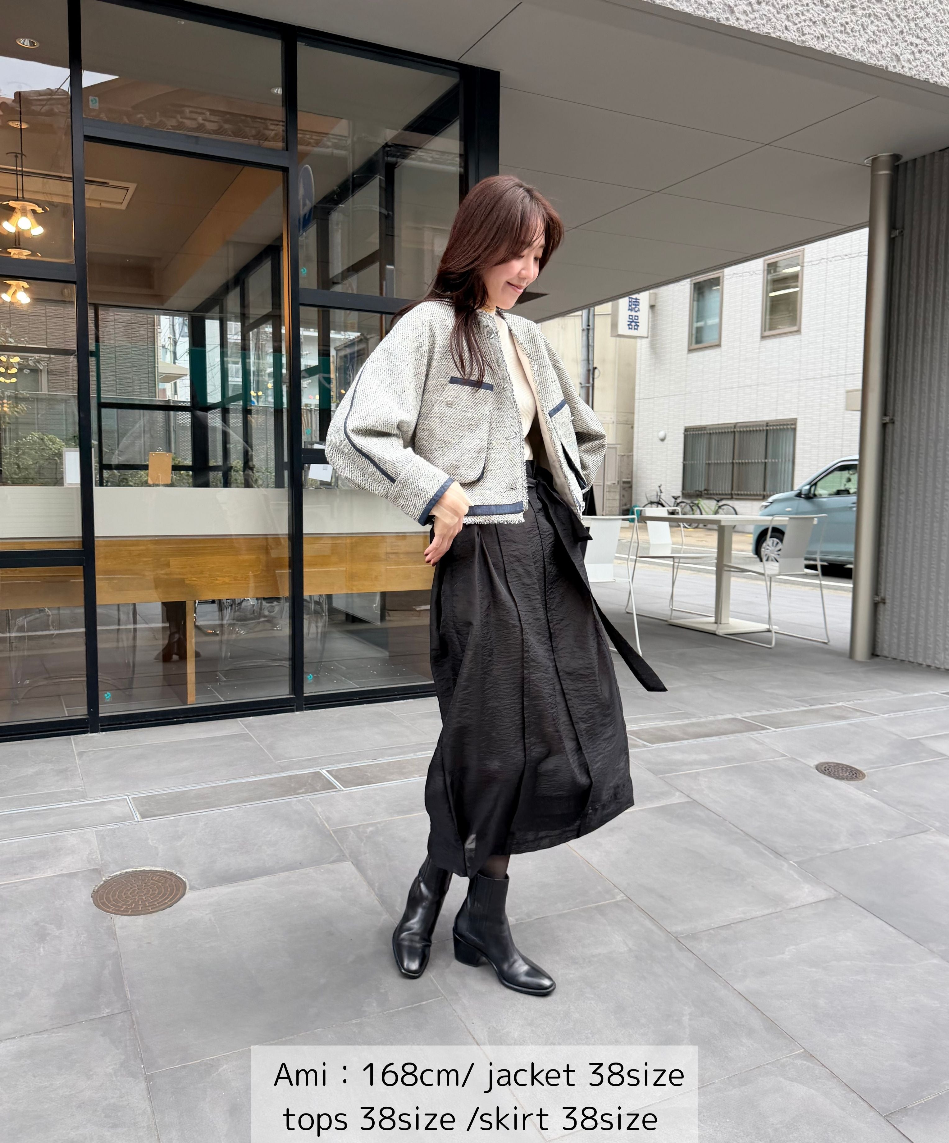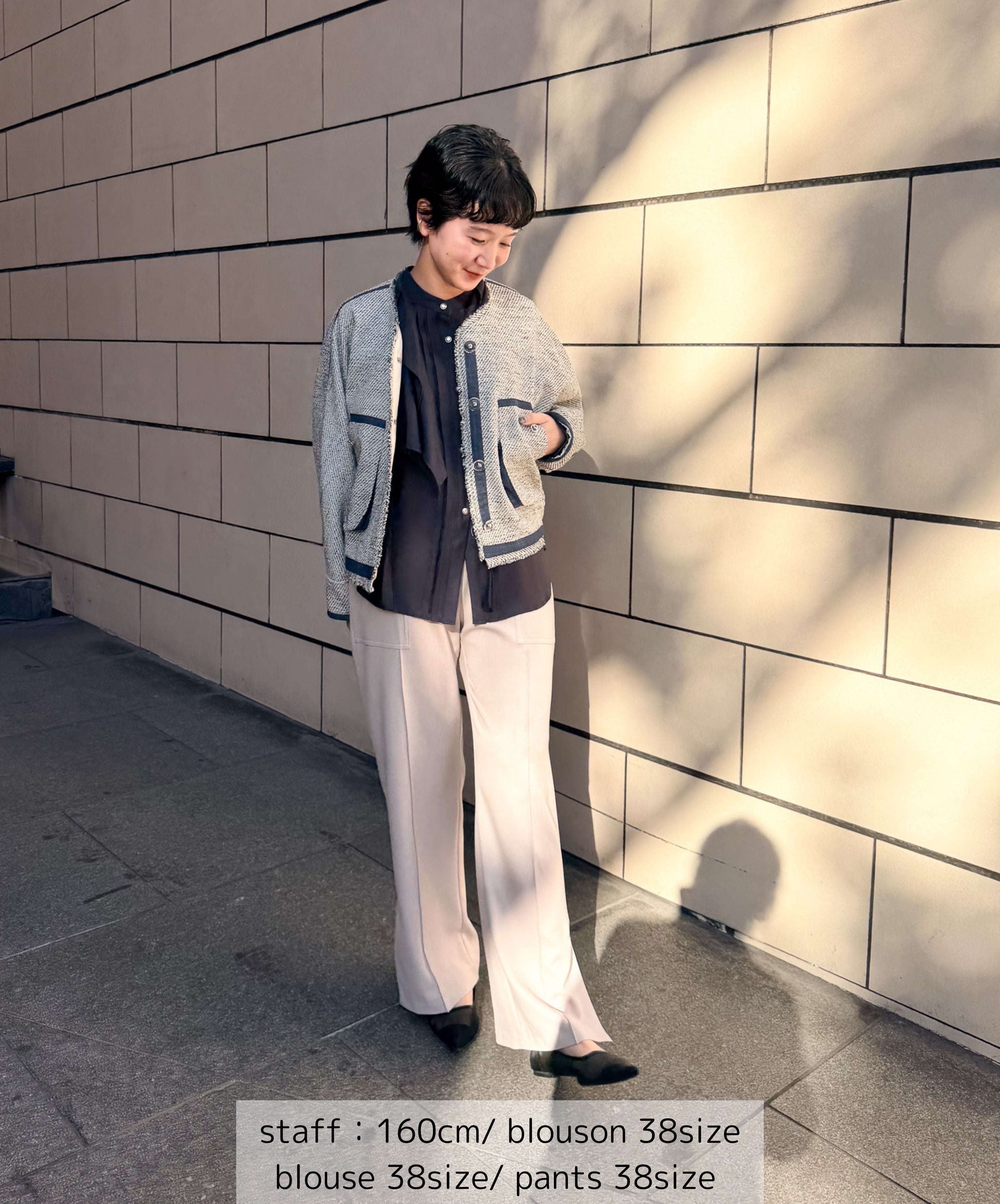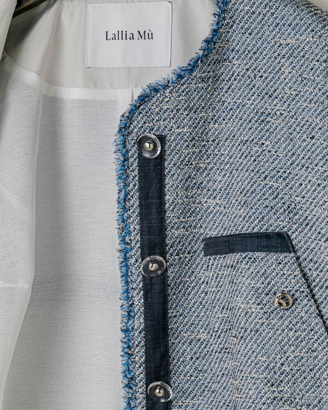 国内有数の毛織物の産地、尾州で丁寧に織り上げられた美しいツイードツイル生地を使用したデザインジャケット。綿やポリエステル、アクリルのスラブ糸が織りなす、上品で涼やかな表情が魅力のツイードです。前身頃から衿ぐりには、生地の耳(セルビッチ)を活かしたフリンジを施し、素材の魅力を最大限に引き出しました。(※フリンジの長さにはバラつきが出ることもあります。)買い付けた、インポートのクリアボタンが透明感のある表情でスタイルにアクセントを添えます。シャンブレー生地をドッキングすることで気負わずに着れるジャケットに仕立てました。見た目以上に軽い着心地で、カジュアルさとツイードのエレガンスが絶妙に組み合わさり、どんなシーンでも活躍する一着です。