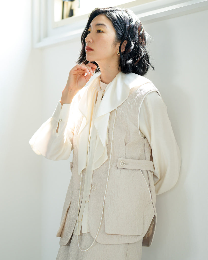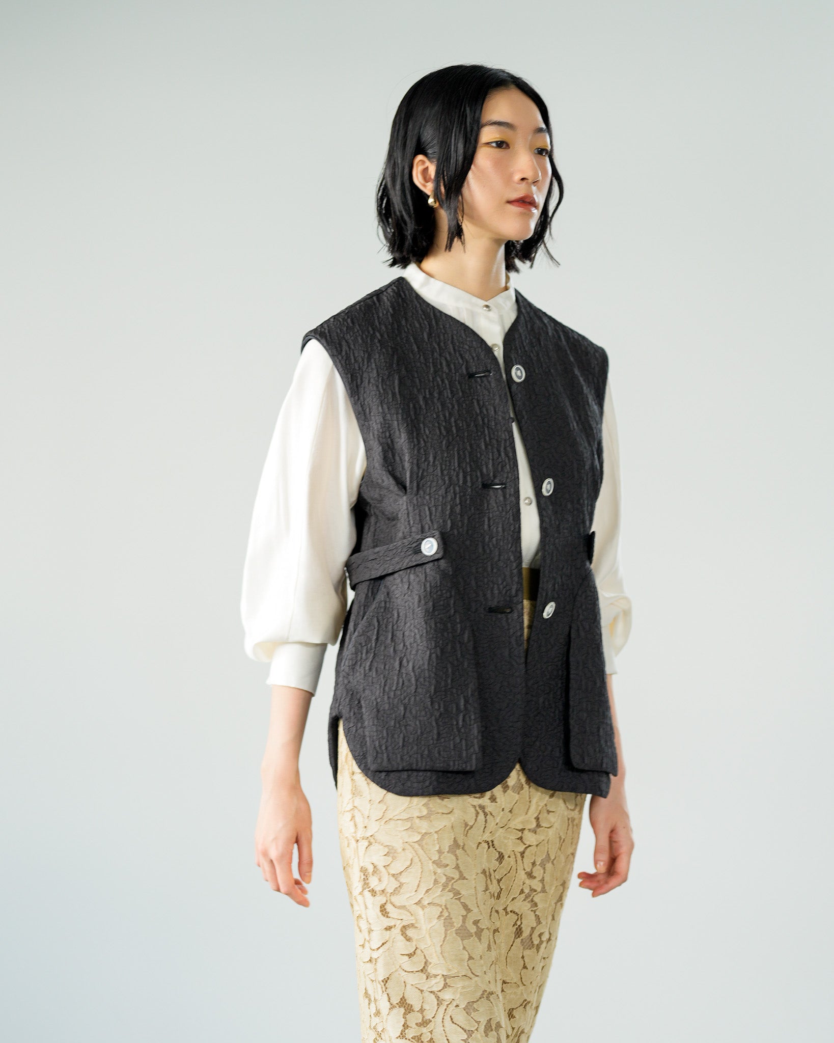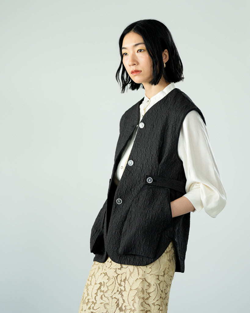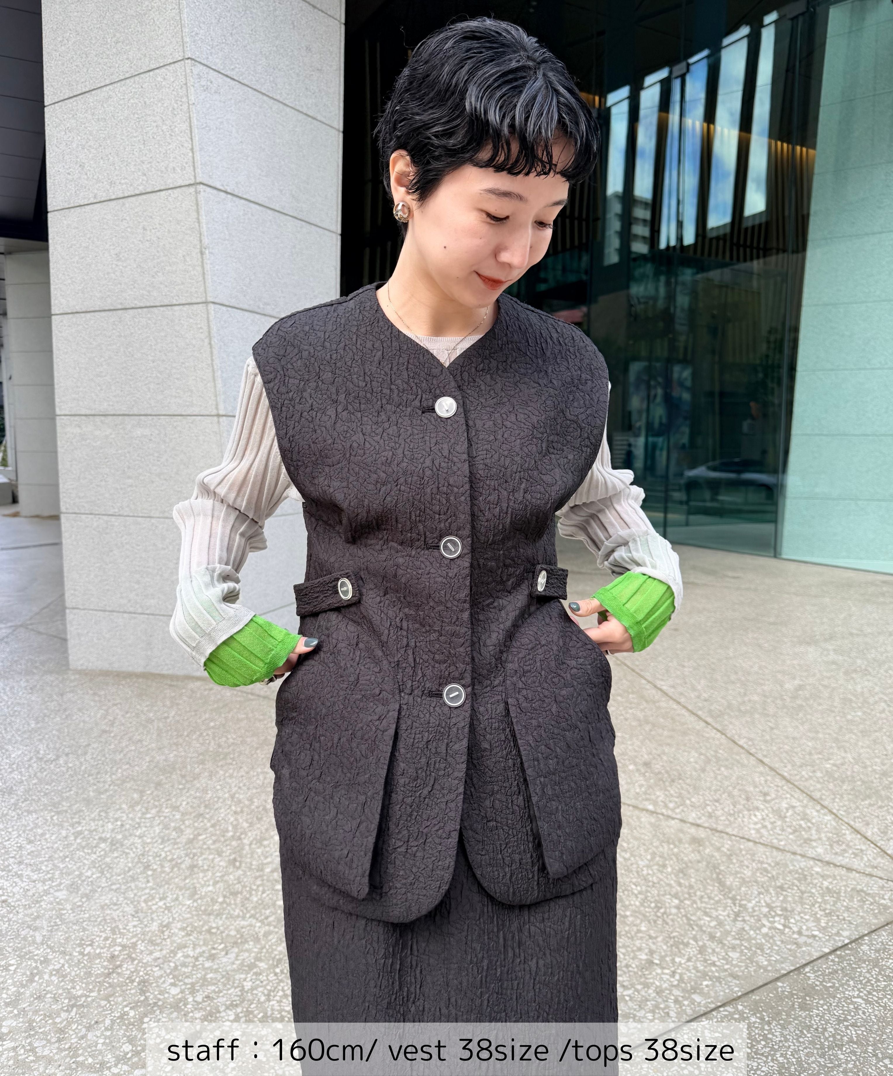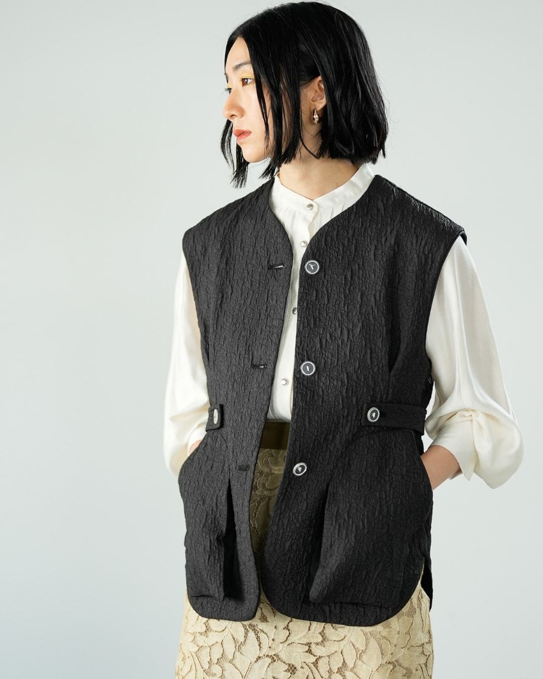 まとうだけでスタイリッシュに決まる、感度高めなふくれジャガードベスト。いつものスタイルにプラスするだけで、グッと洗練された印象に。トレンドのふくれジャガード素材を使用したデザインベストです。ふんわりと立体感のある素材がシンプルながらも表情豊かなムードを演出。裾は柔らかな曲線を描く、ラウンドヘムで、気になる腰回りをさりげなくカバーしながら、女性らしい雰囲気をかもします。同素材のスカート合わせれば、セットアップスタイルでも着用でき、セレモニーシーンなどオケージョンにもおすすめです。インナーを選ばず、ニットからカットソー、ブラウスなど着こなしの幅も広く、季節の変わり目や着こなしに悩んだ時に頼れる、大人のワードローブの新定番アイテムです。