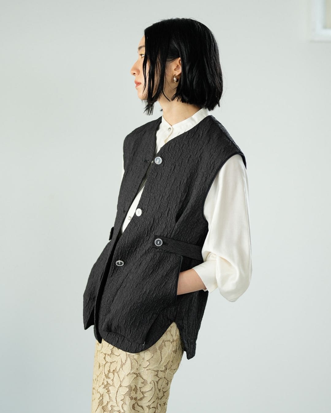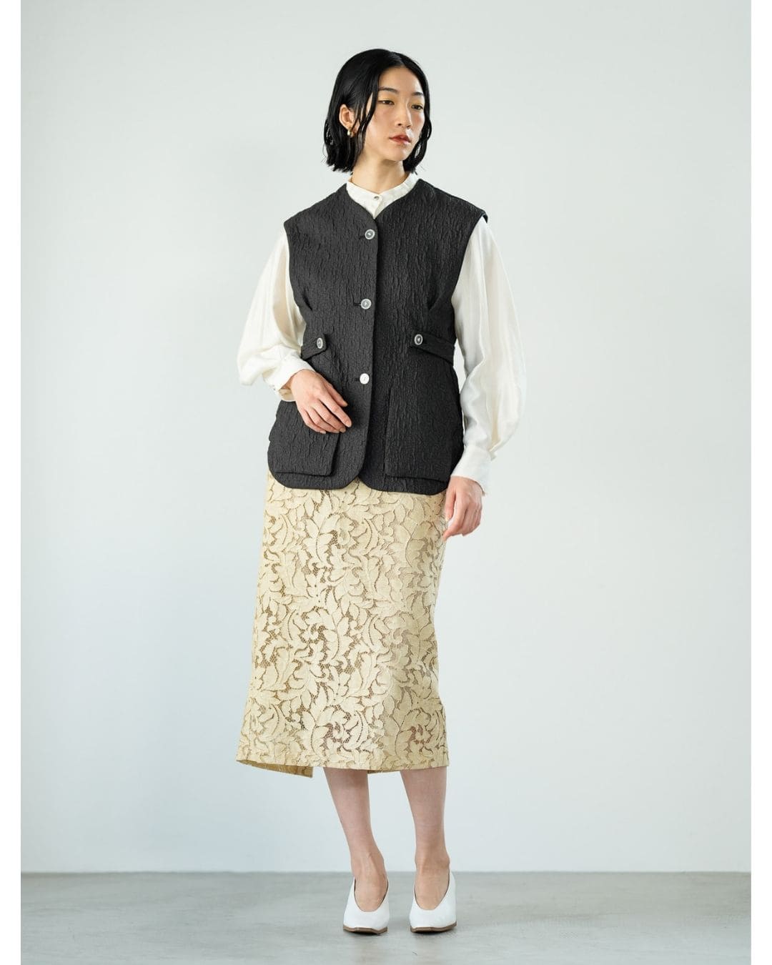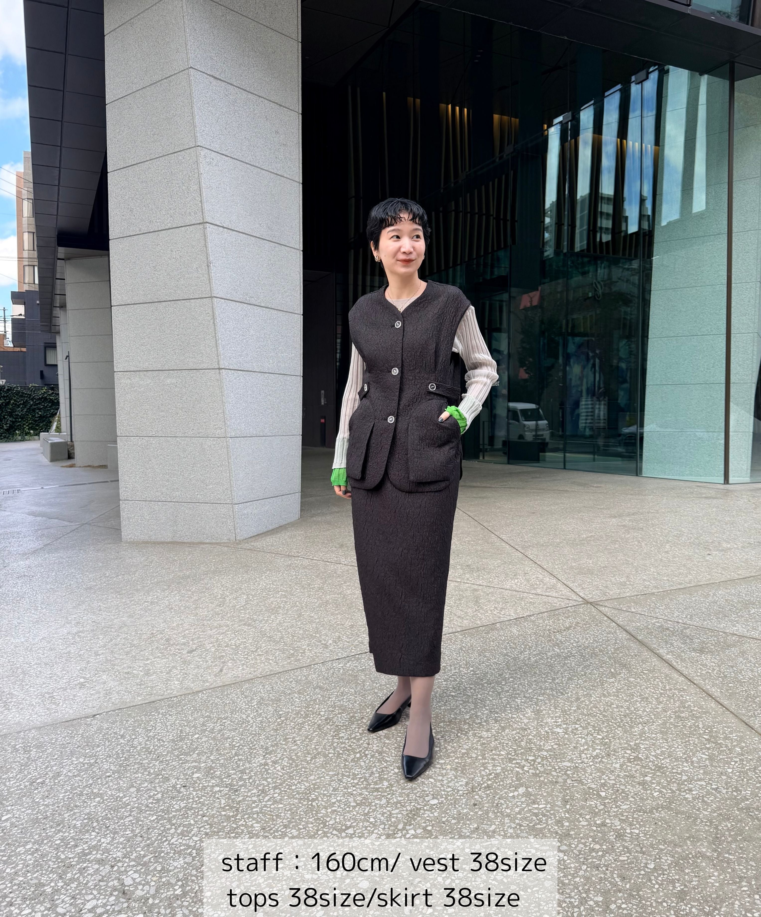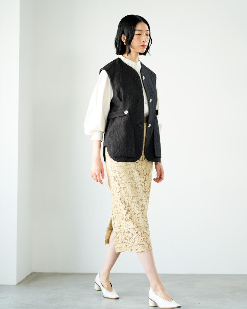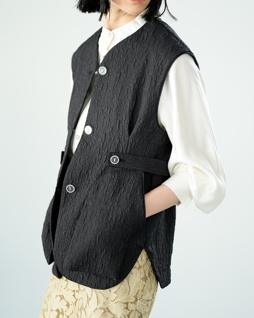 まとうだけでスタイリッシュに決まる、感度高めなふくれジャガードベスト。いつものスタイルにプラスするだけで、グッと洗練された印象に。トレンドのふくれジャガード素材を使用したデザインベストです。ふんわりと立体感のある素材がシンプルながらも表情豊かなムードを演出。裾は柔らかな曲線を描く、ラウンドヘムで、気になる腰回りをさりげなくカバーしながら、女性らしい雰囲気をかもします。同素材のスカート合わせれば、セットアップスタイルでも着用でき、セレモニーシーンなどオケージョンにもおすすめです。インナーを選ばず、ニットからカットソー、ブラウスなど着こなしの幅も広く、季節の変わり目や着こなしに悩んだ時に頼れる、大人のワードローブの新定番アイテムです。