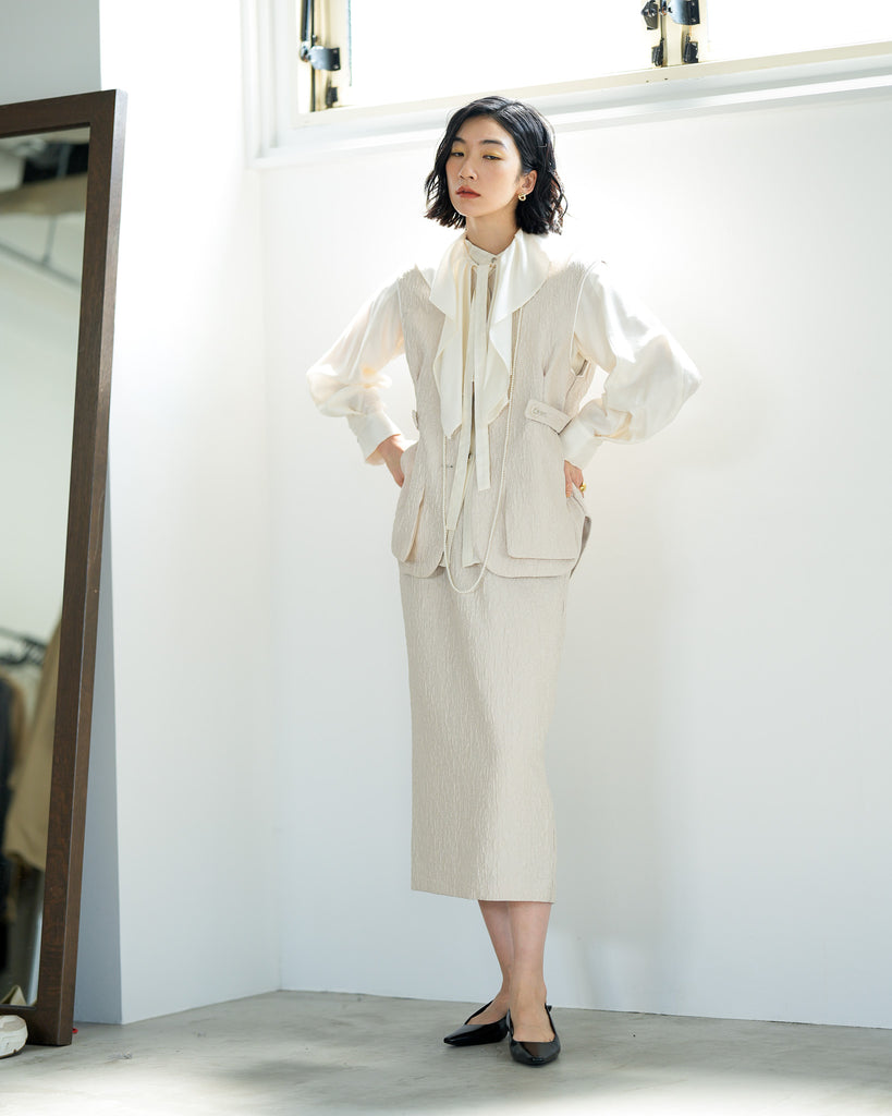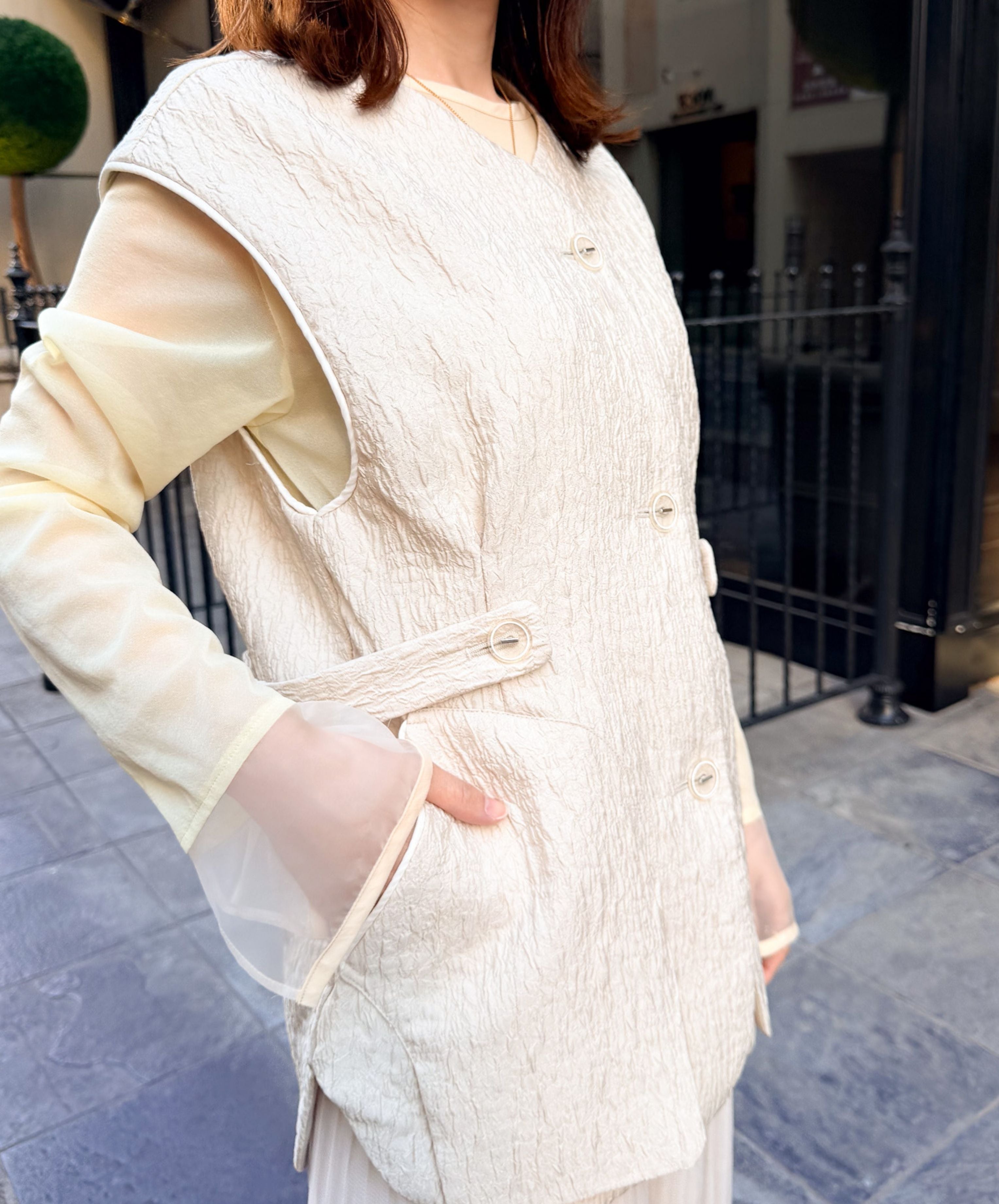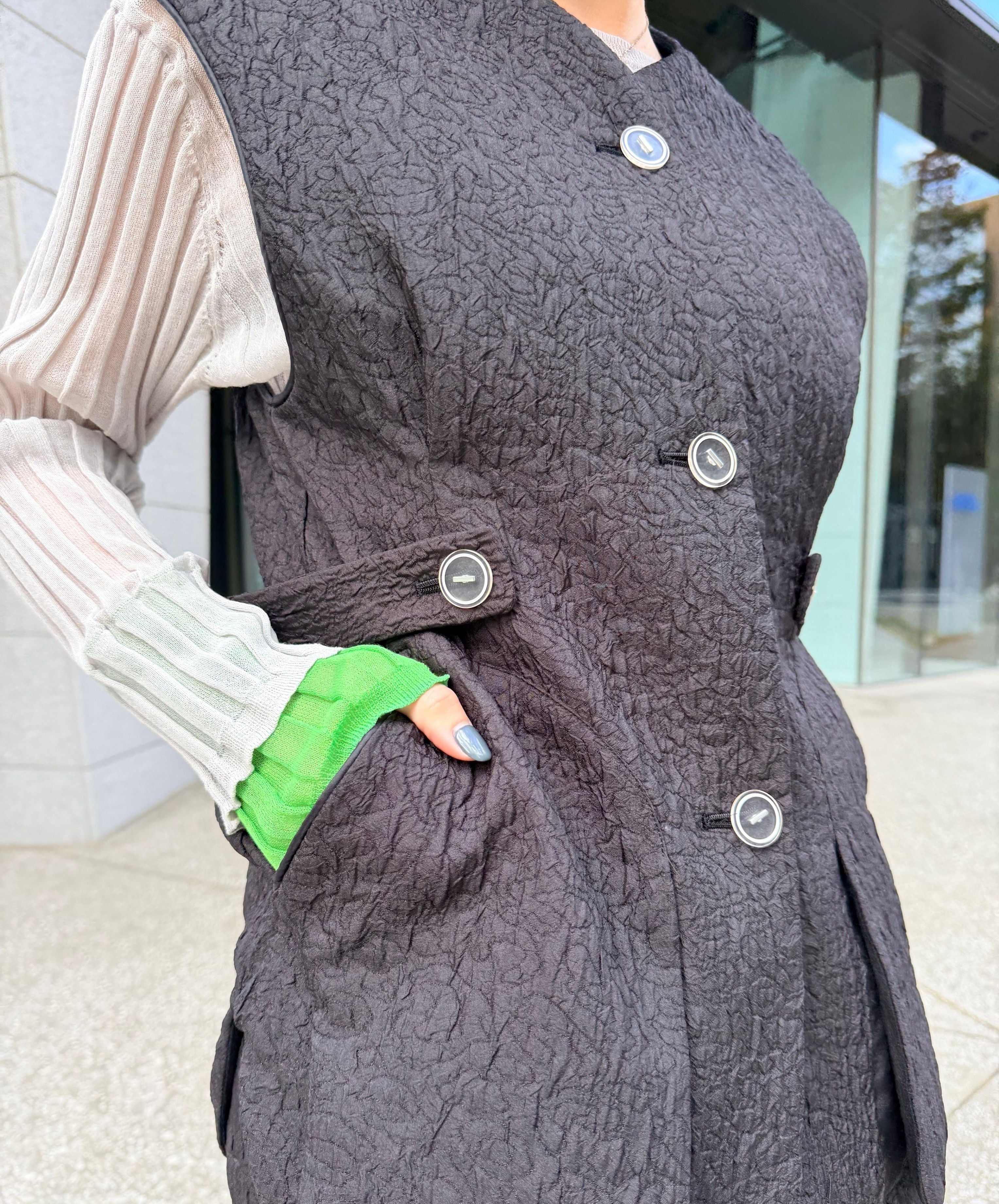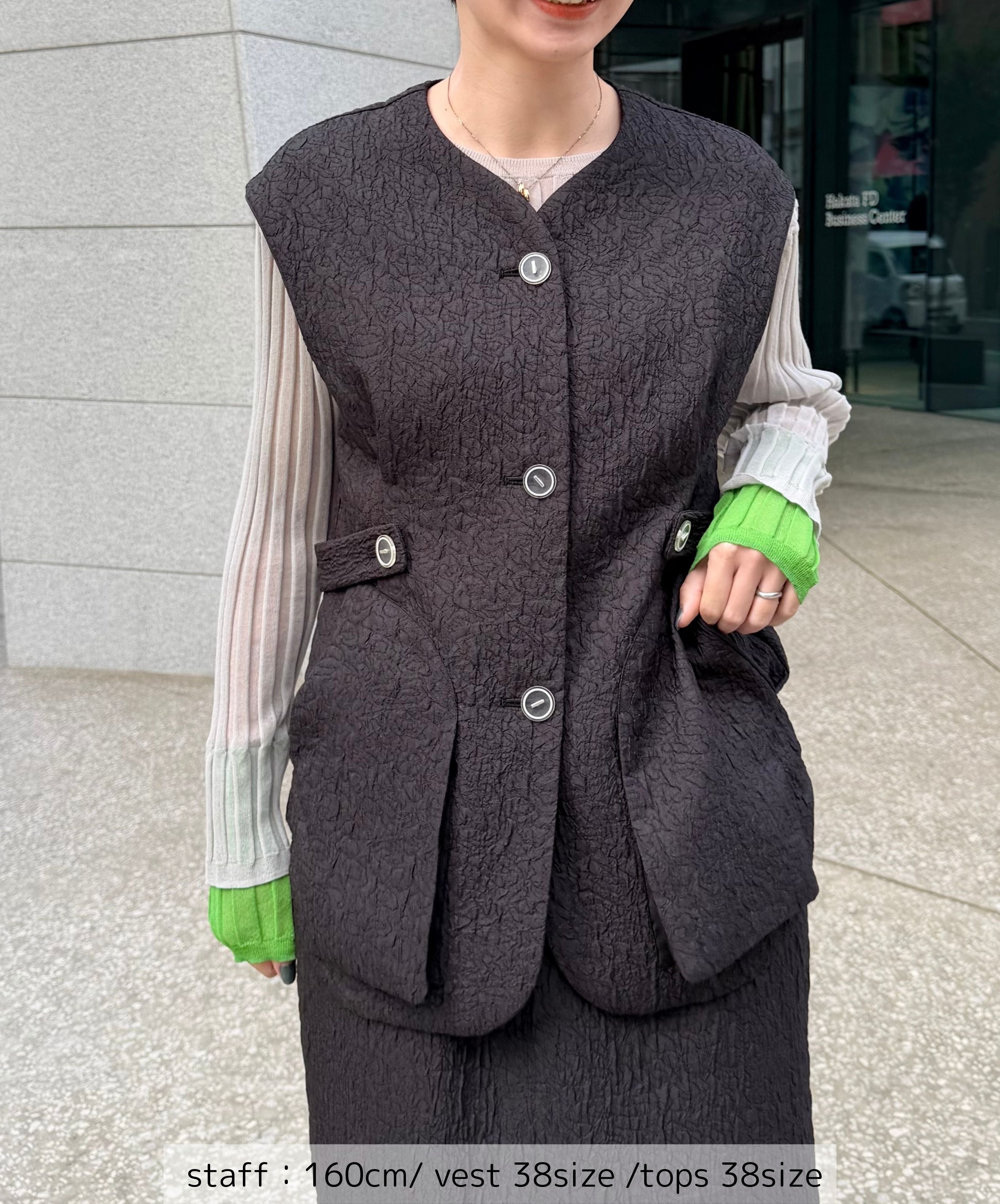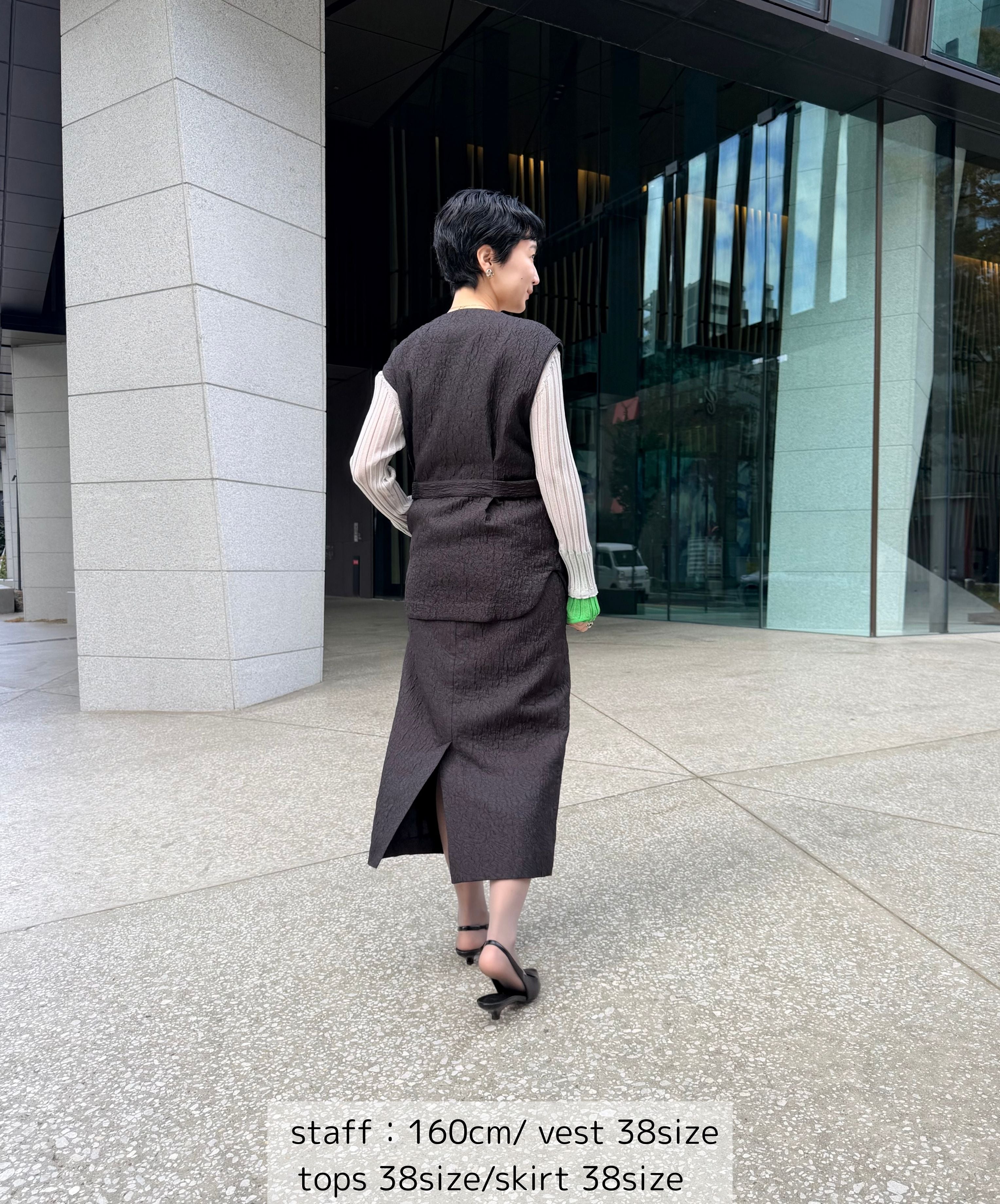 まとうだけでスタイリッシュに決まる、感度高めなふくれジャガードベスト。いつものスタイルにプラスするだけで、グッと洗練された印象に。トレンドのふくれジャガード素材を使用したデザインベストです。ふんわりと立体感のある素材がシンプルながらも表情豊かなムードを演出。裾は柔らかな曲線を描く、ラウンドヘムで、気になる腰回りをさりげなくカバーしながら、女性らしい雰囲気をかもします。同素材のスカート合わせれば、セットアップスタイルでも着用でき、セレモニーシーンなどオケージョンにもおすすめです。インナーを選ばず、ニットからカットソー、ブラウスなど着こなしの幅も広く、季節の変わり目や着こなしに悩んだ時に頼れる、大人のワードローブの新定番アイテムです。
