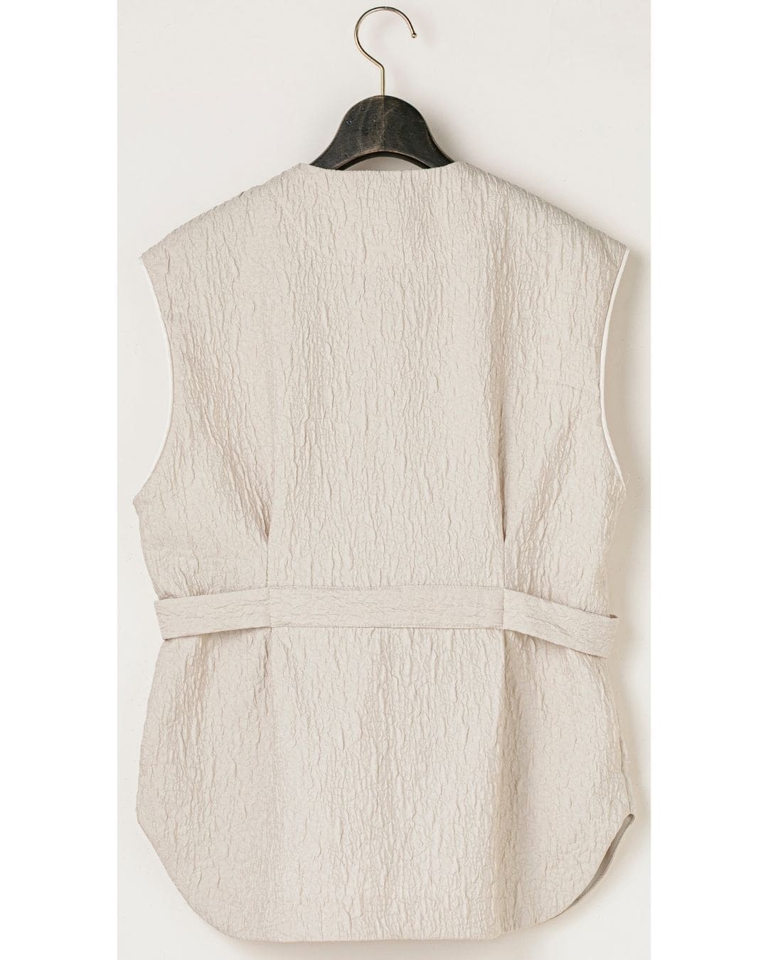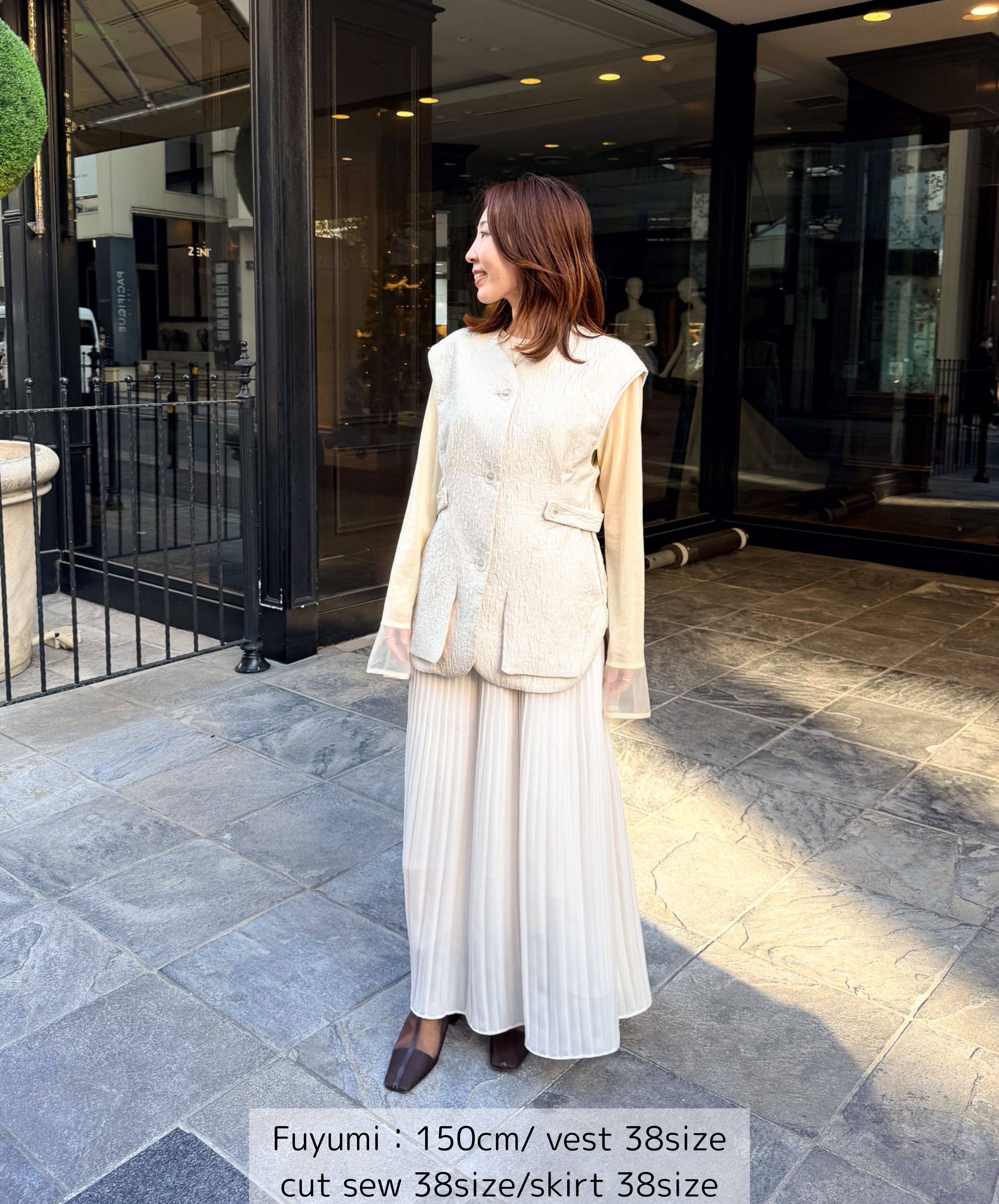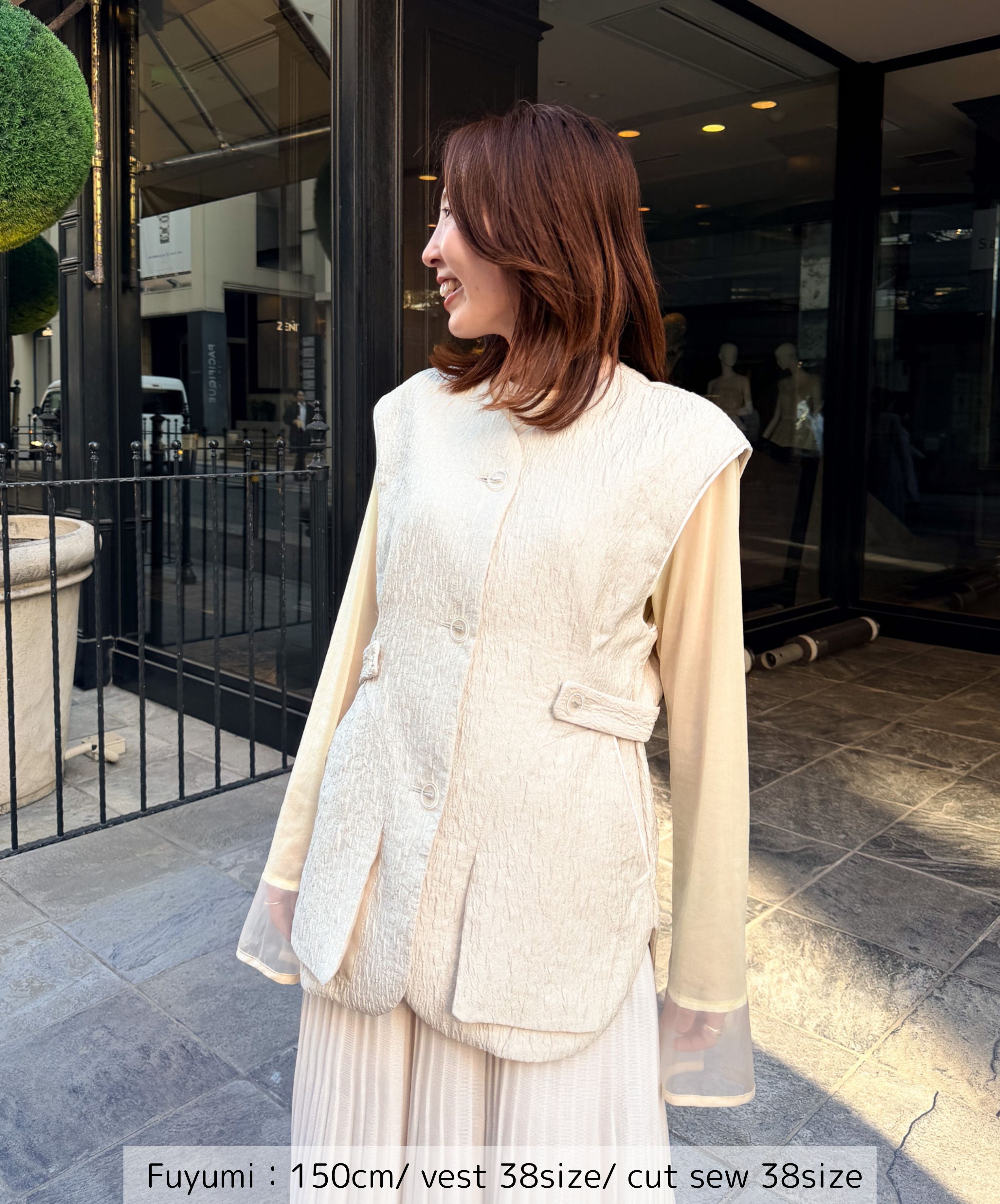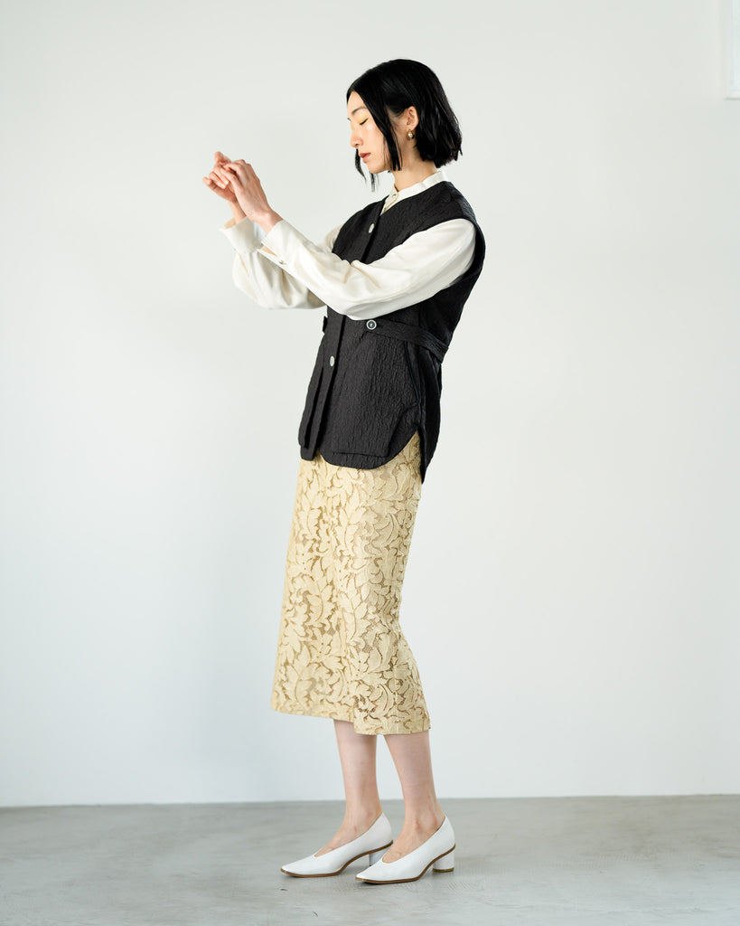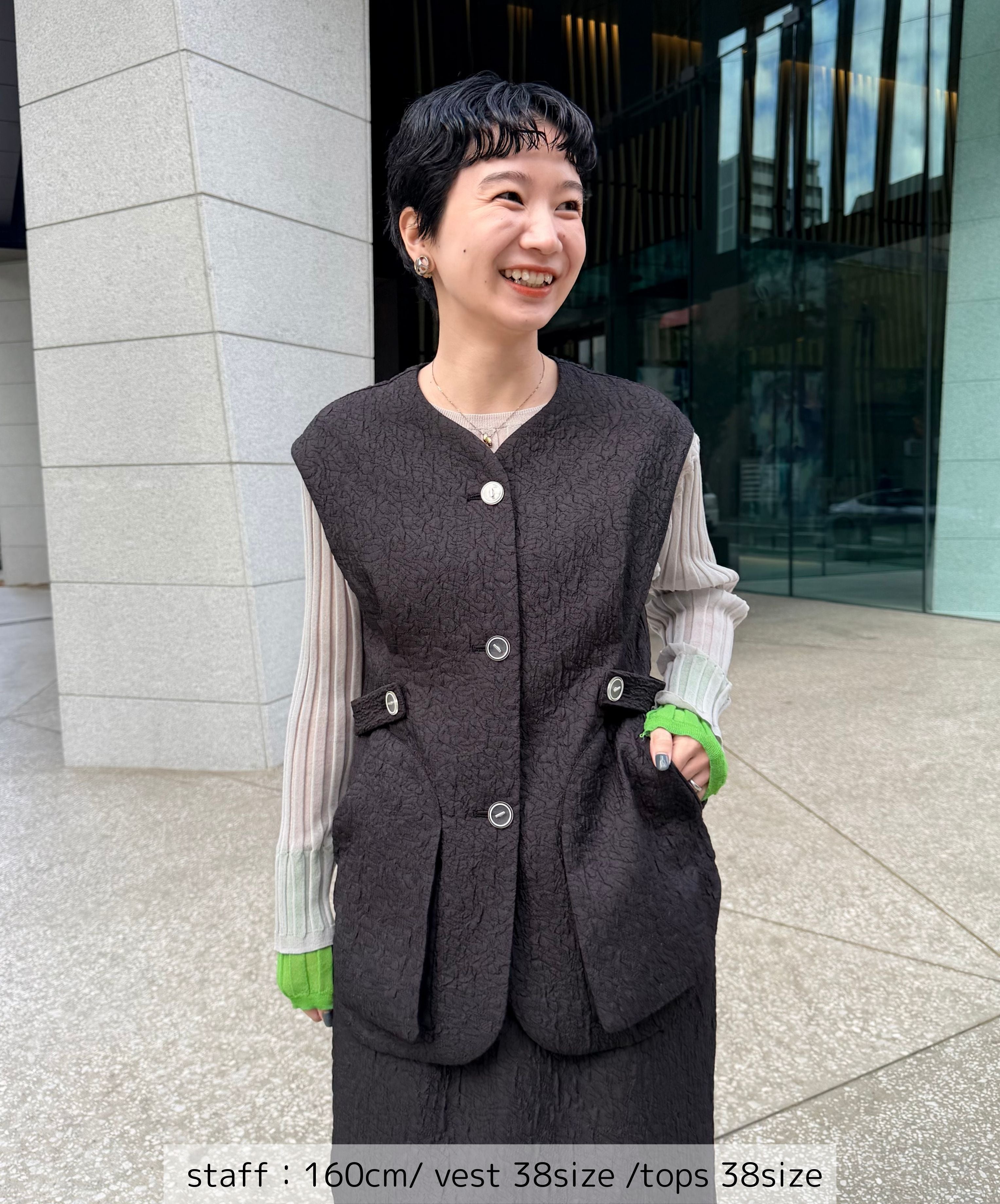 まとうだけでスタイリッシュに決まる、感度高めなふくれジャガードベスト。いつものスタイルにプラスするだけで、グッと洗練された印象に。トレンドのふくれジャガード素材を使用したデザインベストです。ふんわりと立体感のある素材がシンプルながらも表情豊かなムードを演出。裾は柔らかな曲線を描く、ラウンドヘムで、気になる腰回りをさりげなくカバーしながら、女性らしい雰囲気をかもします。同素材のスカート合わせれば、セットアップスタイルでも着用でき、セレモニーシーンなどオケージョンにもおすすめです。インナーを選ばず、ニットからカットソー、ブラウスなど着こなしの幅も広く、季節の変わり目や着こなしに悩んだ時に頼れる、大人のワードローブの新定番アイテムです。