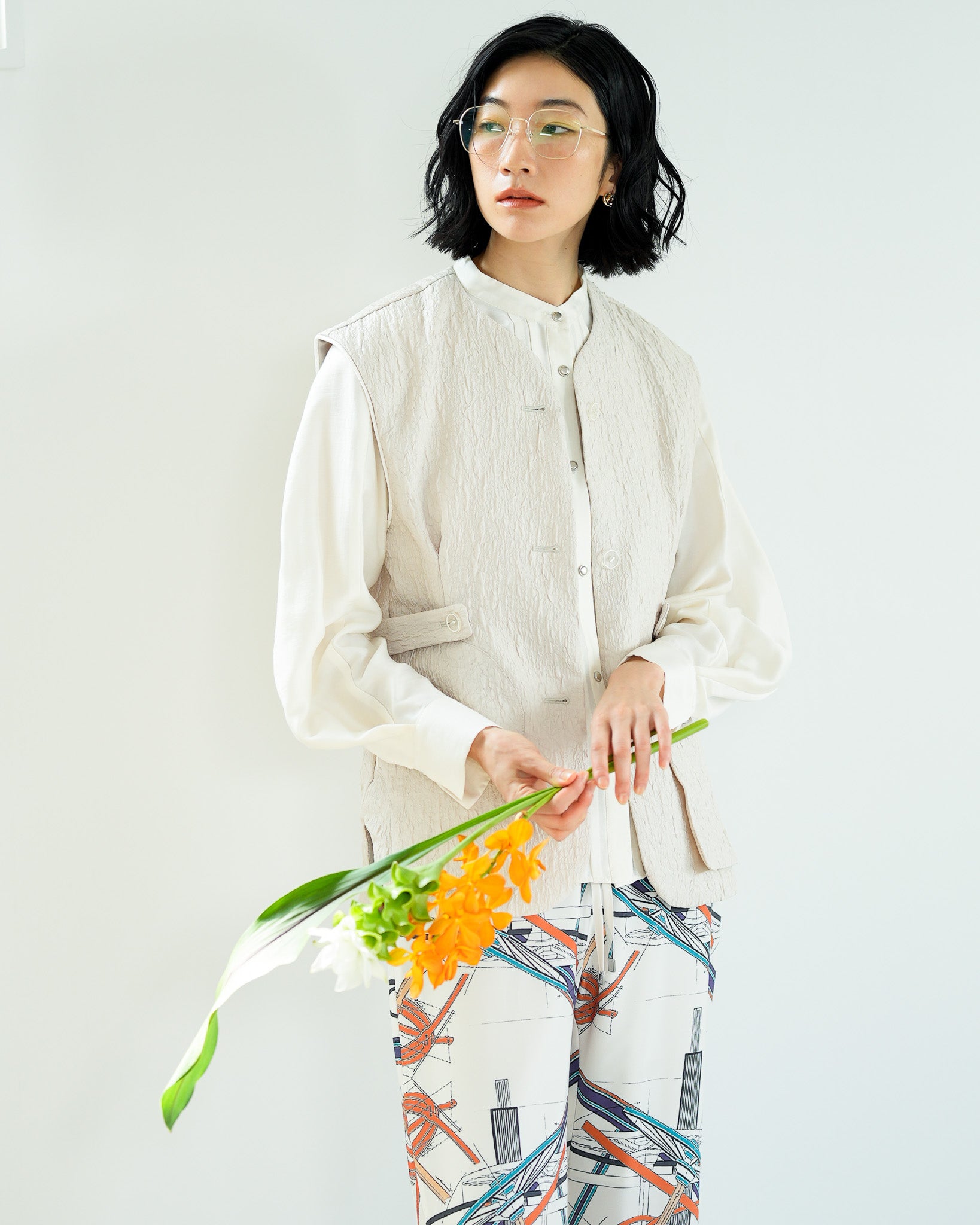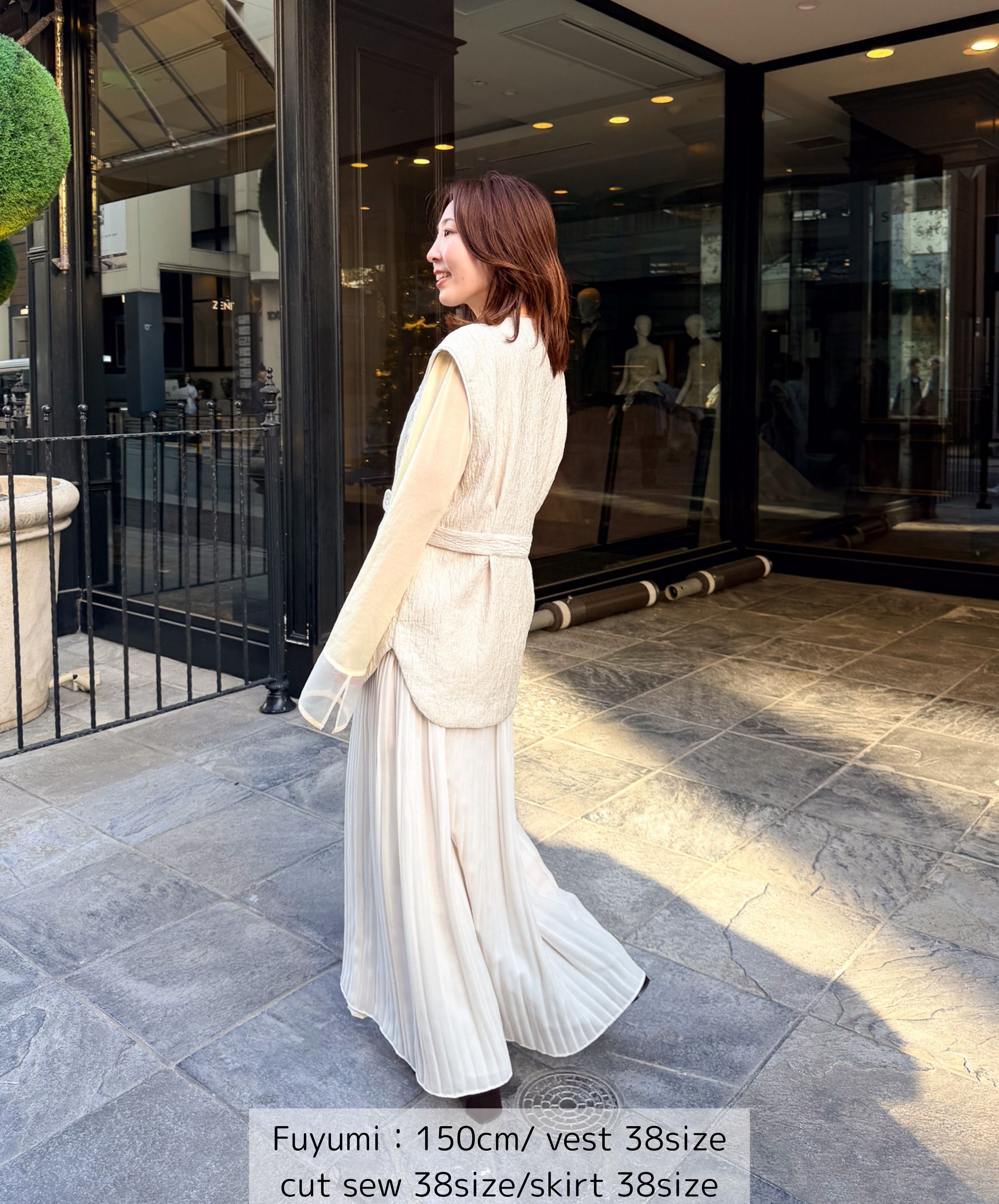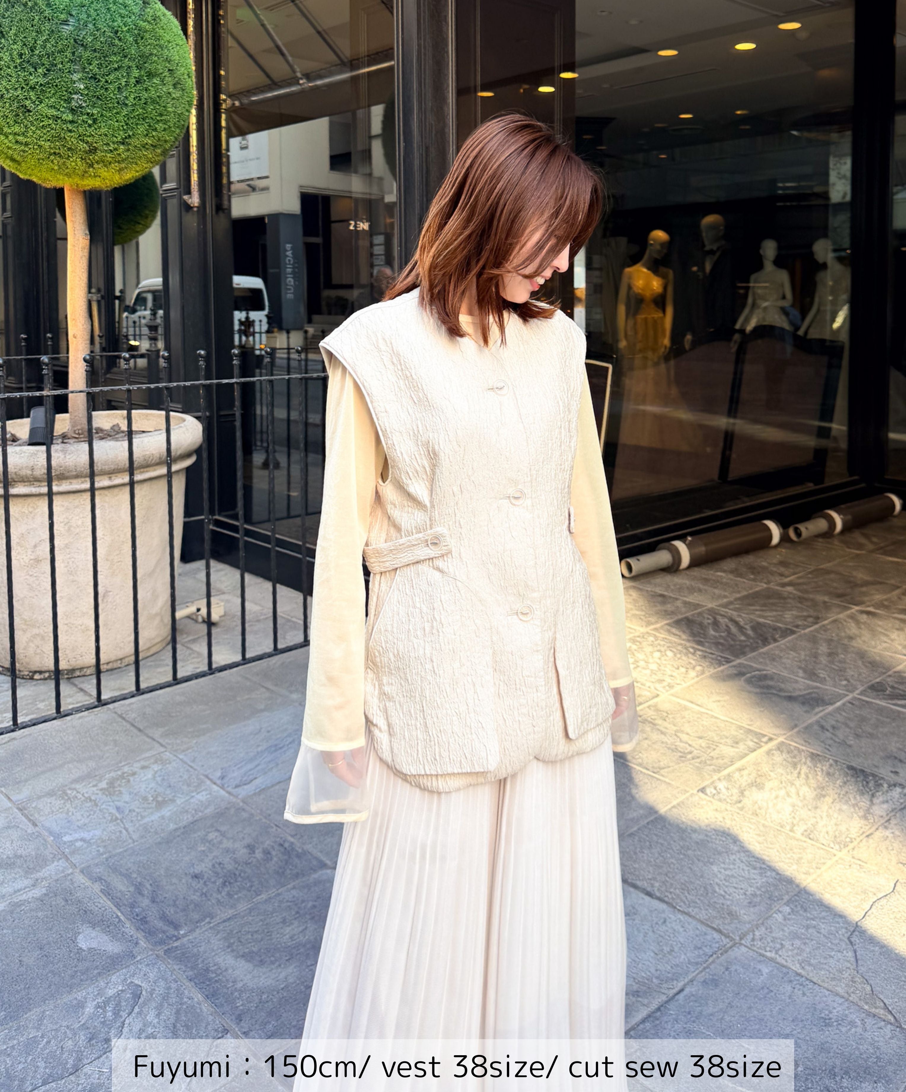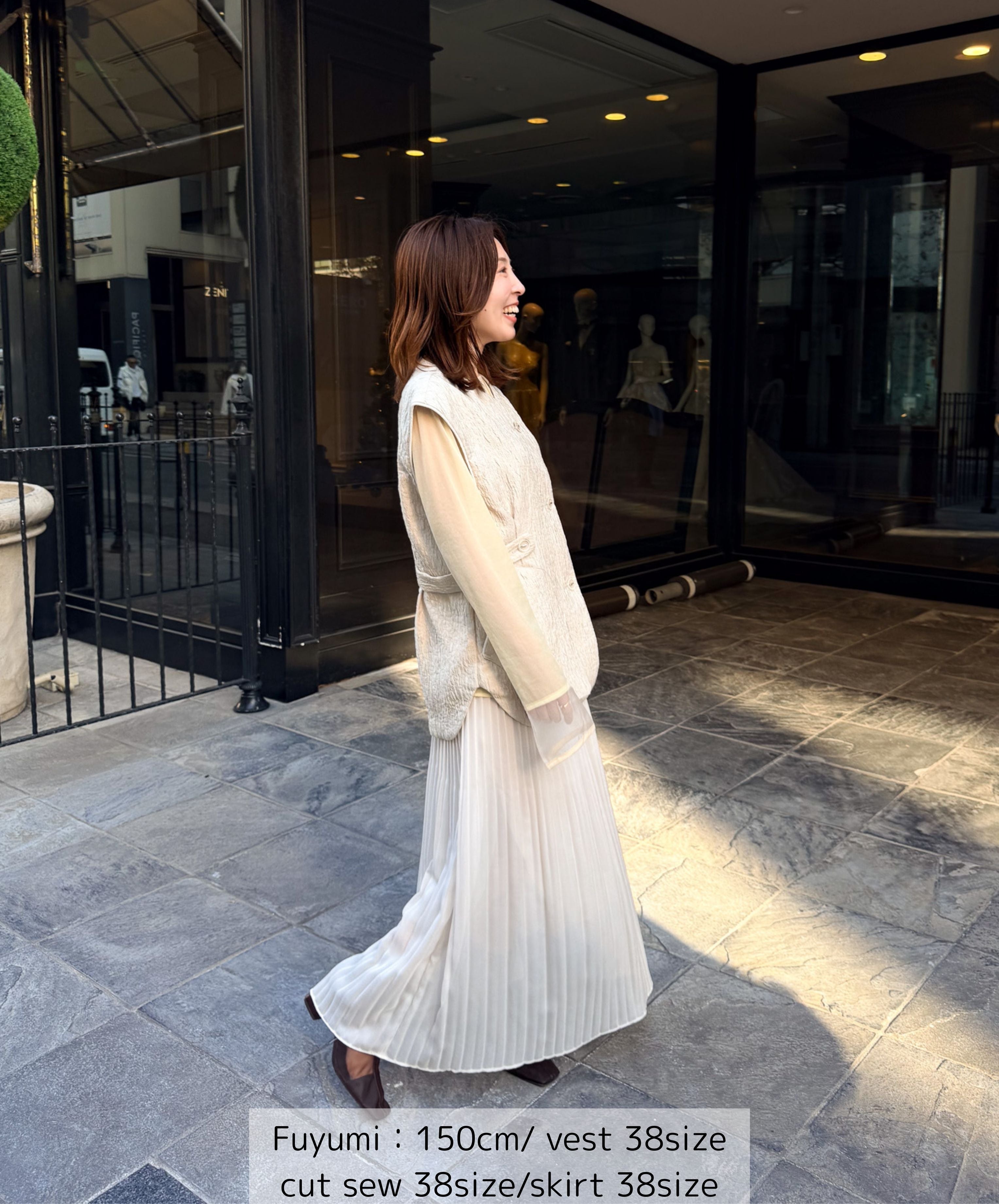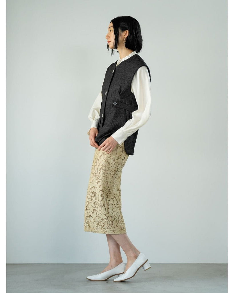 まとうだけでスタイリッシュに決まる、感度高めなふくれジャガードベスト。いつものスタイルにプラスするだけで、グッと洗練された印象に。トレンドのふくれジャガード素材を使用したデザインベストです。ふんわりと立体感のある素材がシンプルながらも表情豊かなムードを演出。裾は柔らかな曲線を描く、ラウンドヘムで、気になる腰回りをさりげなくカバーしながら、女性らしい雰囲気をかもします。同素材のスカート合わせれば、セットアップスタイルでも着用でき、セレモニーシーンなどオケージョンにもおすすめです。インナーを選ばず、ニットからカットソー、ブラウスなど着こなしの幅も広く、季節の変わり目や着こなしに悩んだ時に頼れる、大人のワードローブの新定番アイテムです。