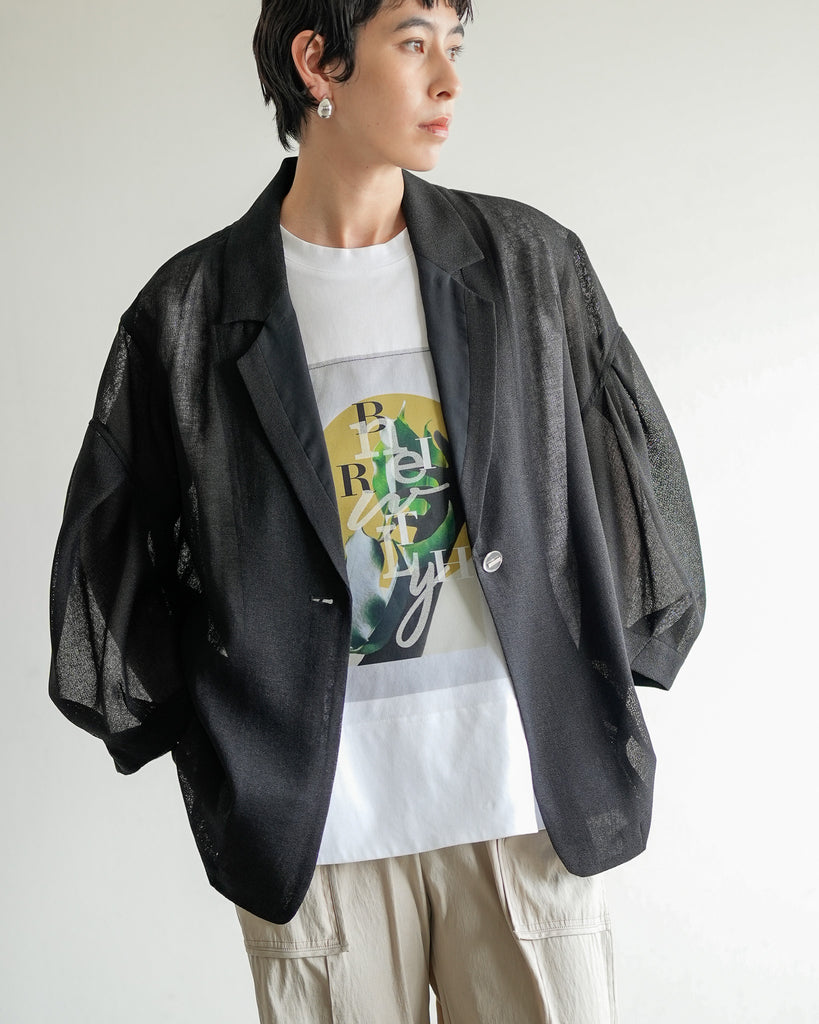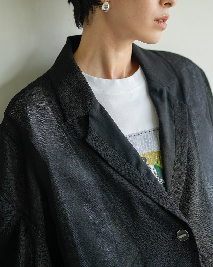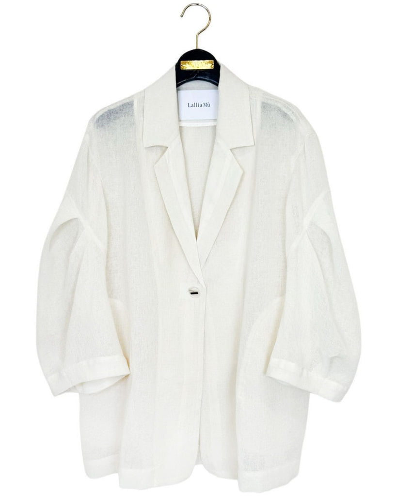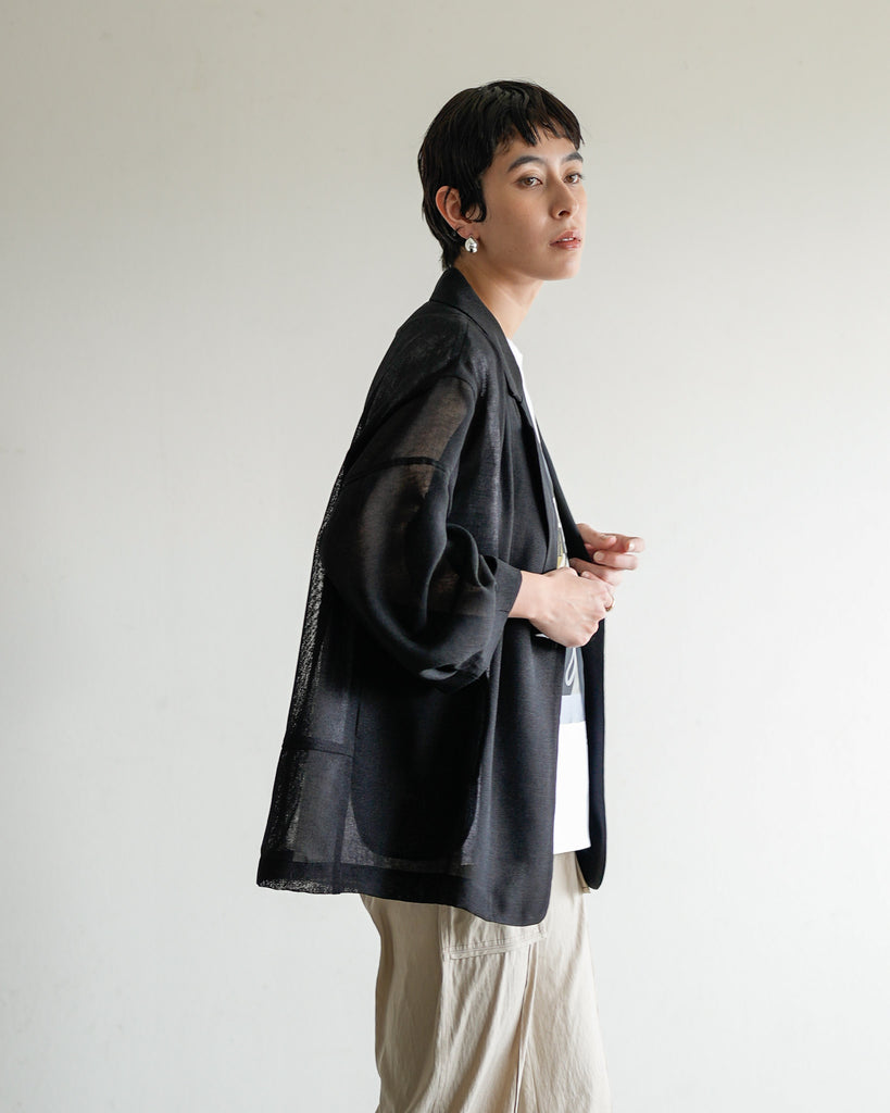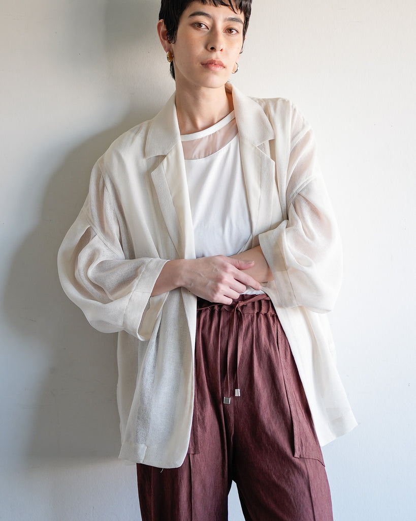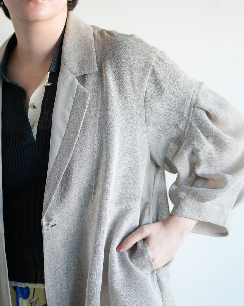 羽織るだけで洗練されたスタイルが手に入るメッシュジャケット。ポリエステルリネンのような天然の柔らかな表情をもつ合繊素材を使用し、ラリア・ムーらしい立体的な袖でシルエットにボリュームを持たせています。ラペルや、ポケットの袋布には透け生地を使用し、見え感が重たくならないような配慮を。軽く、ふわりとしたシルエットで、ジャケット特有のかっちり感がなく、羽織るだけで大人のきちんと感を作ることができます。汗ばむ夏も通気性がよく、季節の狭の羽織としても最適です。