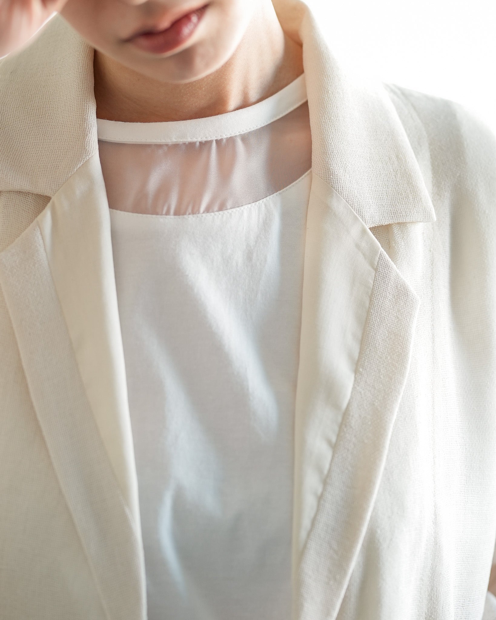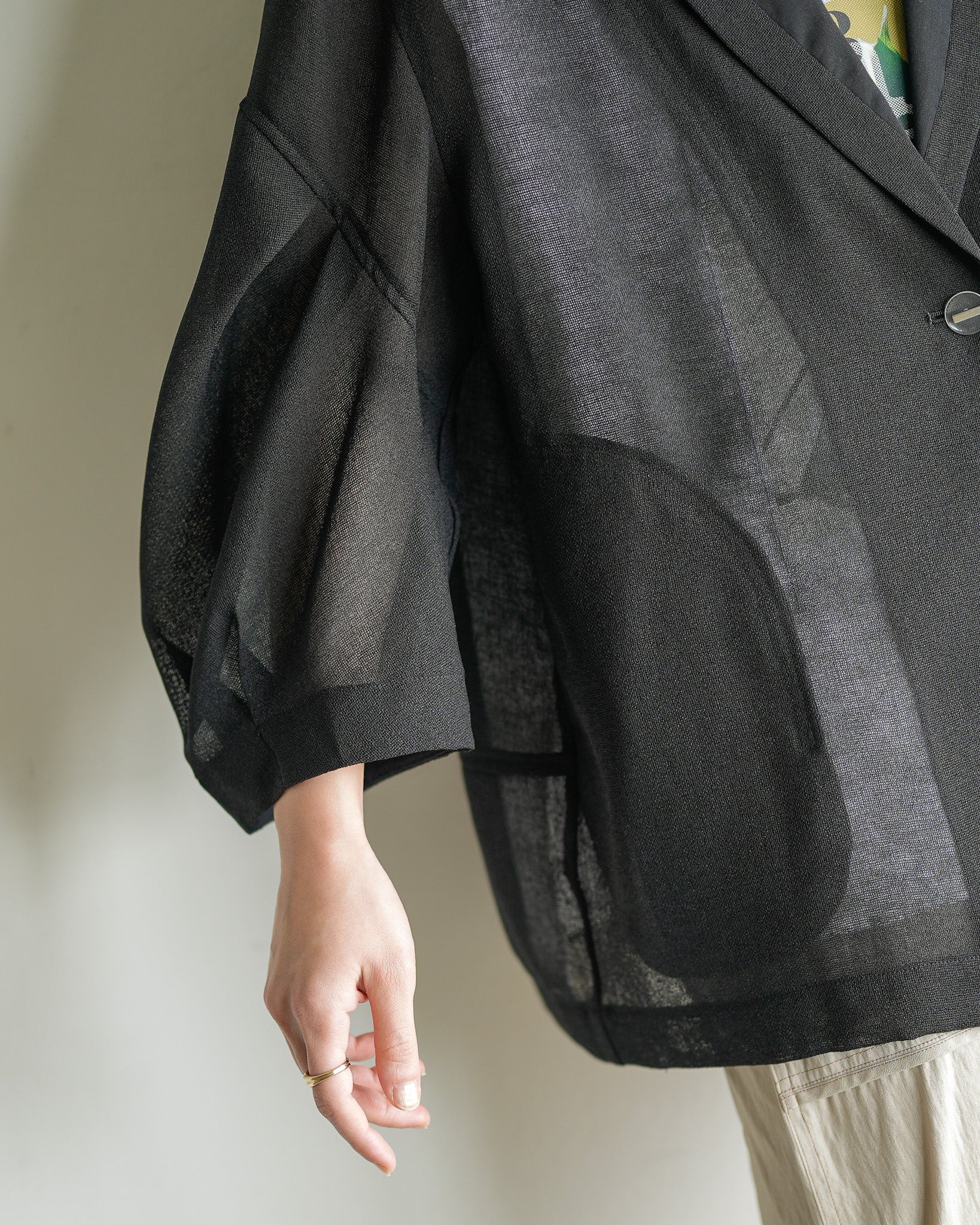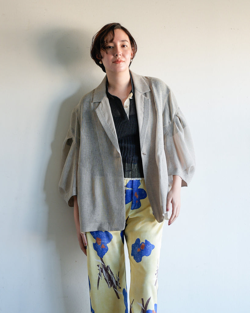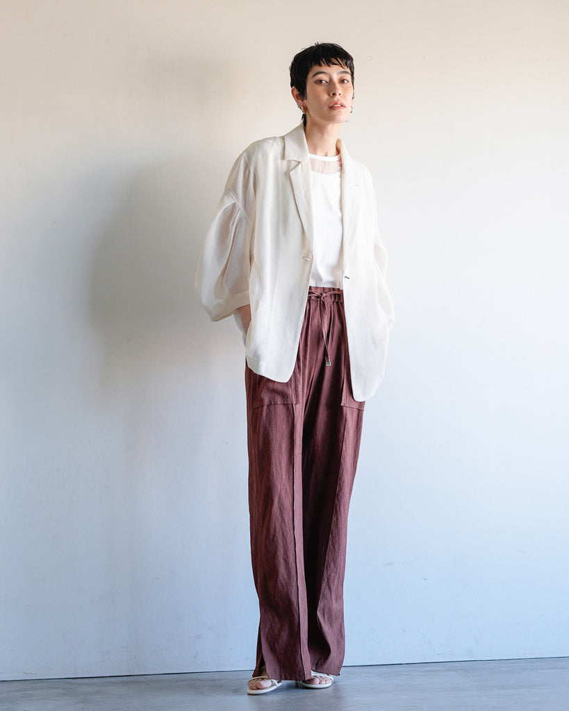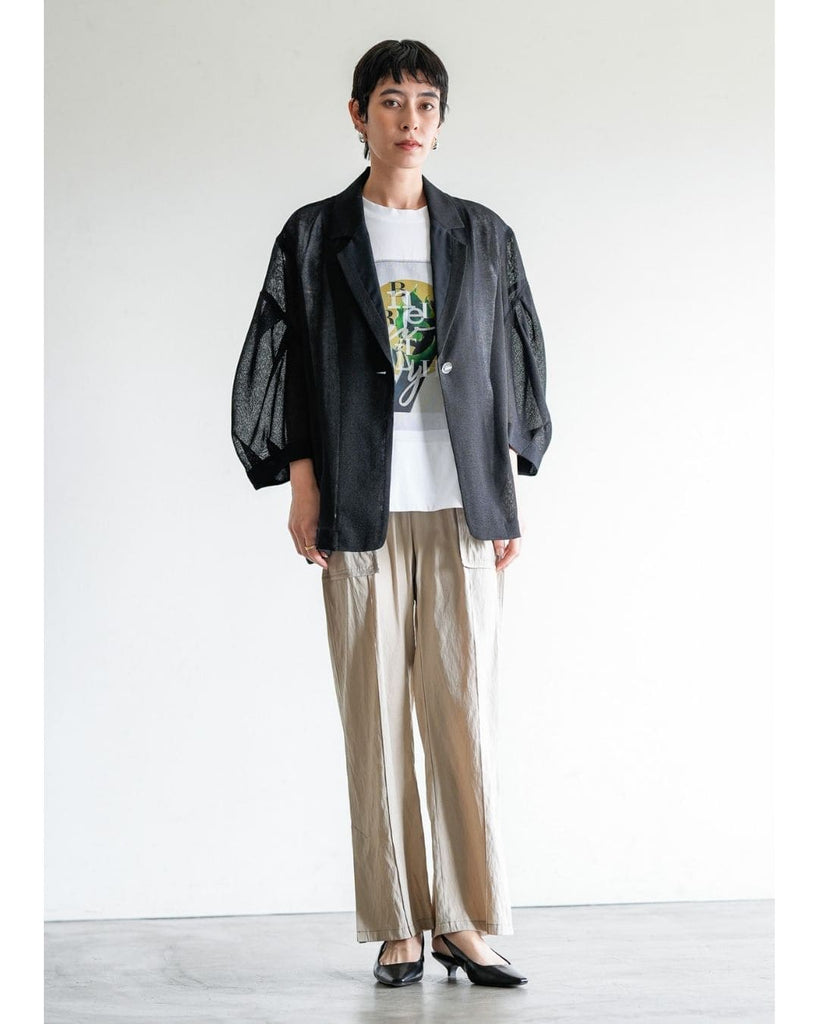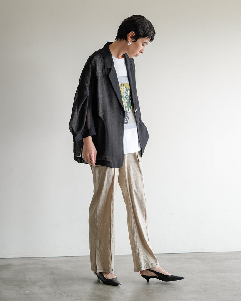 羽織るだけで洗練されたスタイルが手に入るメッシュジャケット。ポリエステルリネンのような天然の柔らかな表情をもつ合繊素材を使用し、ラリア・ムーらしい立体的な袖でシルエットにボリュームを持たせています。ラペルや、ポケットの袋布には透け生地を使用し、見え感が重たくならないような配慮を。軽く、ふわりとしたシルエットで、ジャケット特有のかっちり感がなく、羽織るだけで大人のきちんと感を作ることができます。汗ばむ夏も通気性がよく、季節の狭の羽織としても最適です。