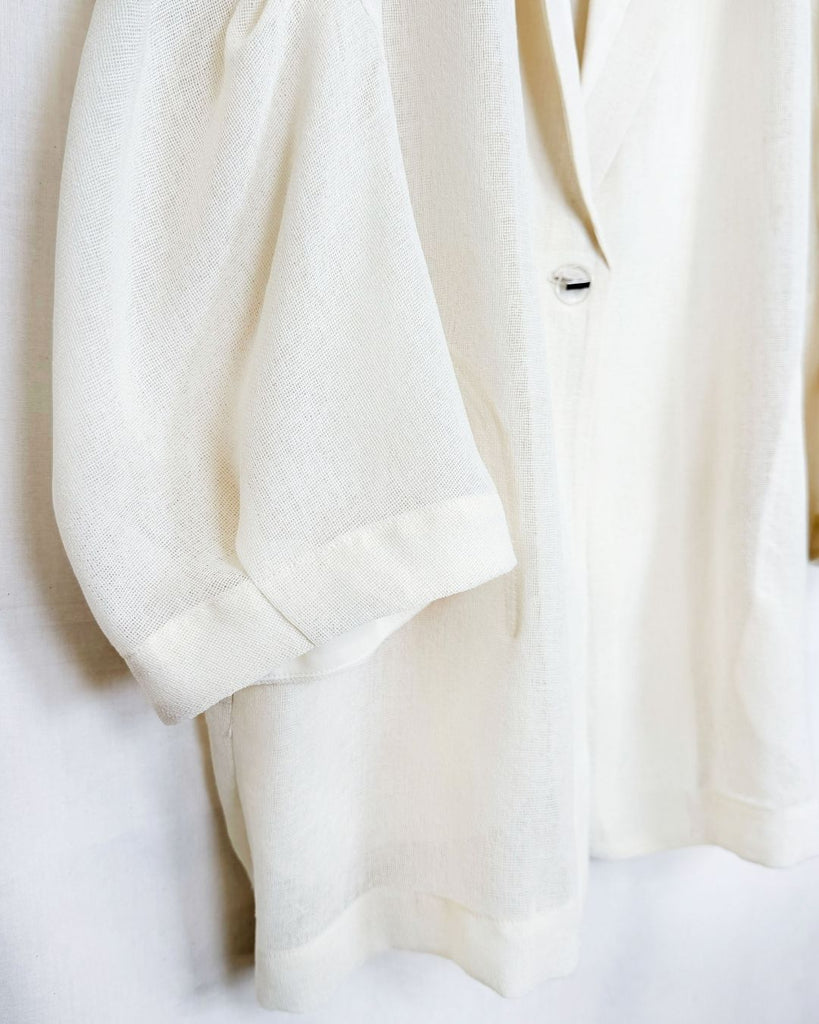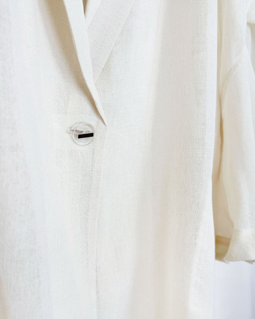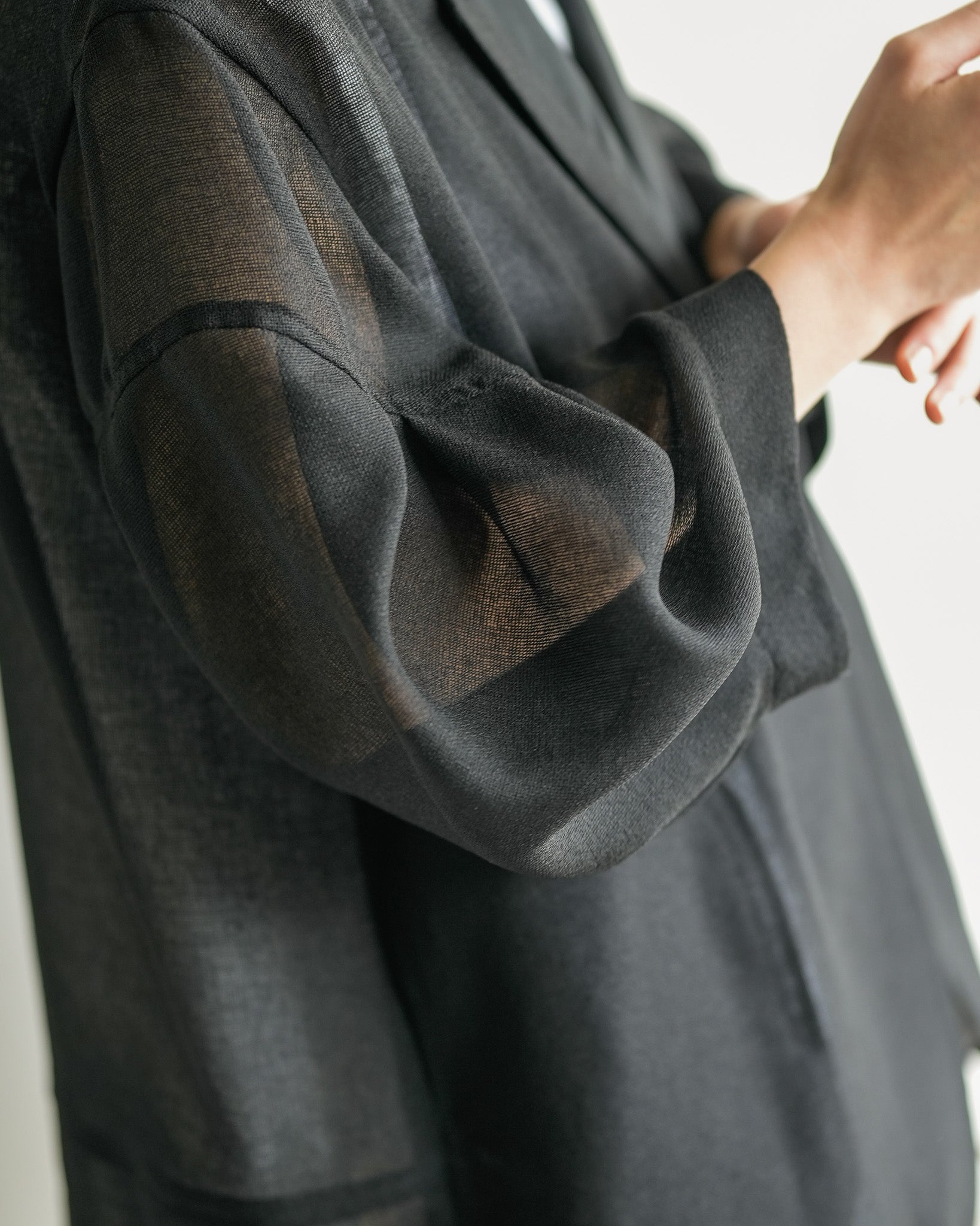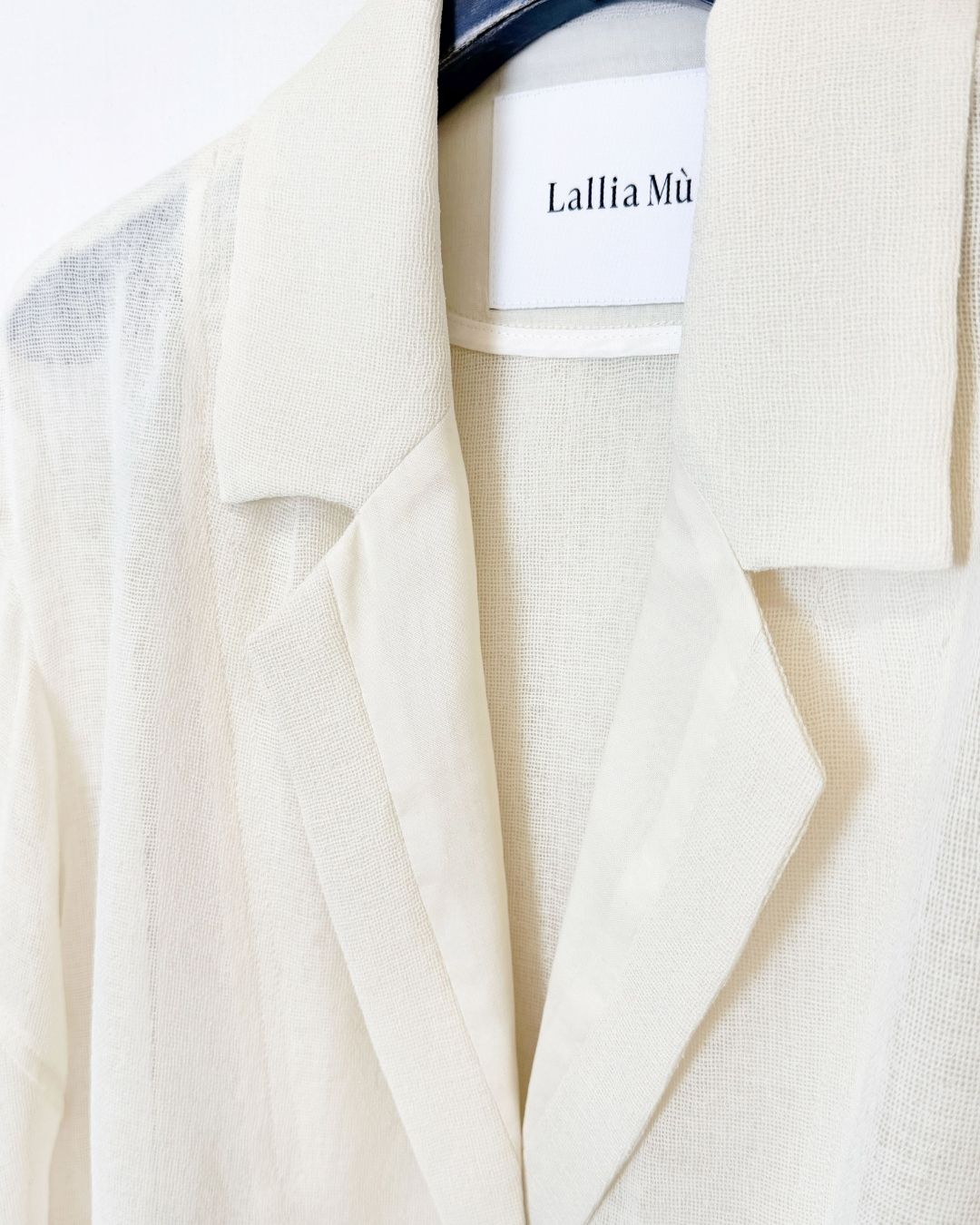 羽織るだけで洗練されたスタイルが手に入るメッシュジャケット。ポリエステルリネンのような天然の柔らかな表情をもつ合繊素材を使用し、ラリア・ムーらしい立体的な袖でシルエットにボリュームを持たせています。ラペルや、ポケットの袋布には透け生地を使用し、見え感が重たくならないような配慮を。軽く、ふわりとしたシルエットで、ジャケット特有のかっちり感がなく、羽織るだけで大人のきちんと感を作ることができます。汗ばむ夏も通気性がよく、季節の狭の羽織としても最適です。