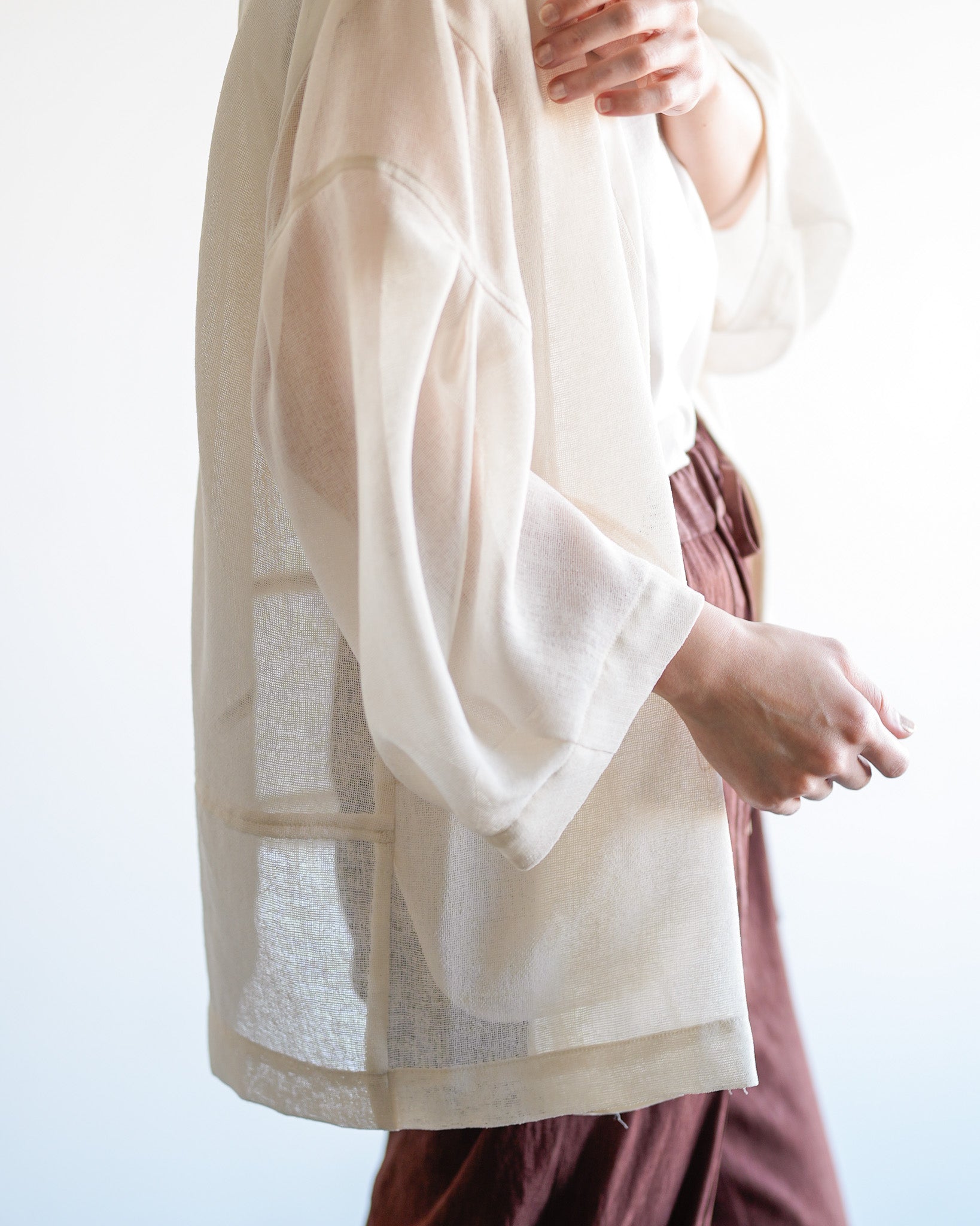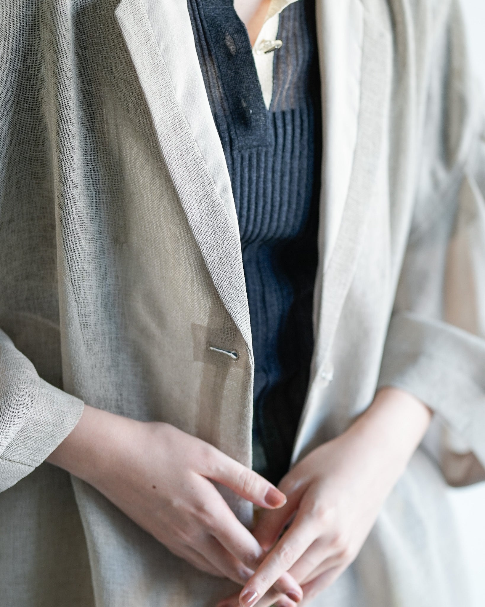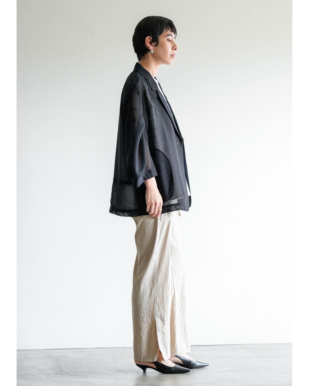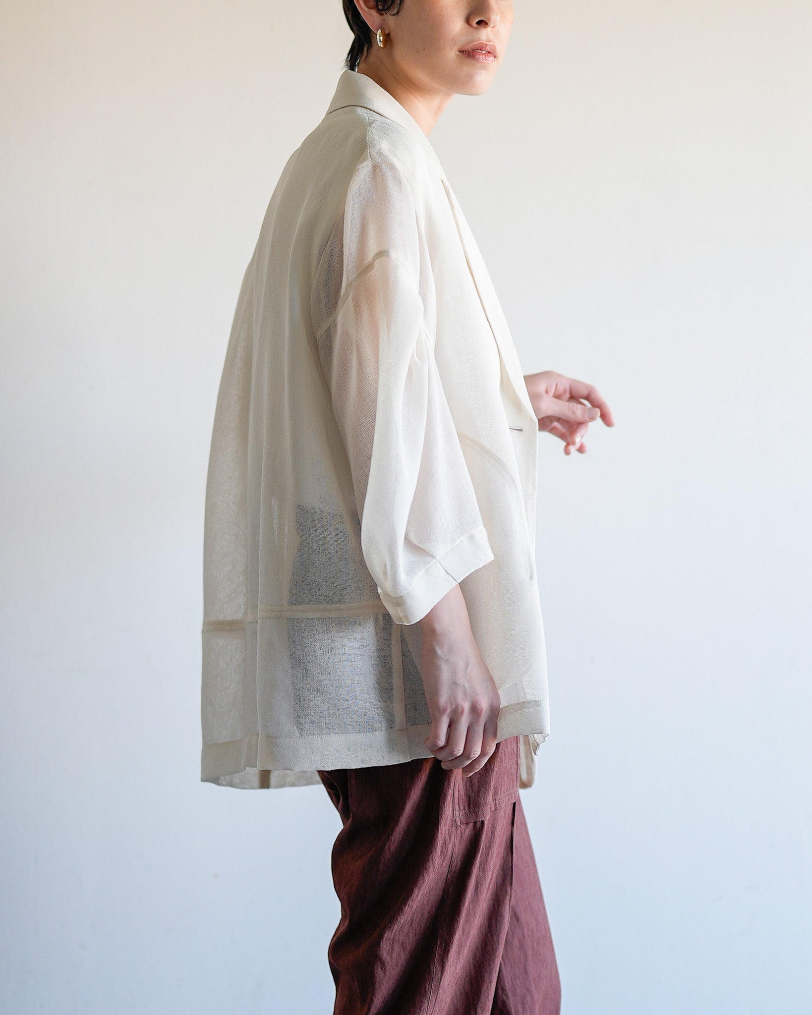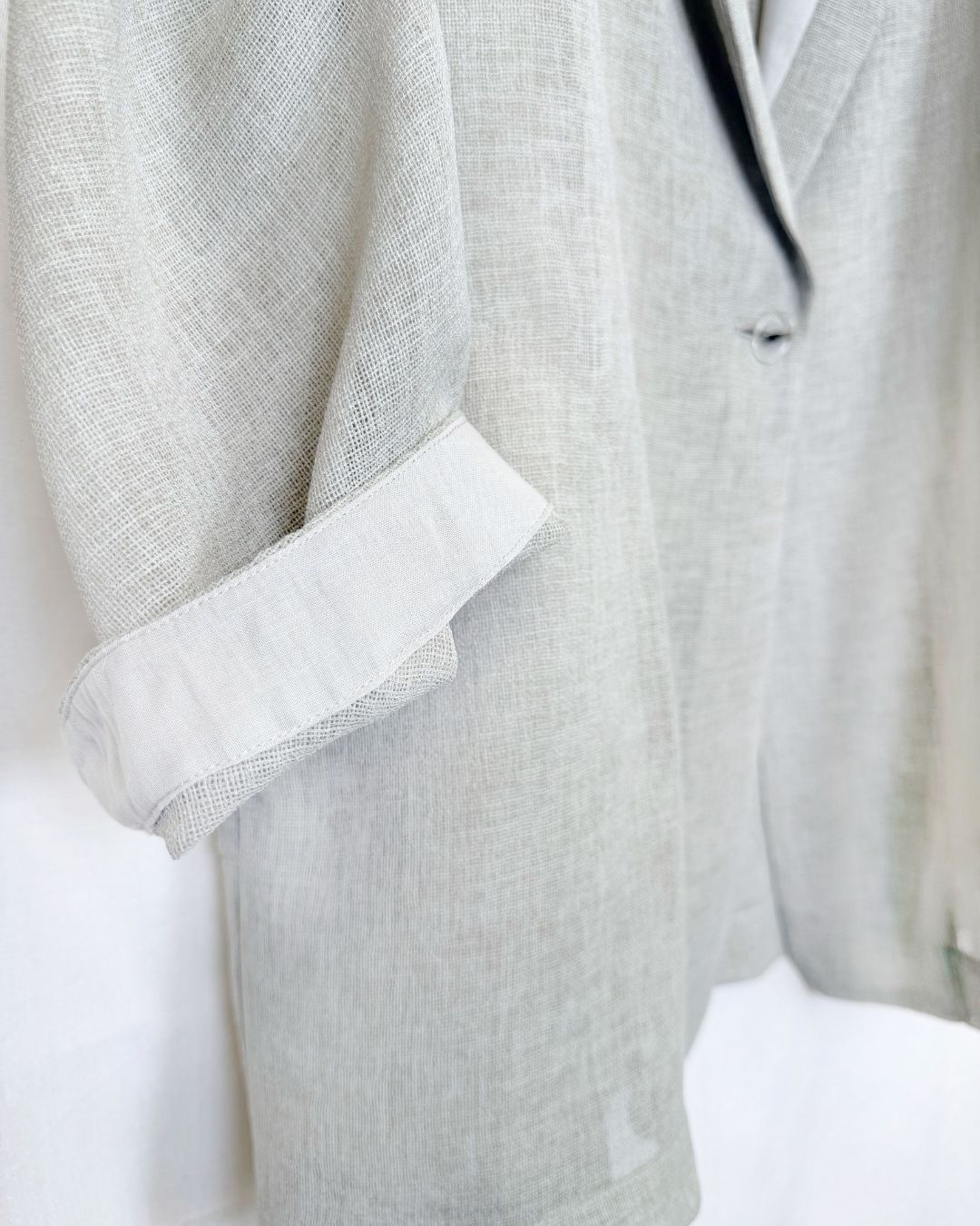 羽織るだけで洗練されたスタイルが手に入るメッシュジャケット。ポリエステルリネンのような天然の柔らかな表情をもつ合繊素材を使用し、ラリア・ムーらしい立体的な袖でシルエットにボリュームを持たせています。ラペルや、ポケットの袋布には透け生地を使用し、見え感が重たくならないような配慮を。軽く、ふわりとしたシルエットで、ジャケット特有のかっちり感がなく、羽織るだけで大人のきちんと感を作ることができます。汗ばむ夏も通気性がよく、季節の狭の羽織としても最適です。