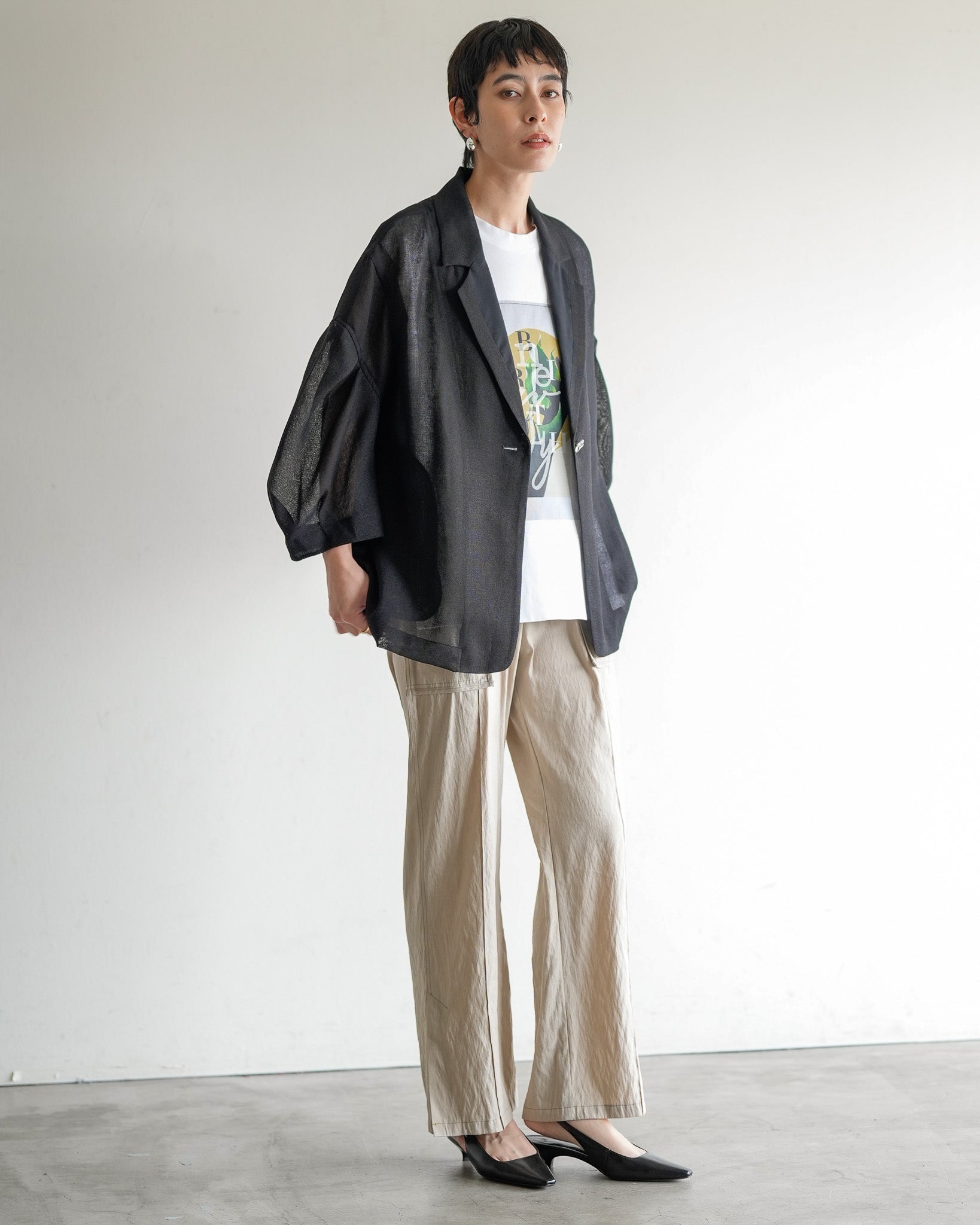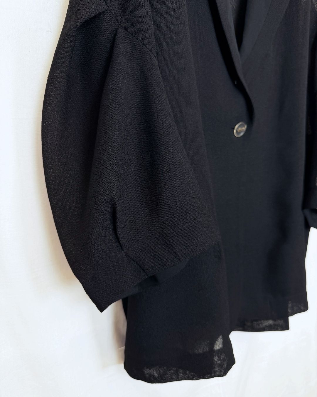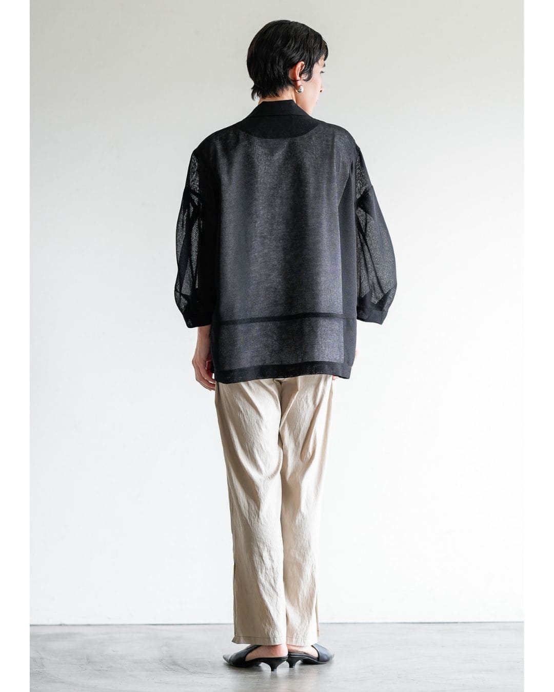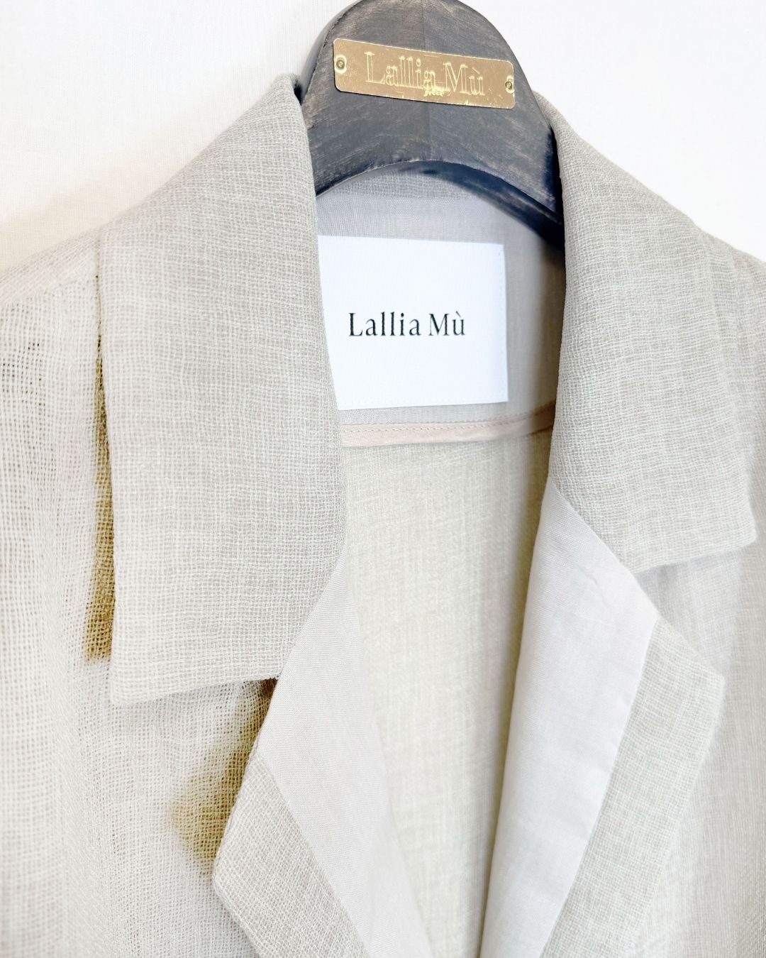 羽織るだけで洗練されたスタイルが手に入るメッシュジャケット。ポリエステルリネンのような天然の柔らかな表情をもつ合繊素材を使用し、ラリア・ムーらしい立体的な袖でシルエットにボリュームを持たせています。ラペルや、ポケットの袋布には透け生地を使用し、見え感が重たくならないような配慮を。軽く、ふわりとしたシルエットで、ジャケット特有のかっちり感がなく、羽織るだけで大人のきちんと感を作ることができます。汗ばむ夏も通気性がよく、季節の狭の羽織としても最適です。