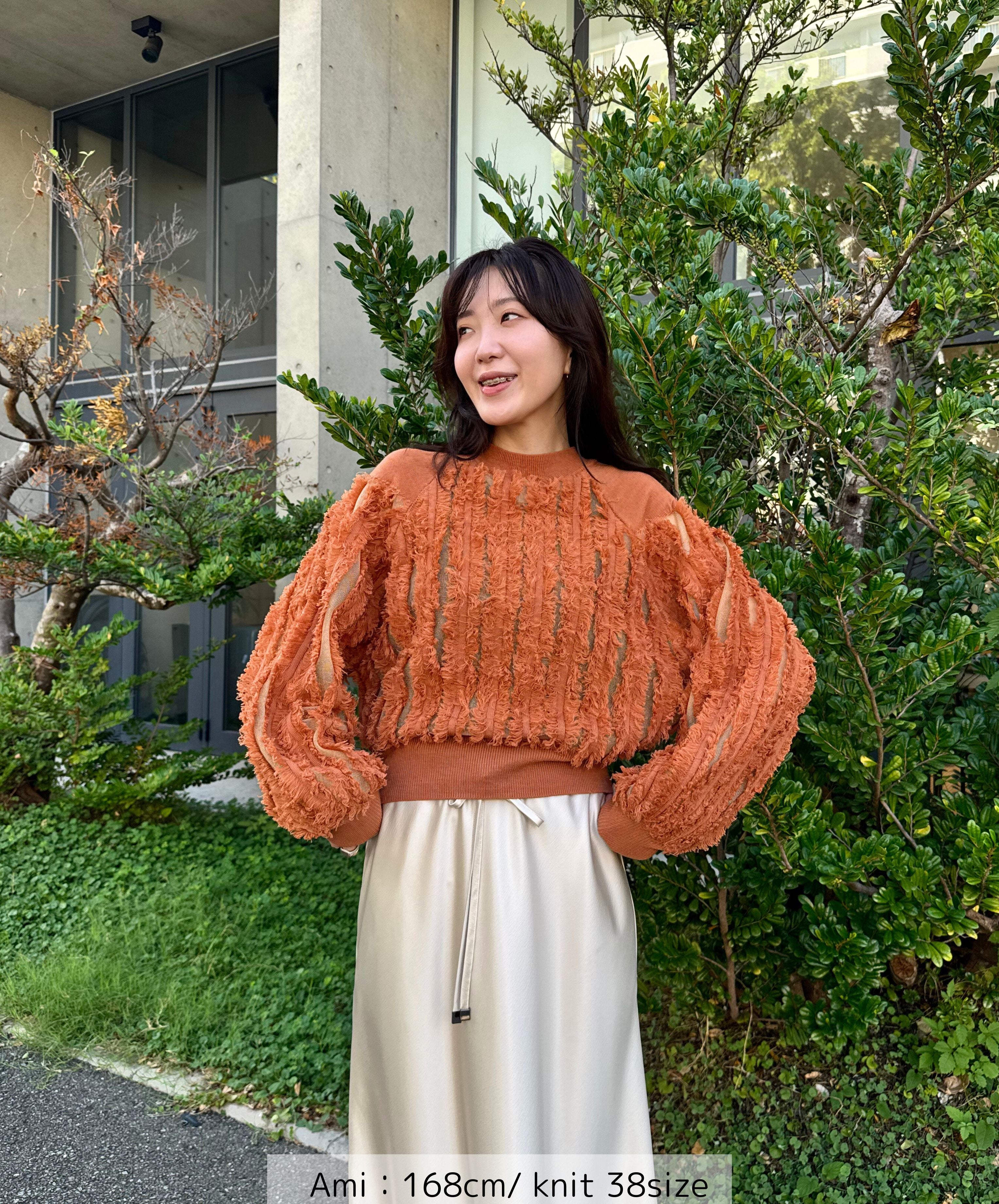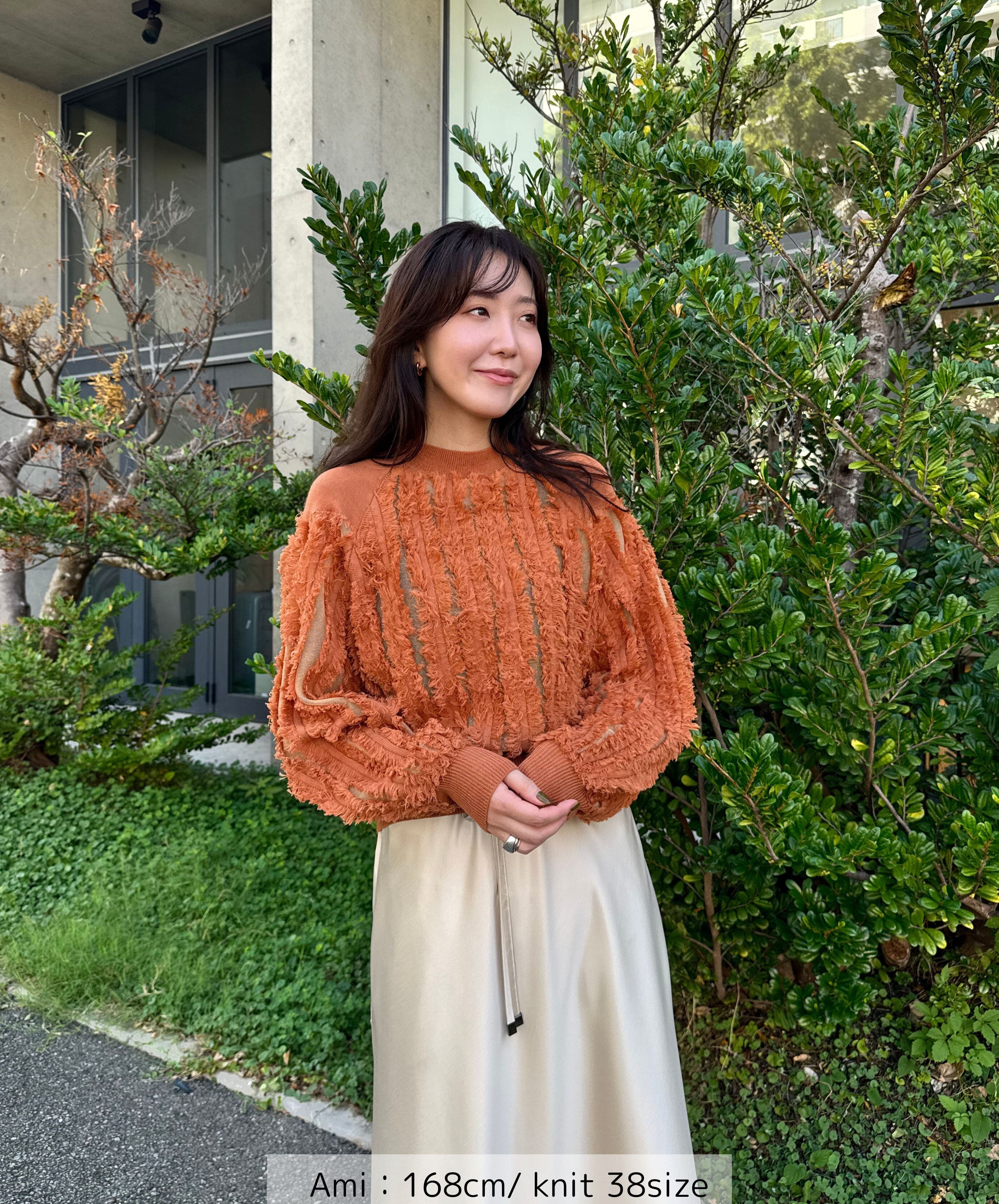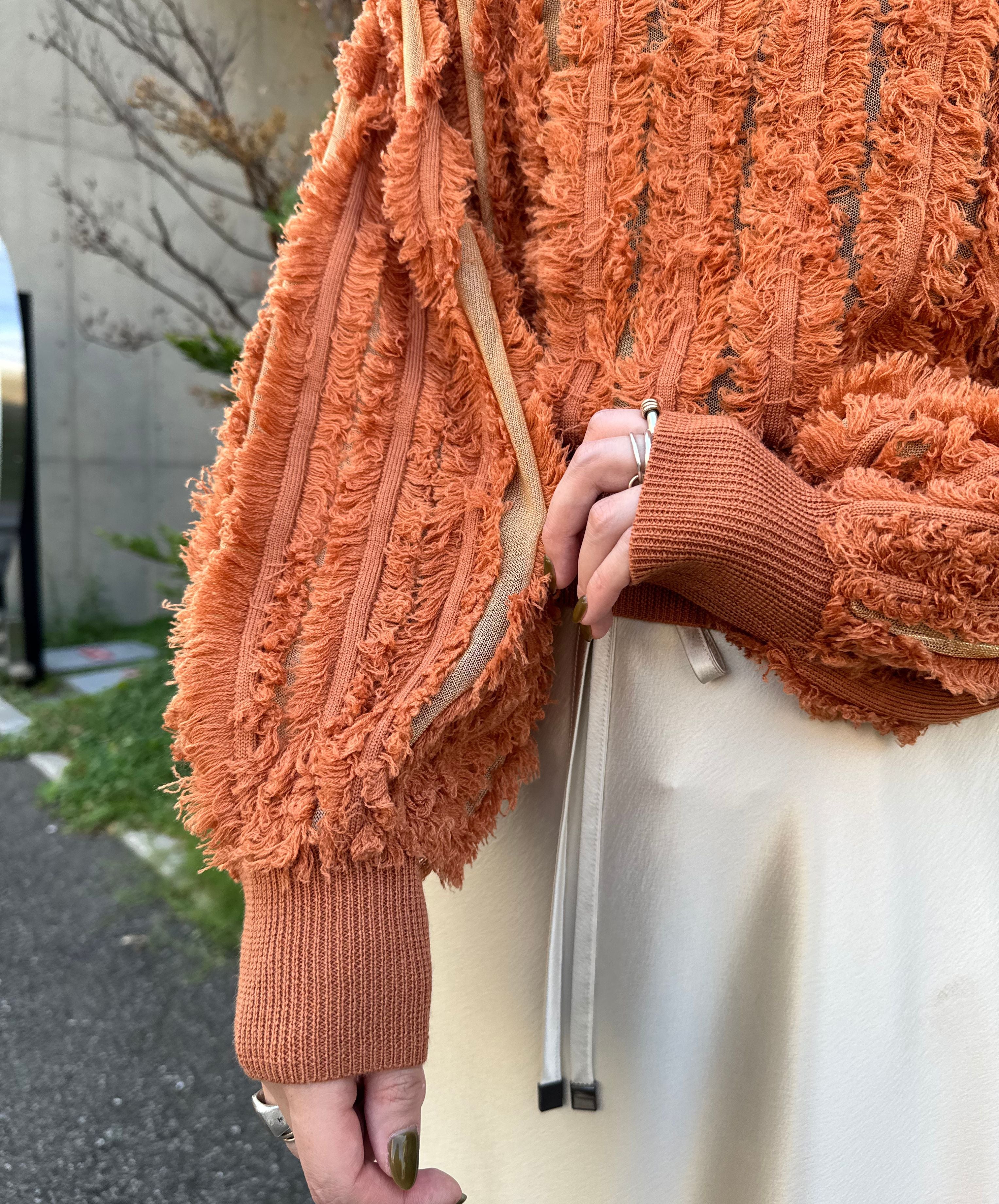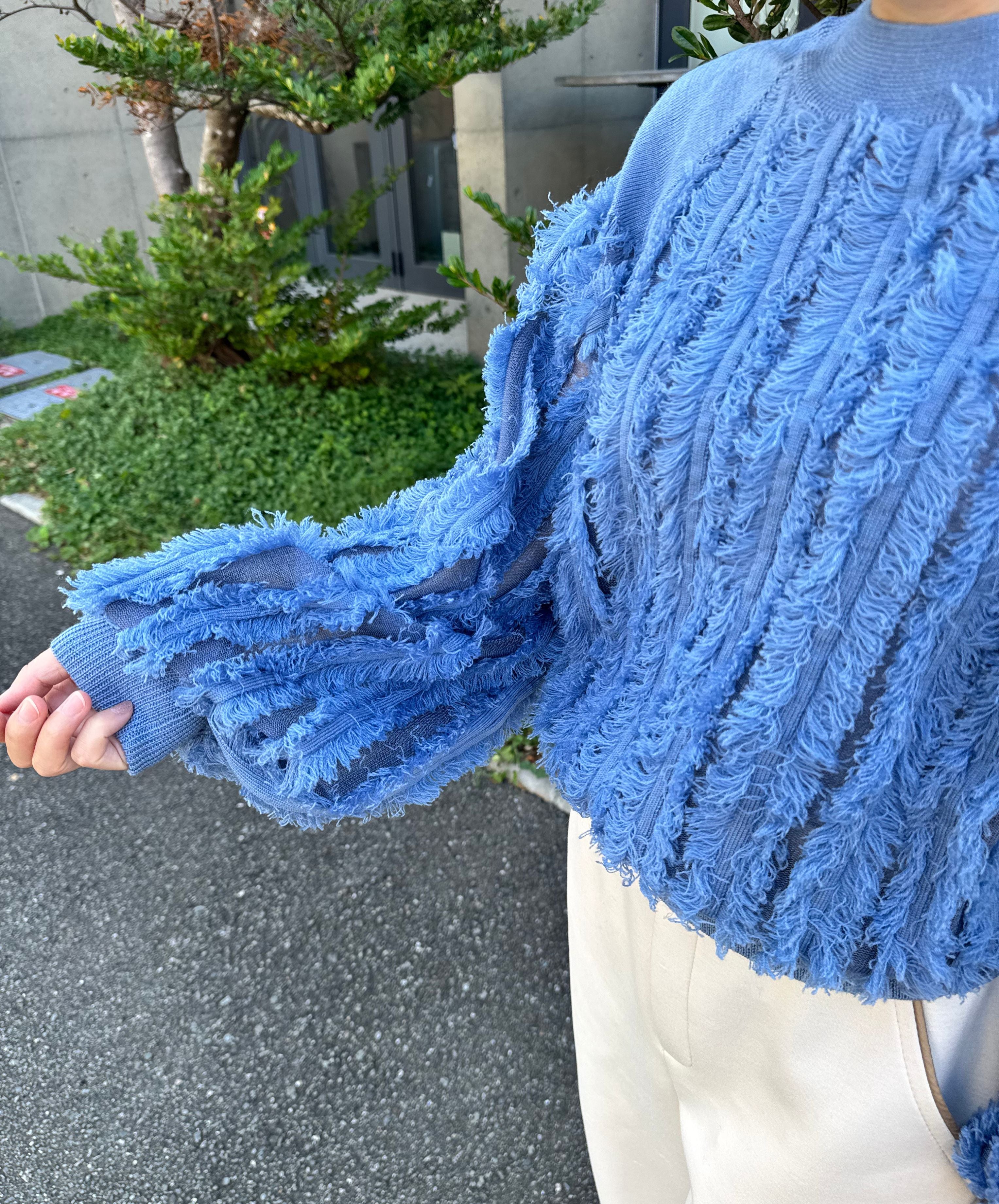 「まるで秋の陽日を透かす薄雲のように。」繊細なシアー素材にフリンジを合わせたニットプルオーバー。ストライプ状に並ぶフリンジの間からは、光沢あるシアーがのぞき、ニットでも重見えさせず、季節の変わり目に透明感と抜け感を持って着用できます。首元はインナーとしてもシンプルに活躍するクルーネック。初秋から立春までロングシーズン着用できるアイテムです。スタイリング次第でカジュアルからきれいめまで対応し、デニムなどの合わせでもカジュアルになり過ぎない、上品な透け感とフリンジの立体感がシンプルな装いを格上げします。