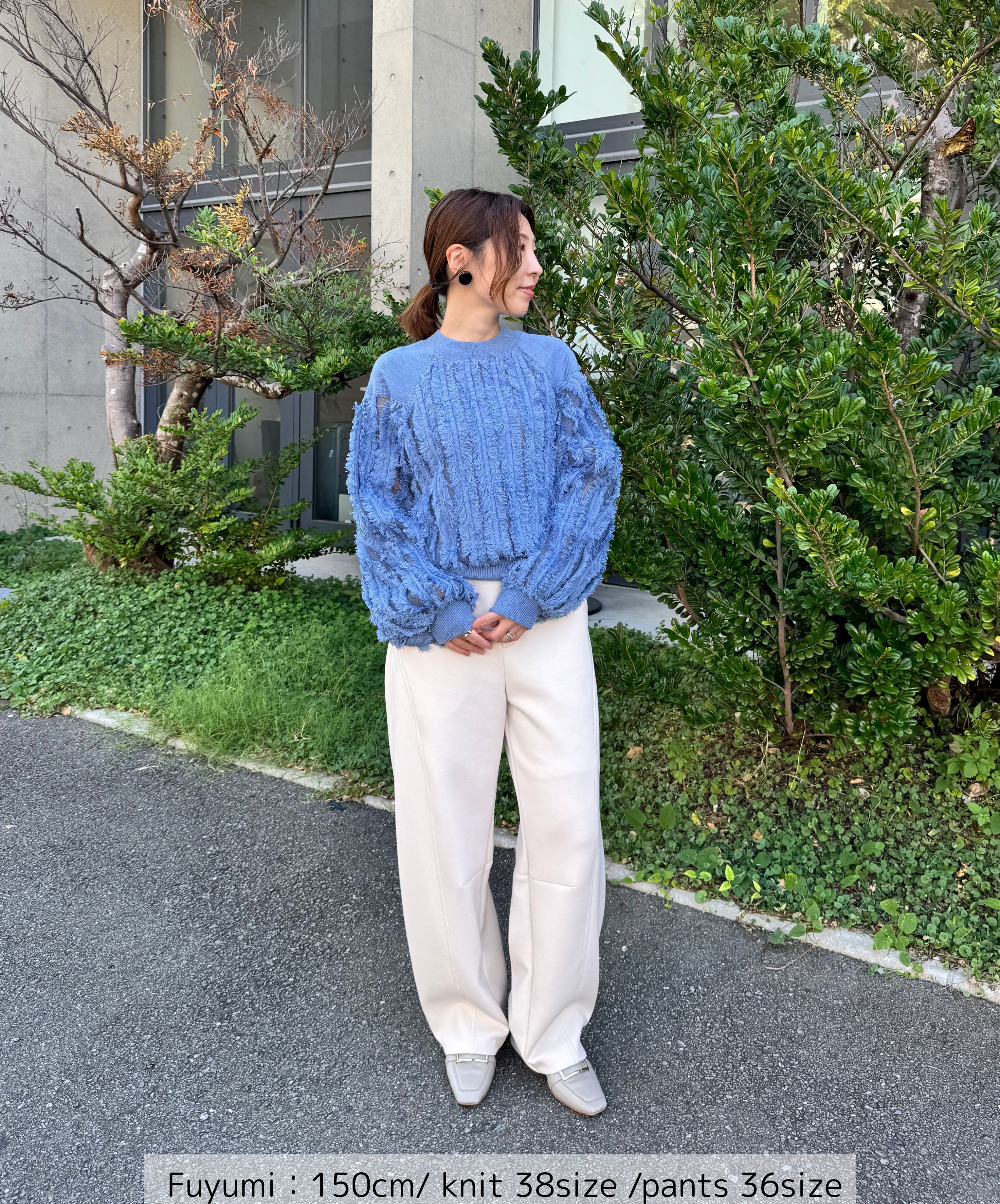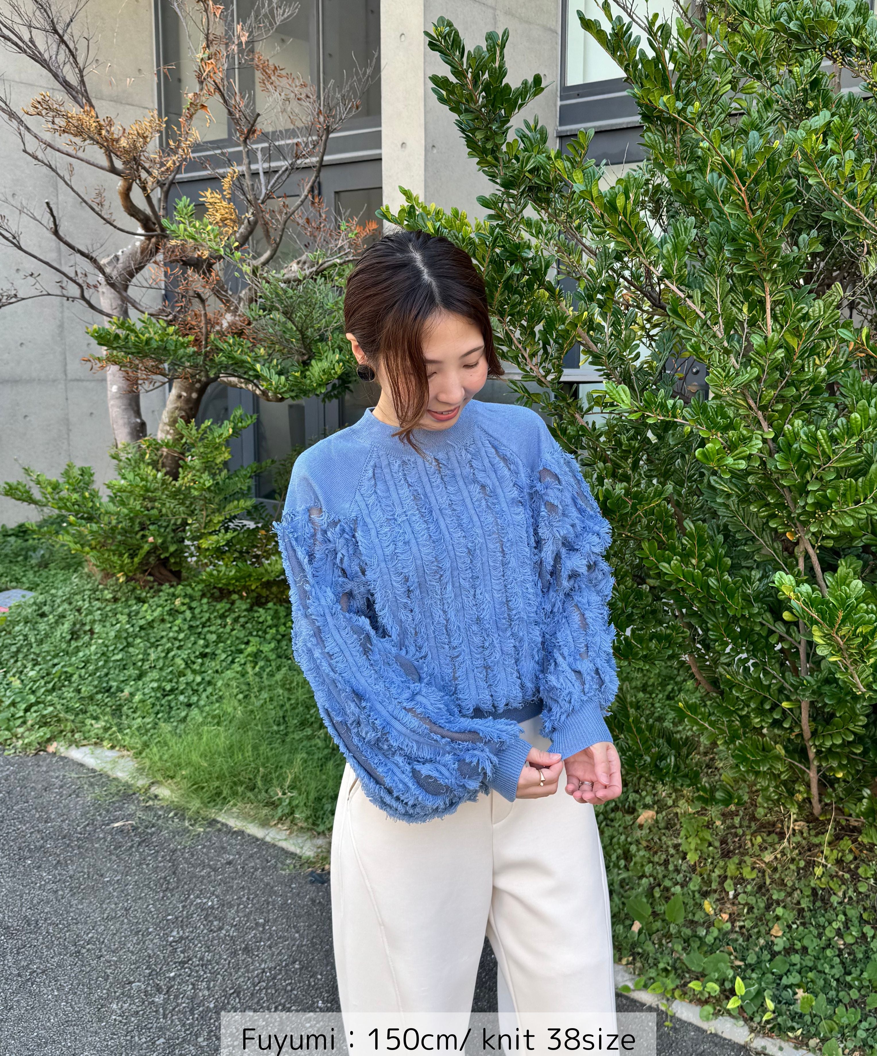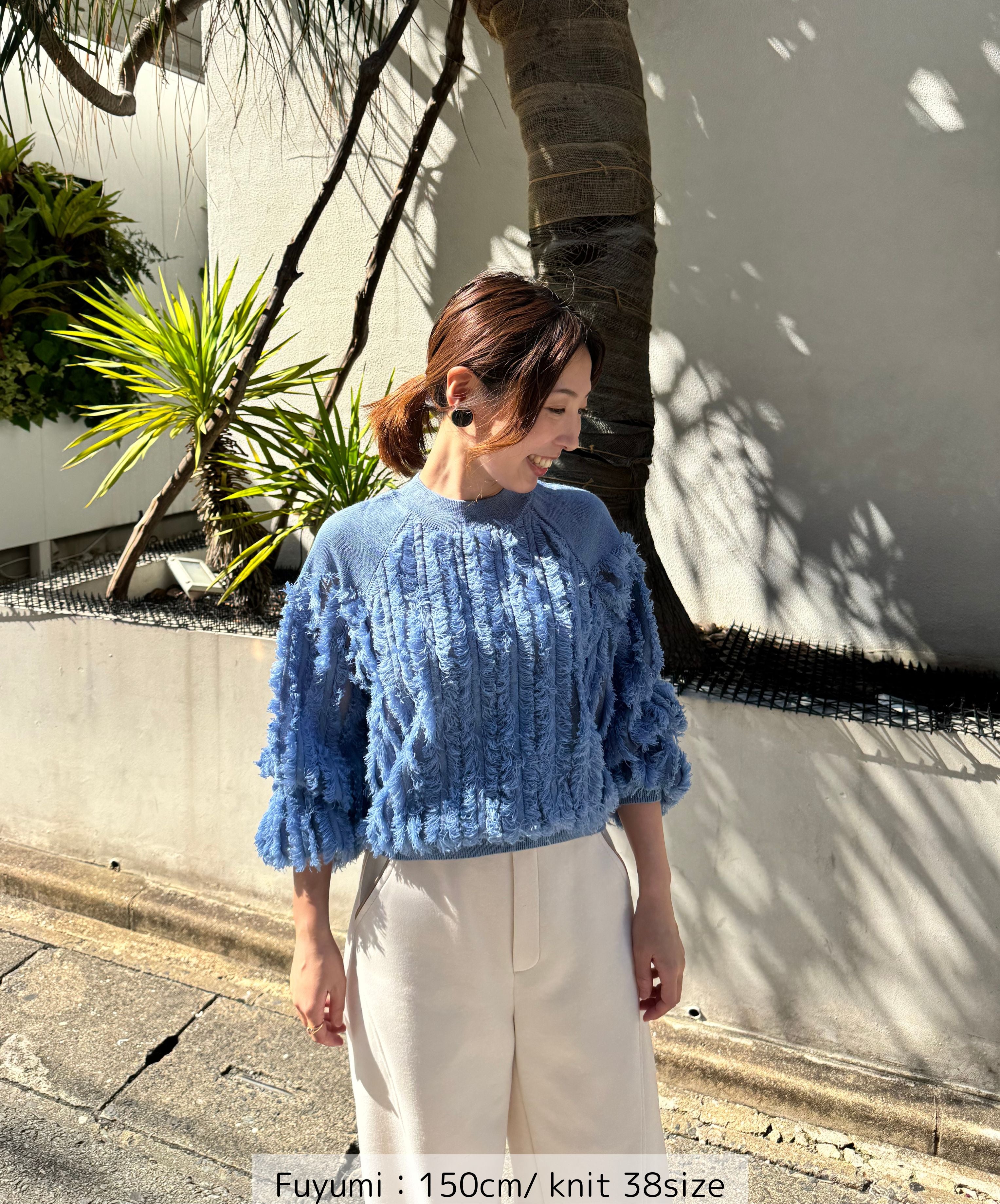 「まるで秋の陽日を透かす薄雲のように。」繊細なシアー素材にフリンジを合わせたニットプルオーバー。ストライプ状に並ぶフリンジの間からは、光沢あるシアーがのぞき、ニットでも重見えさせず、季節の変わり目に透明感と抜け感を持って着用できます。首元はインナーとしてもシンプルに活躍するクルーネック。初秋から立春までロングシーズン着用できるアイテムです。スタイリング次第でカジュアルからきれいめまで対応し、デニムなどの合わせでもカジュアルになり過ぎない、上品な透け感とフリンジの立体感がシンプルな装いを格上げします。