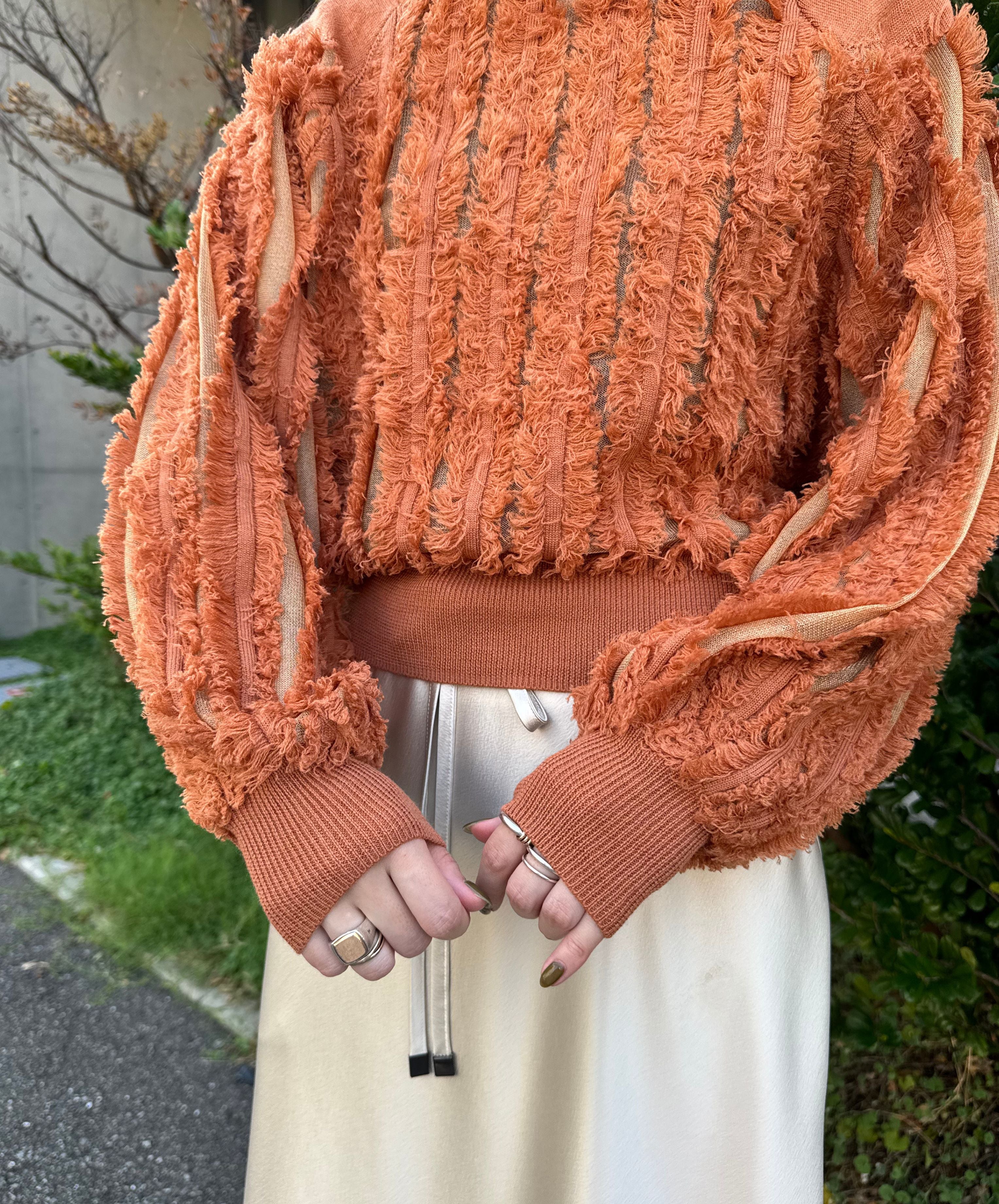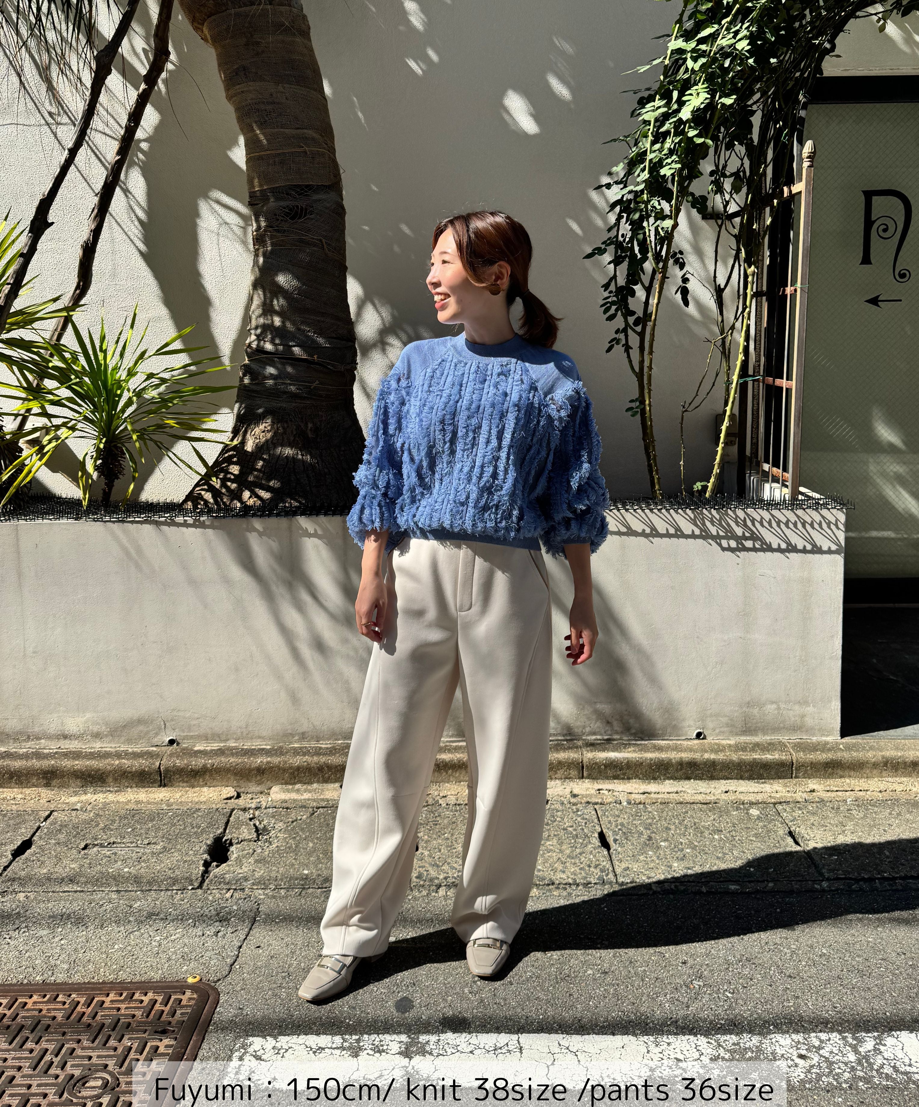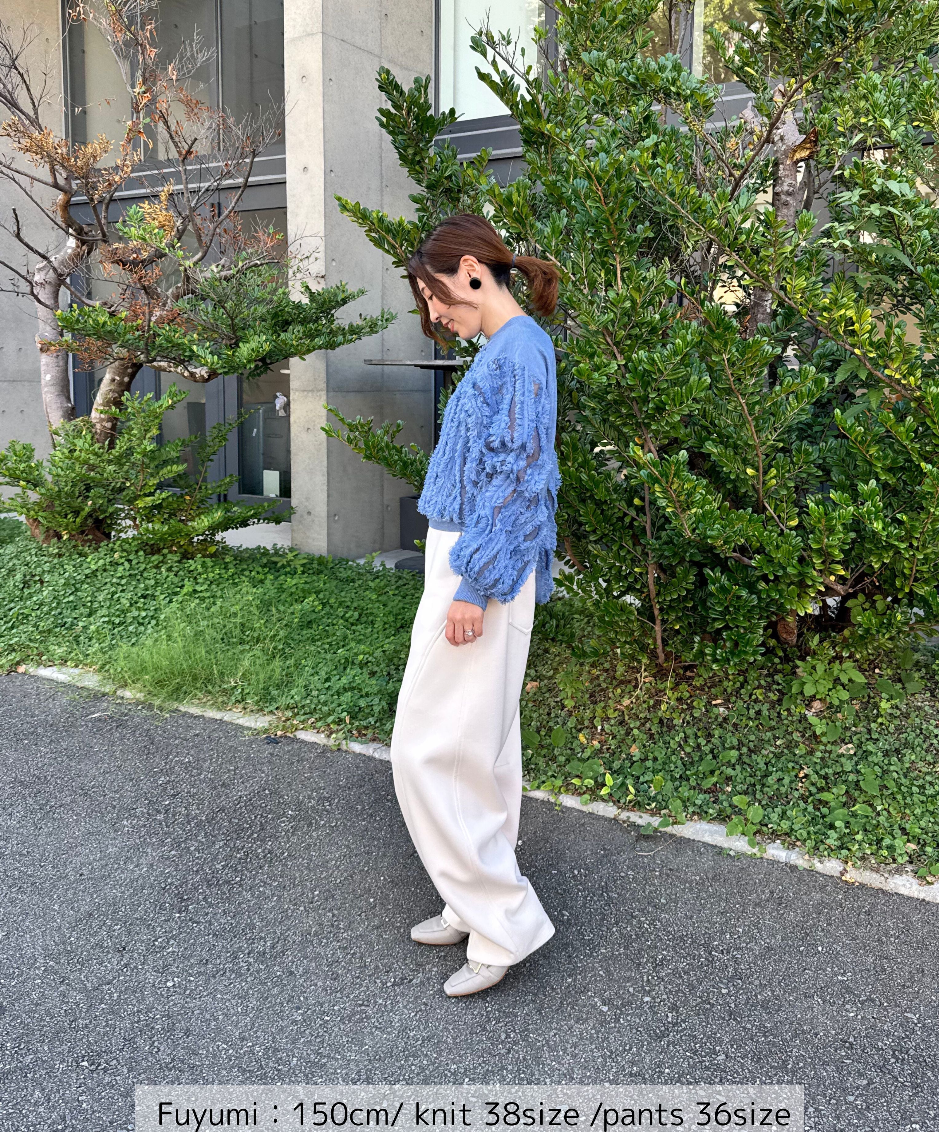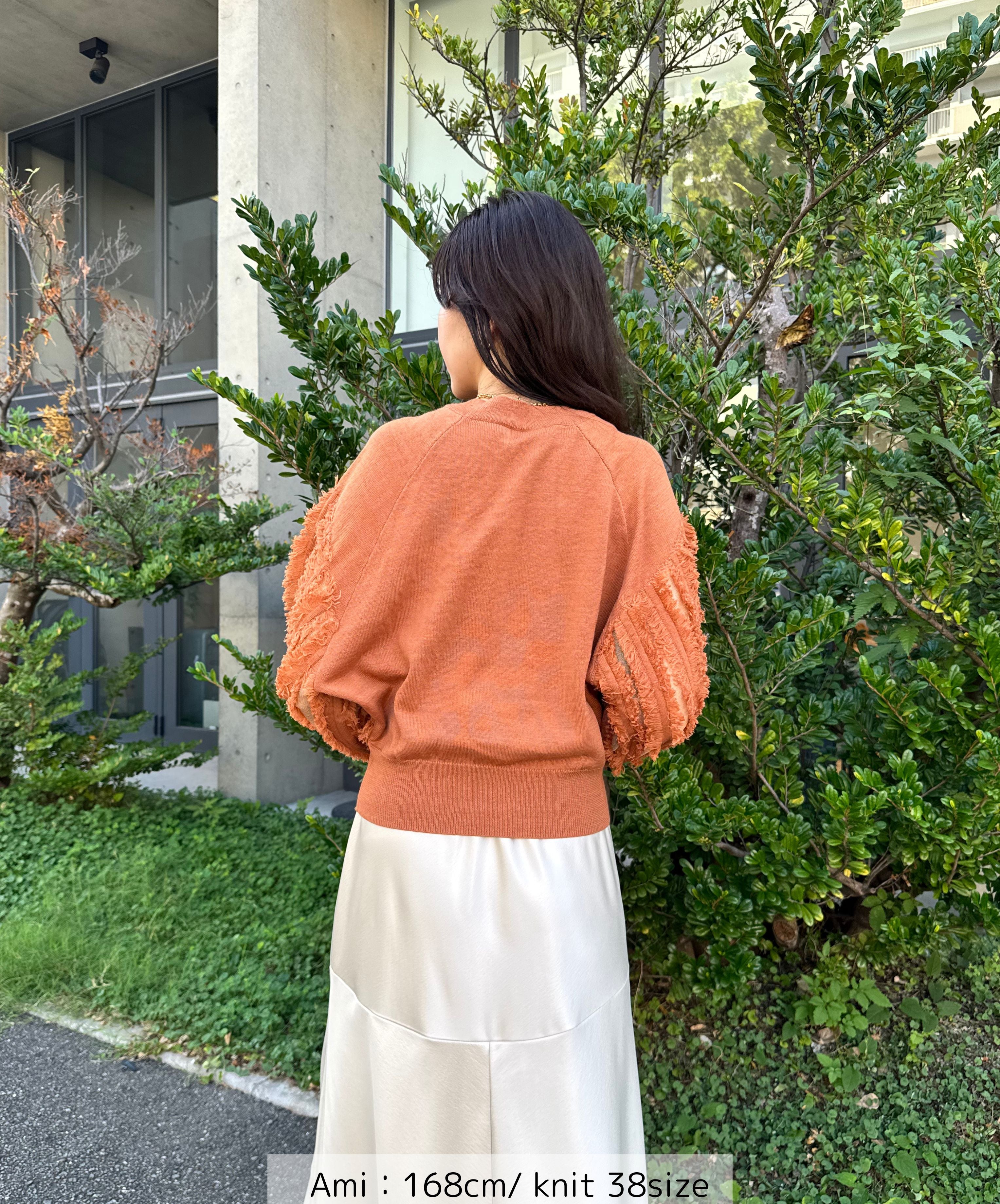 「まるで秋の陽日を透かす薄雲のように。」繊細なシアー素材にフリンジを合わせたニットプルオーバー。ストライプ状に並ぶフリンジの間からは、光沢あるシアーがのぞき、ニットでも重見えさせず、季節の変わり目に透明感と抜け感を持って着用できます。首元はインナーとしてもシンプルに活躍するクルーネック。初秋から立春までロングシーズン着用できるアイテムです。スタイリング次第でカジュアルからきれいめまで対応し、デニムなどの合わせでもカジュアルになり過ぎない、上品な透け感とフリンジの立体感がシンプルな装いを格上げします。