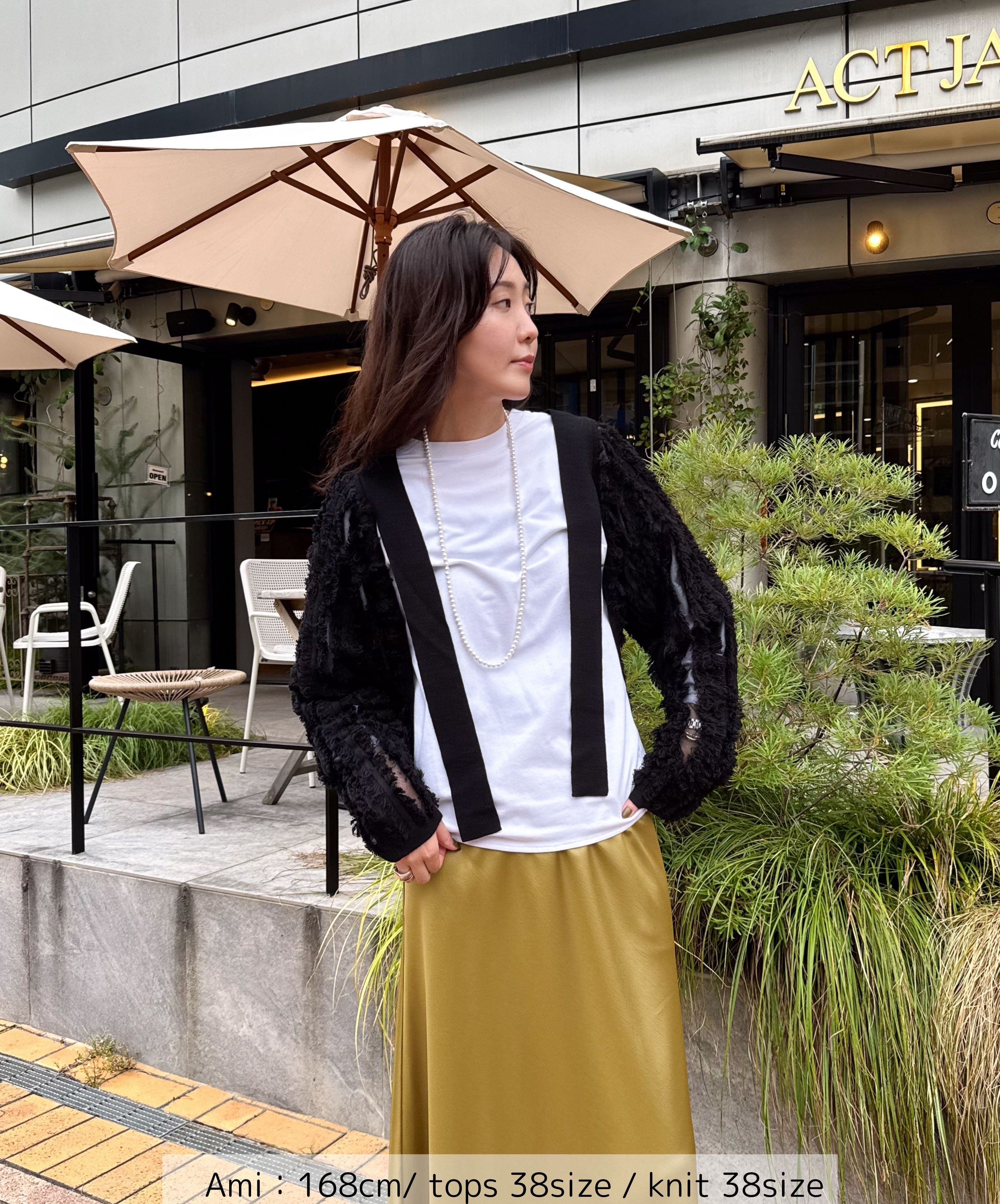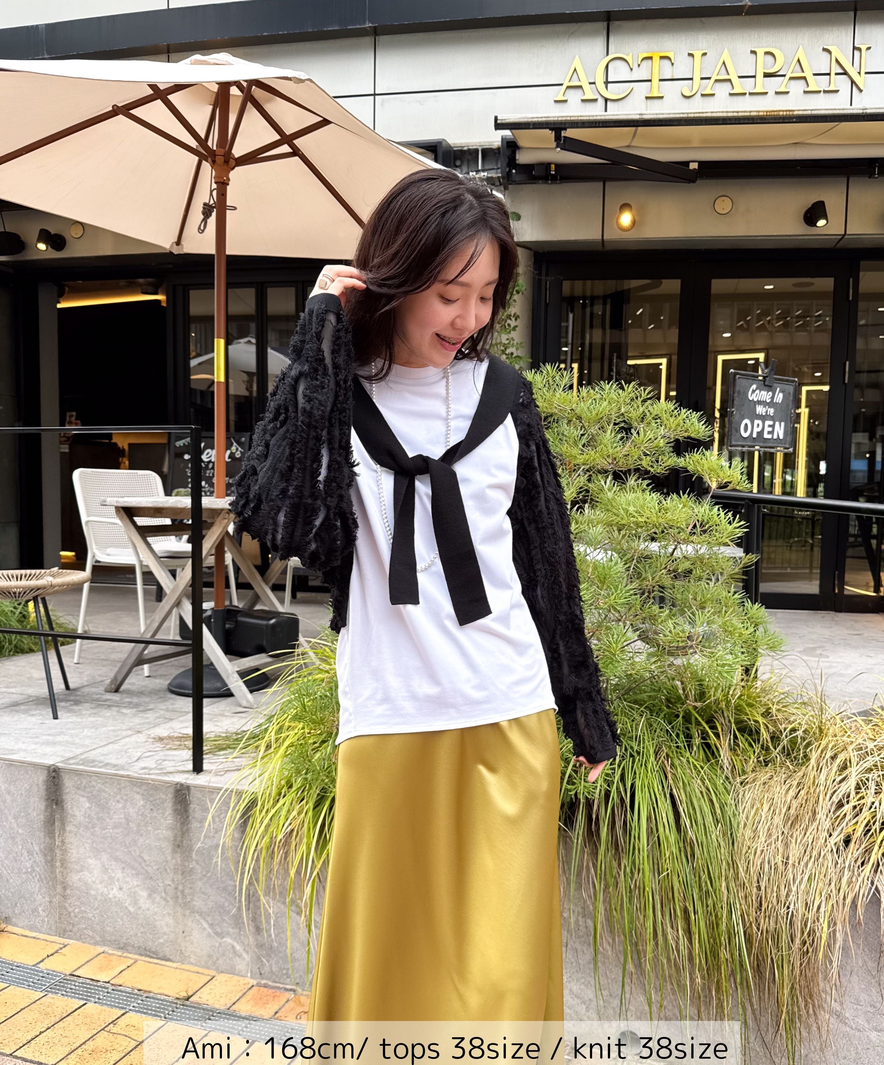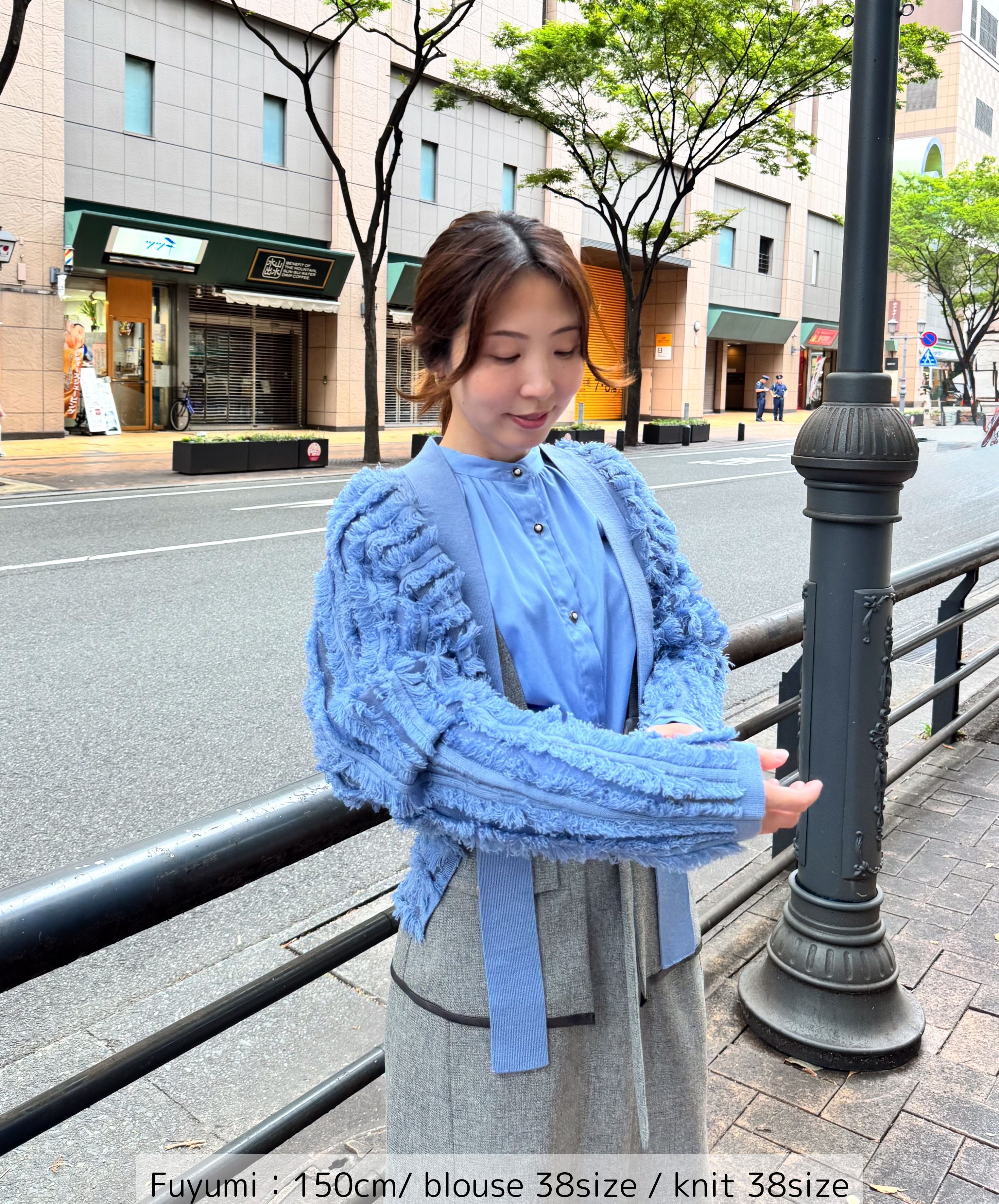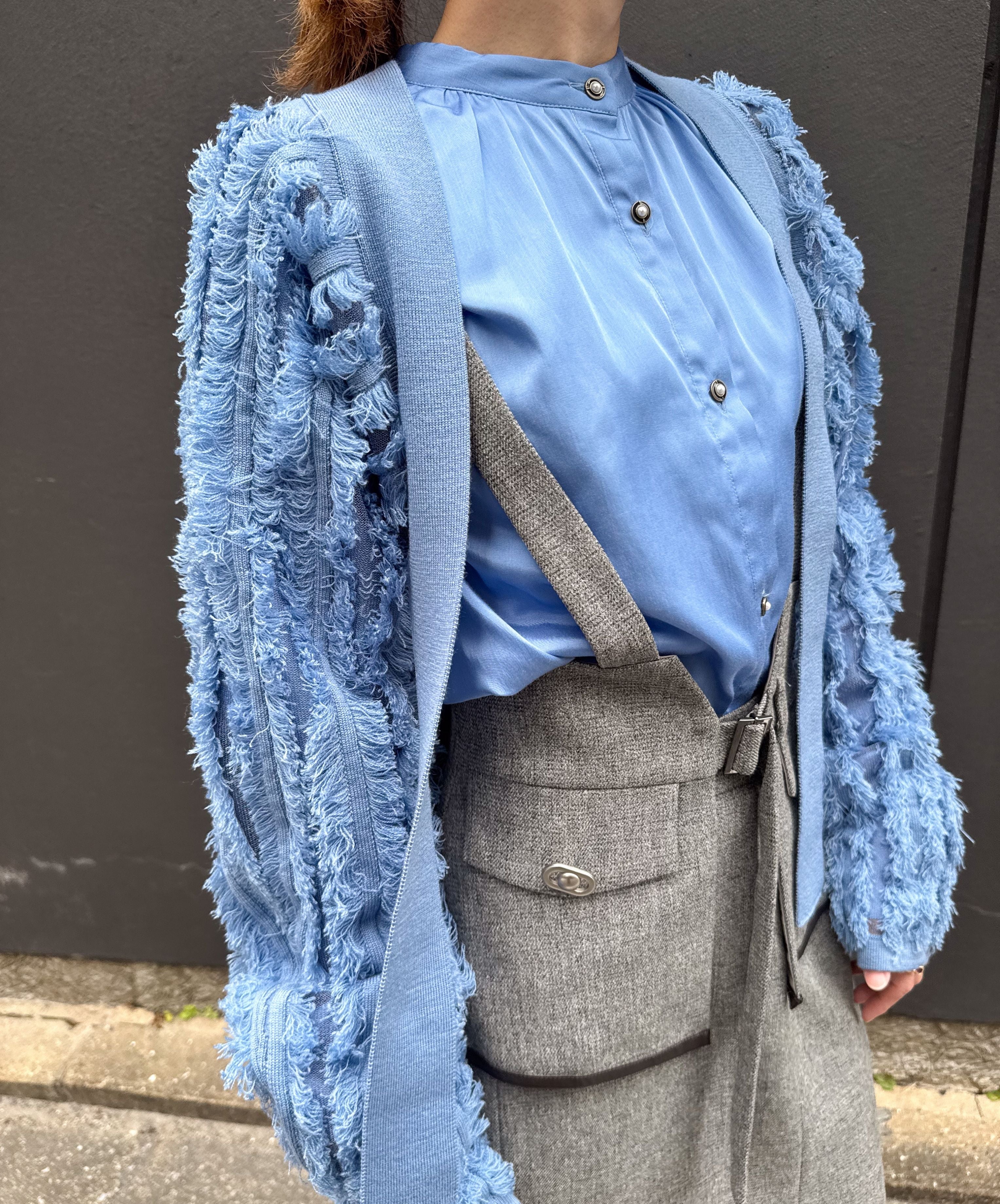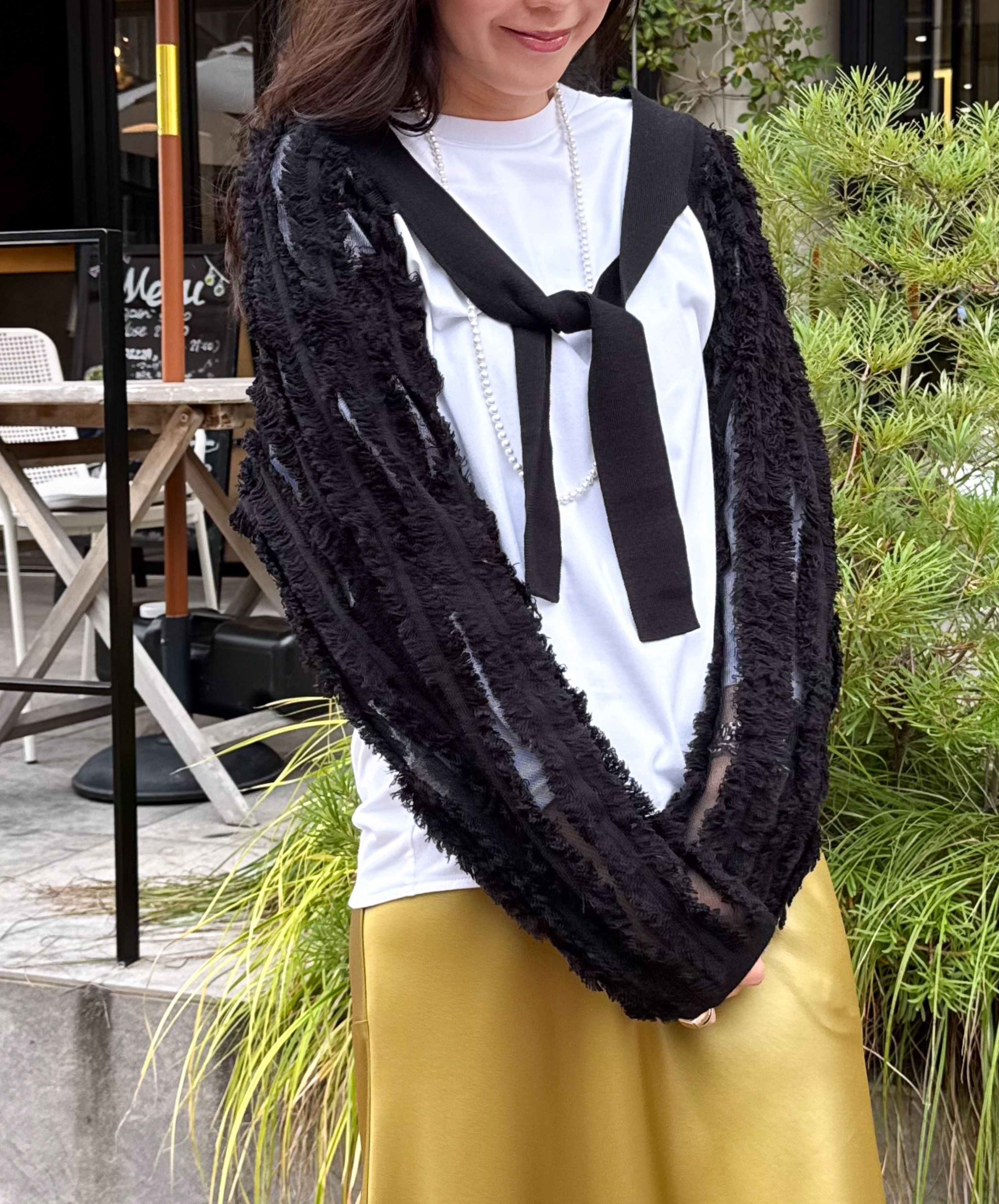 季節の変わり目に、陽光に調和するニットボレロ。繊細なシアー素材にストライプ状に並ぶフリンジを編み立てたニットボレロ。光沢あるシアーがニットでも重見えさせず、季節の変わり目に軽羽織として重宝するアイテムです。カットソーやブラウス、ニットやワンピースの上に羽織ったりと着こなしの幅も広く、晩夏からノースリーブに合わせる軽羽織として季節をつなぐアイテムとして活躍します。コンパクトな丈感で、着る人の身長を問わずバランスよく着用できるのはもちろん、ロングボトムと合わせればスタイルアップ効果も。いつものスタイルに合わせるだけで新鮮さをもたらしてくれるアイテムです。
