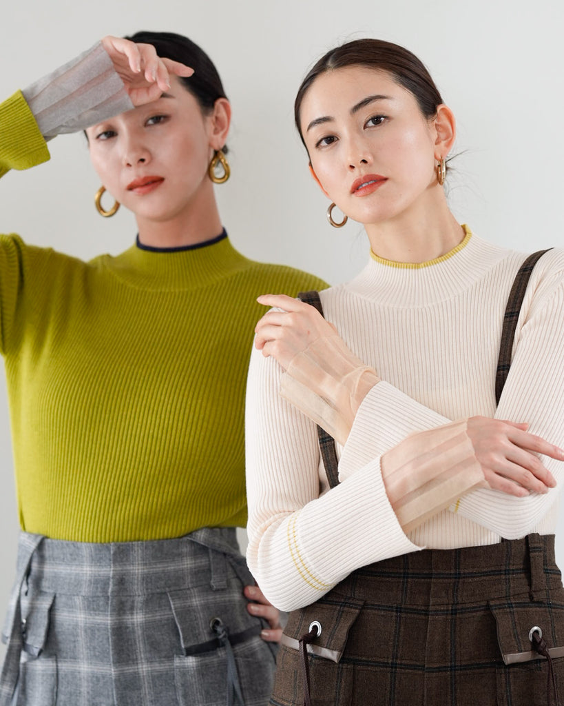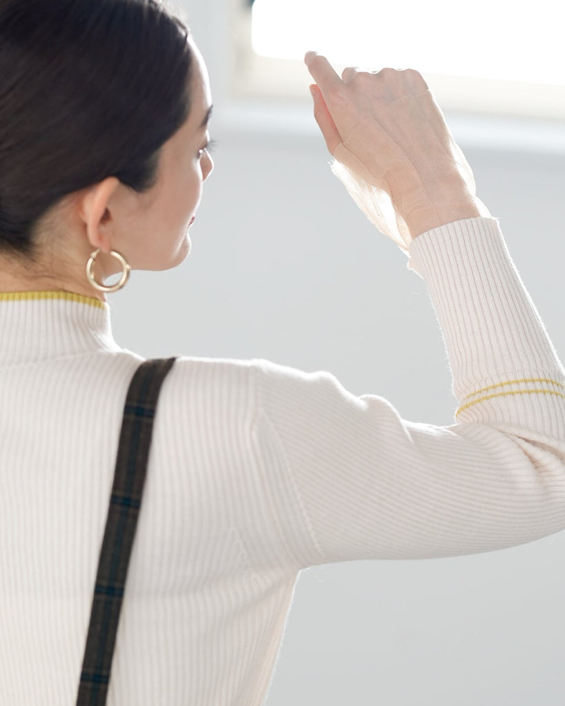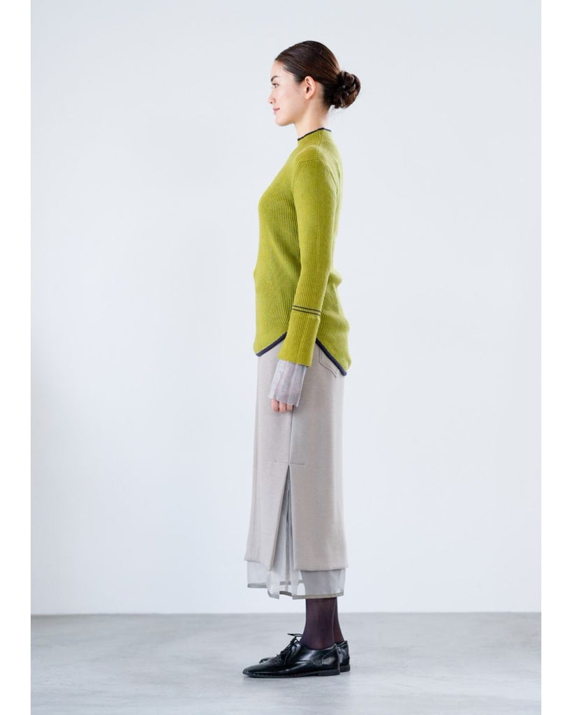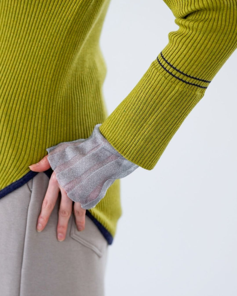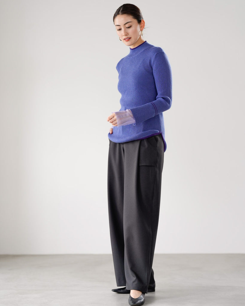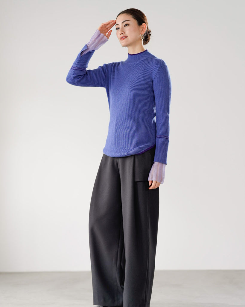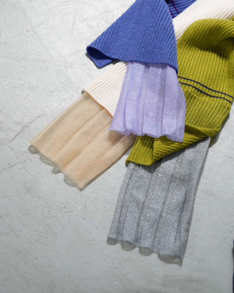 手元が2枚仕立てになったハイゲージニット。ミニマムで洗練された印象はそのままラリアムーらしいバイカラーでアクセントを。今季手元にはグリッター感のあるプリーツシアーニットを重ね透明感と抜け感を演出しました。身頃は定番ベストセラーのハイゲージニットのシルエットを活かし、付かず離れずのボディラインを拾いにくいシルエット。カービングした脇のスリットで腰の動きに対応しハイゲージニット特有の腰のかさばりを軽減します。腰回りをさりげなくカバーし、スリットで前裾だけウエストインするスタイルも可能です。アームホールは若干のゆとりを入れることで動きやすさと胸元の張り付きを考慮した設計でバストラインの輪郭や二の腕の張り付きが気になりません。ジャケットやベストなどレイヤードスタイルのインナーとしても広くお使いいただけます。
