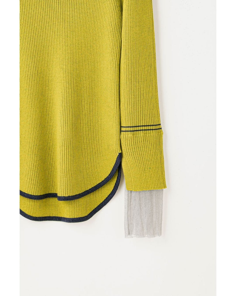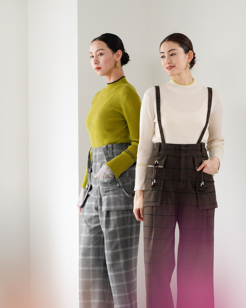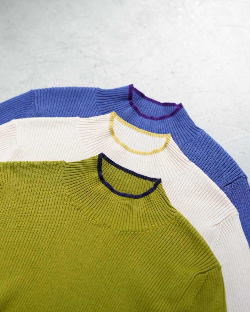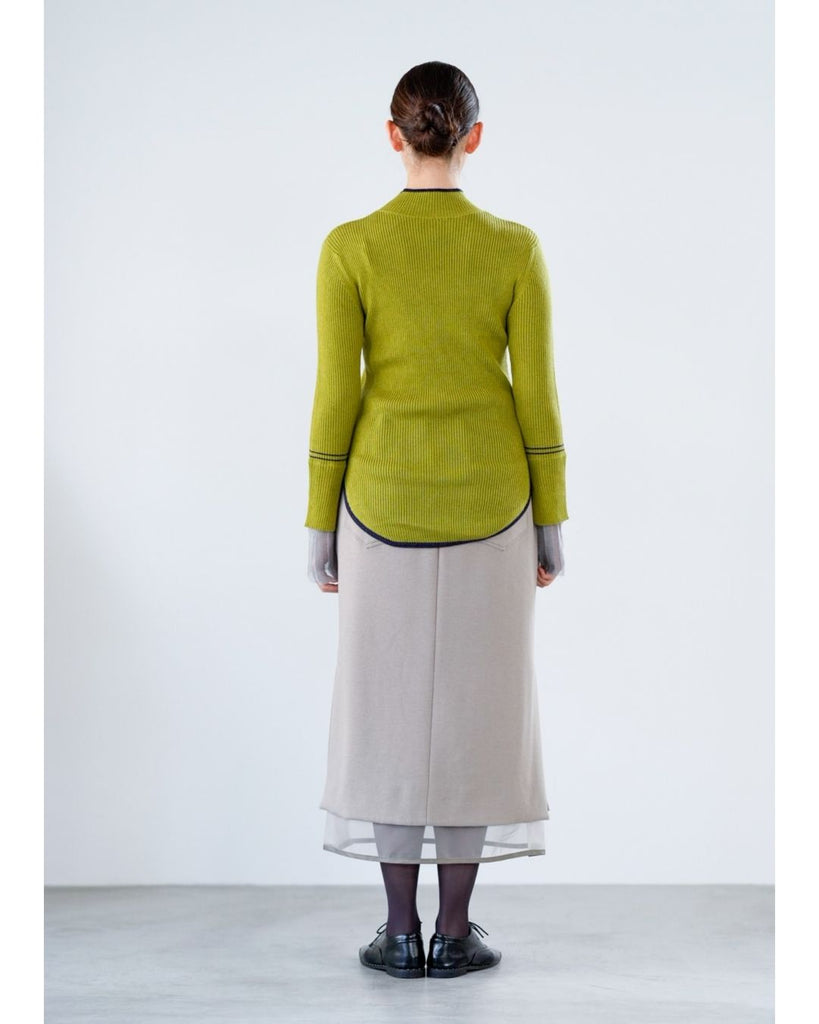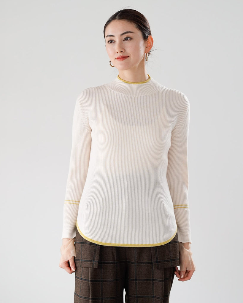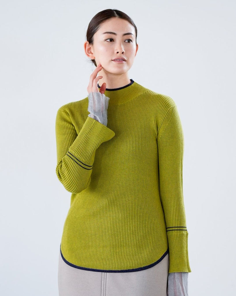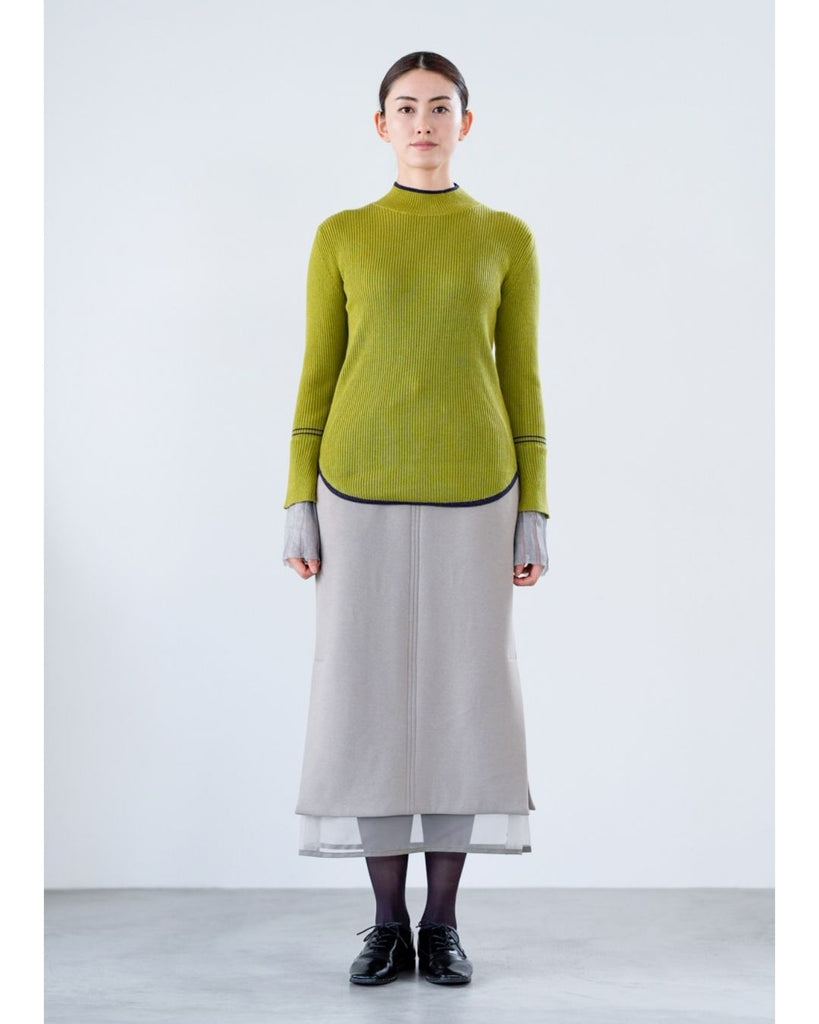 手元が2枚仕立てになったハイゲージニット。ミニマムで洗練された印象はそのままラリアムーらしいバイカラーでアクセントを。今季手元にはグリッター感のあるプリーツシアーニットを重ね透明感と抜け感を演出しました。身頃は定番ベストセラーのハイゲージニットのシルエットを活かし、付かず離れずのボディラインを拾いにくいシルエット。カービングした脇のスリットで腰の動きに対応しハイゲージニット特有の腰のかさばりを軽減します。腰回りをさりげなくカバーし、スリットで前裾だけウエストインするスタイルも可能です。アームホールは若干のゆとりを入れることで動きやすさと胸元の張り付きを考慮した設計でバストラインの輪郭や二の腕の張り付きが気になりません。ジャケットやベストなどレイヤードスタイルのインナーとしても広くお使いいただけます。
