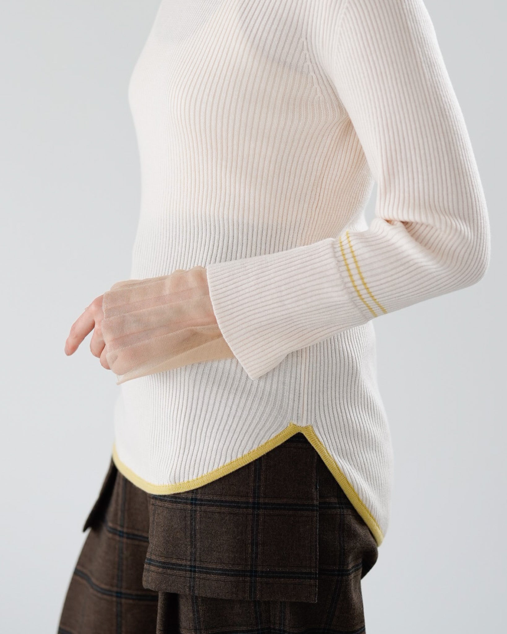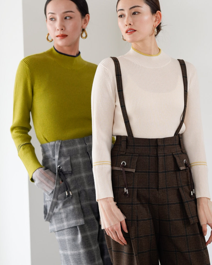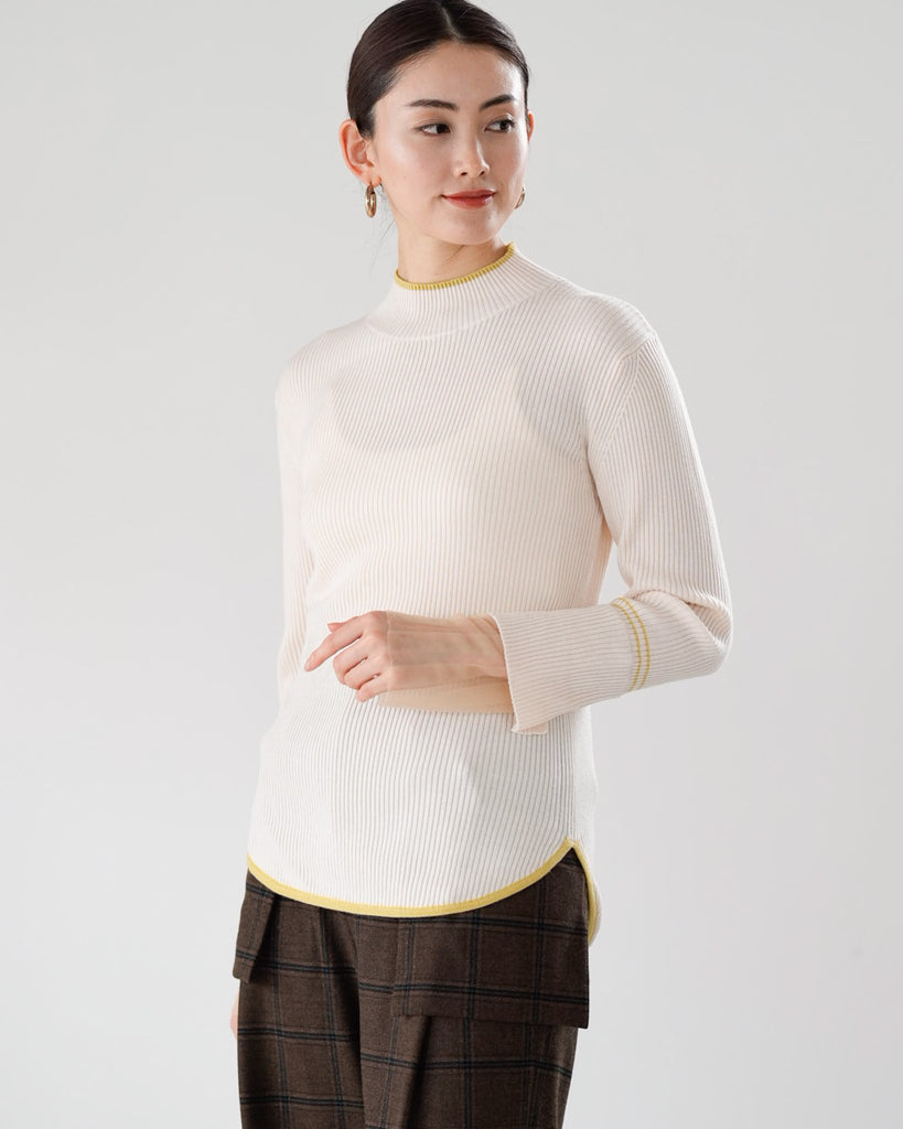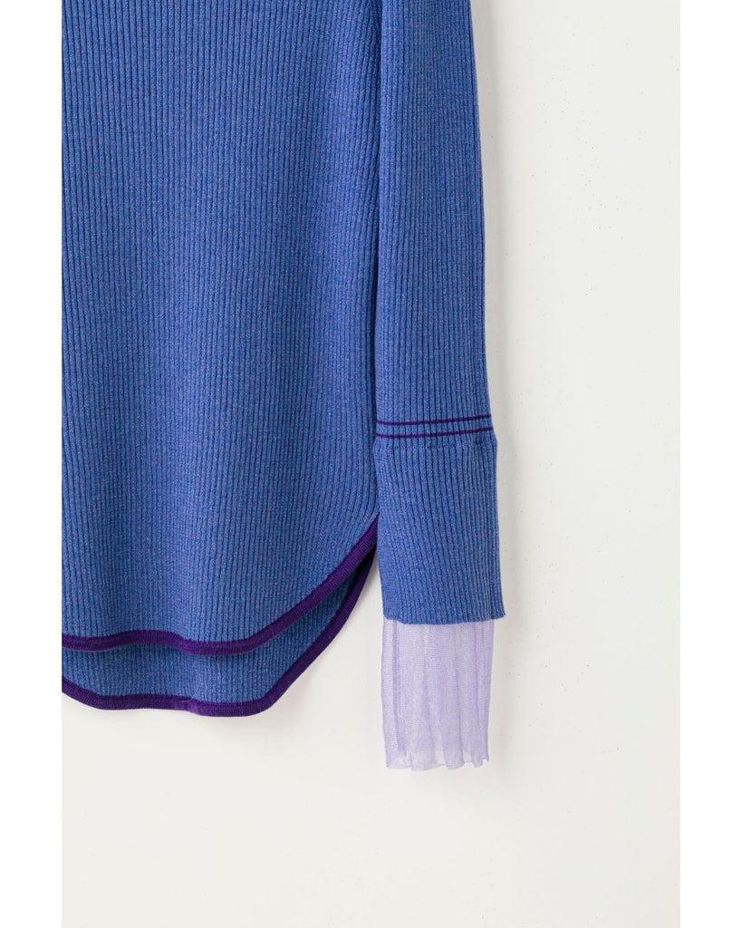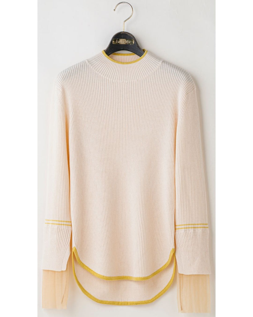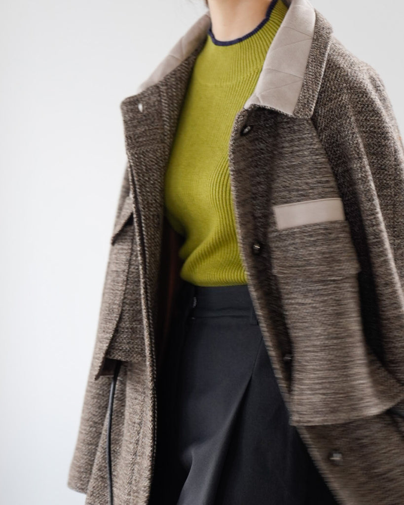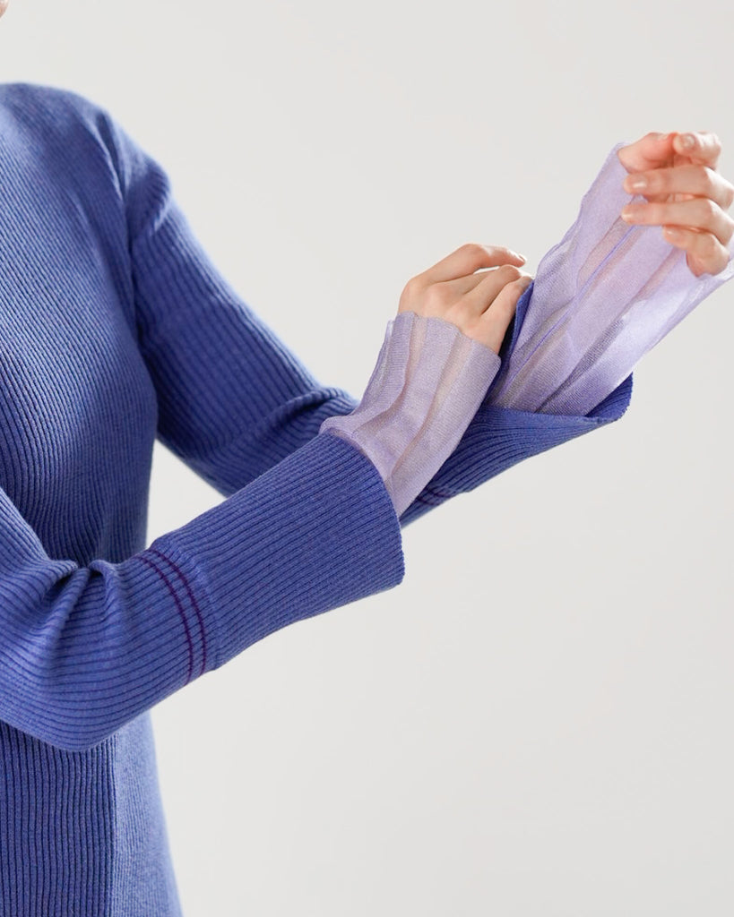 手元が2枚仕立てになったハイゲージニット。ミニマムで洗練された印象はそのままラリアムーらしいバイカラーでアクセントを。今季手元にはグリッター感のあるプリーツシアーニットを重ね透明感と抜け感を演出しました。身頃は定番ベストセラーのハイゲージニットのシルエットを活かし、付かず離れずのボディラインを拾いにくいシルエット。カービングした脇のスリットで腰の動きに対応しハイゲージニット特有の腰のかさばりを軽減します。腰回りをさりげなくカバーし、スリットで前裾だけウエストインするスタイルも可能です。アームホールは若干のゆとりを入れることで動きやすさと胸元の張り付きを考慮した設計でバストラインの輪郭や二の腕の張り付きが気になりません。ジャケットやベストなどレイヤードスタイルのインナーとしても広くお使いいただけます。