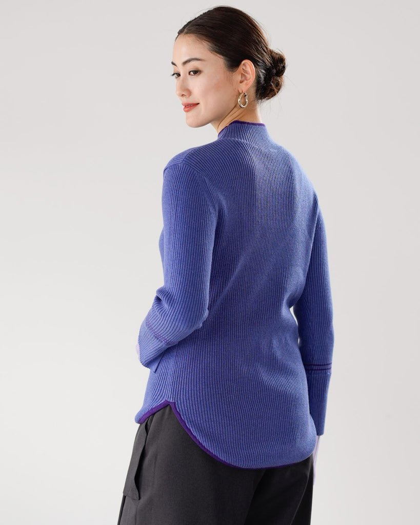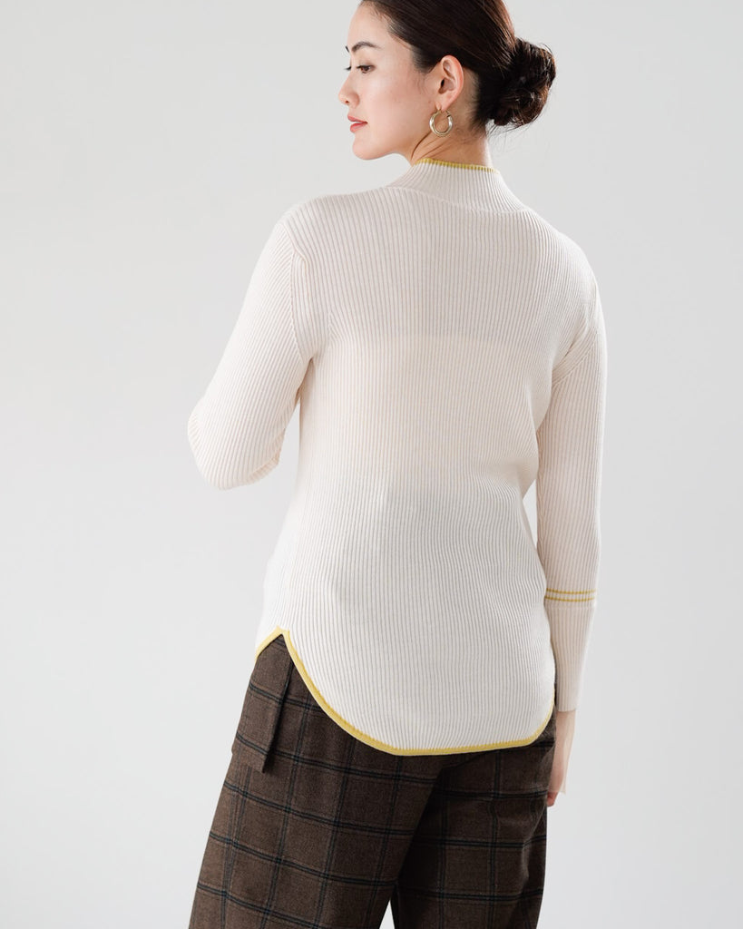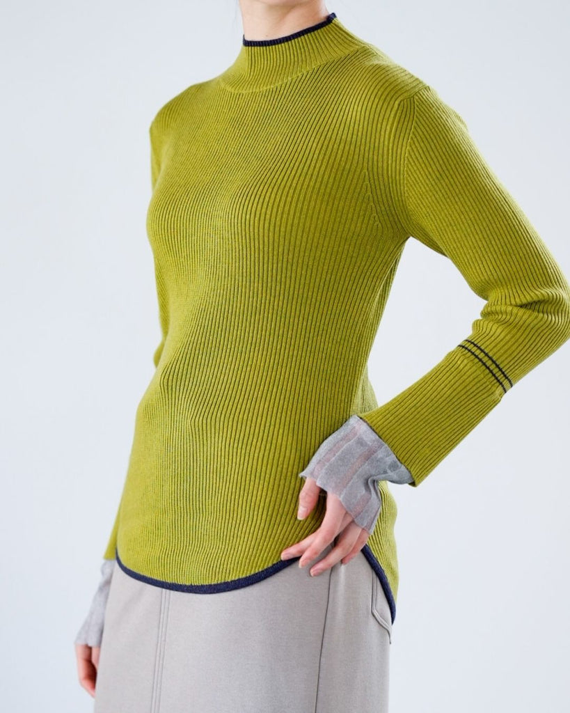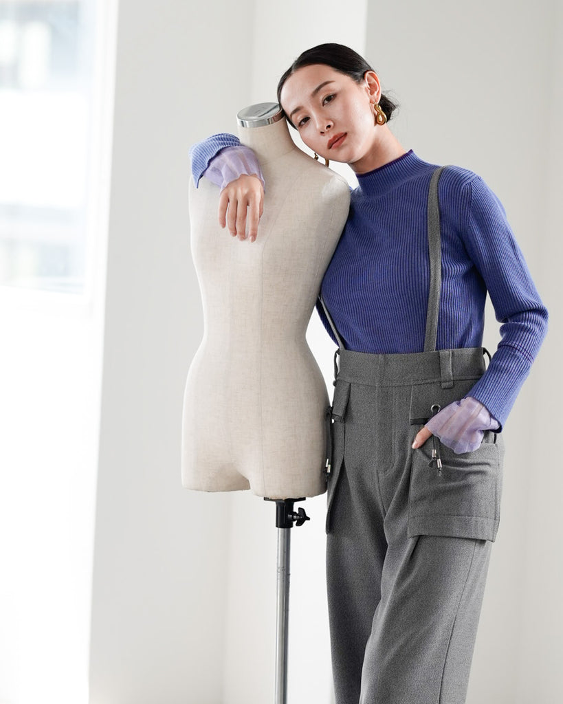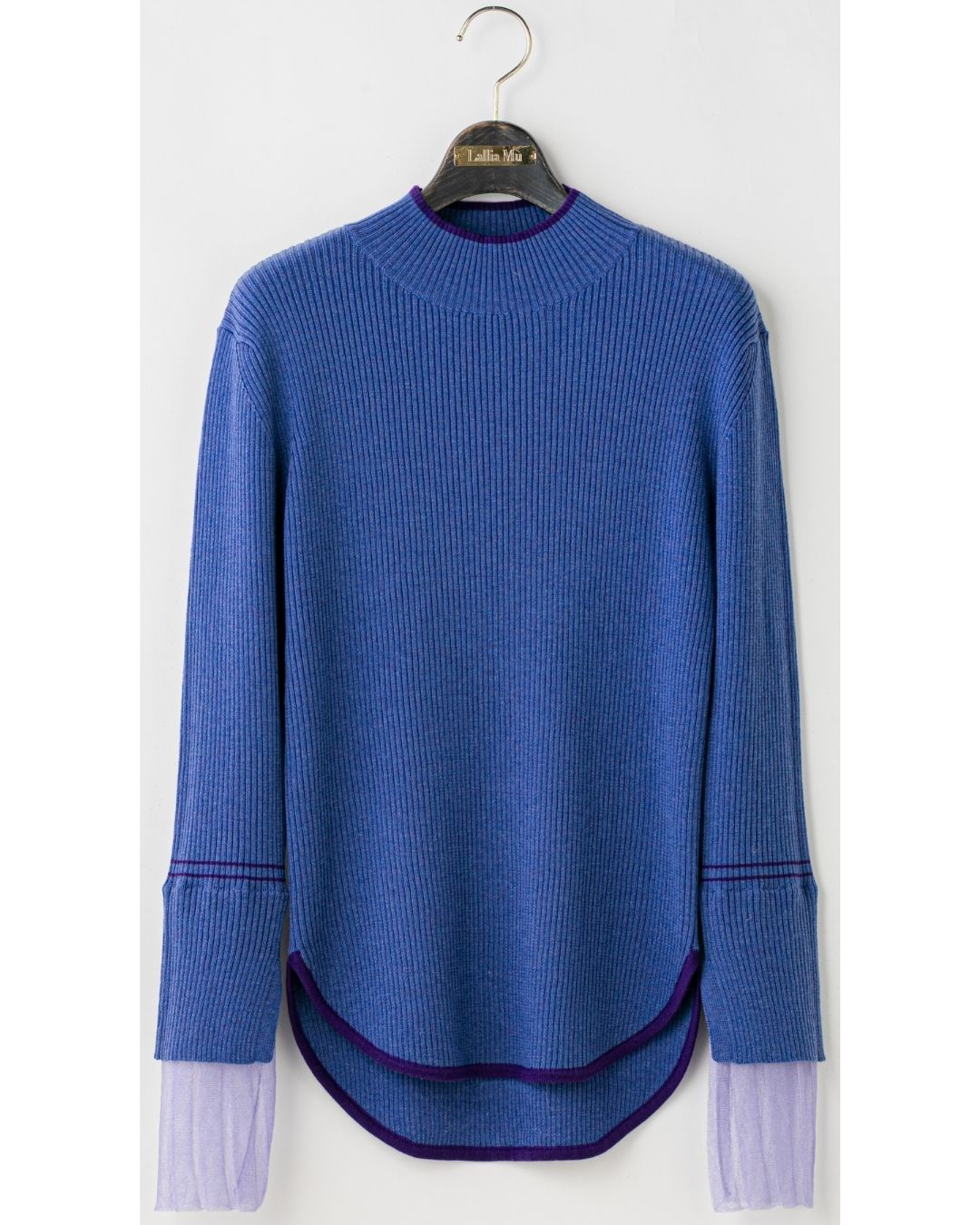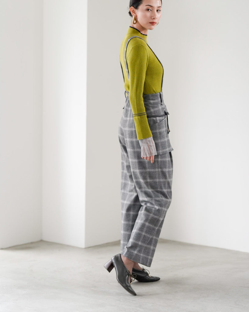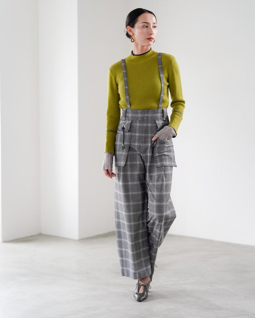 手元が2枚仕立てになったハイゲージニット。ミニマムで洗練された印象はそのままラリアムーらしいバイカラーでアクセントを。今季手元にはグリッター感のあるプリーツシアーニットを重ね透明感と抜け感を演出しました。身頃は定番ベストセラーのハイゲージニットのシルエットを活かし、付かず離れずのボディラインを拾いにくいシルエット。カービングした脇のスリットで腰の動きに対応しハイゲージニット特有の腰のかさばりを軽減します。腰回りをさりげなくカバーし、スリットで前裾だけウエストインするスタイルも可能です。アームホールは若干のゆとりを入れることで動きやすさと胸元の張り付きを考慮した設計でバストラインの輪郭や二の腕の張り付きが気になりません。ジャケットやベストなどレイヤードスタイルのインナーとしても広くお使いいただけます。