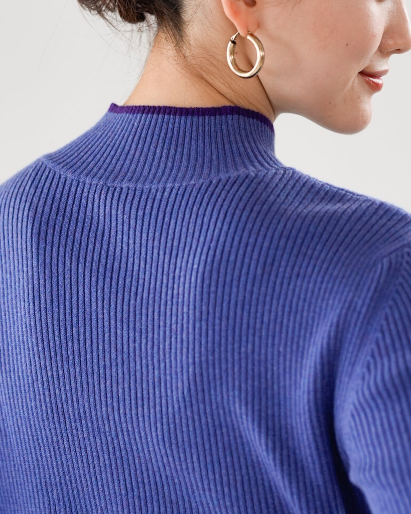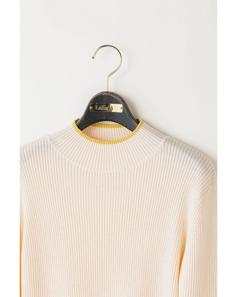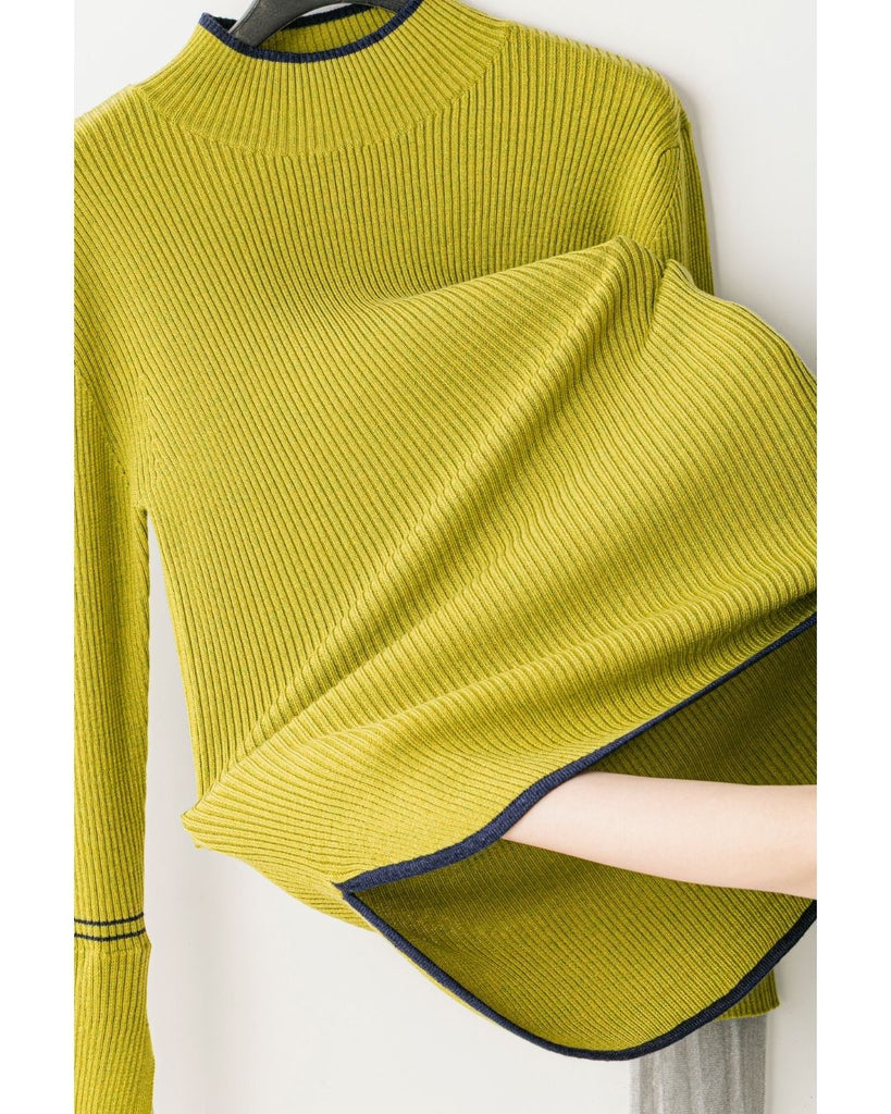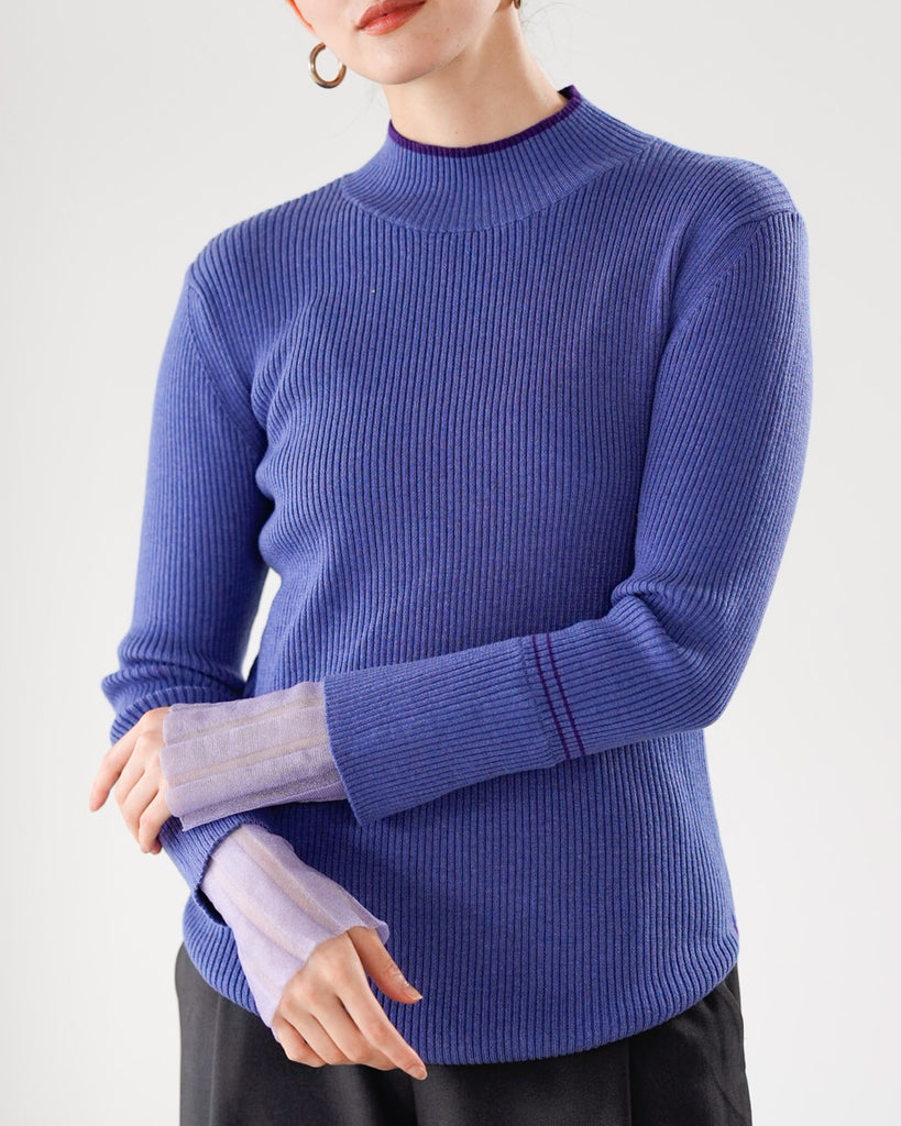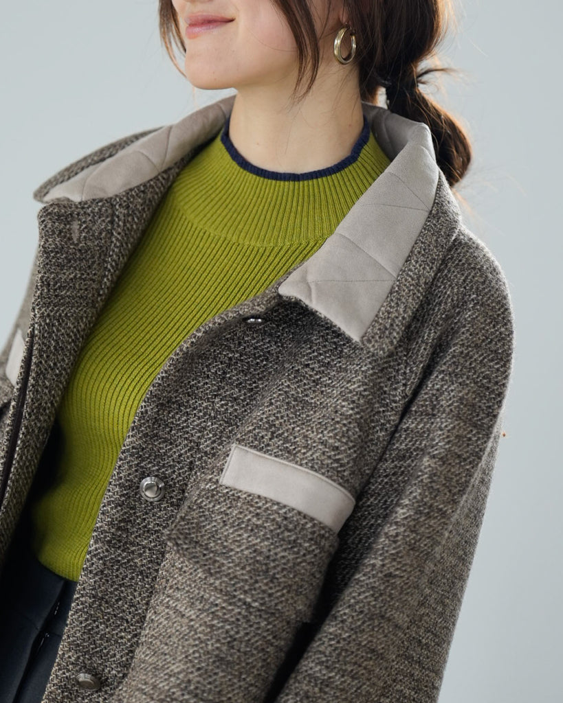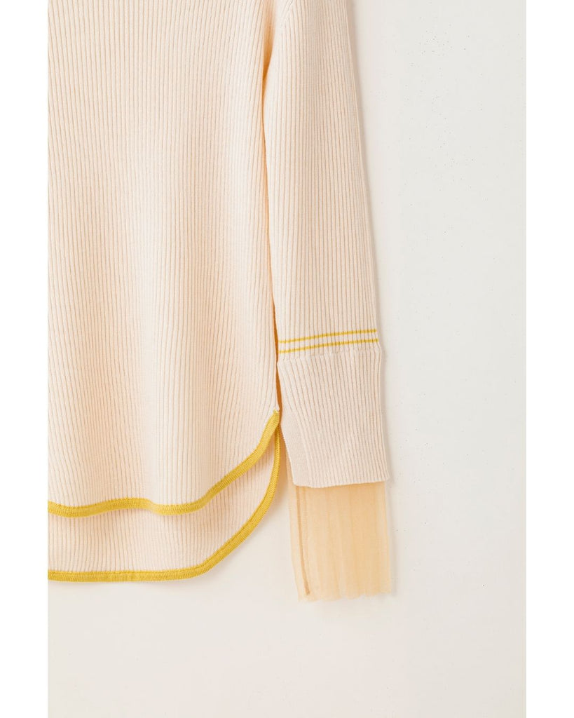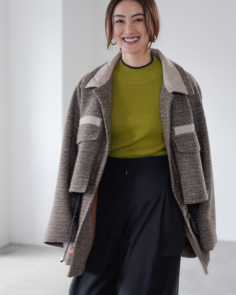 手元が2枚仕立てになったハイゲージニット。ミニマムで洗練された印象はそのままラリアムーらしいバイカラーでアクセントを。今季手元にはグリッター感のあるプリーツシアーニットを重ね透明感と抜け感を演出しました。身頃は定番ベストセラーのハイゲージニットのシルエットを活かし、付かず離れずのボディラインを拾いにくいシルエット。カービングした脇のスリットで腰の動きに対応しハイゲージニット特有の腰のかさばりを軽減します。腰回りをさりげなくカバーし、スリットで前裾だけウエストインするスタイルも可能です。アームホールは若干のゆとりを入れることで動きやすさと胸元の張り付きを考慮した設計でバストラインの輪郭や二の腕の張り付きが気になりません。ジャケットやベストなどレイヤードスタイルのインナーとしても広くお使いいただけます。