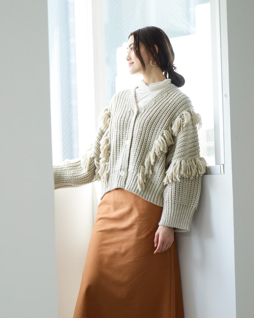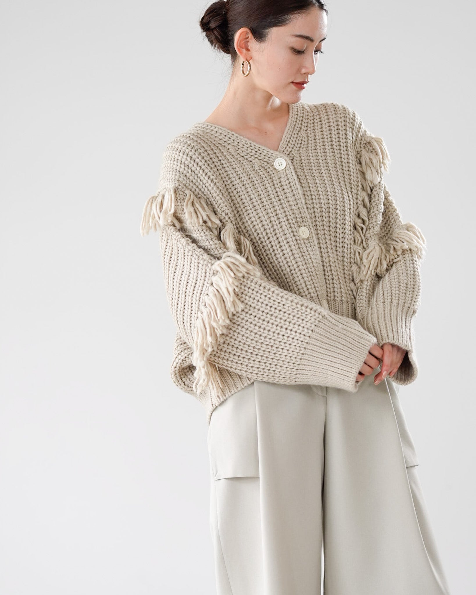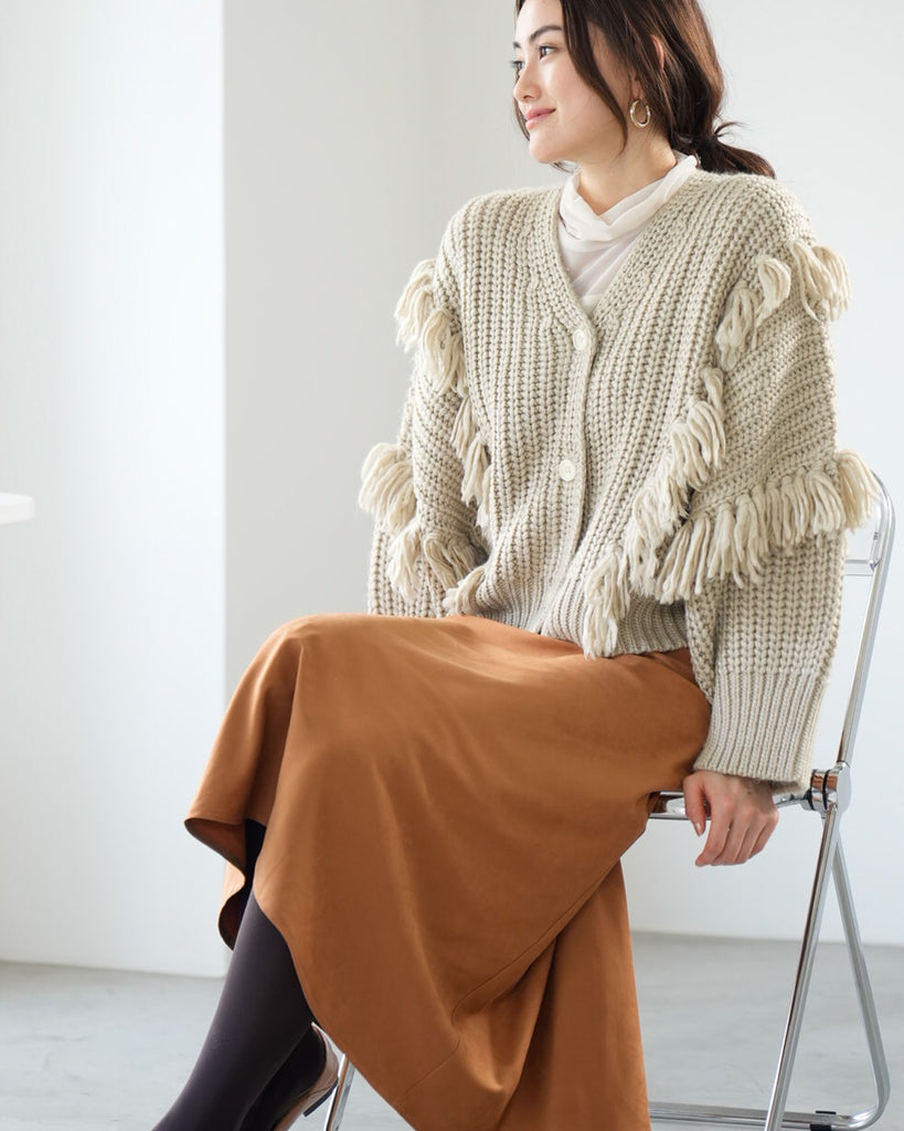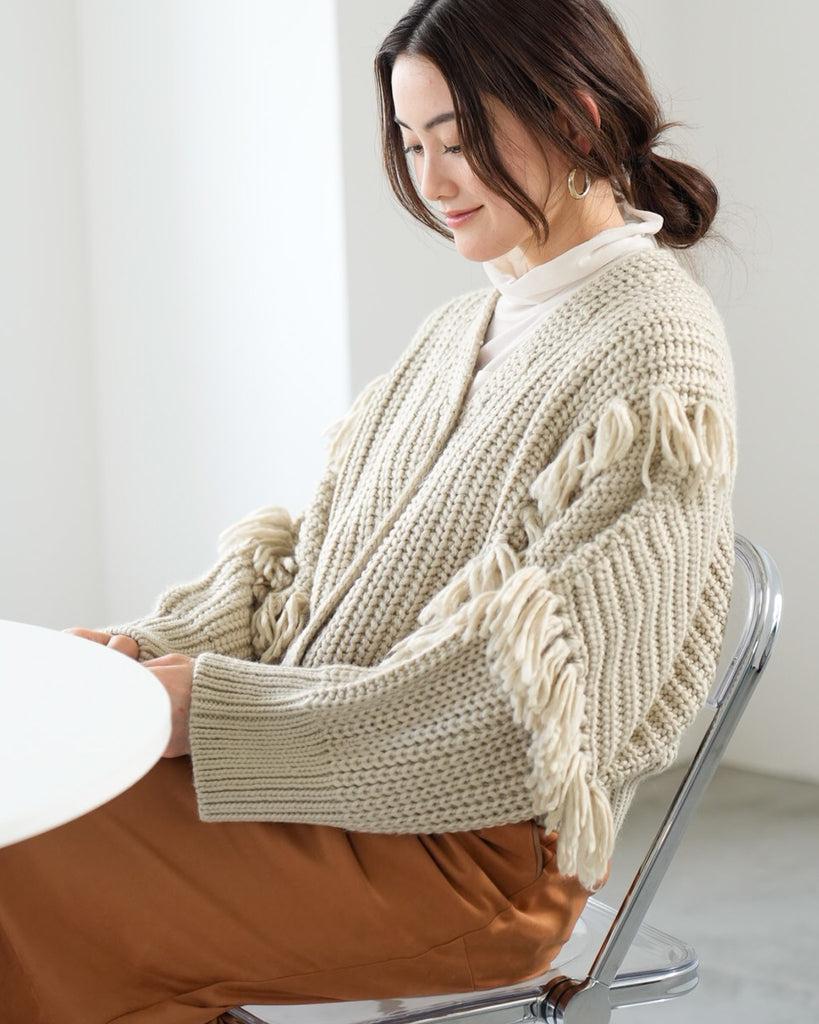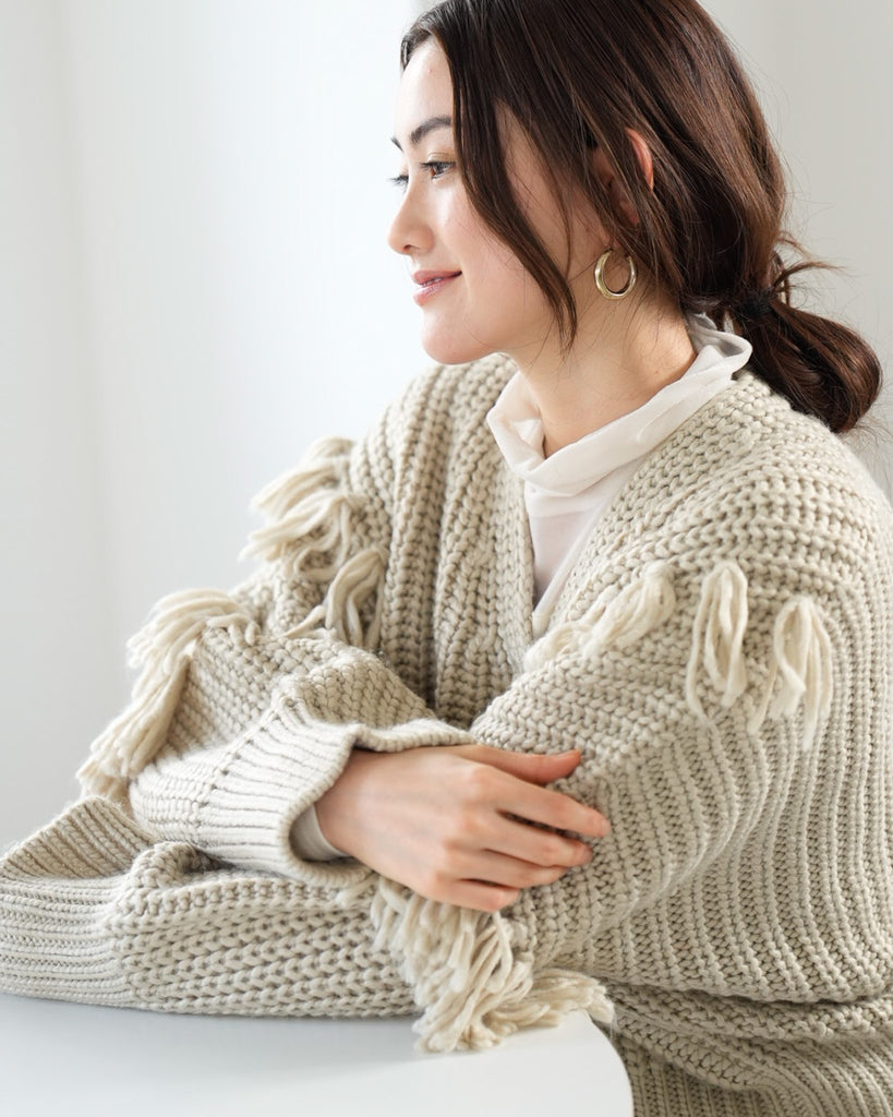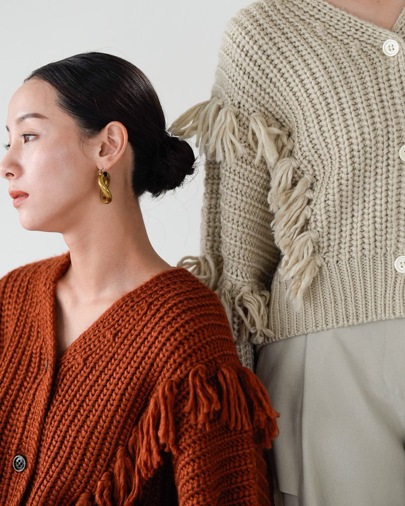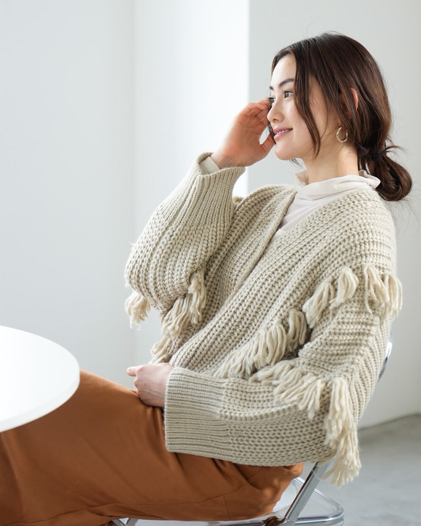 ざっくりと編まれた手編み風の表情と、ショート丈で抜け感あるシルエットが魅力的なニットカーディガン。ふっくらと厚みのある編み地はあたたかみがありながらも軽やかな着心地。素肌にもまとえるほどなめらかな肌触りです。羽織るだけで大人のリラックスした余裕ある表情を演出します。身頃と袖にたっぷりとあしらわれたフリンジは全てハンドワークで仕立てられ、ニットに豊かな表情と温もりをプラス。短い着丈がロングボトムと相性がよく、ワンピースやロングスカート、ワイドパンツなどとの合わせは今年らしいバランスを作ります。ゆったりとしたシルエットはインナーを選ばす、ボリュームニットでも小柄な方も取り入れやすいアイテムです。