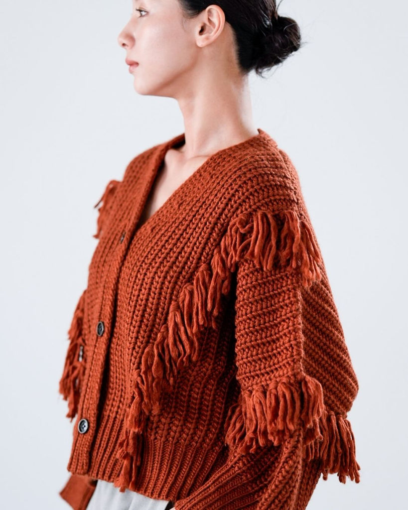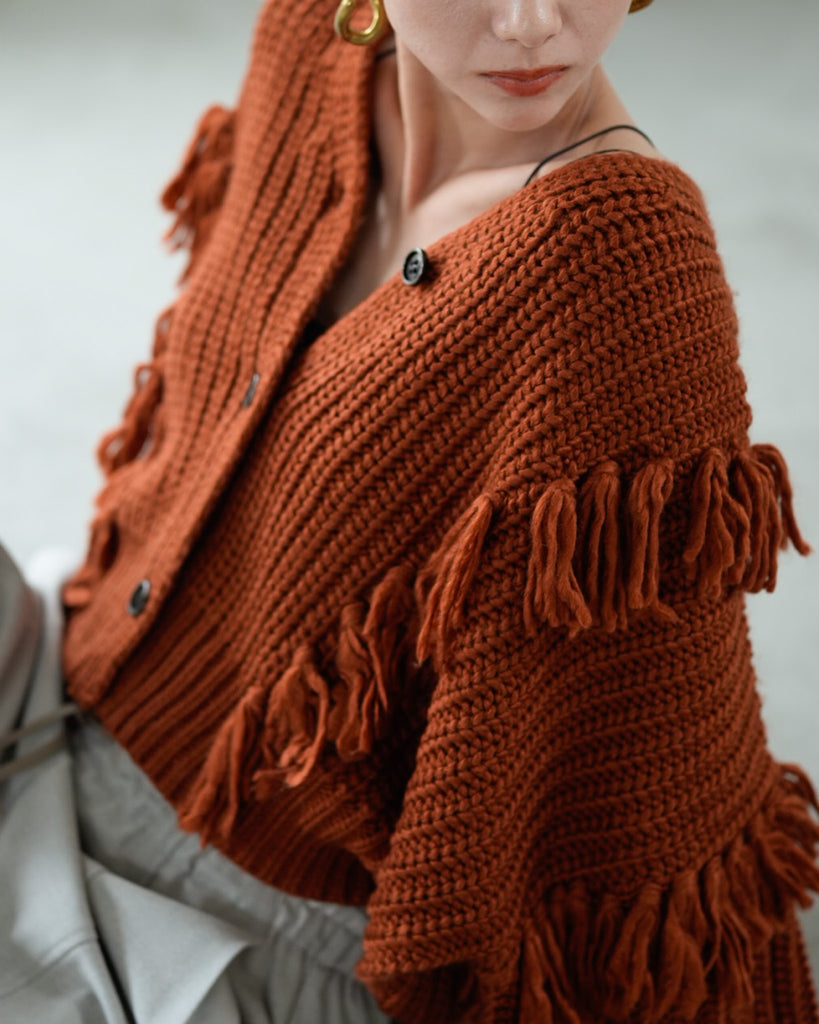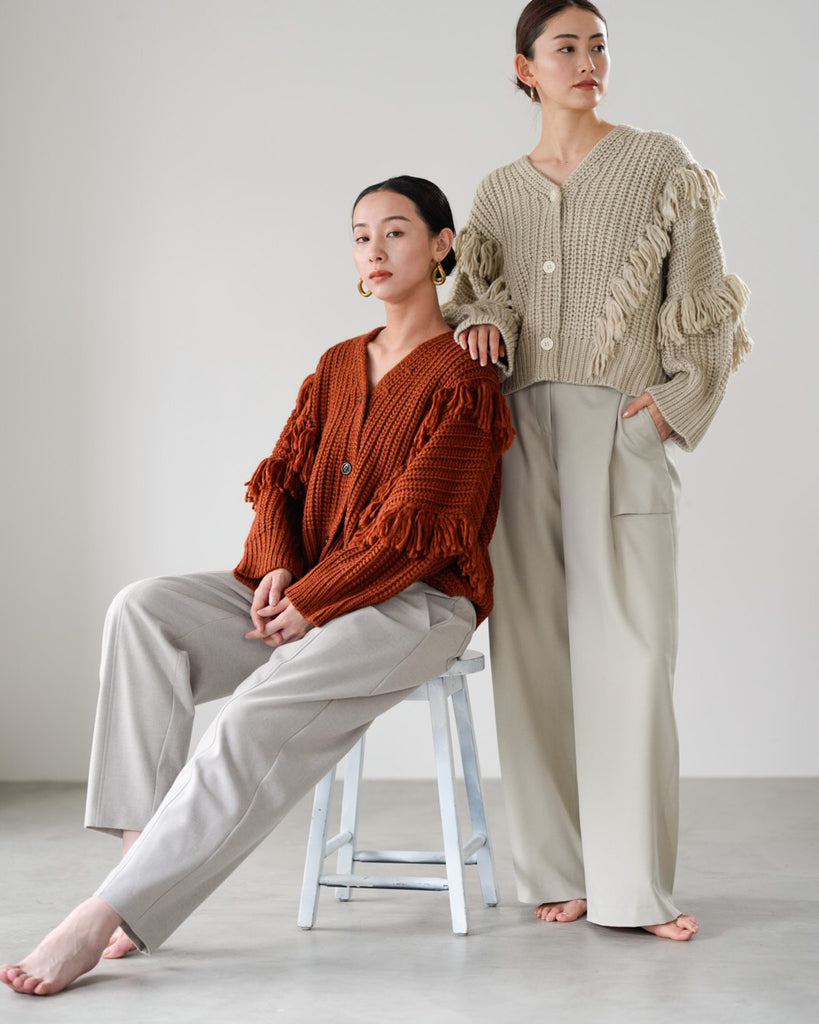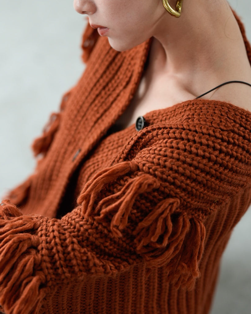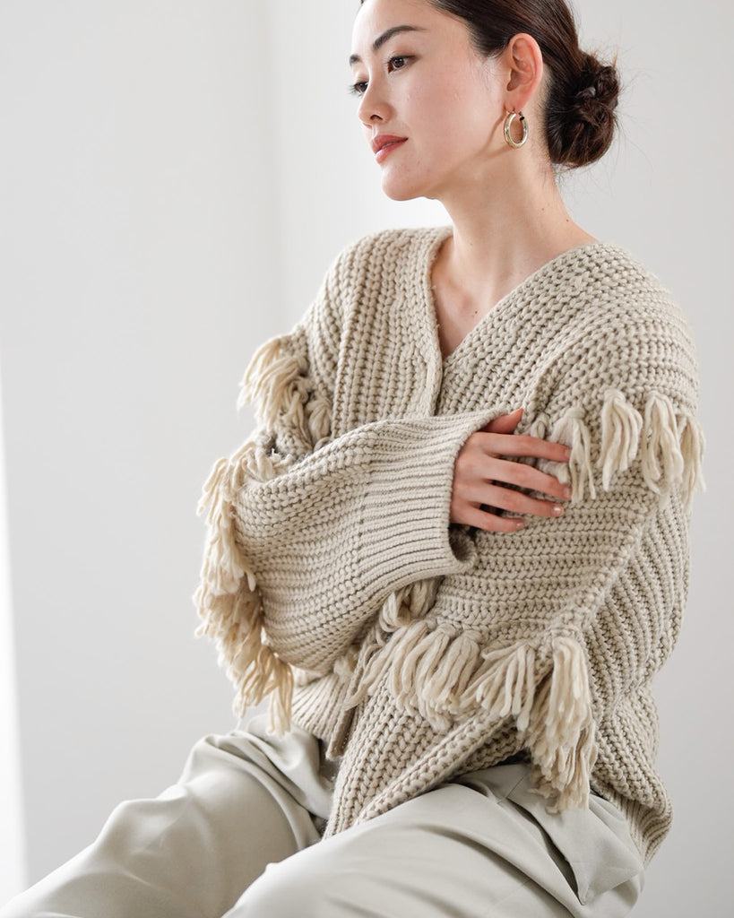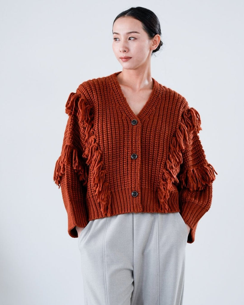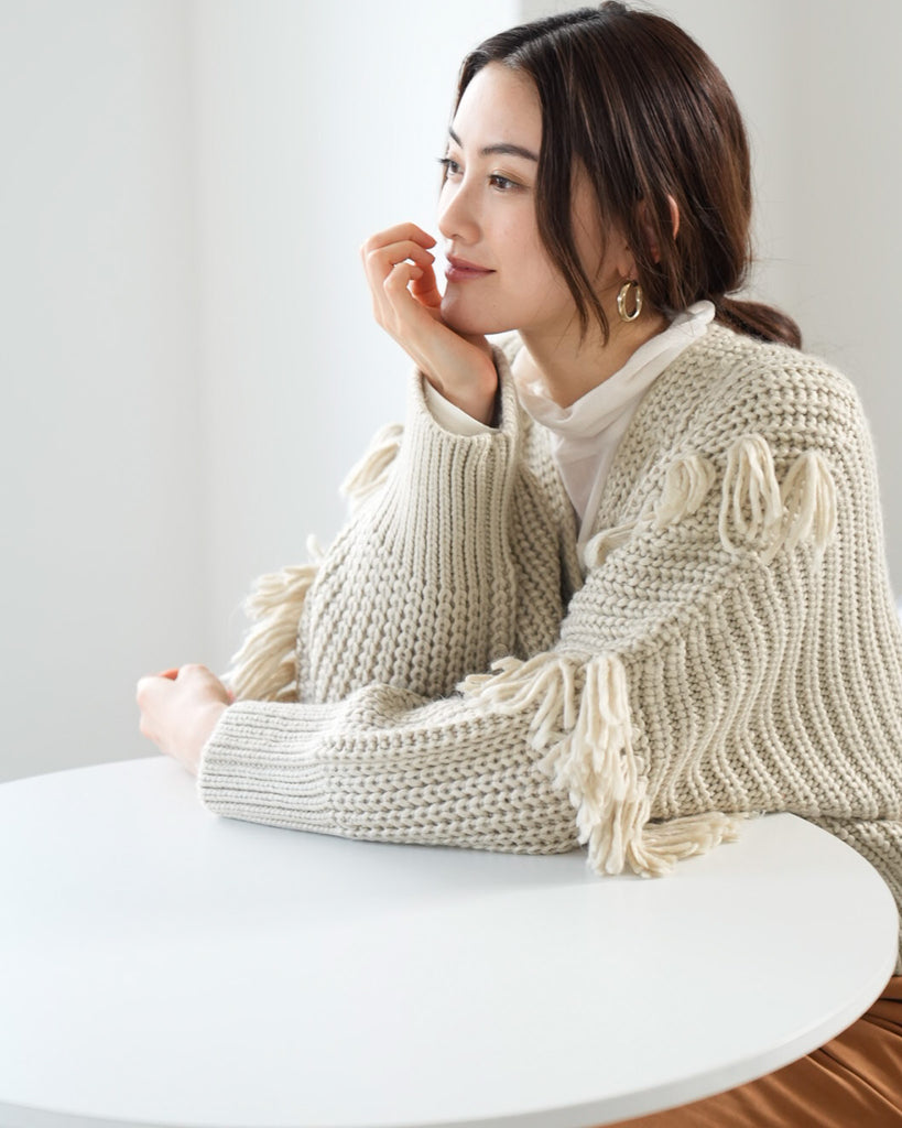 ざっくりと編まれた手編み風の表情と、ショート丈で抜け感あるシルエットが魅力的なニットカーディガン。ふっくらと厚みのある編み地はあたたかみがありながらも軽やかな着心地。素肌にもまとえるほどなめらかな肌触りです。羽織るだけで大人のリラックスした余裕ある表情を演出します。身頃と袖にたっぷりとあしらわれたフリンジは全てハンドワークで仕立てられ、ニットに豊かな表情と温もりをプラス。短い着丈がロングボトムと相性がよく、ワンピースやロングスカート、ワイドパンツなどとの合わせは今年らしいバランスを作ります。ゆったりとしたシルエットはインナーを選ばす、ボリュームニットでも小柄な方も取り入れやすいアイテムです。