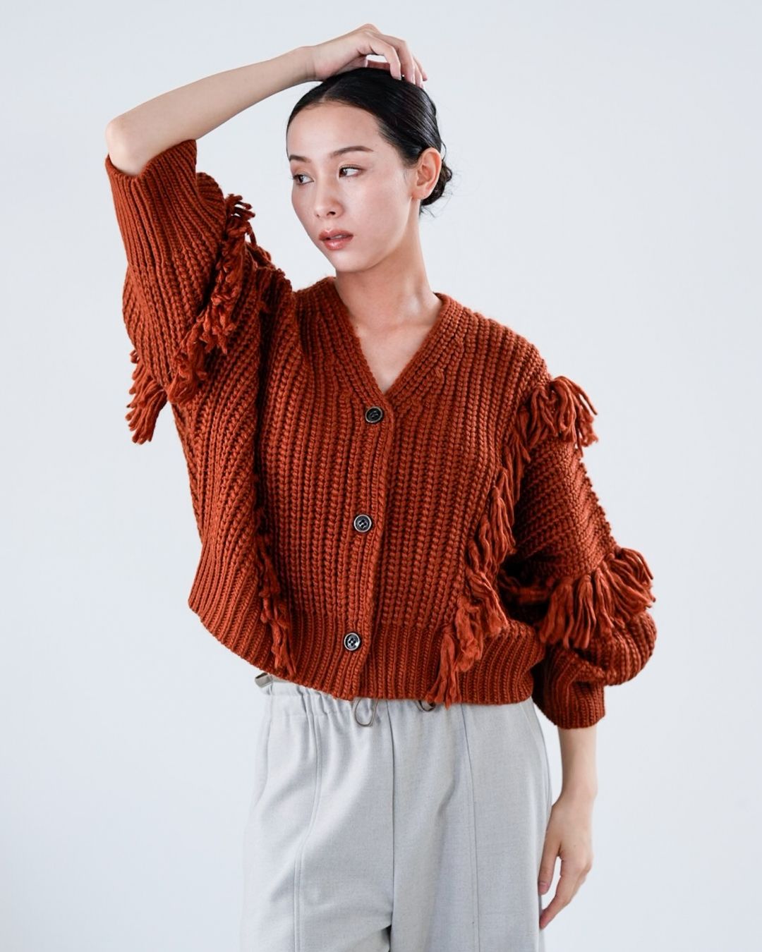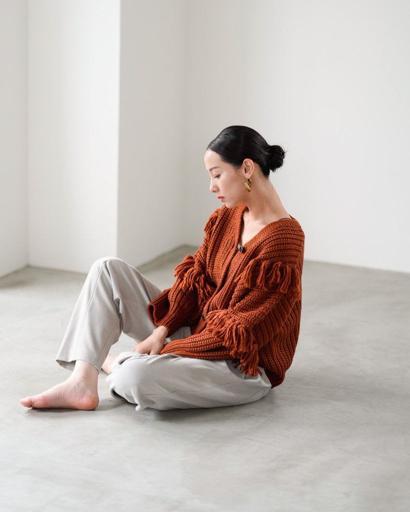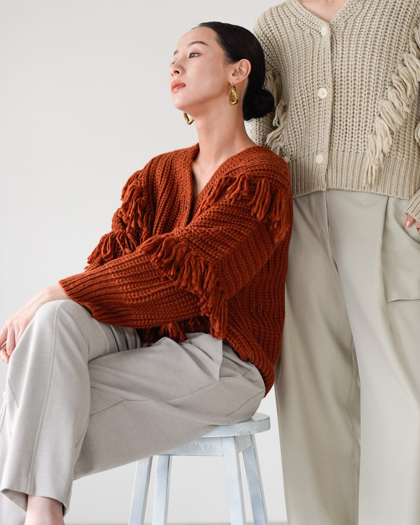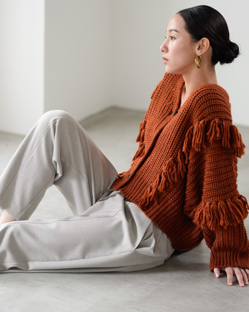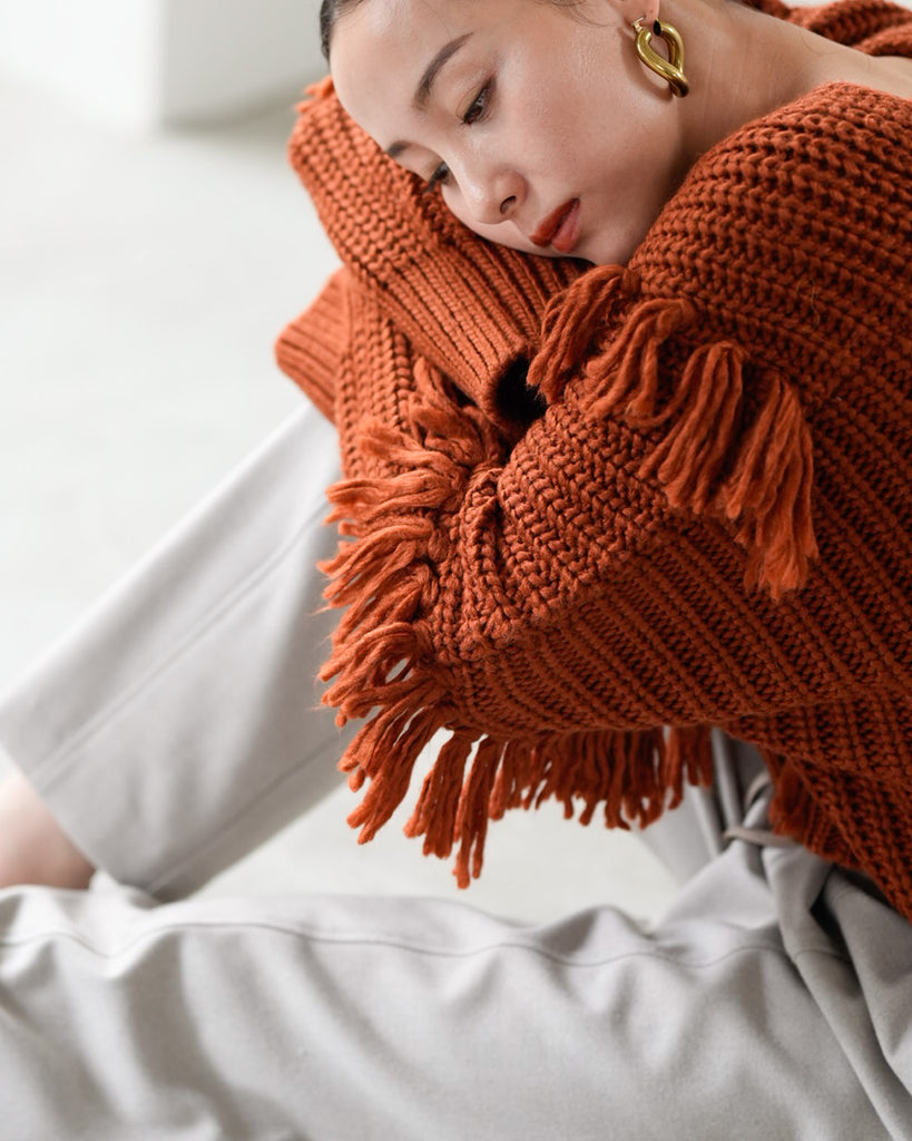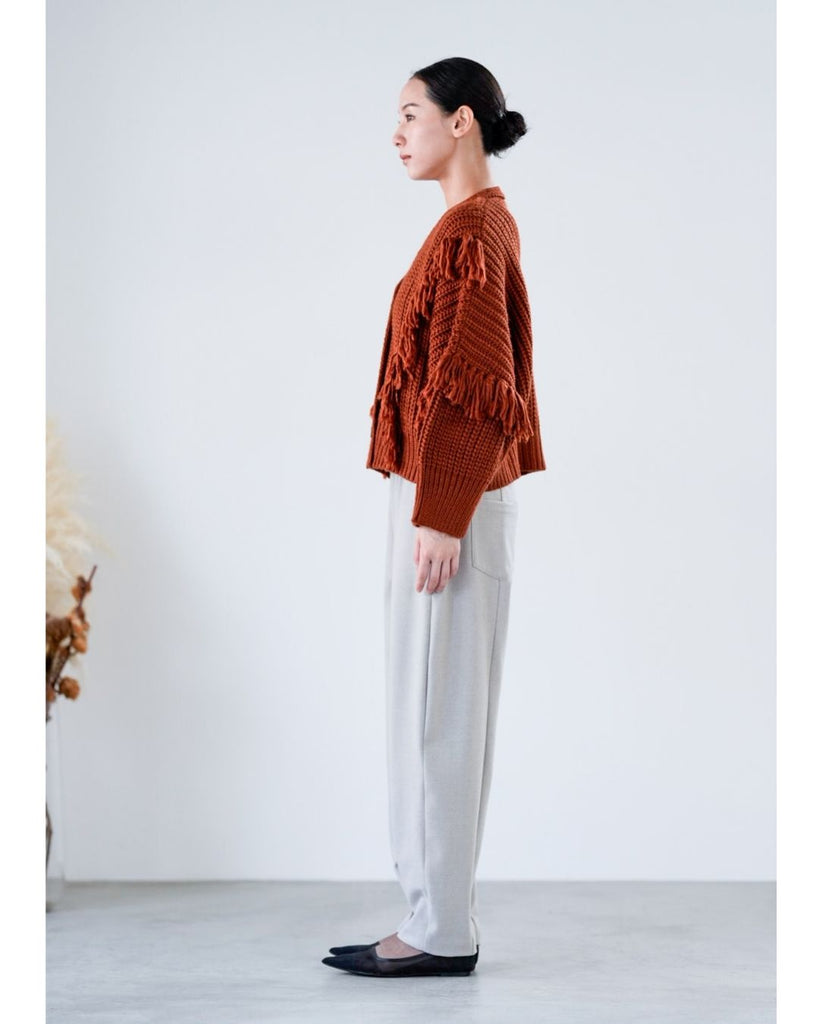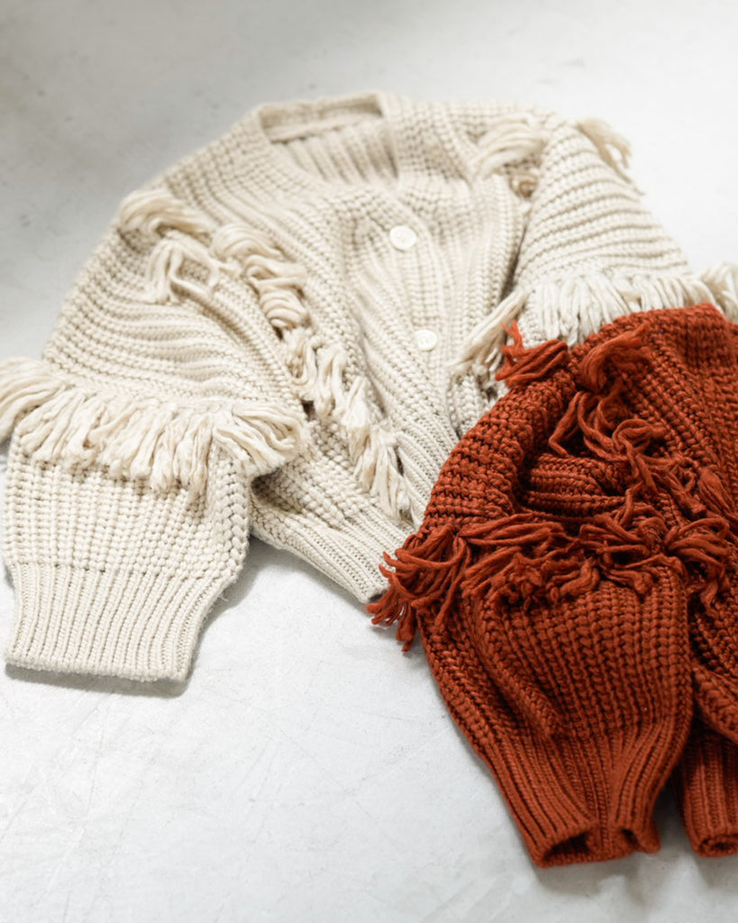 ざっくりと編まれた手編み風の表情と、ショート丈で抜け感あるシルエットが魅力的なニットカーディガン。ふっくらと厚みのある編み地はあたたかみがありながらも軽やかな着心地。素肌にもまとえるほどなめらかな肌触りです。羽織るだけで大人のリラックスした余裕ある表情を演出します。身頃と袖にたっぷりとあしらわれたフリンジは全てハンドワークで仕立てられ、ニットに豊かな表情と温もりをプラス。短い着丈がロングボトムと相性がよく、ワンピースやロングスカート、ワイドパンツなどとの合わせは今年らしいバランスを作ります。ゆったりとしたシルエットはインナーを選ばす、ボリュームニットでも小柄な方も取り入れやすいアイテムです。