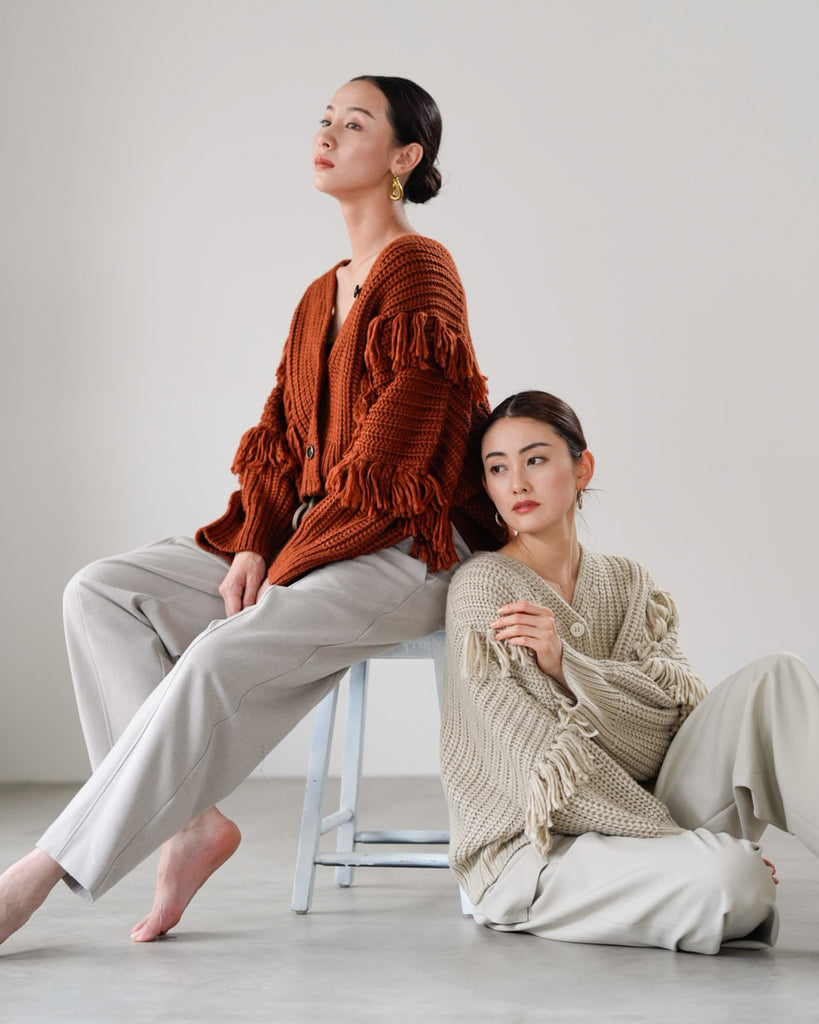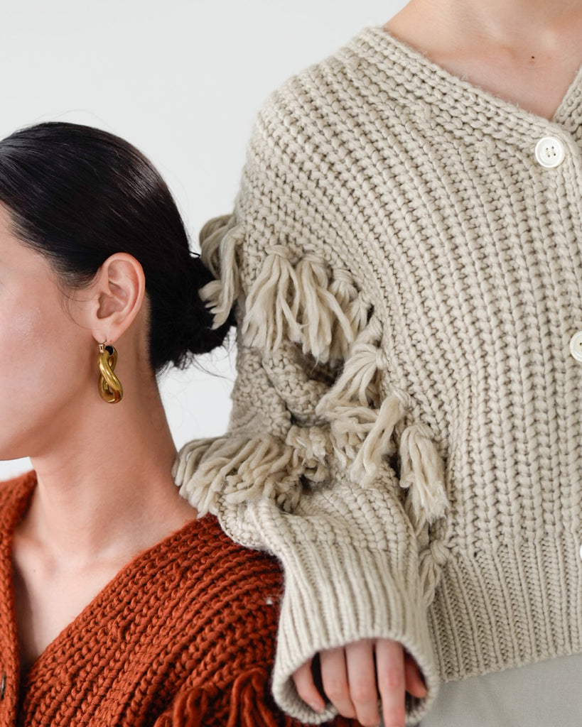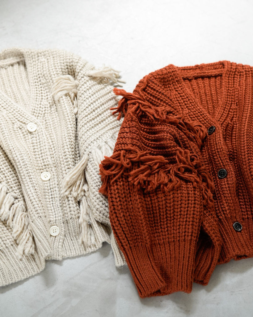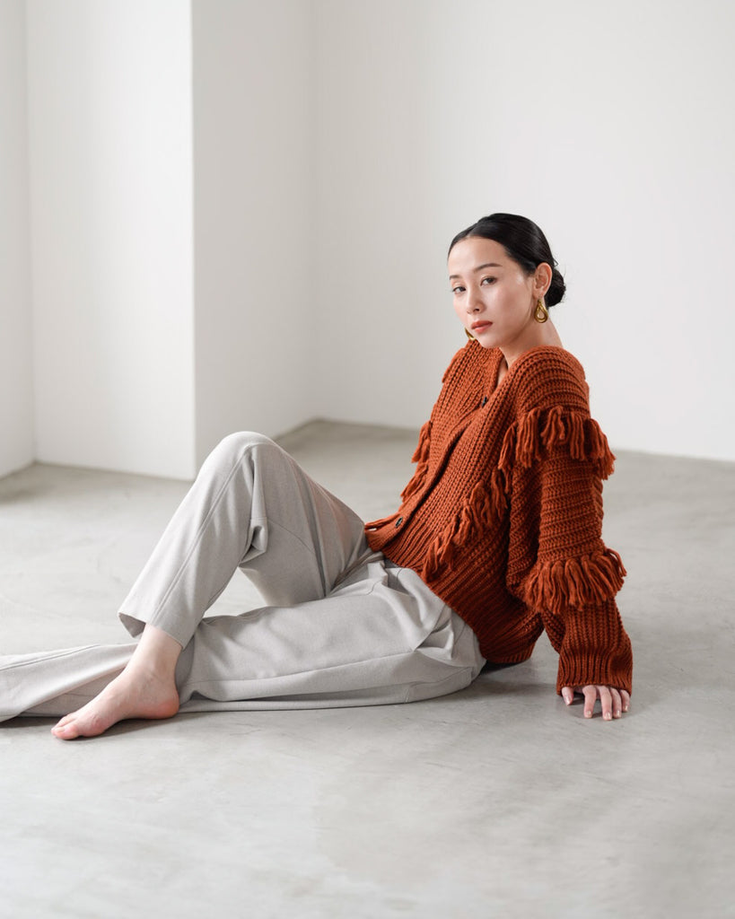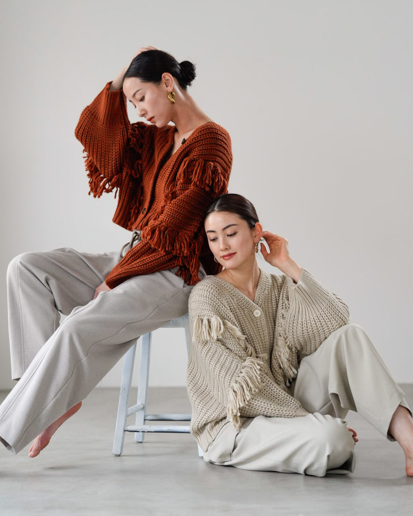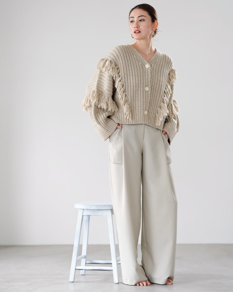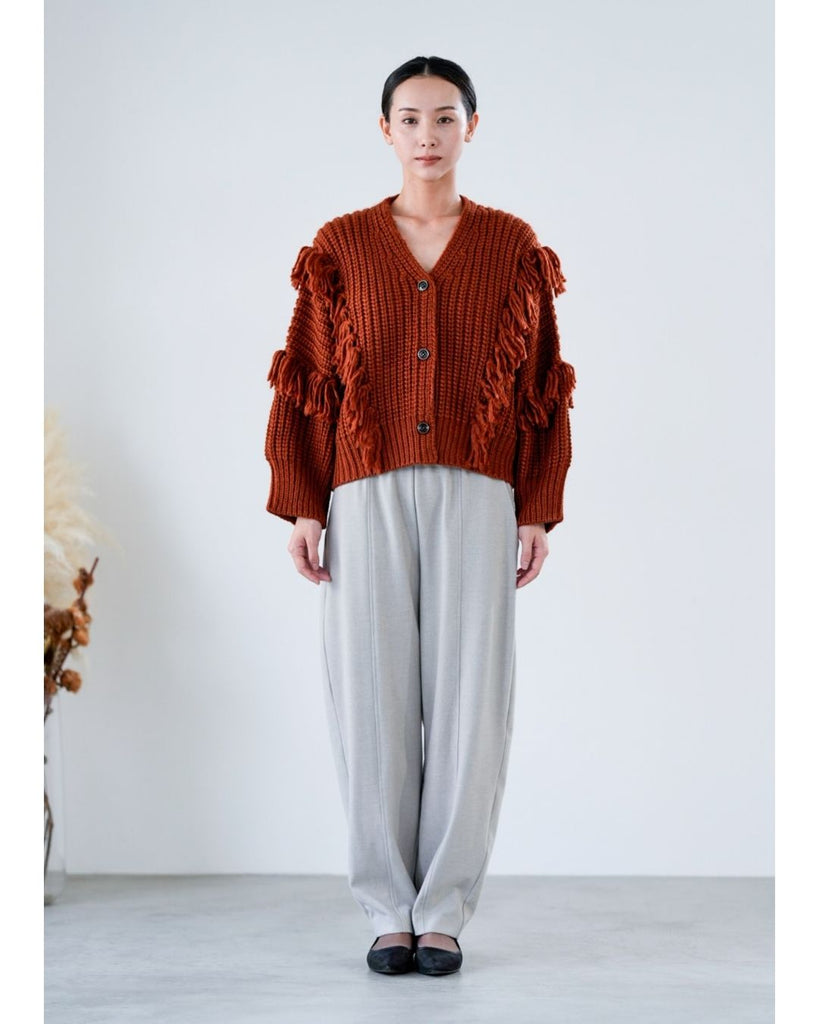 ざっくりと編まれた手編み風の表情と、ショート丈で抜け感あるシルエットが魅力的なニットカーディガン。ふっくらと厚みのある編み地はあたたかみがありながらも軽やかな着心地。素肌にもまとえるほどなめらかな肌触りです。羽織るだけで大人のリラックスした余裕ある表情を演出します。身頃と袖にたっぷりとあしらわれたフリンジは全てハンドワークで仕立てられ、ニットに豊かな表情と温もりをプラス。短い着丈がロングボトムと相性がよく、ワンピースやロングスカート、ワイドパンツなどとの合わせは今年らしいバランスを作ります。ゆったりとしたシルエットはインナーを選ばす、ボリュームニットでも小柄な方も取り入れやすいアイテムです。