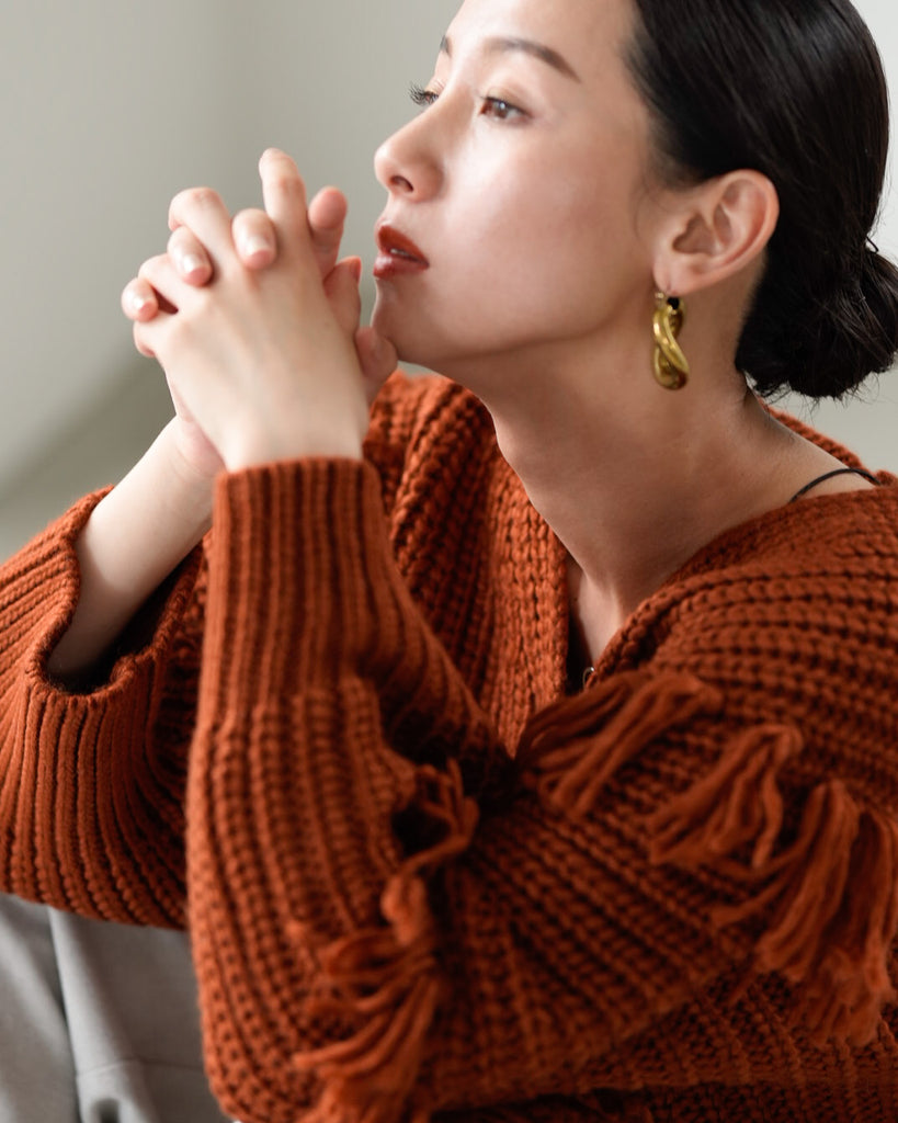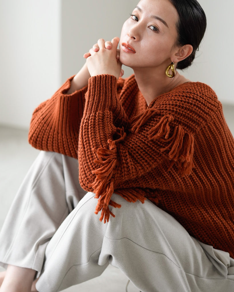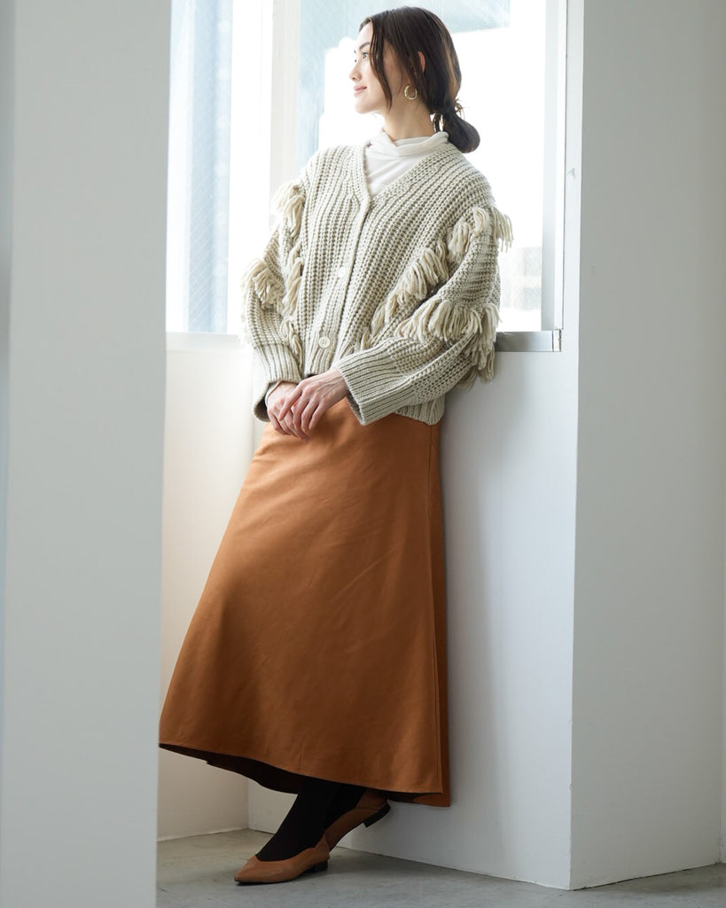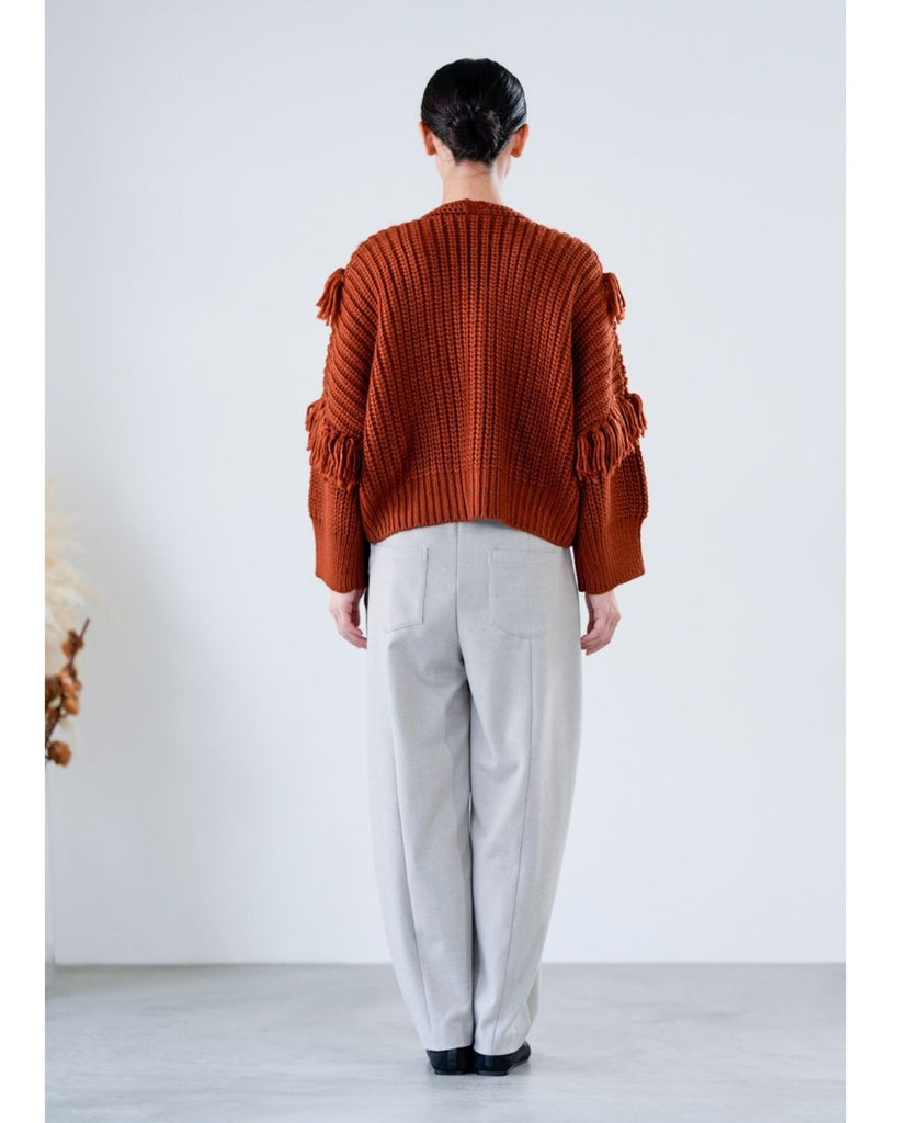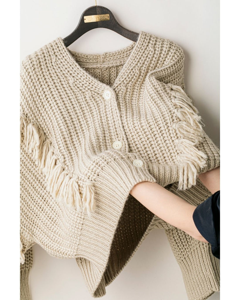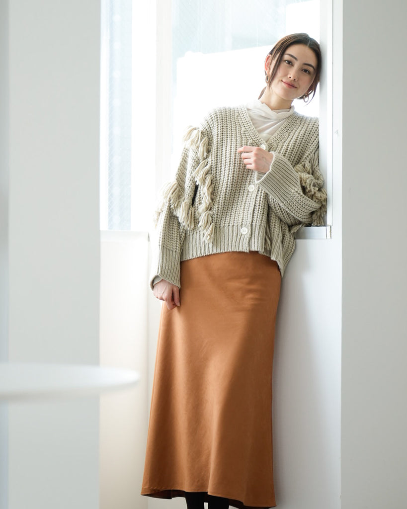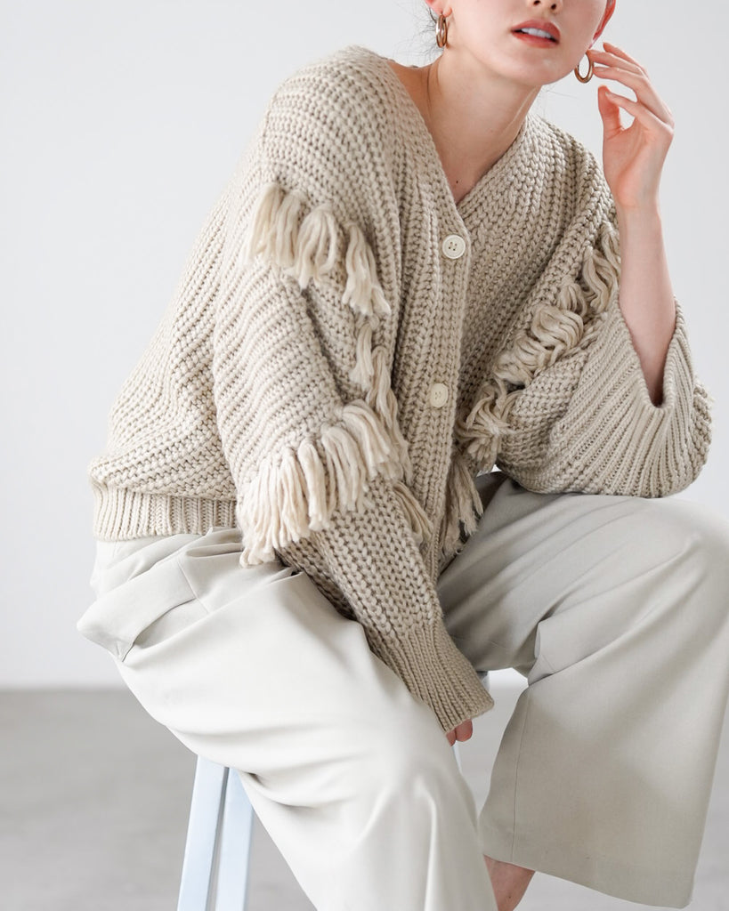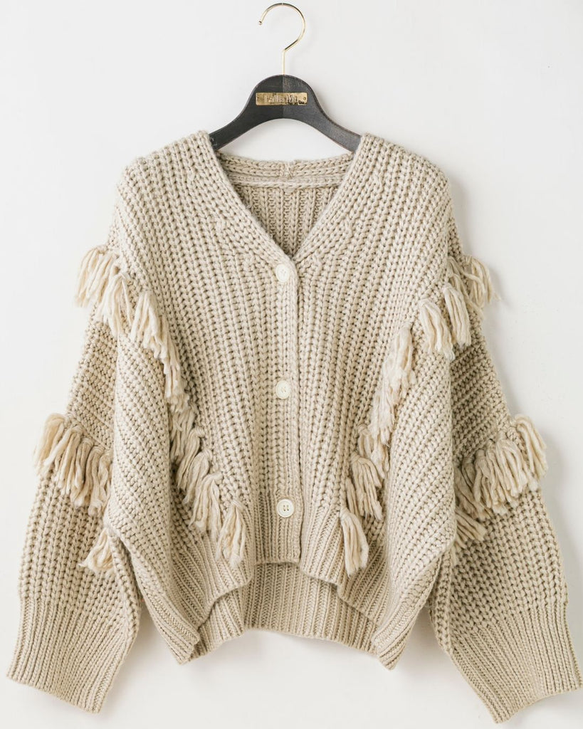 ざっくりと編まれた手編み風の表情と、ショート丈で抜け感あるシルエットが魅力的なニットカーディガン。ふっくらと厚みのある編み地はあたたかみがありながらも軽やかな着心地。素肌にもまとえるほどなめらかな肌触りです。羽織るだけで大人のリラックスした余裕ある表情を演出します。身頃と袖にたっぷりとあしらわれたフリンジは全てハンドワークで仕立てられ、ニットに豊かな表情と温もりをプラス。短い着丈がロングボトムと相性がよく、ワンピースやロングスカート、ワイドパンツなどとの合わせは今年らしいバランスを作ります。ゆったりとしたシルエットはインナーを選ばす、ボリュームニットでも小柄な方も取り入れやすいアイテムです。