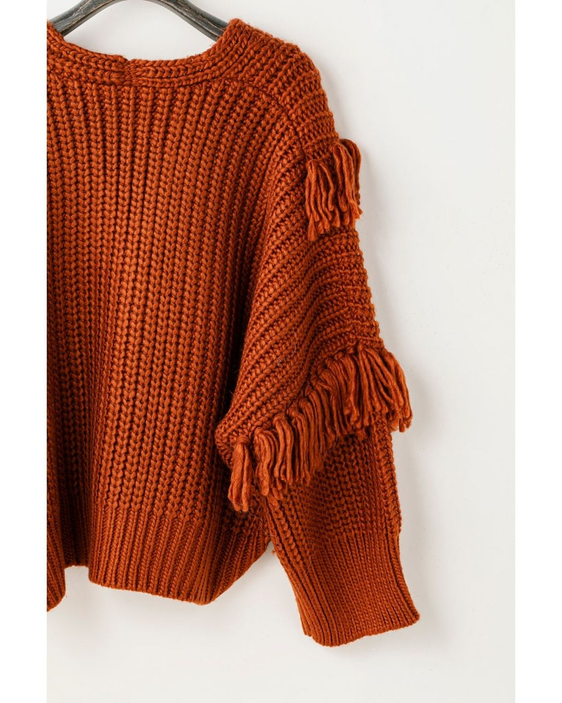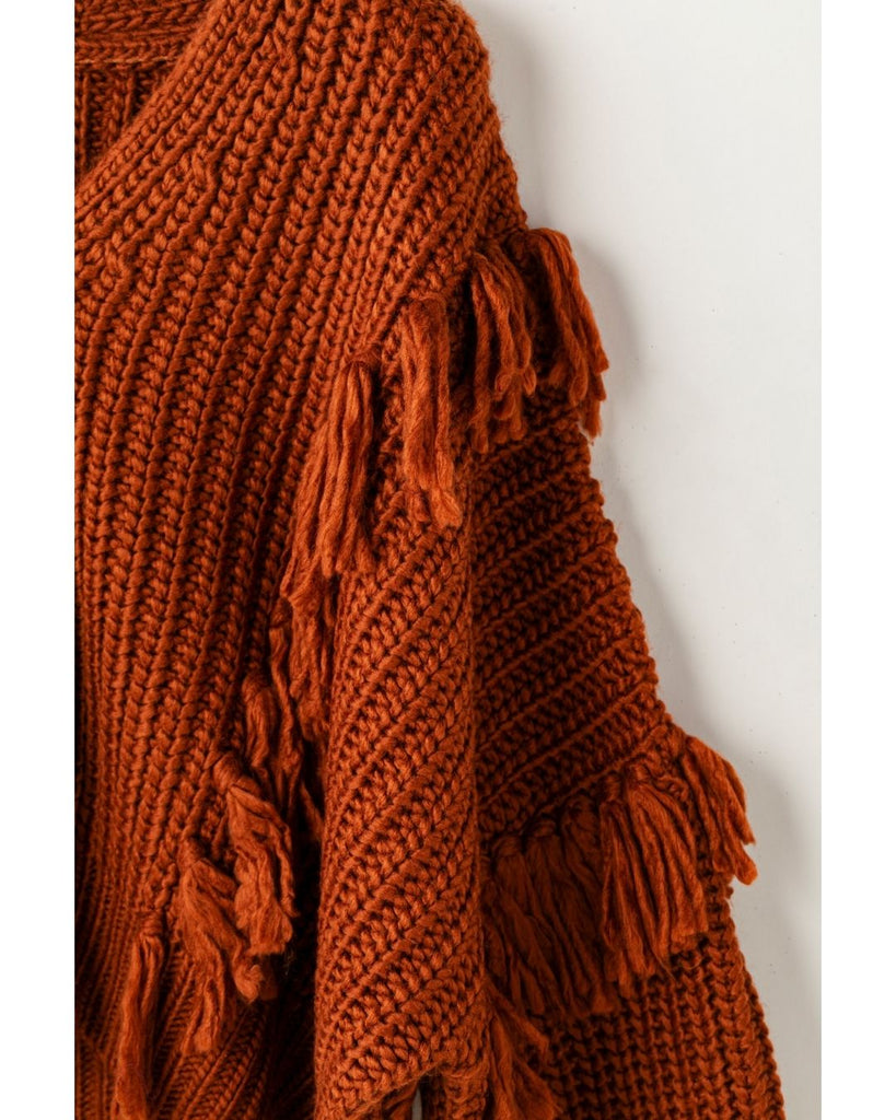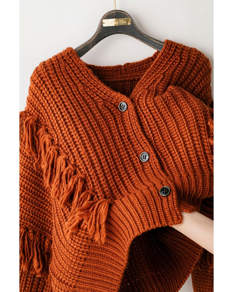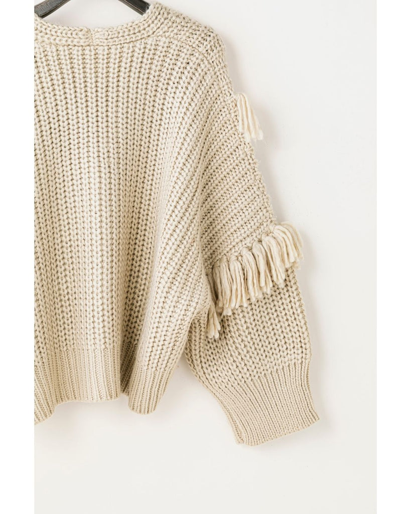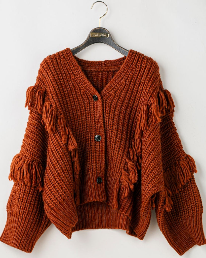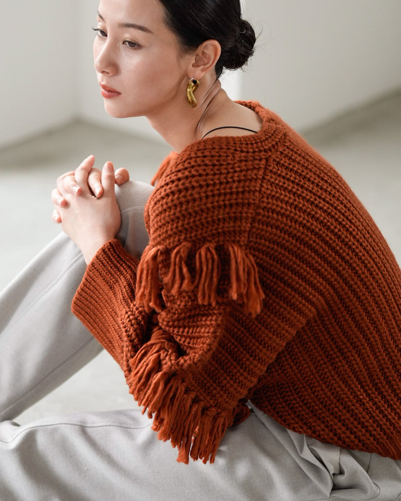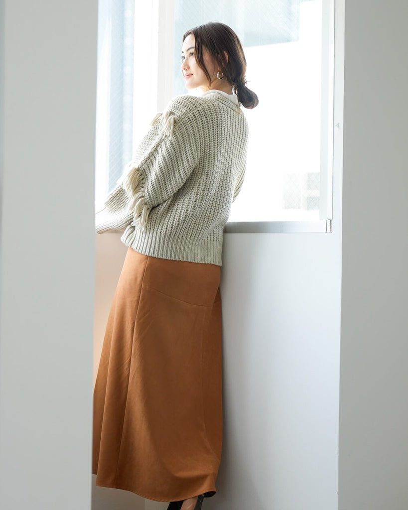 ざっくりと編まれた手編み風の表情と、ショート丈で抜け感あるシルエットが魅力的なニットカーディガン。ふっくらと厚みのある編み地はあたたかみがありながらも軽やかな着心地。素肌にもまとえるほどなめらかな肌触りです。羽織るだけで大人のリラックスした余裕ある表情を演出します。身頃と袖にたっぷりとあしらわれたフリンジは全てハンドワークで仕立てられ、ニットに豊かな表情と温もりをプラス。短い着丈がロングボトムと相性がよく、ワンピースやロングスカート、ワイドパンツなどとの合わせは今年らしいバランスを作ります。ゆったりとしたシルエットはインナーを選ばす、ボリュームニットでも小柄な方も取り入れやすいアイテムです。