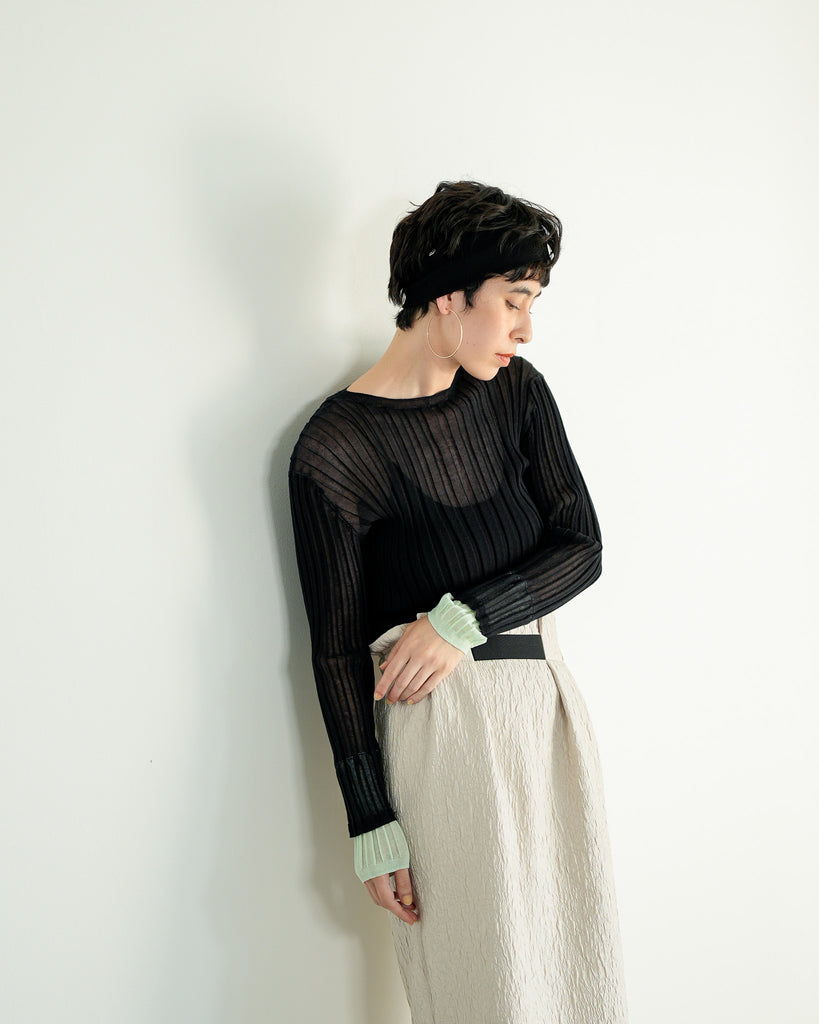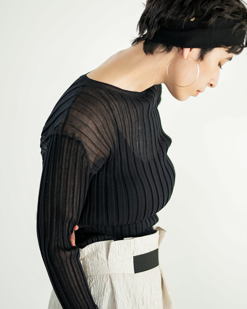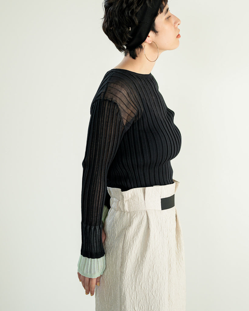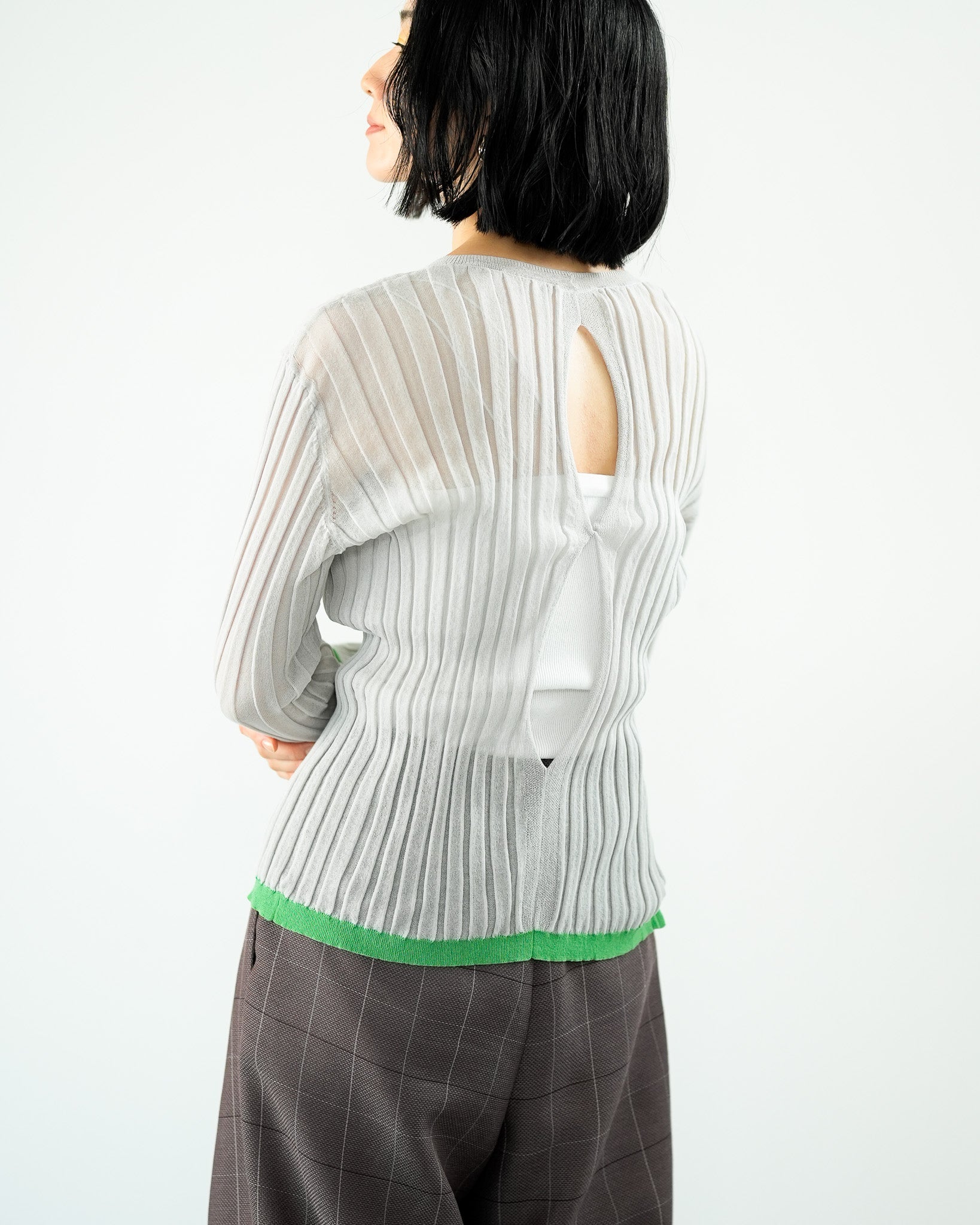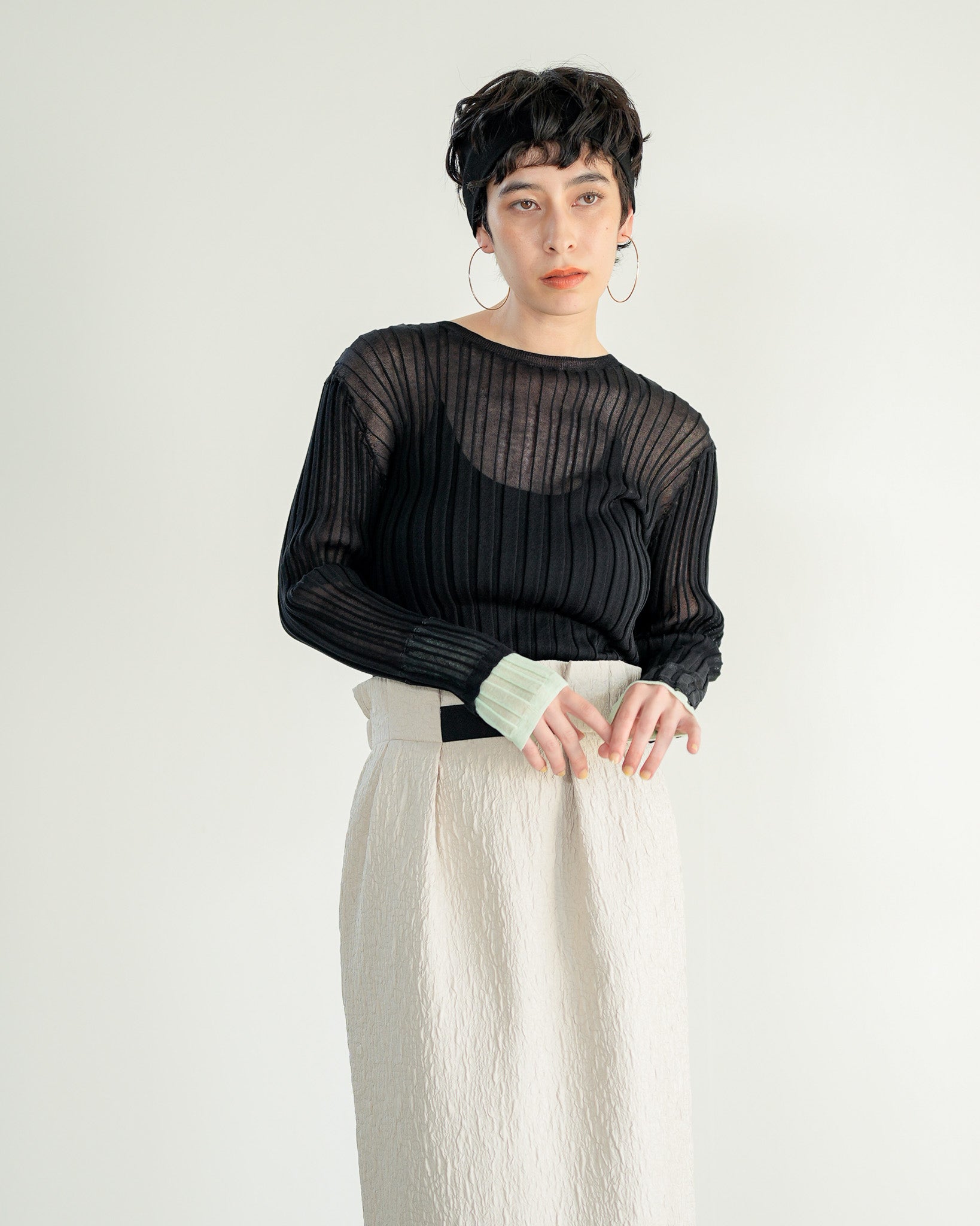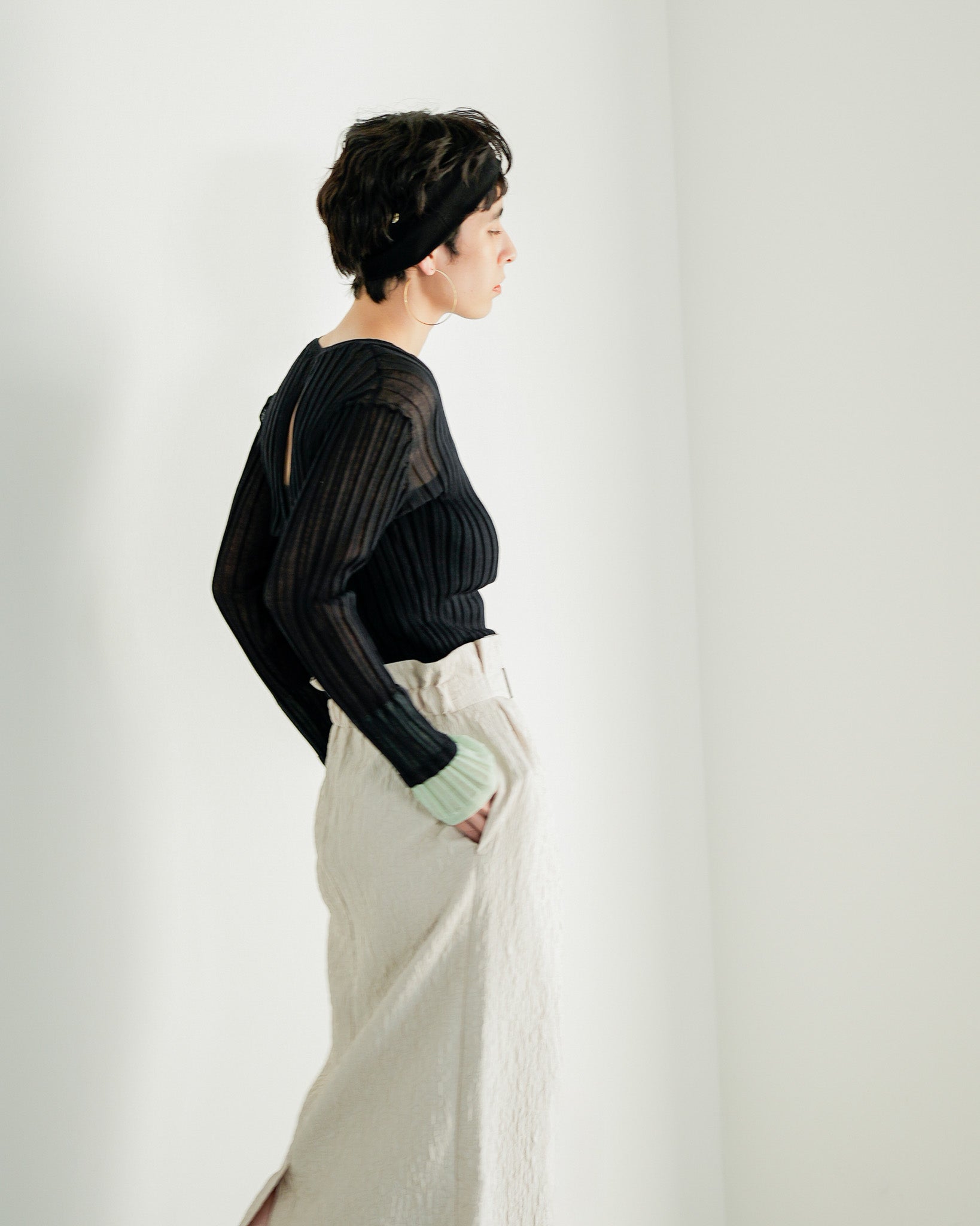 手元が2枚仕立てになったシアーリブニット。甘めに編み立てたリブの程よいシアー感がスタイルに透明感を出し、ミニマムで洗練された印象ながらバックシルエットは大胆にツイストすることでインパクトを。ラリアムーらしいバイカラーがスタイリングのアクセントとなりシンプルながら個性を感じる一枚となっています。アームホールはあえて若干のゆとりを入れることで動きやすさと胸元の張り付きを考慮した設計。バストの張り付きが気になりにくく、腰にはシングルスリットを入れることで自然に腰回りに沿うシルエットを作ります。ジャケットやシャツなどレイヤードスタイルのインナーとしても広く着用いただけます。