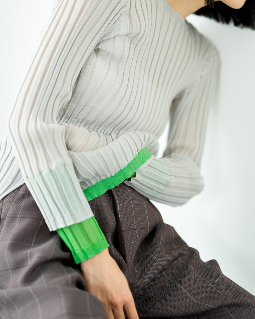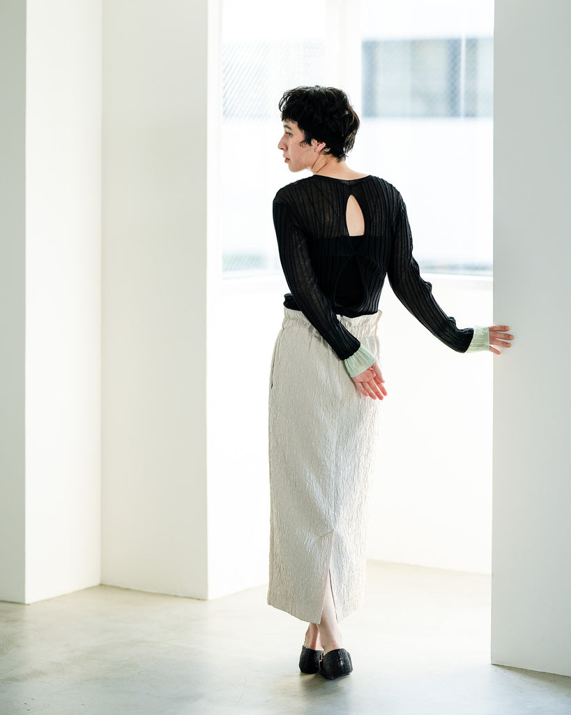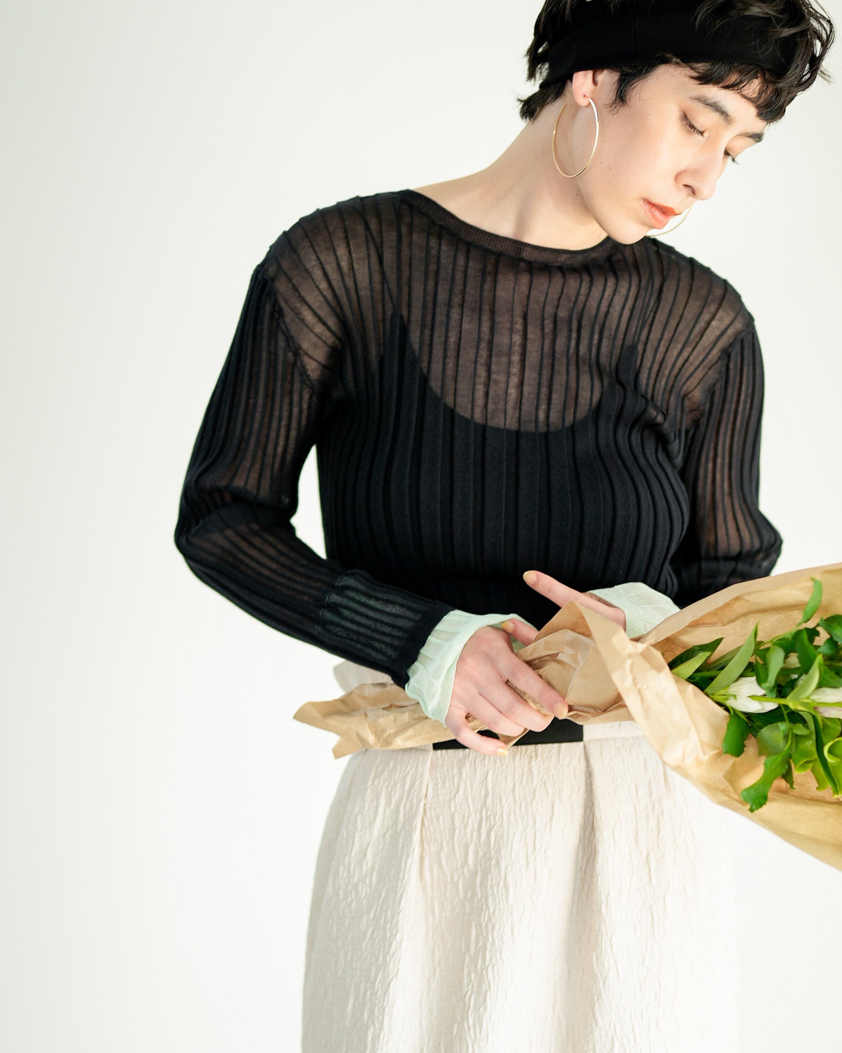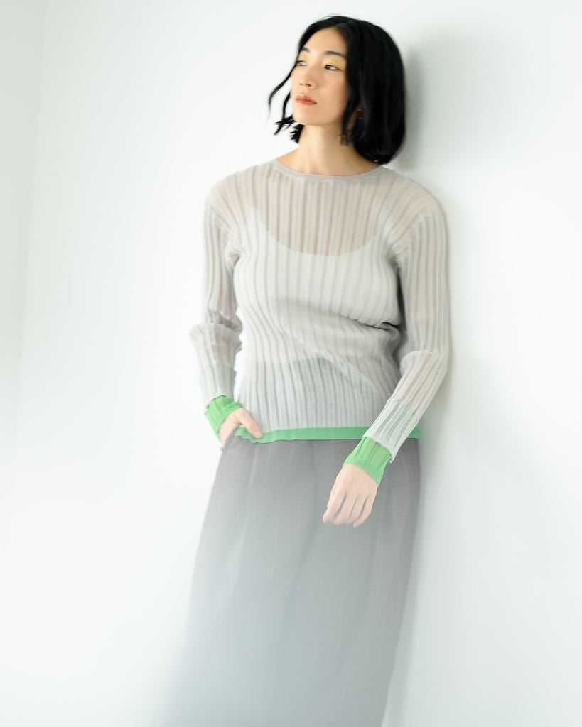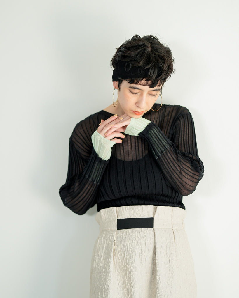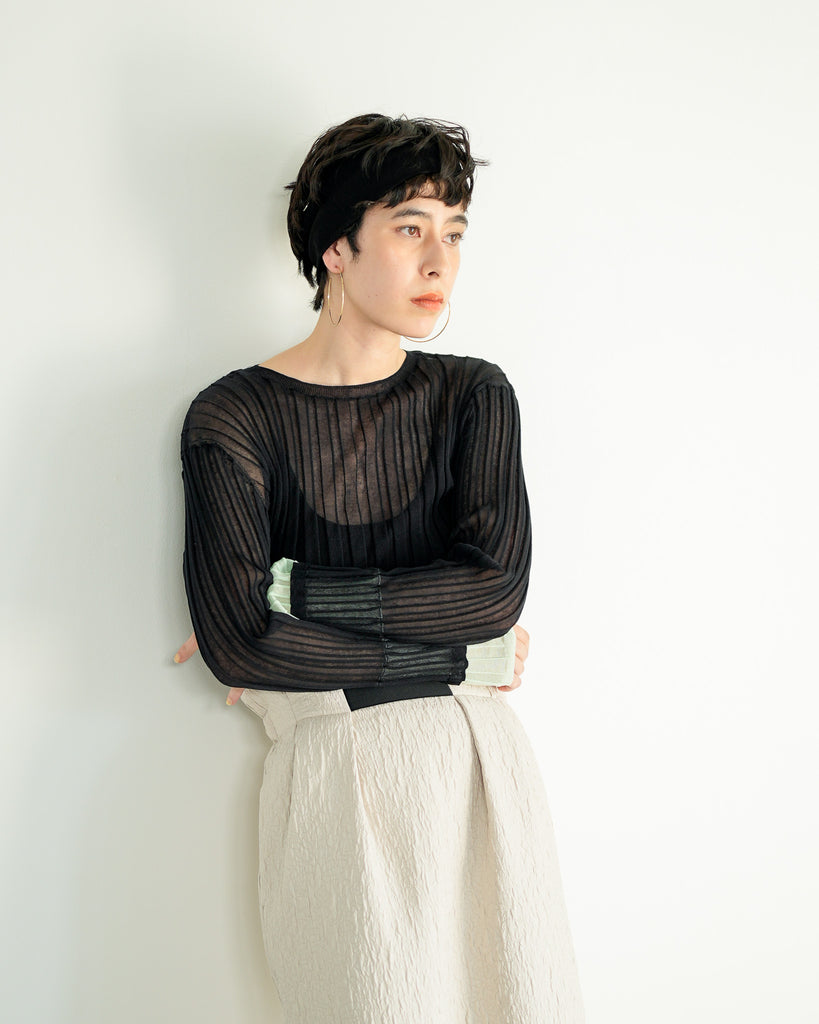 手元が2枚仕立てになったシアーリブニット。甘めに編み立てたリブの程よいシアー感がスタイルに透明感を出し、ミニマムで洗練された印象ながらバックシルエットは大胆にツイストすることでインパクトを。ラリアムーらしいバイカラーがスタイリングのアクセントとなりシンプルながら個性を感じる一枚となっています。アームホールはあえて若干のゆとりを入れることで動きやすさと胸元の張り付きを考慮した設計。バストの張り付きが気になりにくく、腰にはシングルスリットを入れることで自然に腰回りに沿うシルエットを作ります。ジャケットやシャツなどレイヤードスタイルのインナーとしても広く着用いただけます。