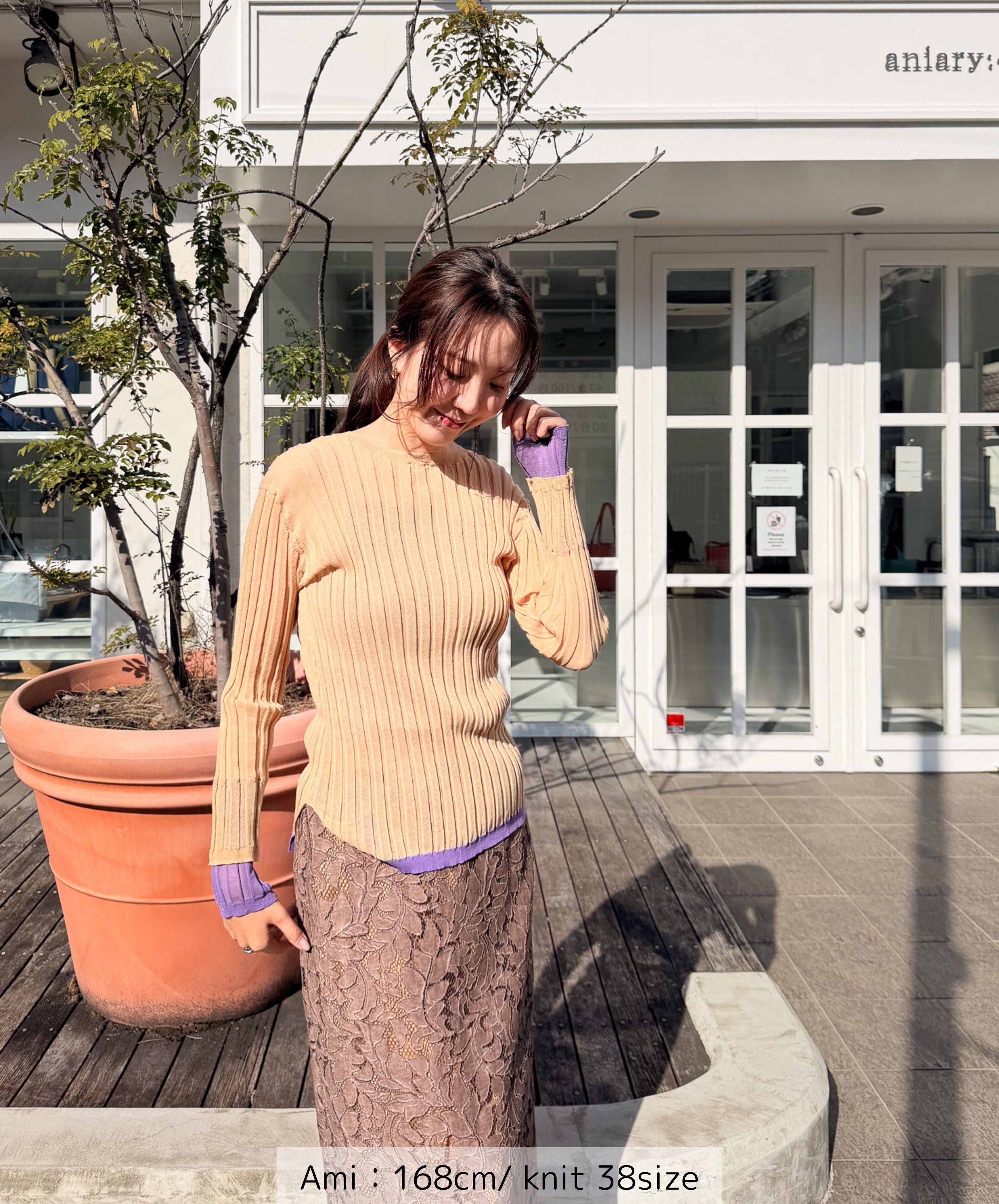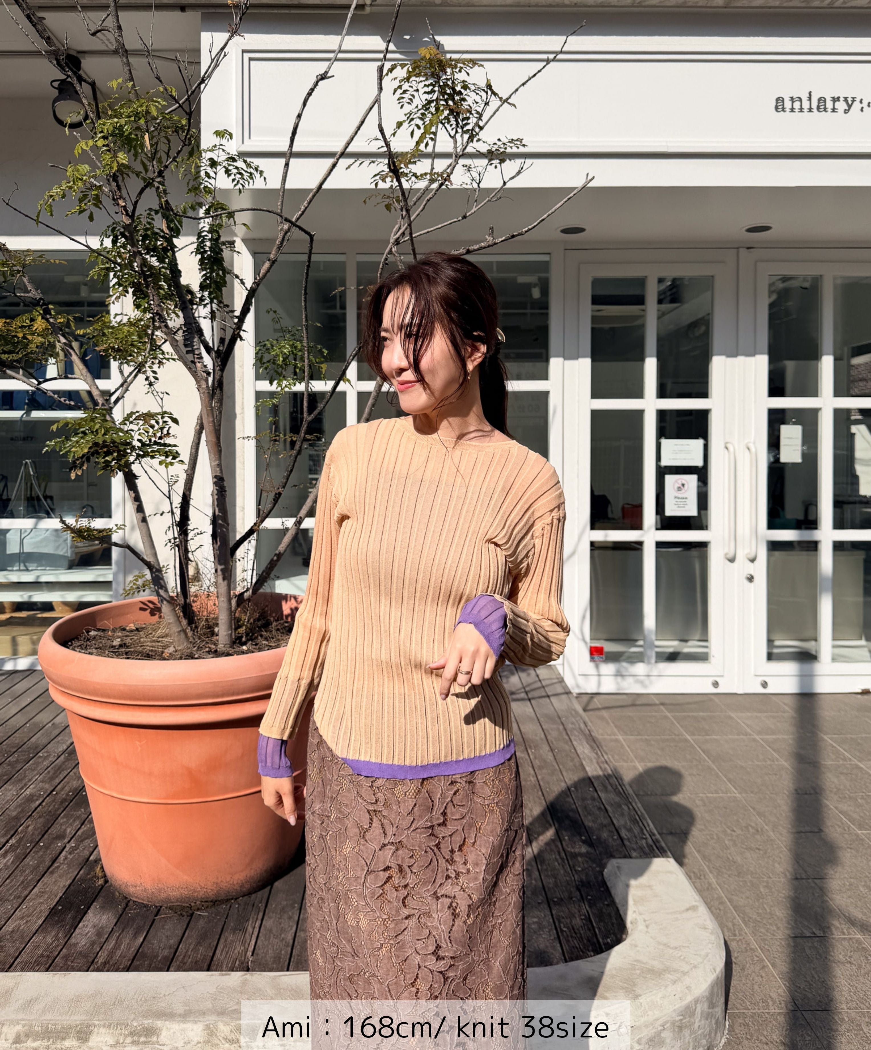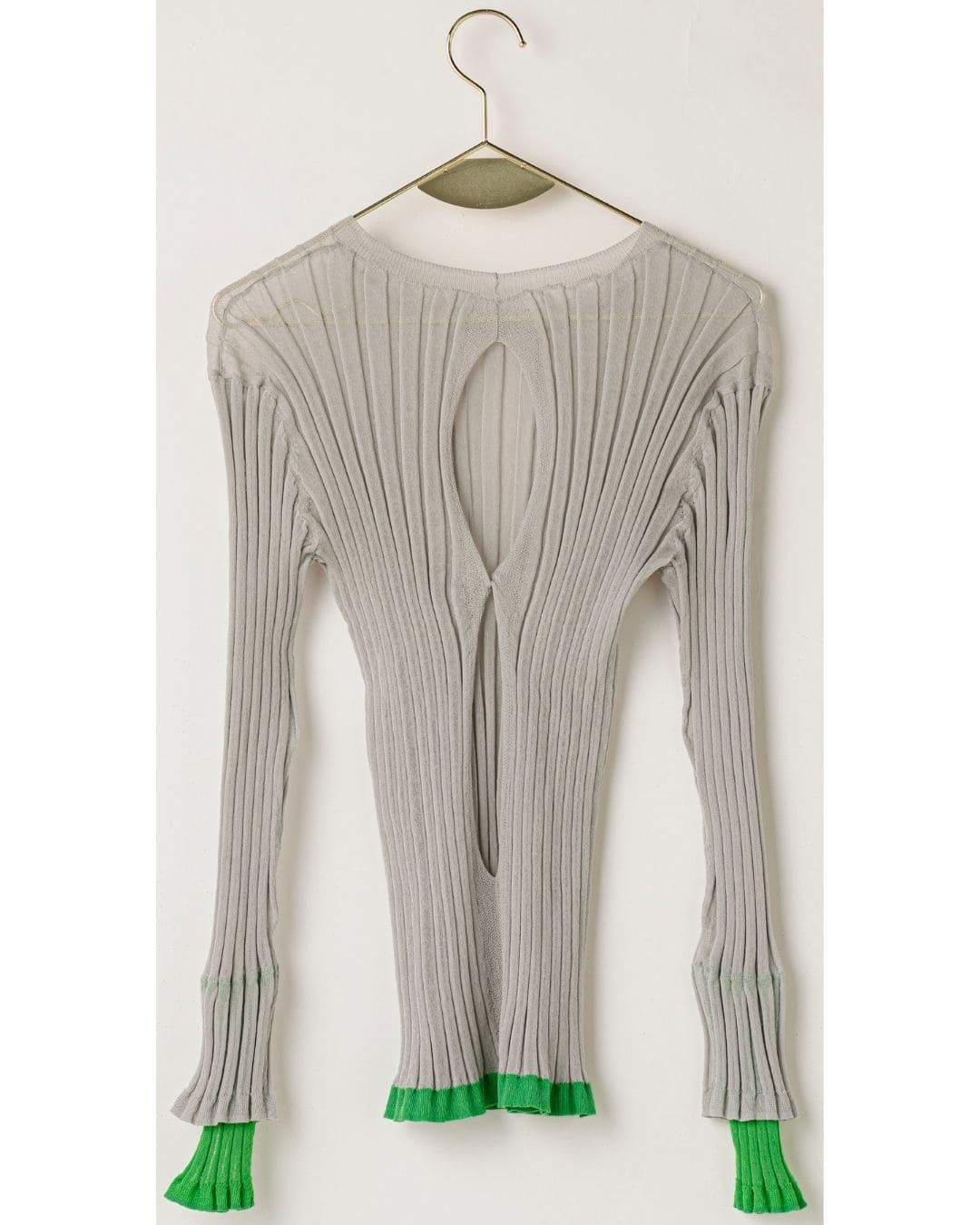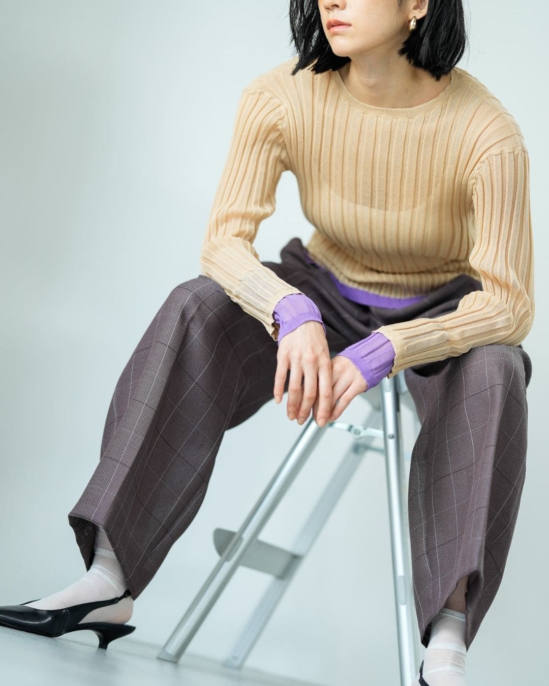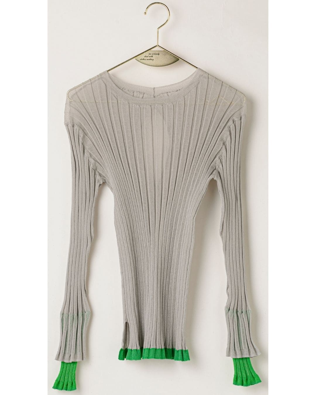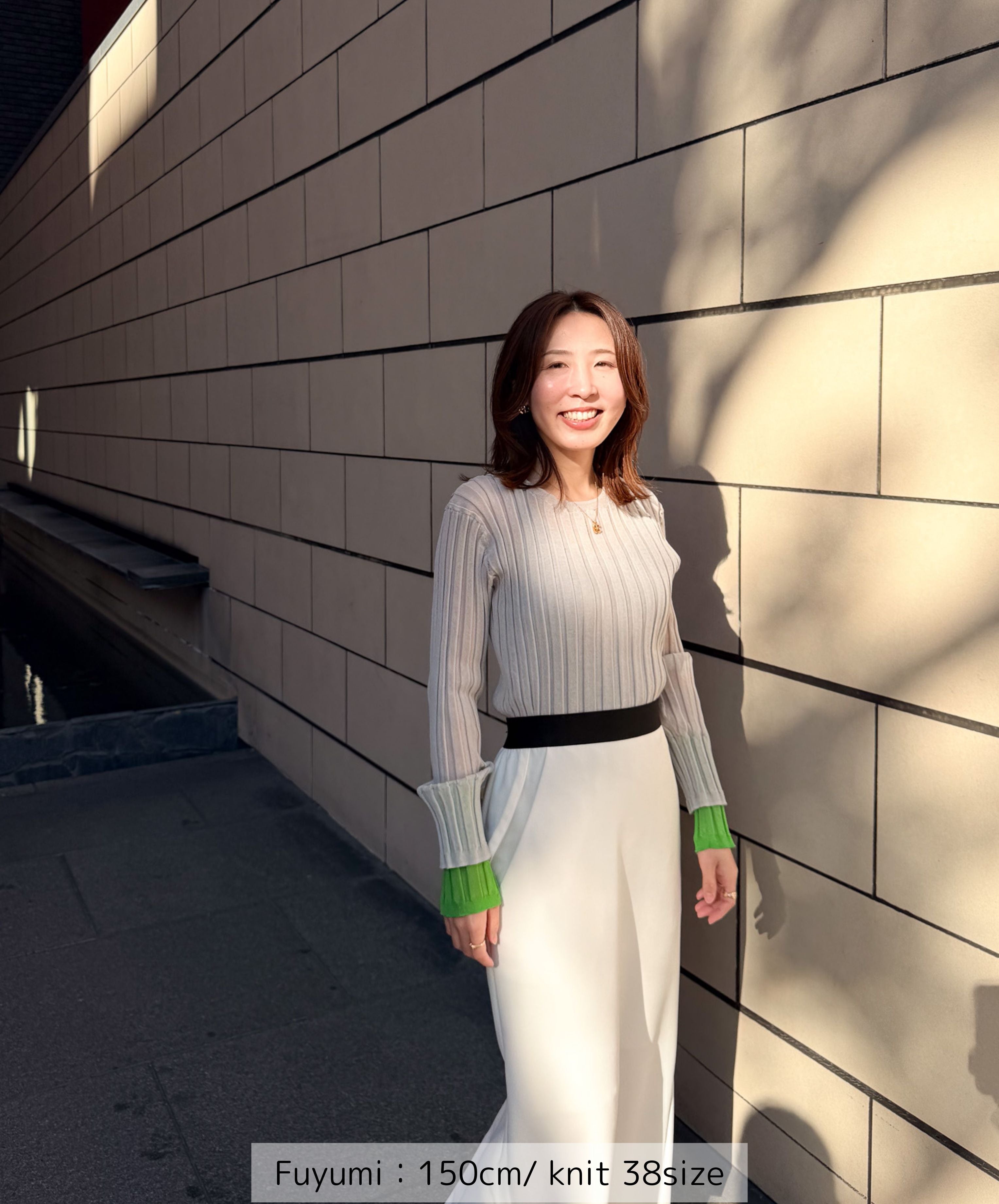 手元が2枚仕立てになったシアーリブニット。甘めに編み立てたリブの程よいシアー感がスタイルに透明感を出し、ミニマムで洗練された印象ながらバックシルエットは大胆にツイストすることでインパクトを。ラリアムーらしいバイカラーがスタイリングのアクセントとなりシンプルながら個性を感じる一枚となっています。アームホールはあえて若干のゆとりを入れることで動きやすさと胸元の張り付きを考慮した設計。バストの張り付きが気になりにくく、腰にはシングルスリットを入れることで自然に腰回りに沿うシルエットを作ります。ジャケットやシャツなどレイヤードスタイルのインナーとしても広く着用いただけます。