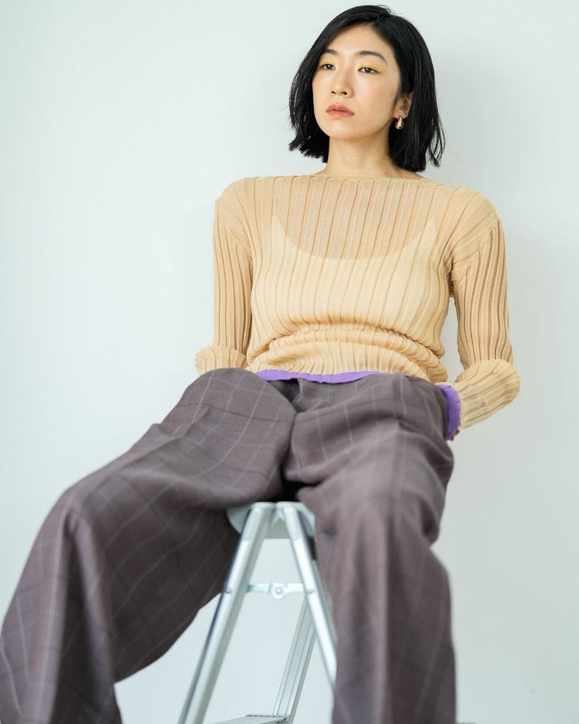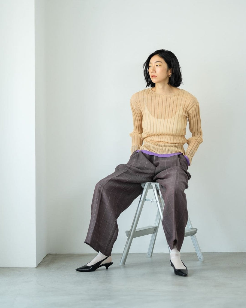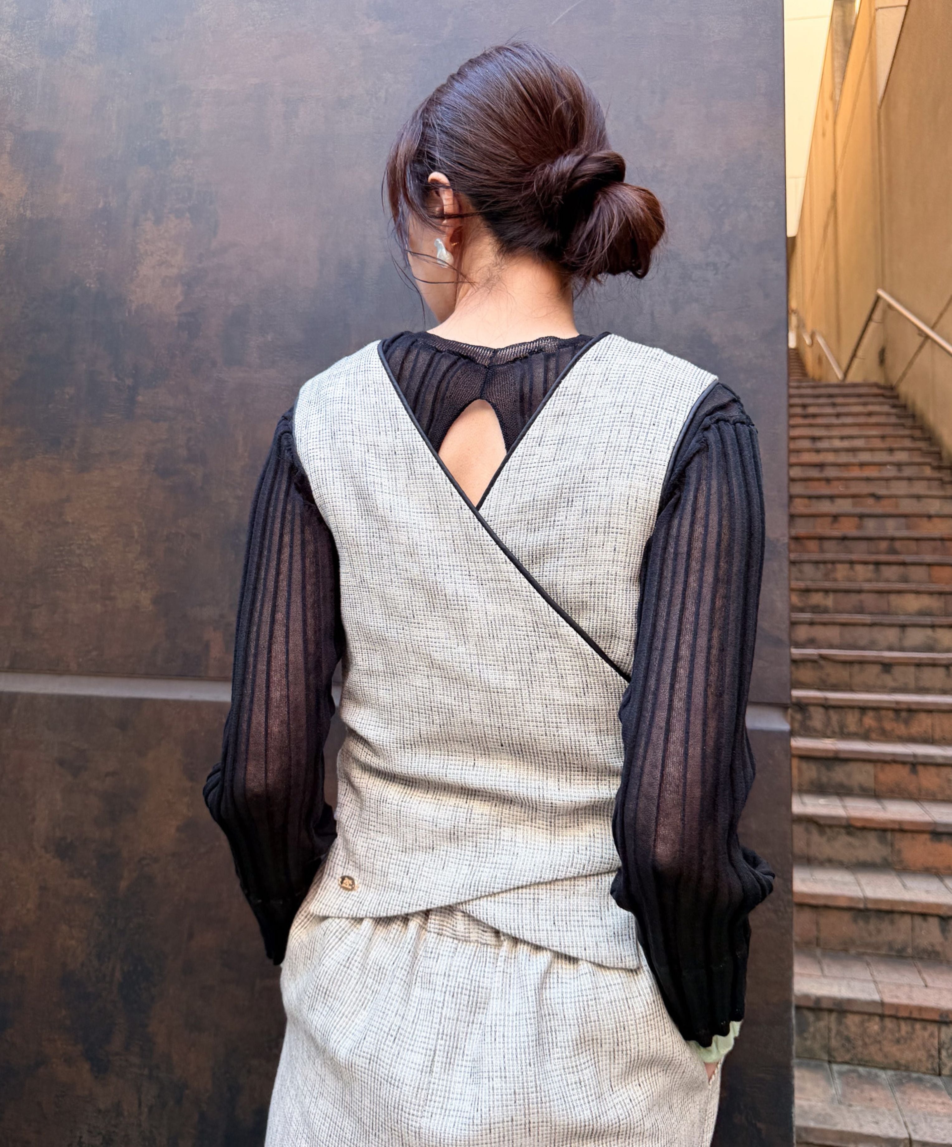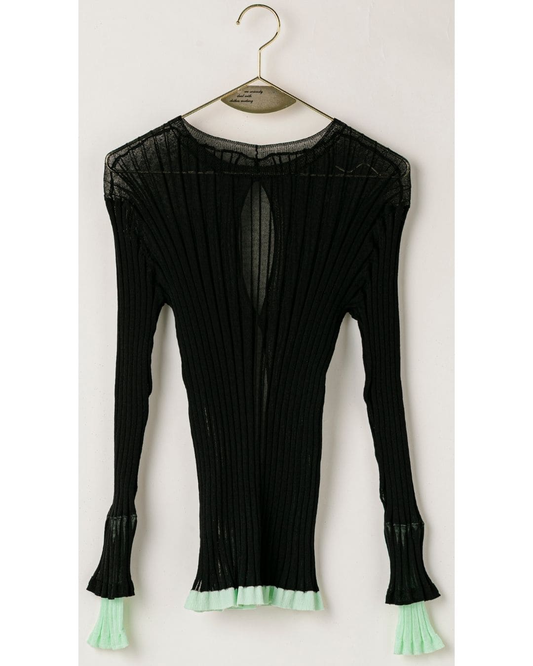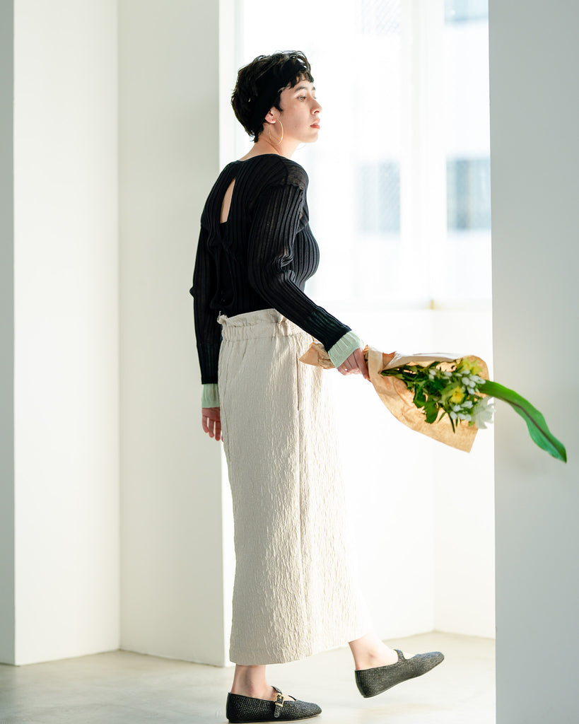 手元が2枚仕立てになったシアーリブニット。甘めに編み立てたリブの程よいシアー感がスタイルに透明感を出し、ミニマムで洗練された印象ながらバックシルエットは大胆にツイストすることでインパクトを。ラリアムーらしいバイカラーがスタイリングのアクセントとなりシンプルながら個性を感じる一枚となっています。アームホールはあえて若干のゆとりを入れることで動きやすさと胸元の張り付きを考慮した設計。バストの張り付きが気になりにくく、腰にはシングルスリットを入れることで自然に腰回りに沿うシルエットを作ります。ジャケットやシャツなどレイヤードスタイルのインナーとしても広く着用いただけます。