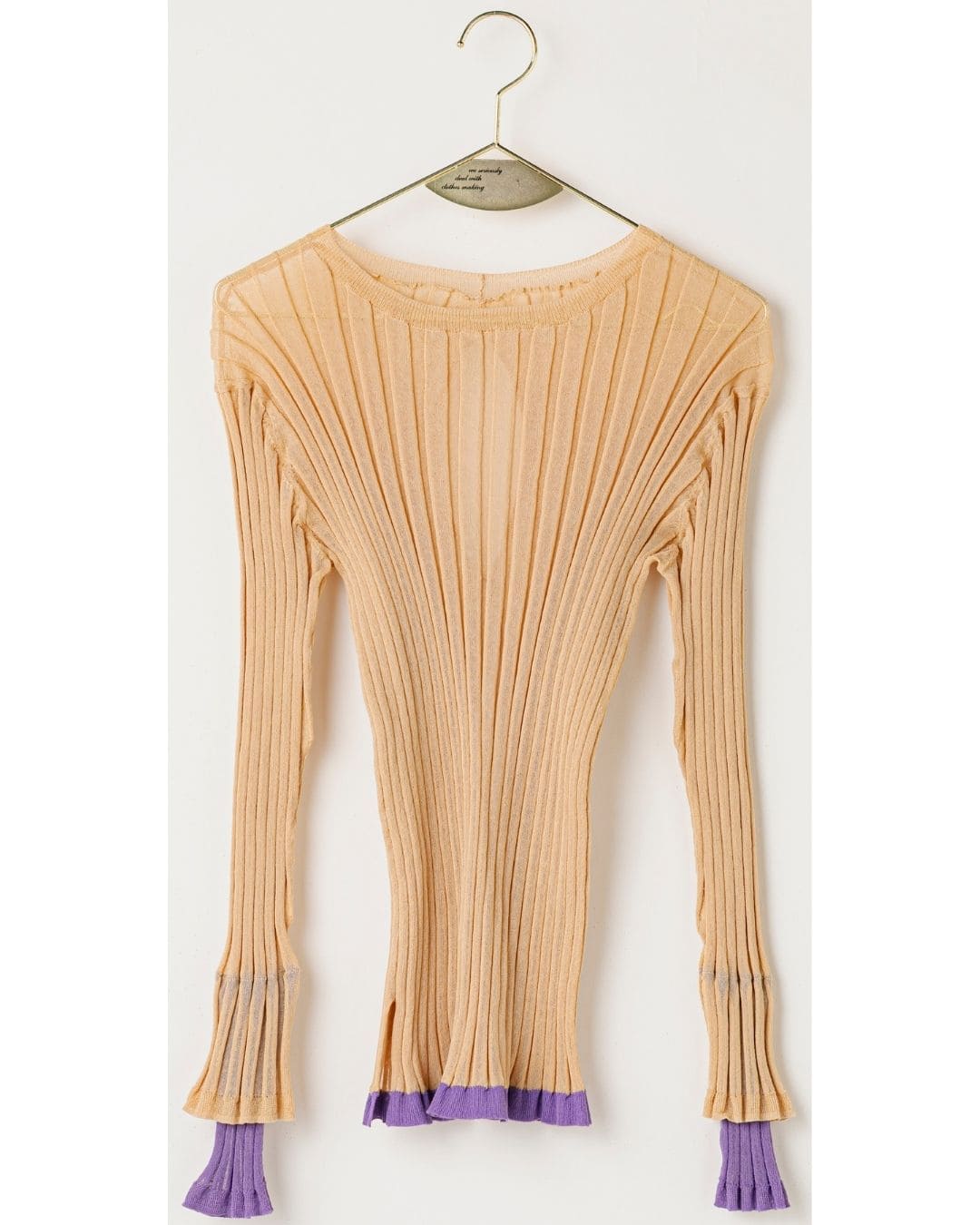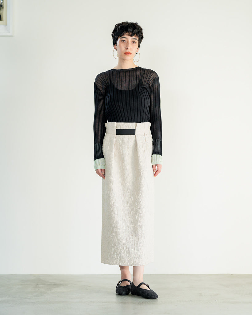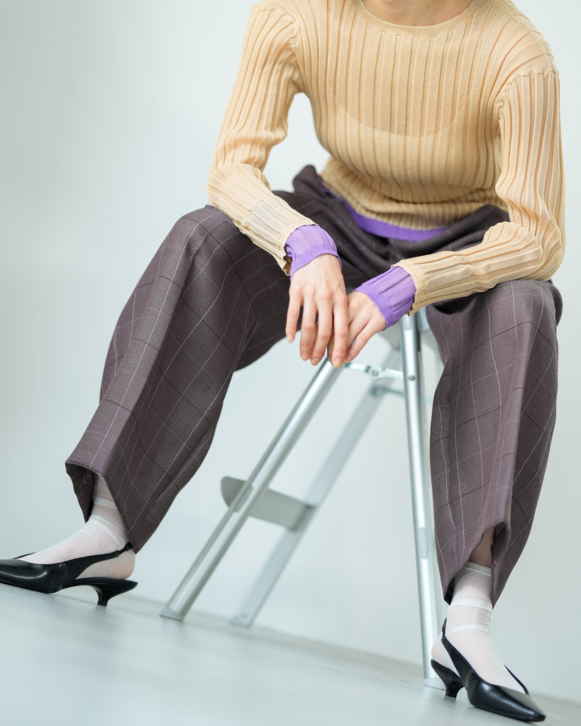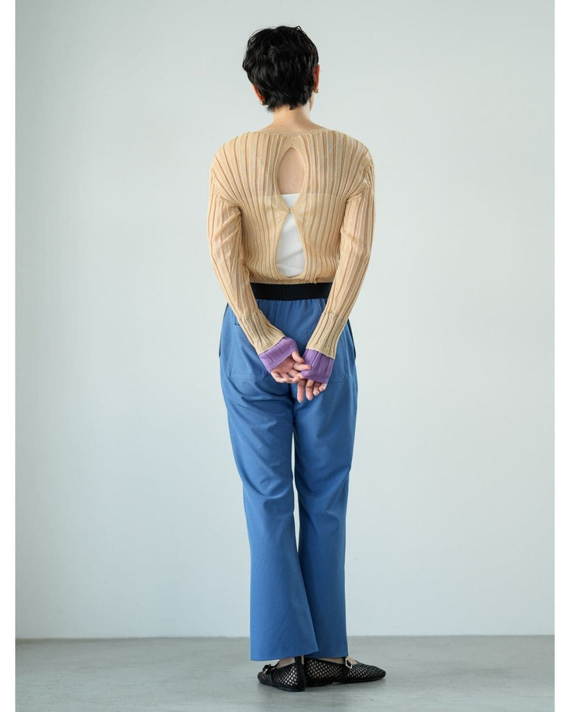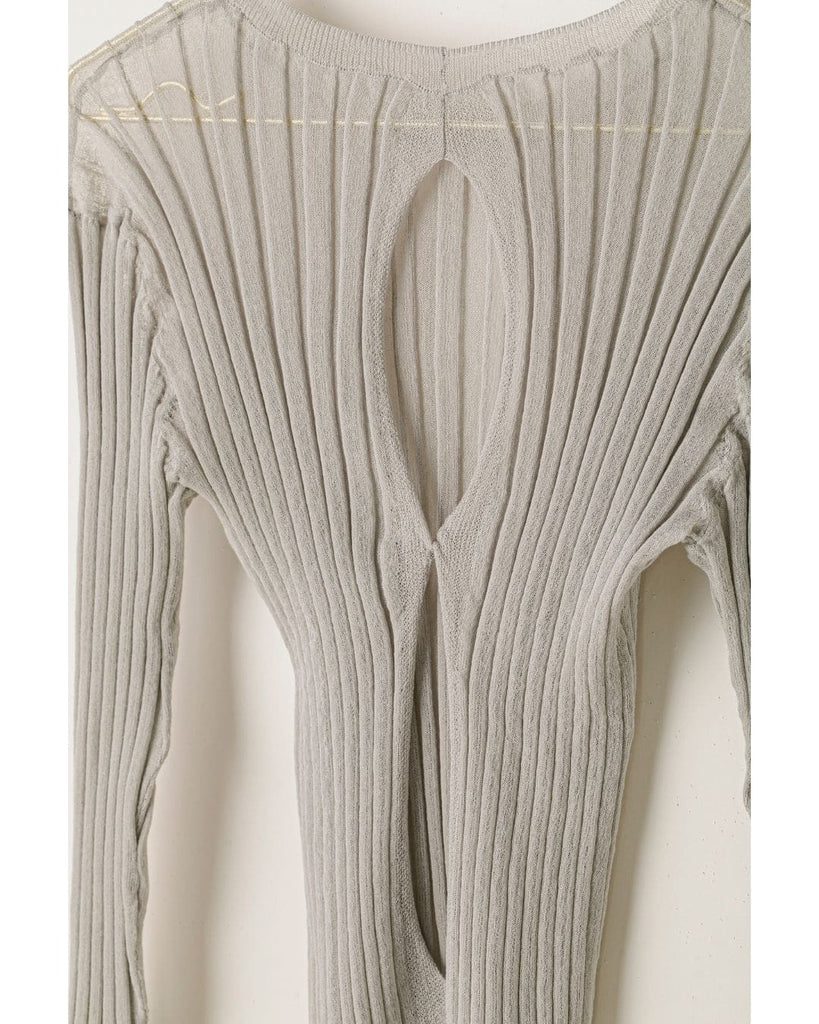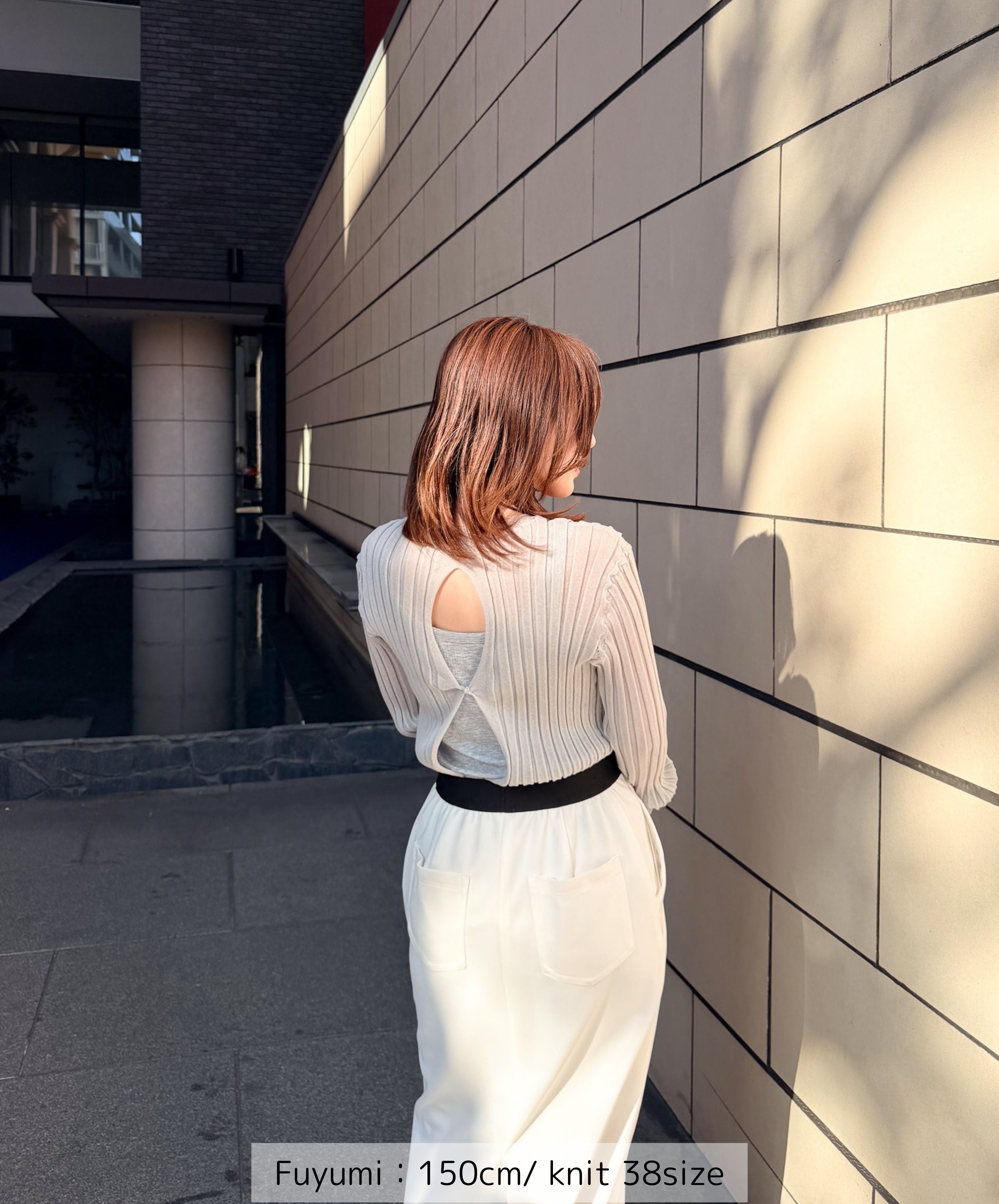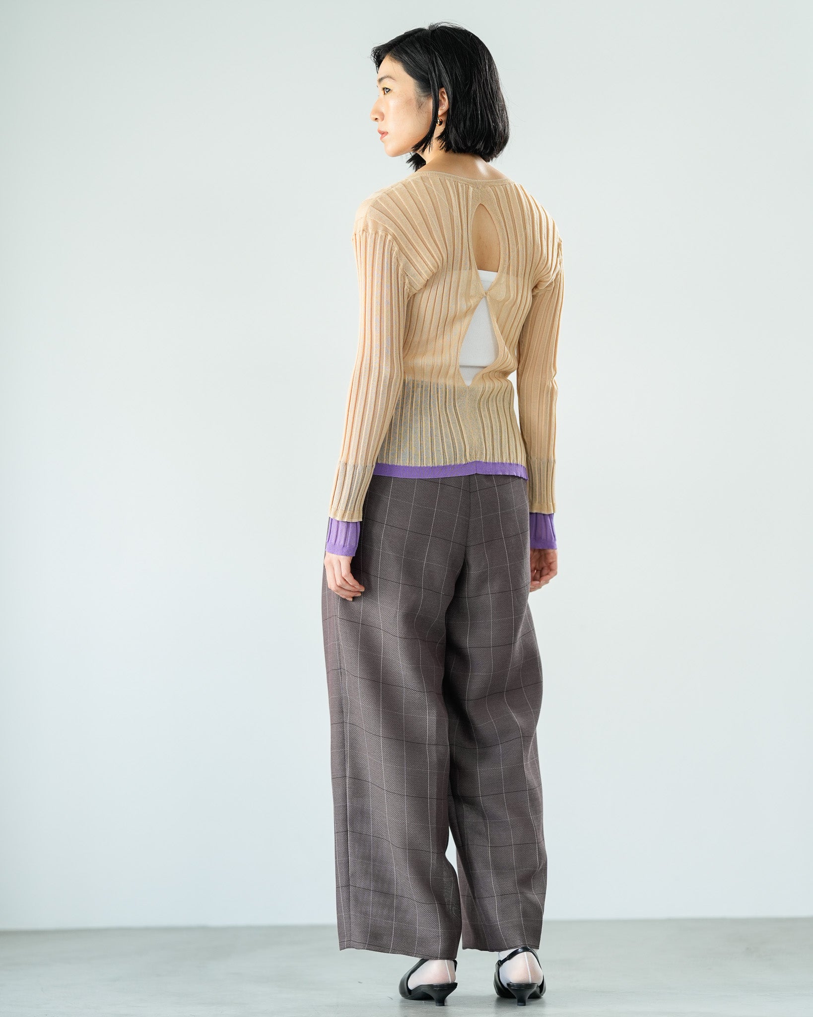 手元が2枚仕立てになったシアーリブニット。甘めに編み立てたリブの程よいシアー感がスタイルに透明感を出し、ミニマムで洗練された印象ながらバックシルエットは大胆にツイストすることでインパクトを。ラリアムーらしいバイカラーがスタイリングのアクセントとなりシンプルながら個性を感じる一枚となっています。アームホールはあえて若干のゆとりを入れることで動きやすさと胸元の張り付きを考慮した設計。バストの張り付きが気になりにくく、腰にはシングルスリットを入れることで自然に腰回りに沿うシルエットを作ります。ジャケットやシャツなどレイヤードスタイルのインナーとしても広く着用いただけます。