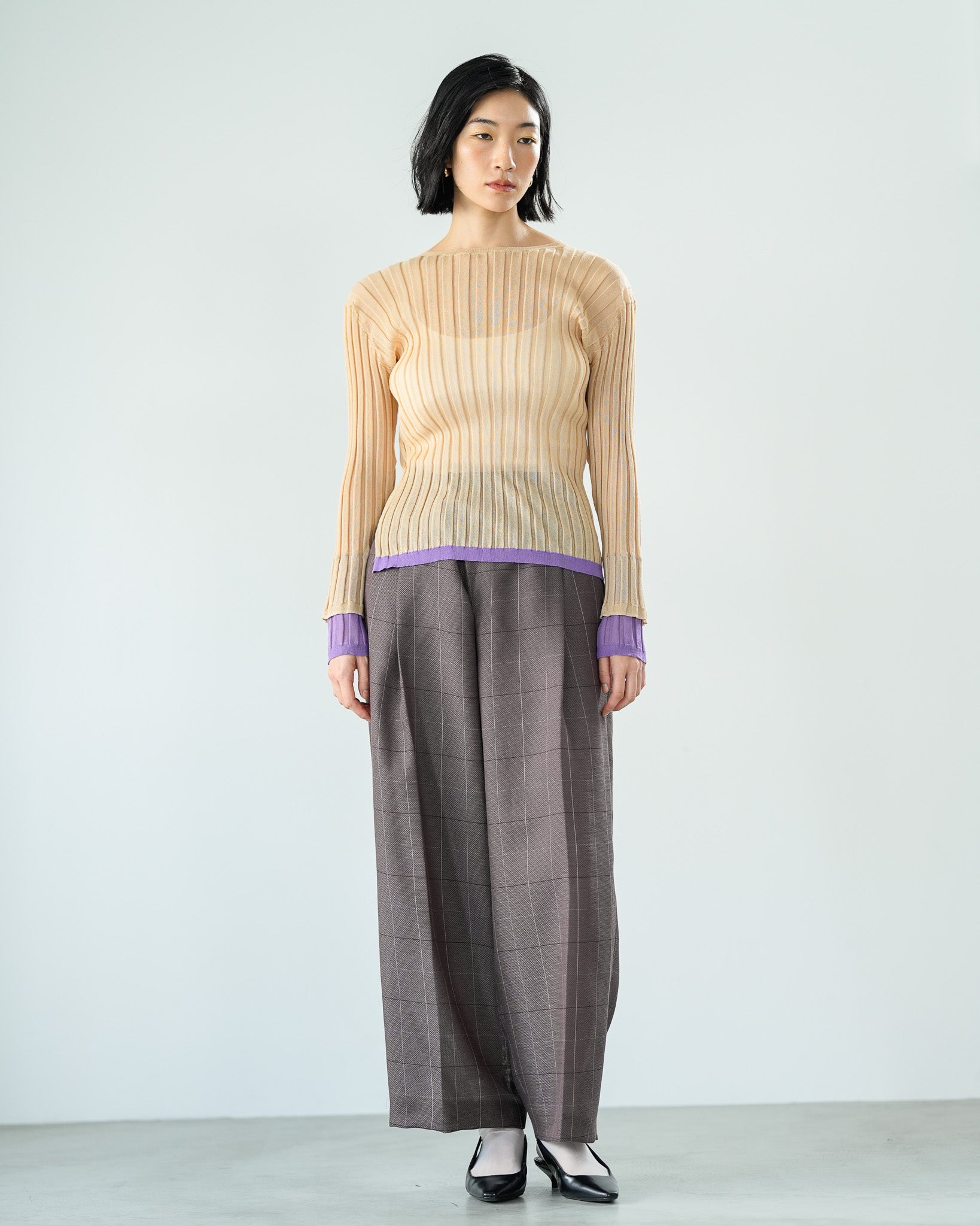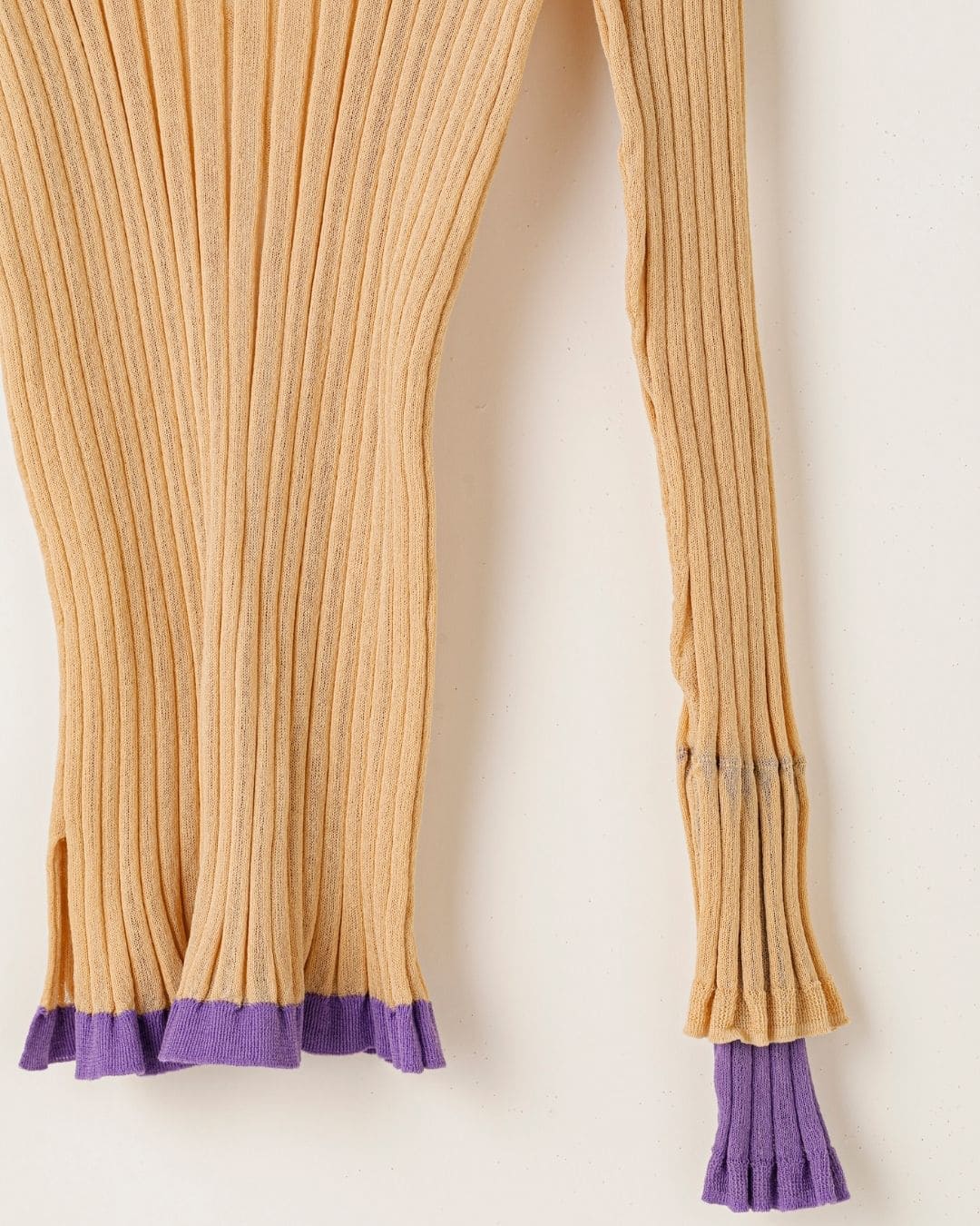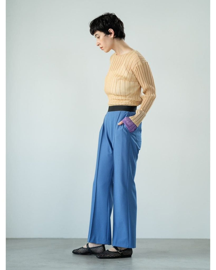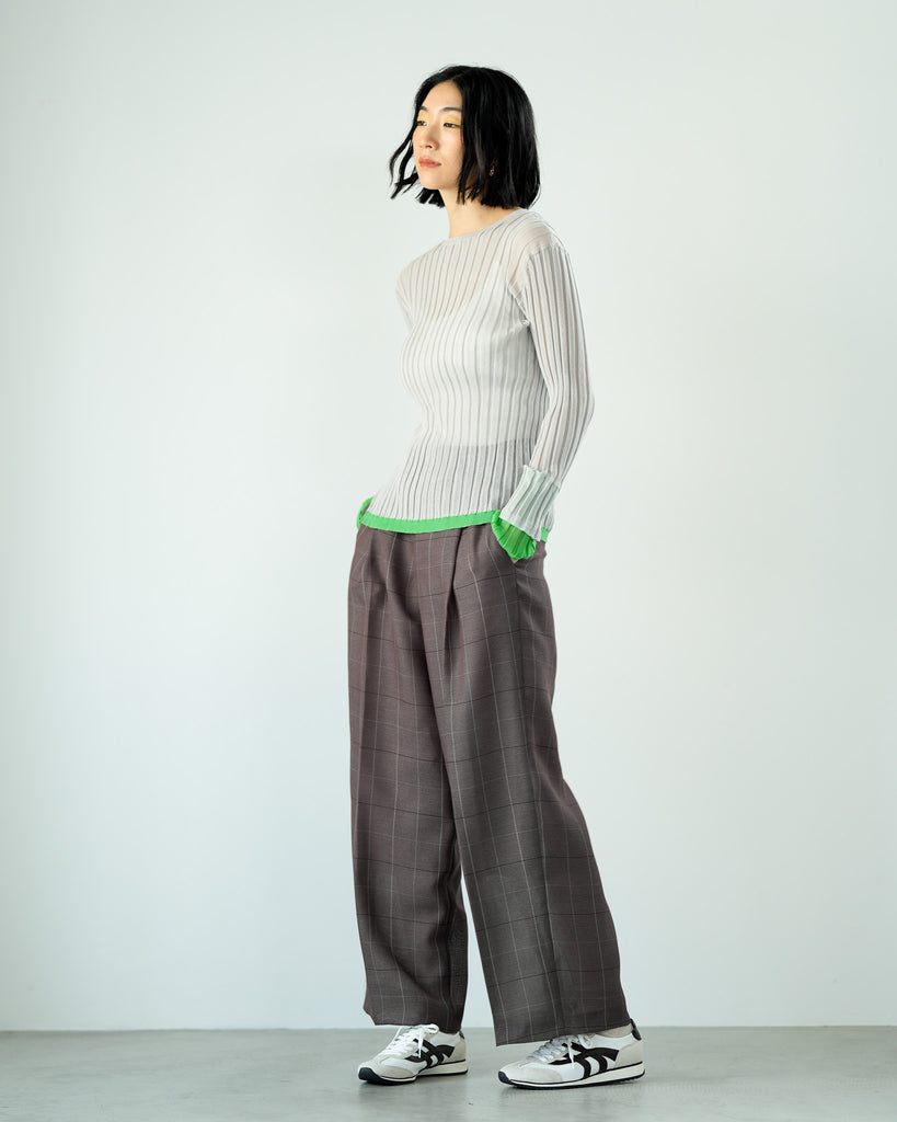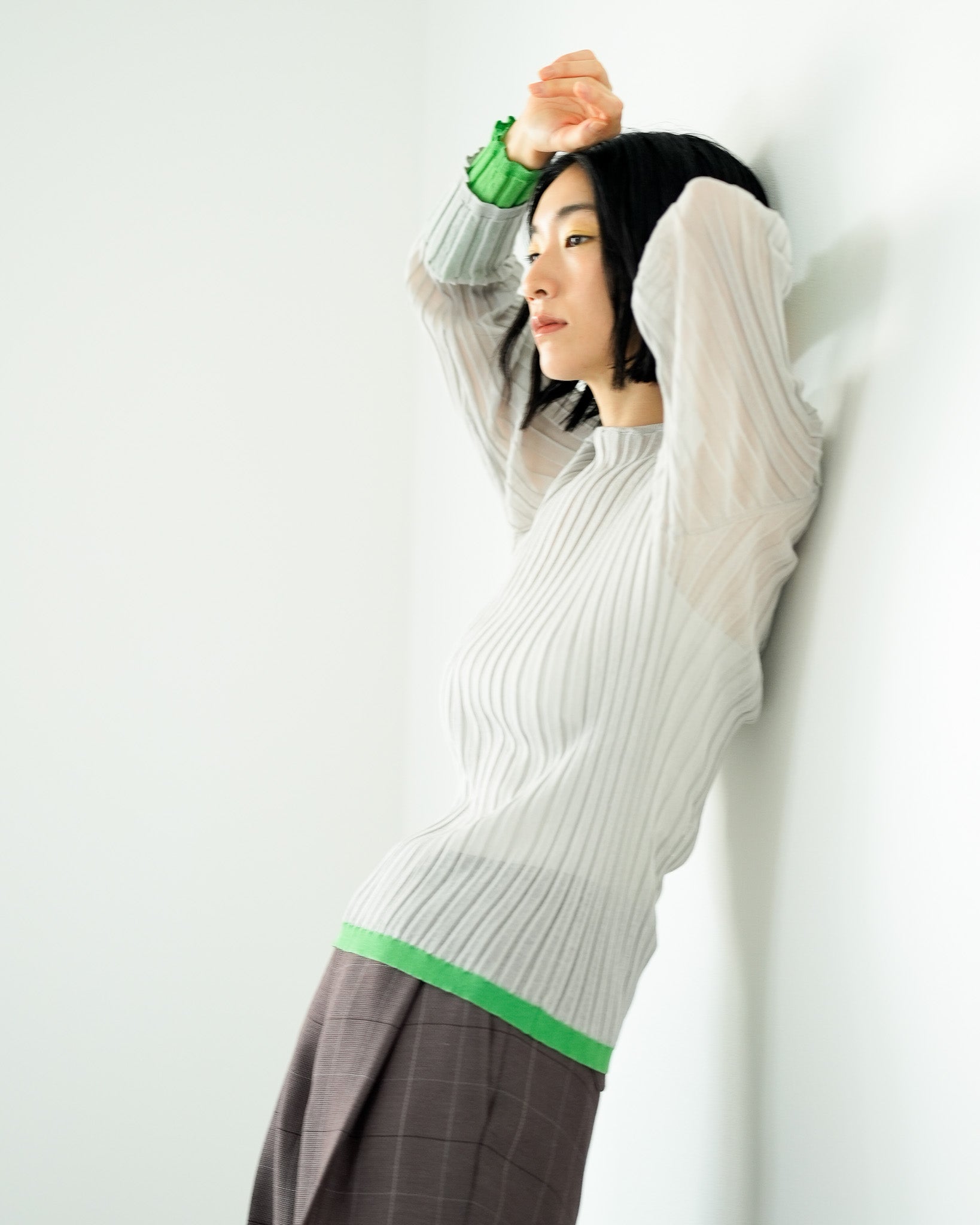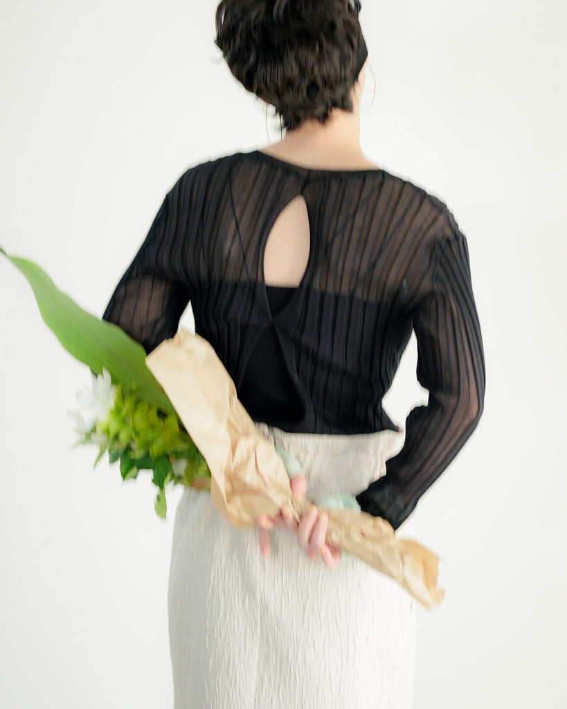 手元が2枚仕立てになったシアーリブニット。甘めに編み立てたリブの程よいシアー感がスタイルに透明感を出し、ミニマムで洗練された印象ながらバックシルエットは大胆にツイストすることでインパクトを。ラリアムーらしいバイカラーがスタイリングのアクセントとなりシンプルながら個性を感じる一枚となっています。アームホールはあえて若干のゆとりを入れることで動きやすさと胸元の張り付きを考慮した設計。バストの張り付きが気になりにくく、腰にはシングルスリットを入れることで自然に腰回りに沿うシルエットを作ります。ジャケットやシャツなどレイヤードスタイルのインナーとしても広く着用いただけます。