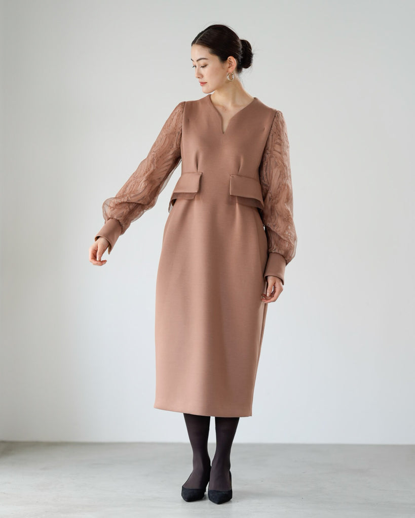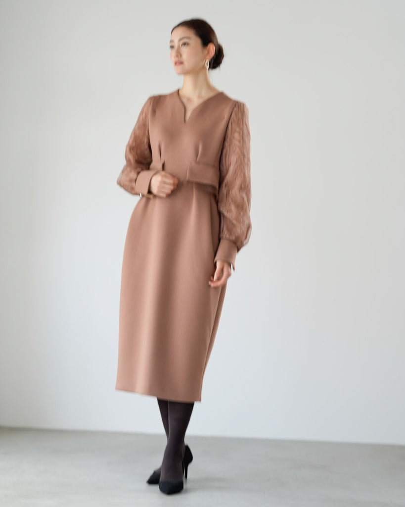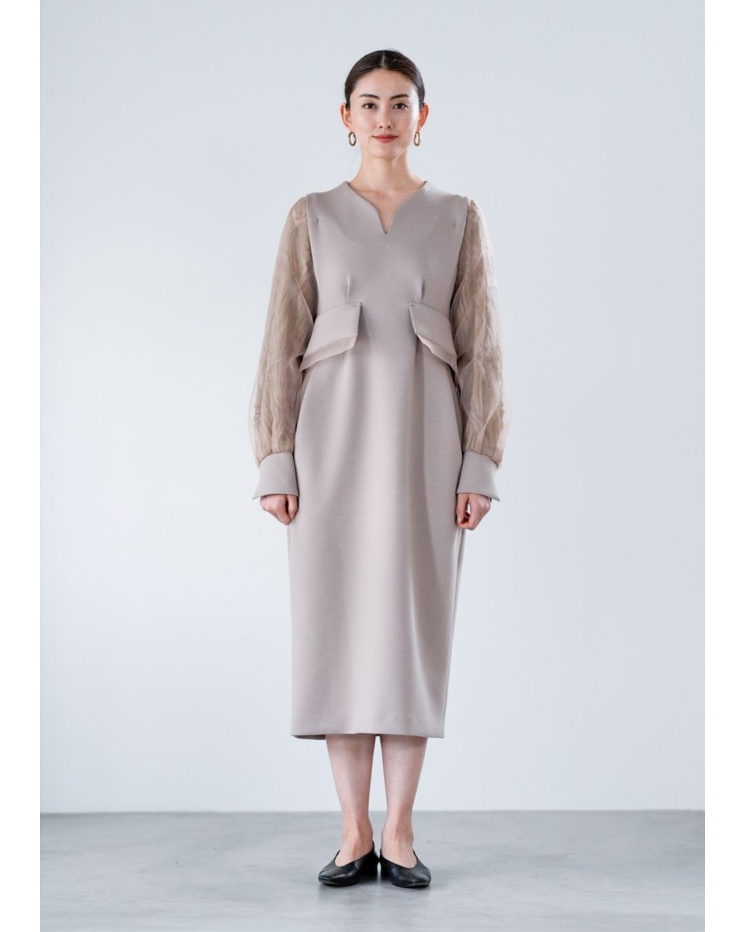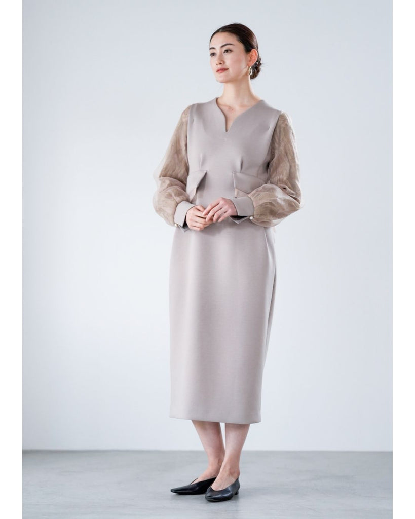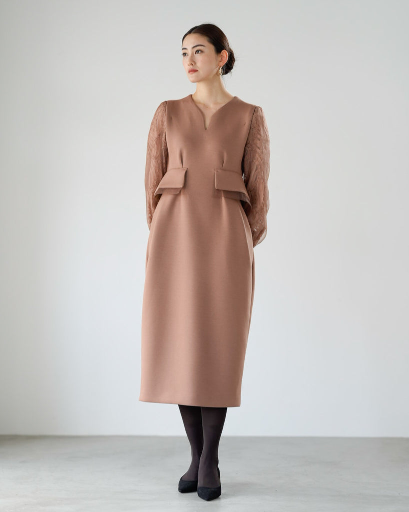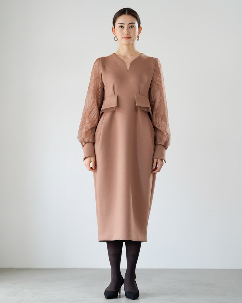 気品と快適さを両立するワンピース。ストレッチ製に優れた中肉のポンチ素材を使用し、しなやかながらもしっかりと厚みがある素材感で身体のラインを拾いすぎず立体的な美しいシルエットを保ちます。着心地も軽く、長時間の着用でもストレスフリー。ヒップにゆとりのあるコクーンラインを採用し、ウエストにはインパクトのあるフラップをつけることでさりげない体型カバー効果も。こだわりのネックラインはデコルテを美しく魅せる曲線的なVライン。顔まわりをすっきりと見せながら、女性らしい柔らかな印象を作ります。一枚で存在感をかもすデザインで食事会や懇親会など日常のイベントから結婚式などオケージョンまで幅広いシーンに対応でき、快適な着心地のワンピースは一枚あると重宝するアイテムです。