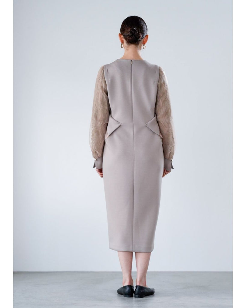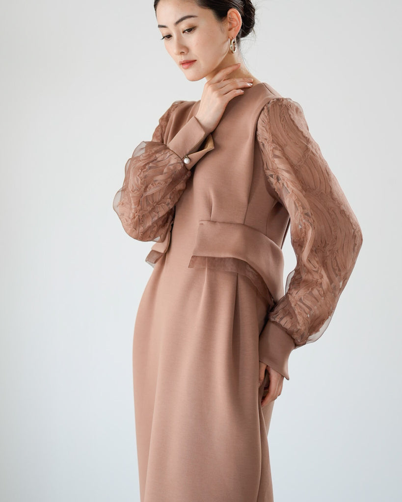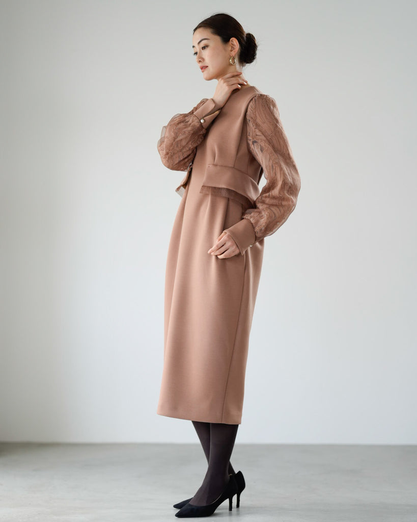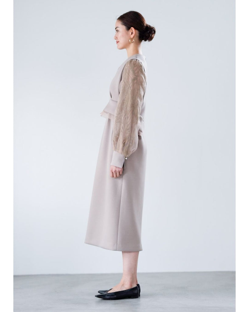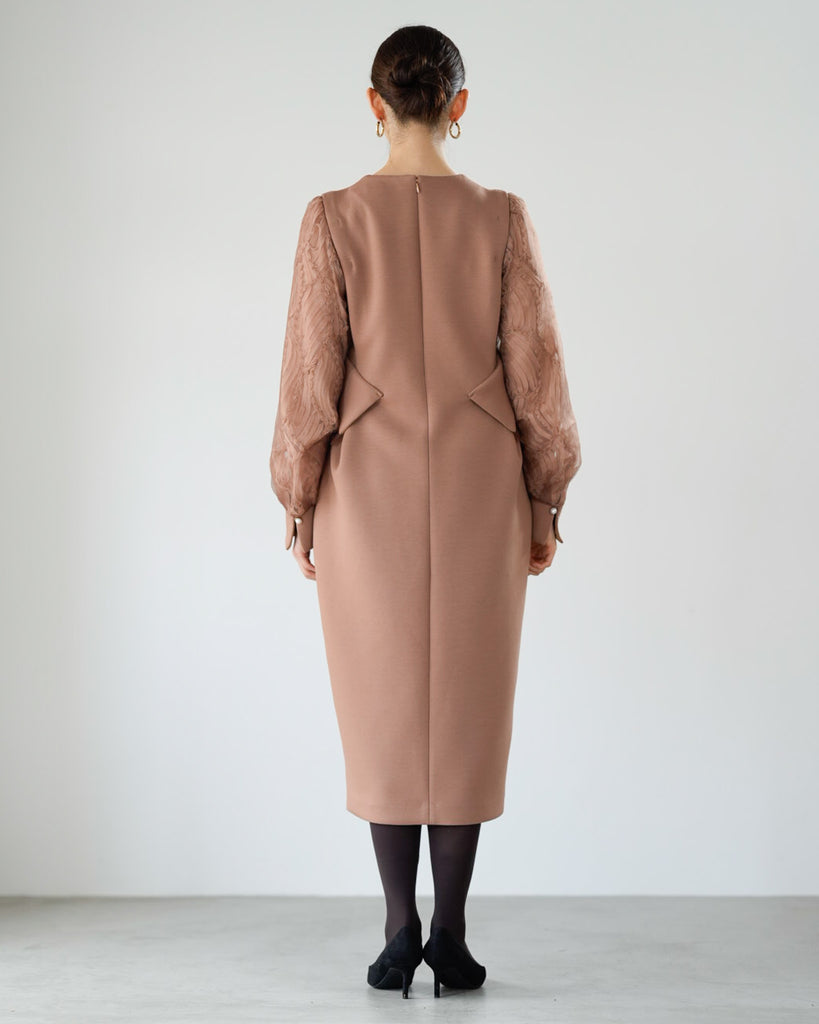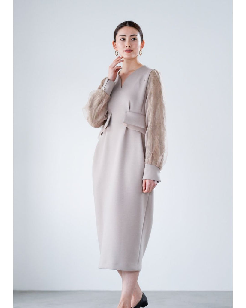 気品と快適さを両立するワンピース。ストレッチ製に優れた中肉のポンチ素材を使用し、しなやかながらもしっかりと厚みがある素材感で身体のラインを拾いすぎず立体的な美しいシルエットを保ちます。着心地も軽く、長時間の着用でもストレスフリー。ヒップにゆとりのあるコクーンラインを採用し、ウエストにはインパクトのあるフラップをつけることでさりげない体型カバー効果も。こだわりのネックラインはデコルテを美しく魅せる曲線的なVライン。顔まわりをすっきりと見せながら、女性らしい柔らかな印象を作ります。一枚で存在感をかもすデザインで食事会や懇親会など日常のイベントから結婚式などオケージョンまで幅広いシーンに対応でき、快適な着心地のワンピースは一枚あると重宝するアイテムです。