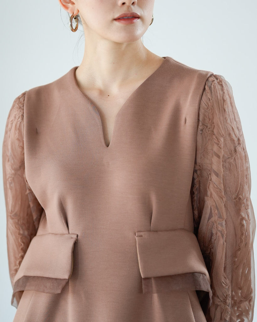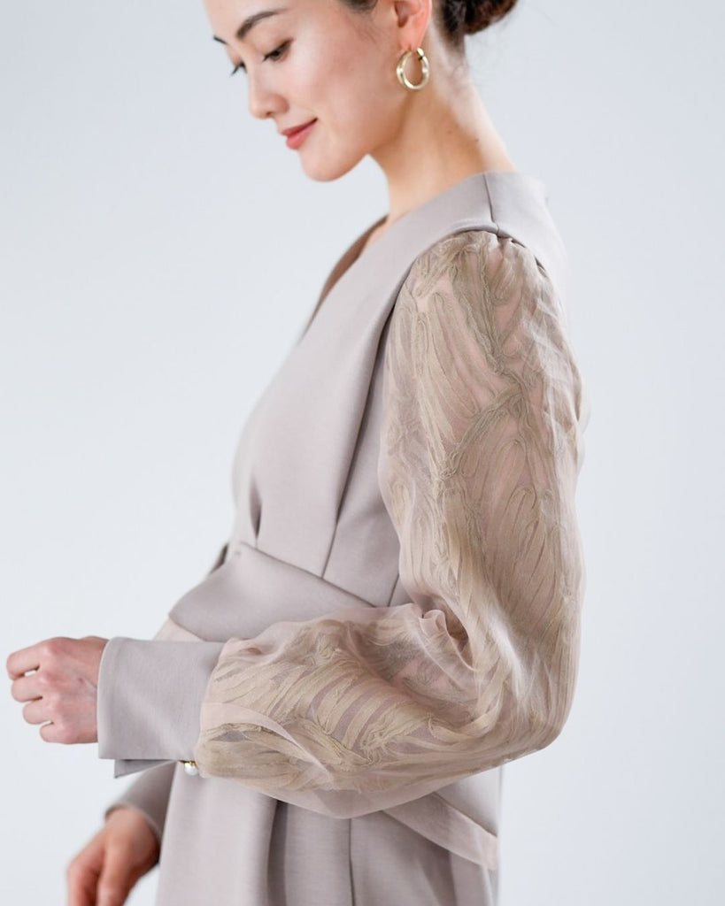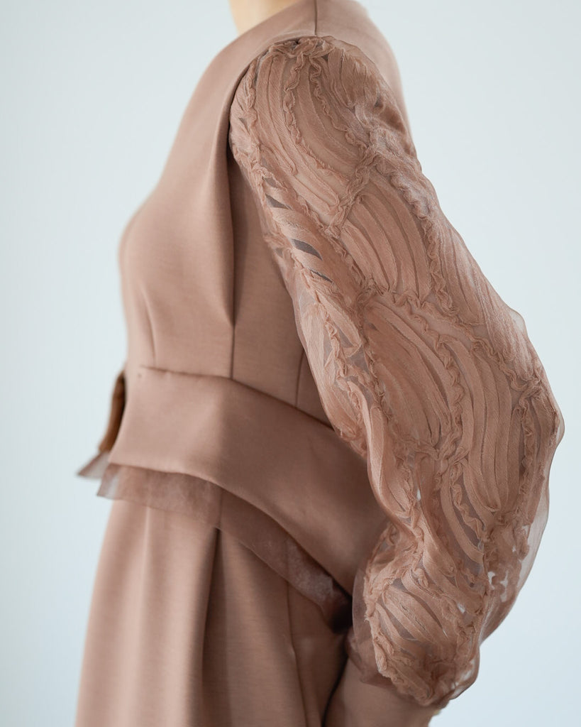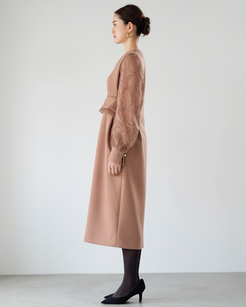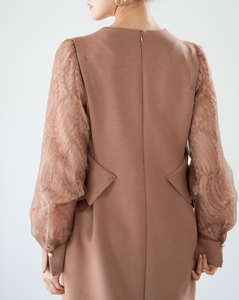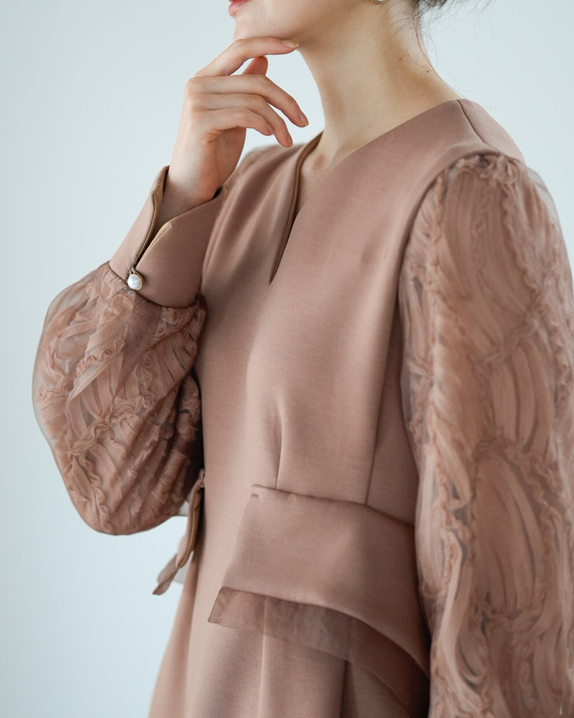 気品と快適さを両立するワンピース。ストレッチ製に優れた中肉のポンチ素材を使用し、しなやかながらもしっかりと厚みがある素材感で身体のラインを拾いすぎず立体的な美しいシルエットを保ちます。着心地も軽く、長時間の着用でもストレスフリー。ヒップにゆとりのあるコクーンラインを採用し、ウエストにはインパクトのあるフラップをつけることでさりげない体型カバー効果も。こだわりのネックラインはデコルテを美しく魅せる曲線的なVライン。顔まわりをすっきりと見せながら、女性らしい柔らかな印象を作ります。一枚で存在感をかもすデザインで食事会や懇親会など日常のイベントから結婚式などオケージョンまで幅広いシーンに対応でき、快適な着心地のワンピースは一枚あると重宝するアイテムです。