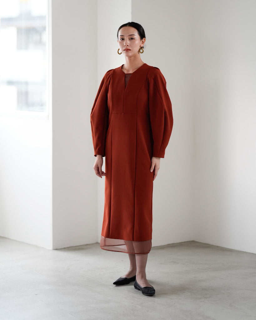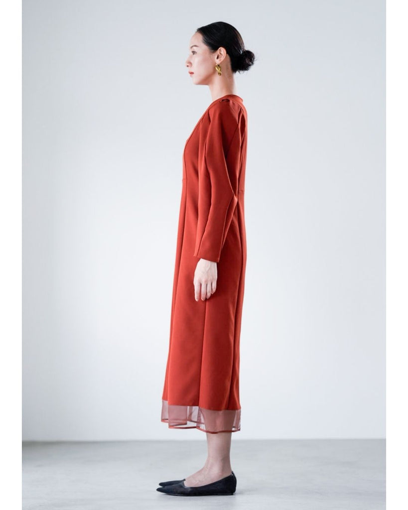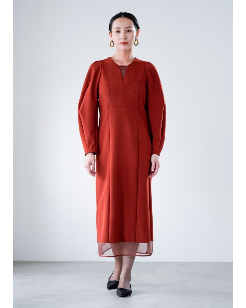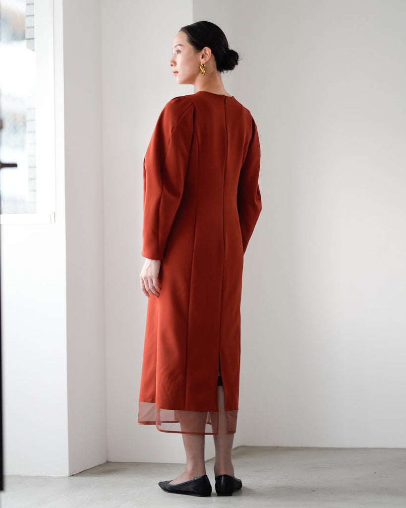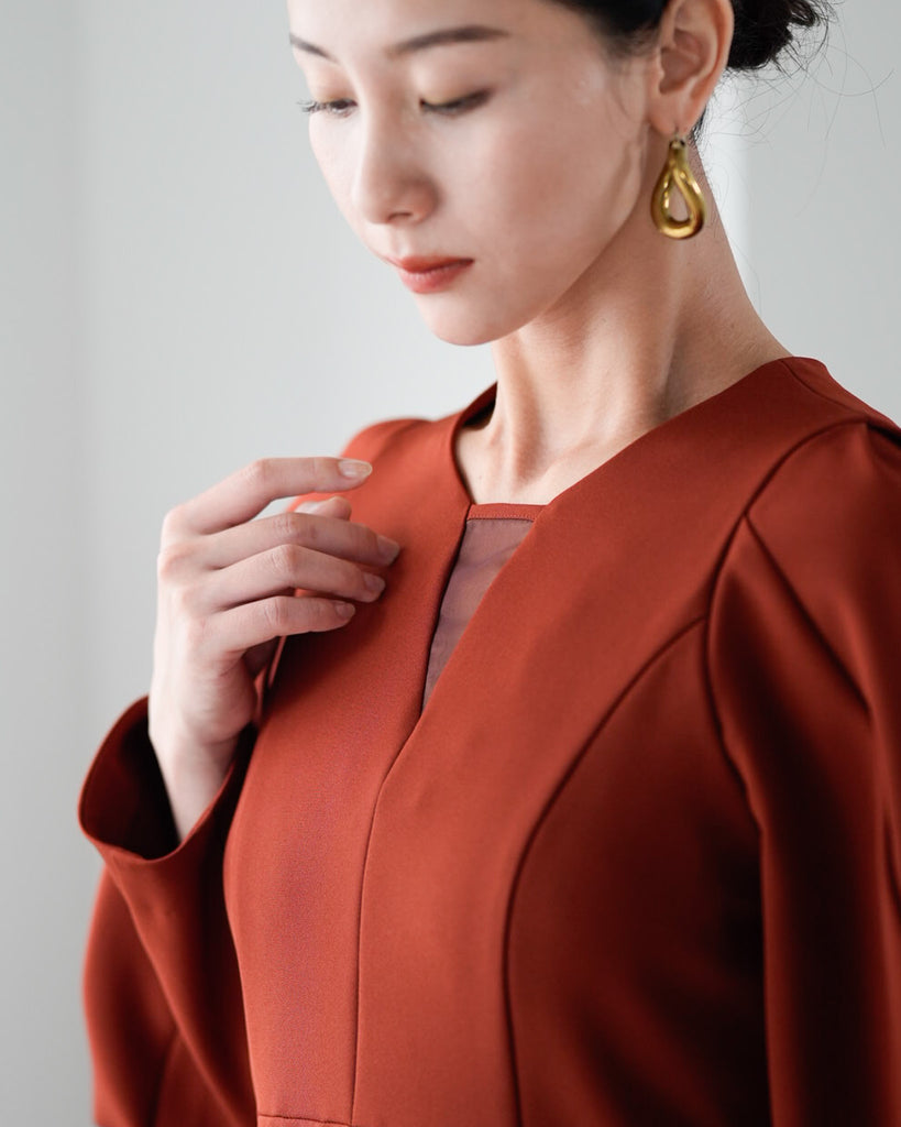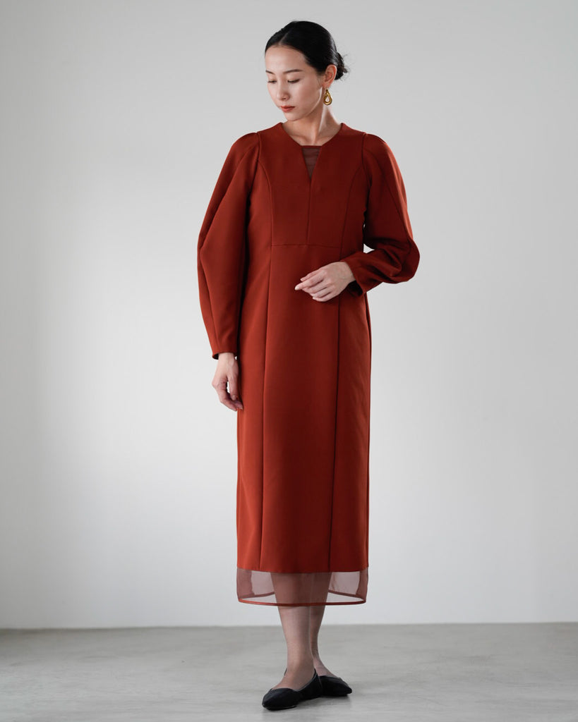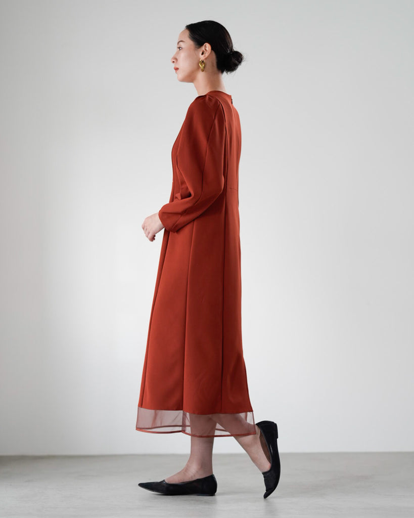 立ち姿を美しく魅せる、特別な日やイベントに最適なワンピース。深みのある美しいテラコッタ系のカラーは肌馴染みがよく、着るだけで華やかに、大人の品格を引き立ててくれます。デコルテと裾にはオーガンジーが施され、デコルテ部分の柔らかな透け感は顔まわりを軽やかに品よく彩り、大人な抜け感を演出します。足元の動くたびに揺れるオーガンジーは全体に軽やかさと女性らしいエレガンスを添え、洗練された印象を与えます。パネルラインで生み出される曲線的なシルエットは立ち姿を凛と見せ、付かず離れずのゆとりで気になるヒップラインをカバーしながら、スラリとしたIライン効果も。優雅なドレープがシルエットをより一層美しく見せてくれる一着です。アクセサリーや小物の合わせ次第で着る人の個性を引き立て、少し特別なおでかけから、結婚式などのオケージョンにも活躍します。