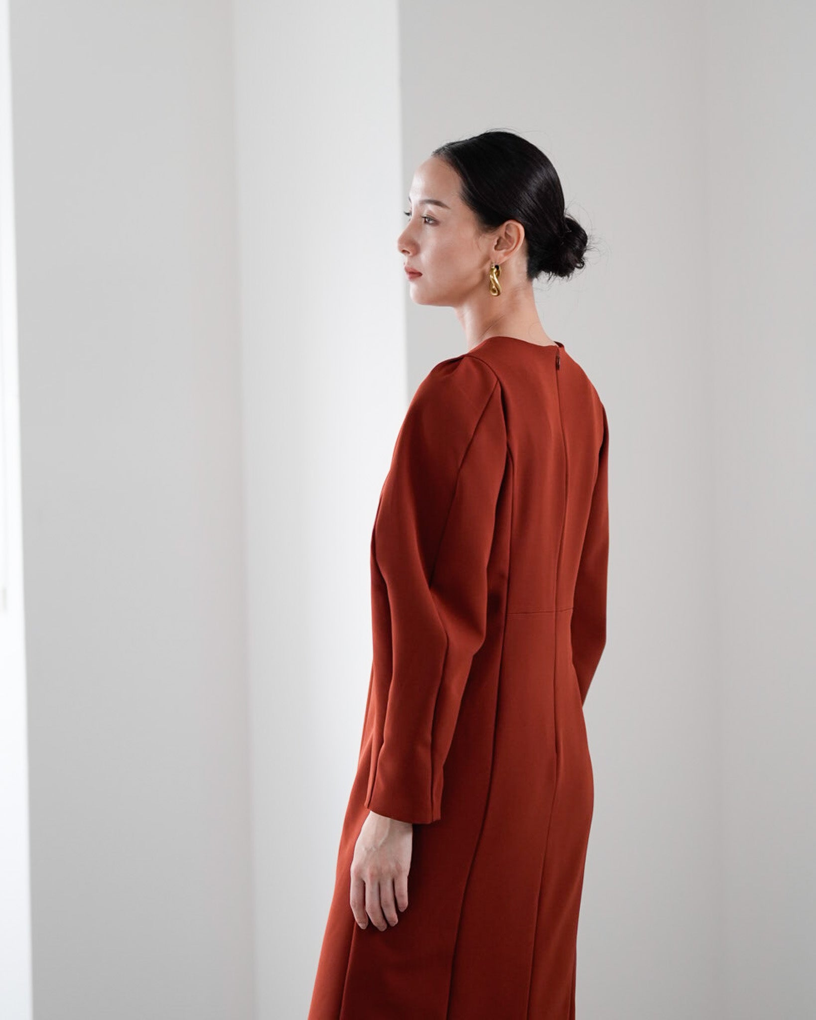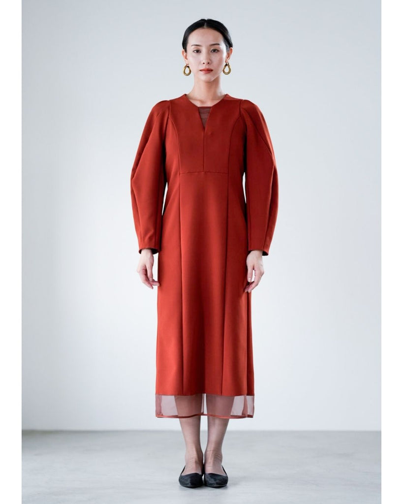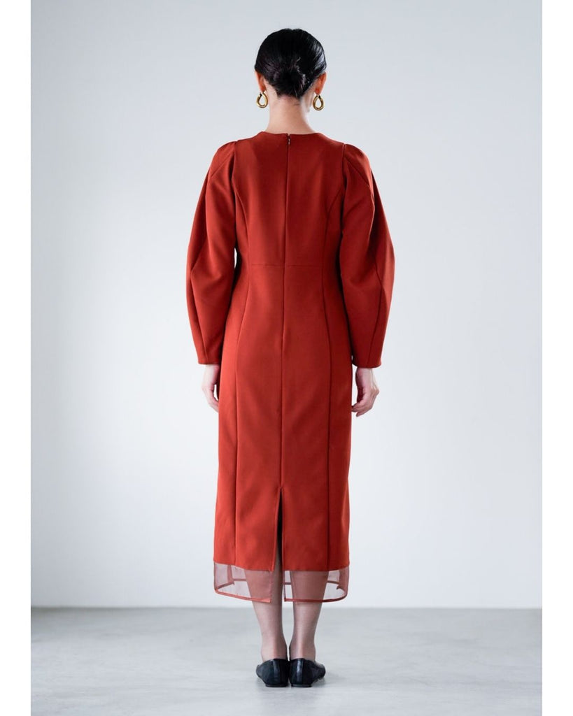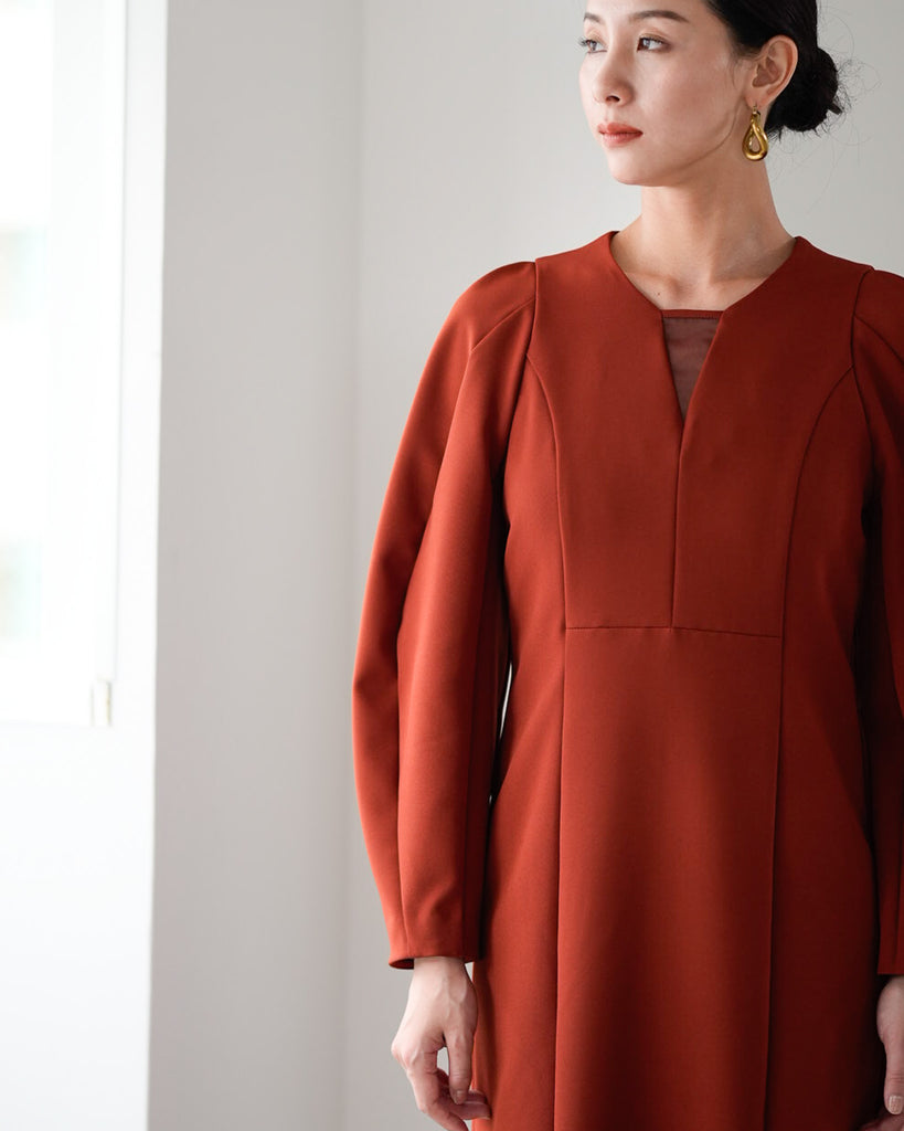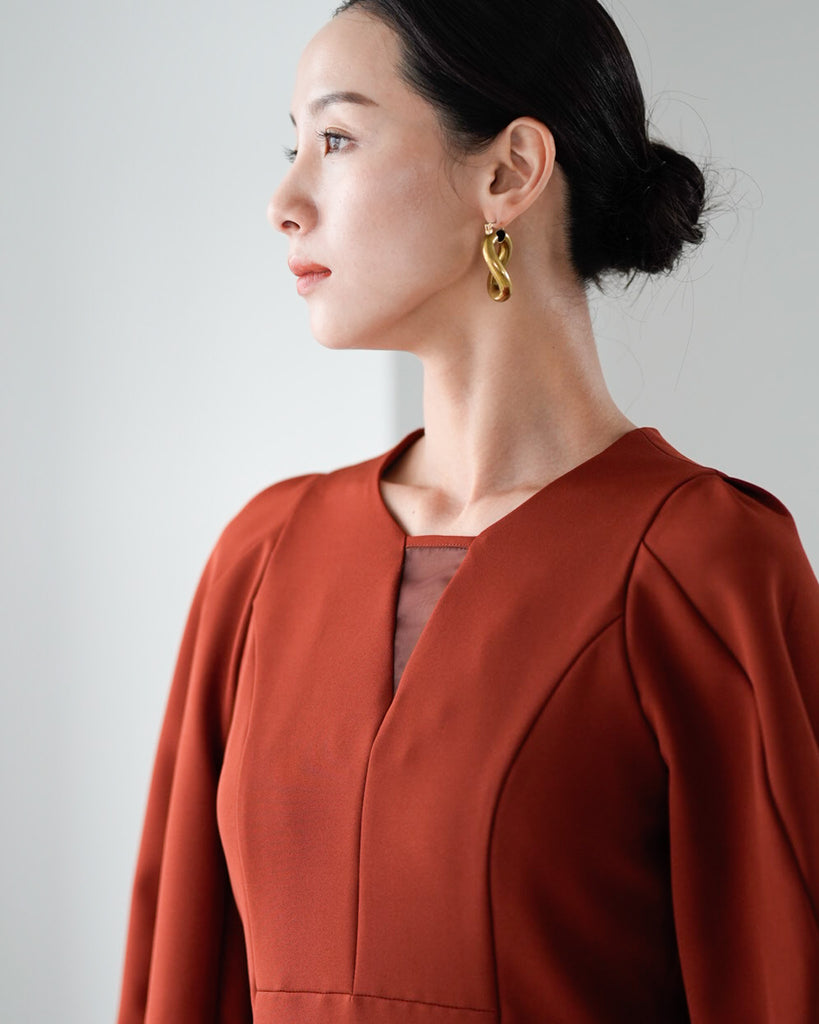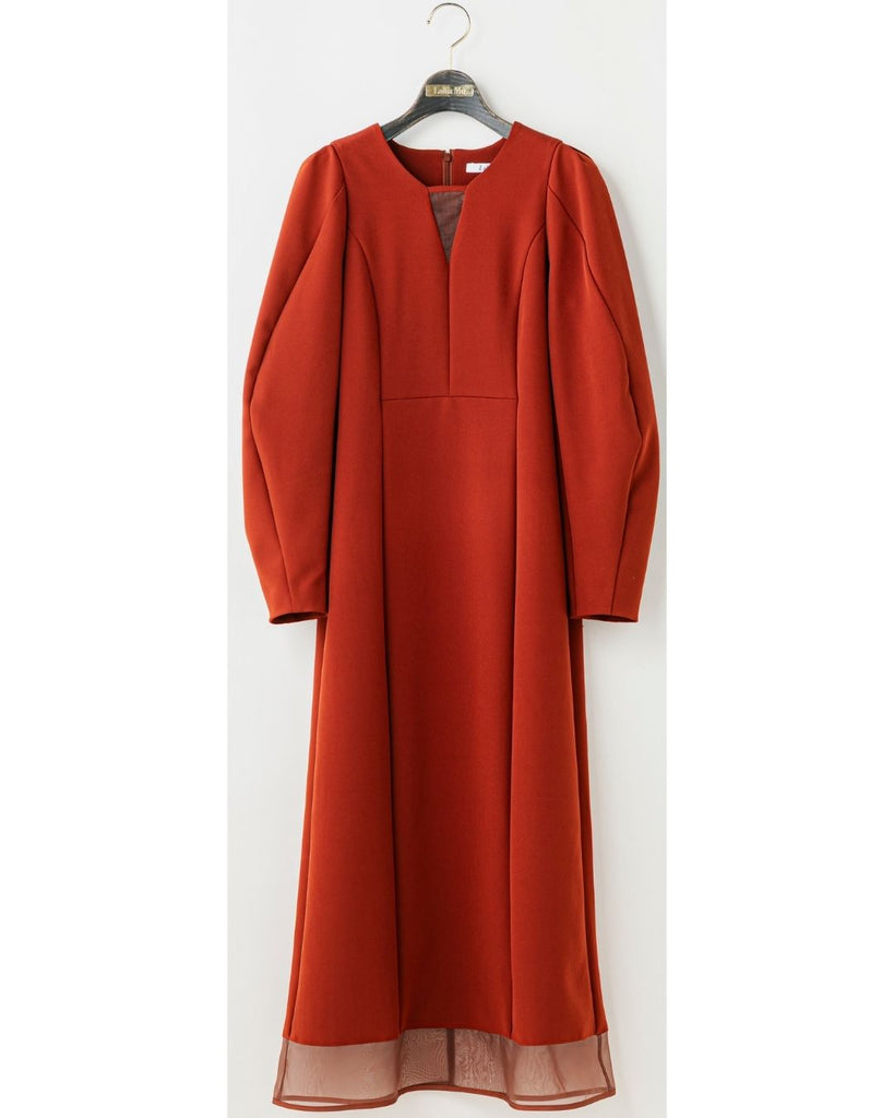 立ち姿を美しく魅せる、特別な日やイベントに最適なワンピース。深みのある美しいテラコッタ系のカラーは肌馴染みがよく、着るだけで華やかに、大人の品格を引き立ててくれます。デコルテと裾にはオーガンジーが施され、デコルテ部分の柔らかな透け感は顔まわりを軽やかに品よく彩り、大人な抜け感を演出します。足元の動くたびに揺れるオーガンジーは全体に軽やかさと女性らしいエレガンスを添え、洗練された印象を与えます。パネルラインで生み出される曲線的なシルエットは立ち姿を凛と見せ、付かず離れずのゆとりで気になるヒップラインをカバーしながら、スラリとしたIライン効果も。優雅なドレープがシルエットをより一層美しく見せてくれる一着です。アクセサリーや小物の合わせ次第で着る人の個性を引き立て、少し特別なおでかけから、結婚式などのオケージョンにも活躍します。
