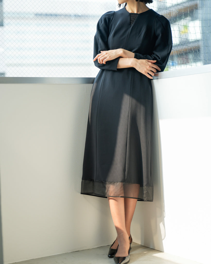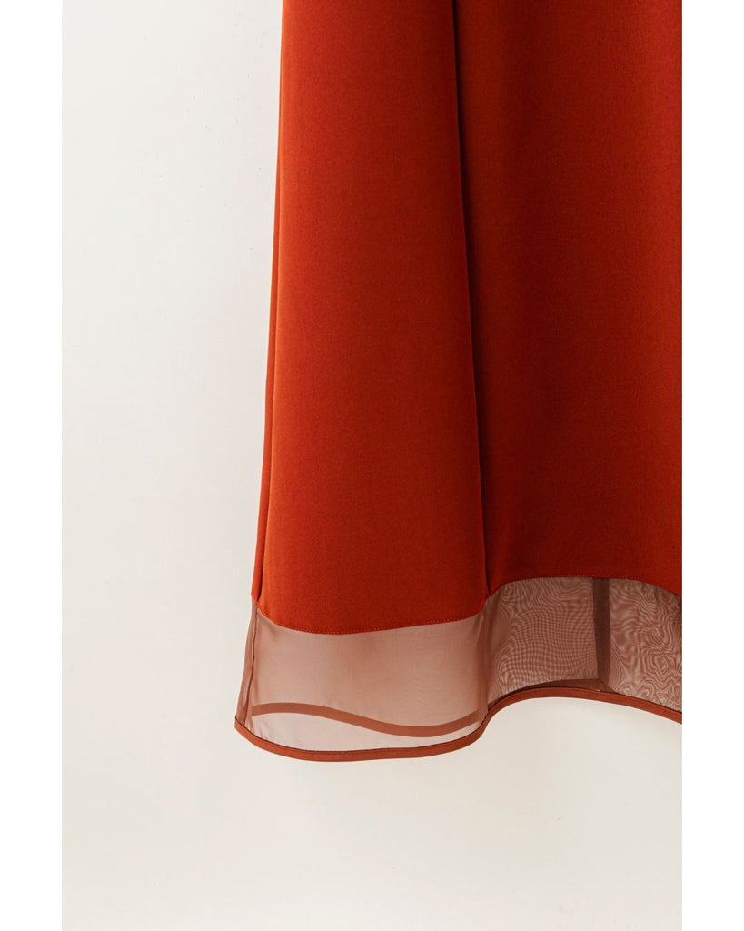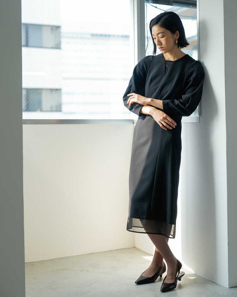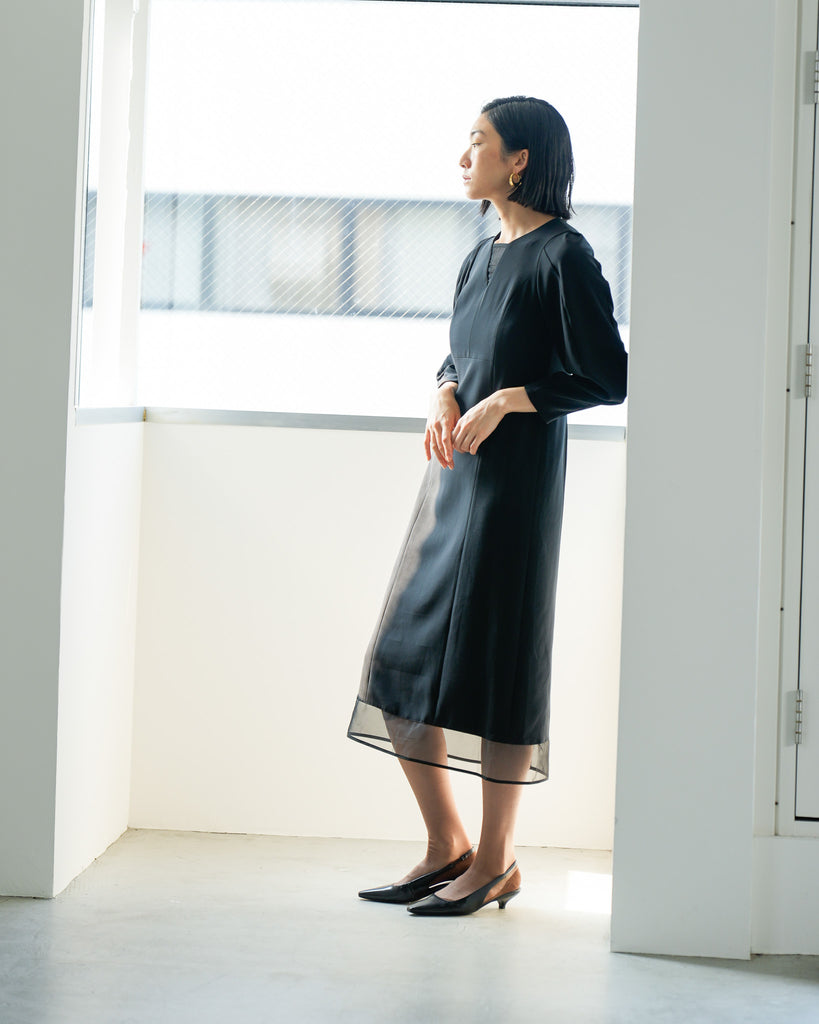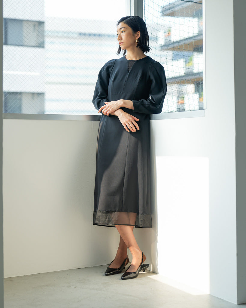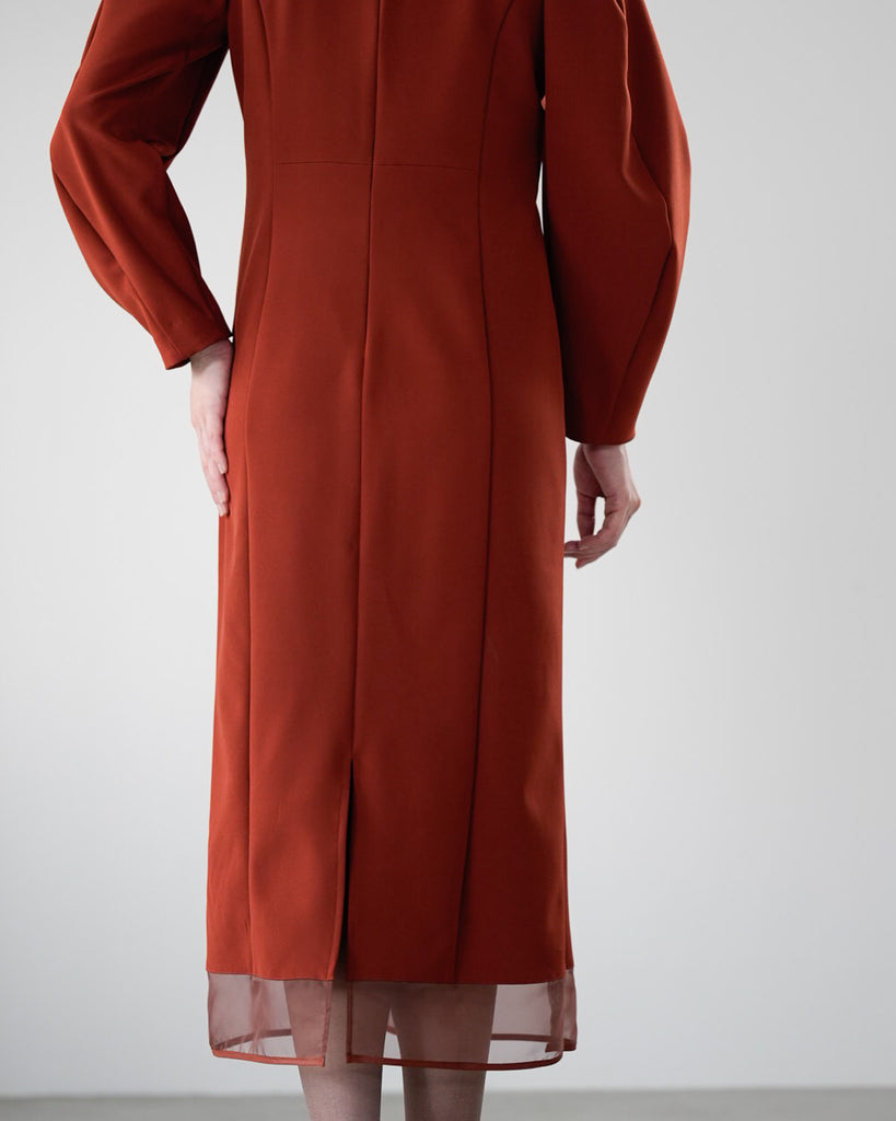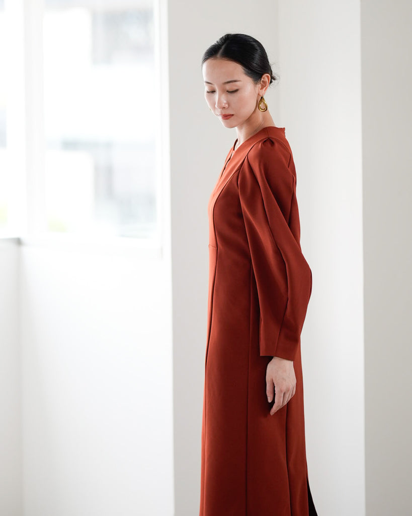立ち姿を美しく魅せる、特別な日やイベントに最適なワンピース。深みのある美しいテラコッタ系のカラーは肌馴染みがよく、着るだけで華やかに、大人の品格を引き立ててくれます。デコルテと裾にはオーガンジーが施され、デコルテ部分の柔らかな透け感は顔まわりを軽やかに品よく彩り、大人な抜け感を演出します。足元の動くたびに揺れるオーガンジーは全体に軽やかさと女性らしいエレガンスを添え、洗練された印象を与えます。パネルラインで生み出される曲線的なシルエットは立ち姿を凛と見せ、付かず離れずのゆとりで気になるヒップラインをカバーしながら、スラリとしたIライン効果も。優雅なドレープがシルエットをより一層美しく見せてくれる一着です。アクセサリーや小物の合わせ次第で着る人の個性を引き立て、少し特別なおでかけから、結婚式などのオケージョンにも活躍します。