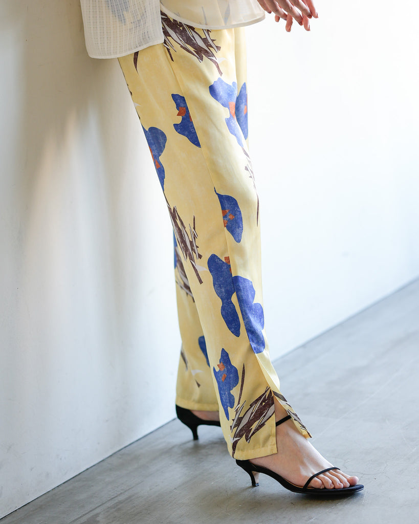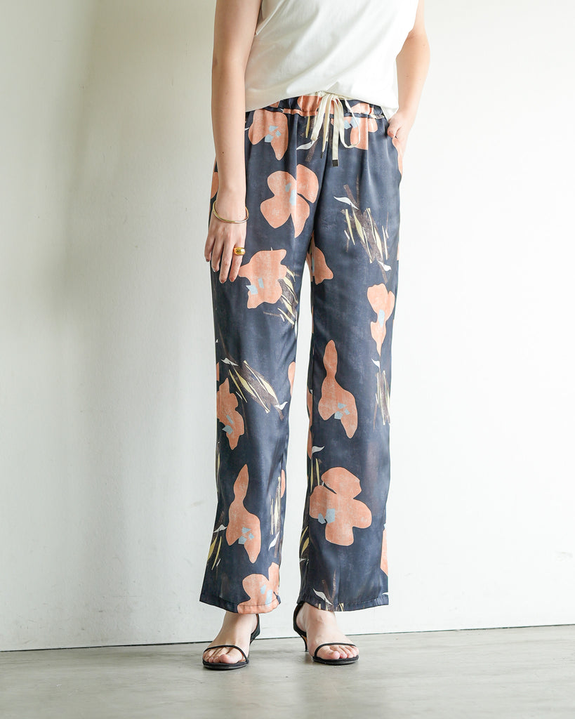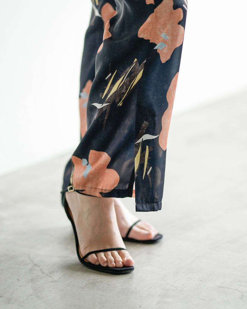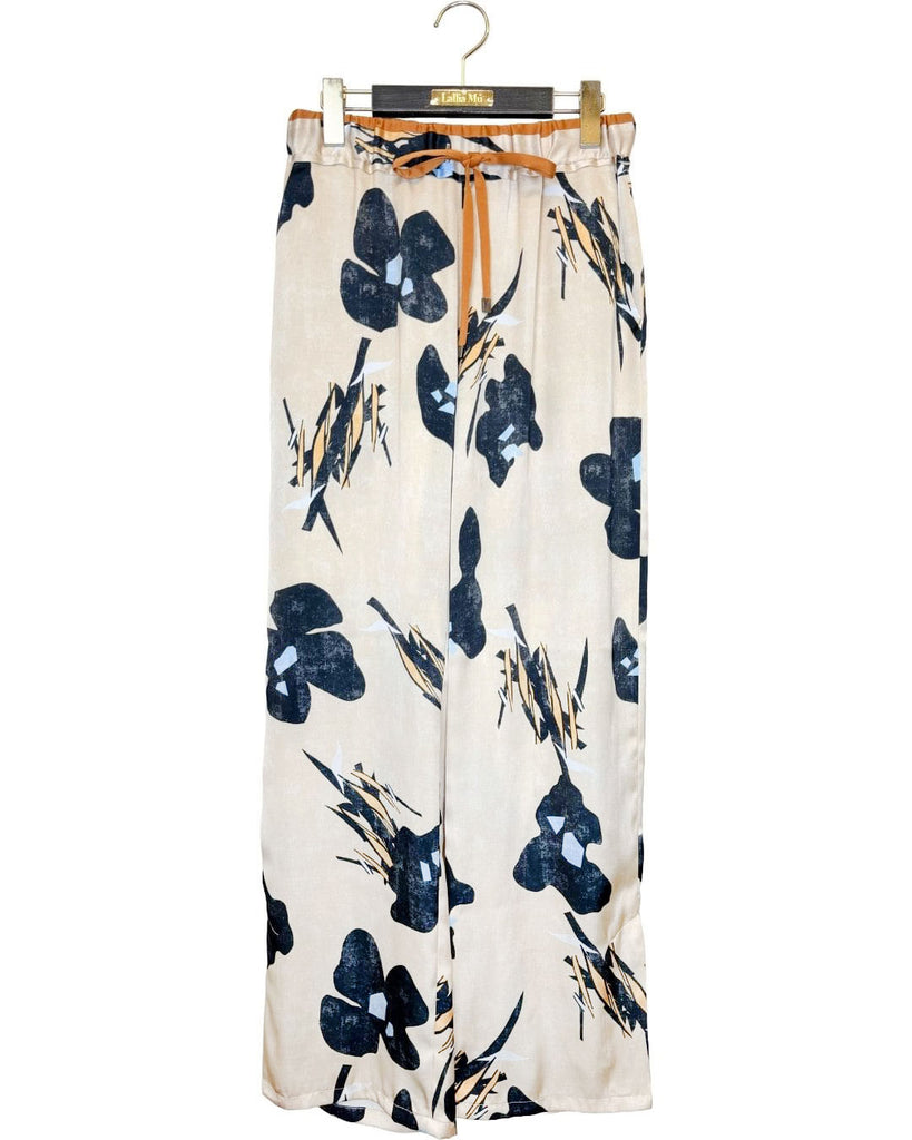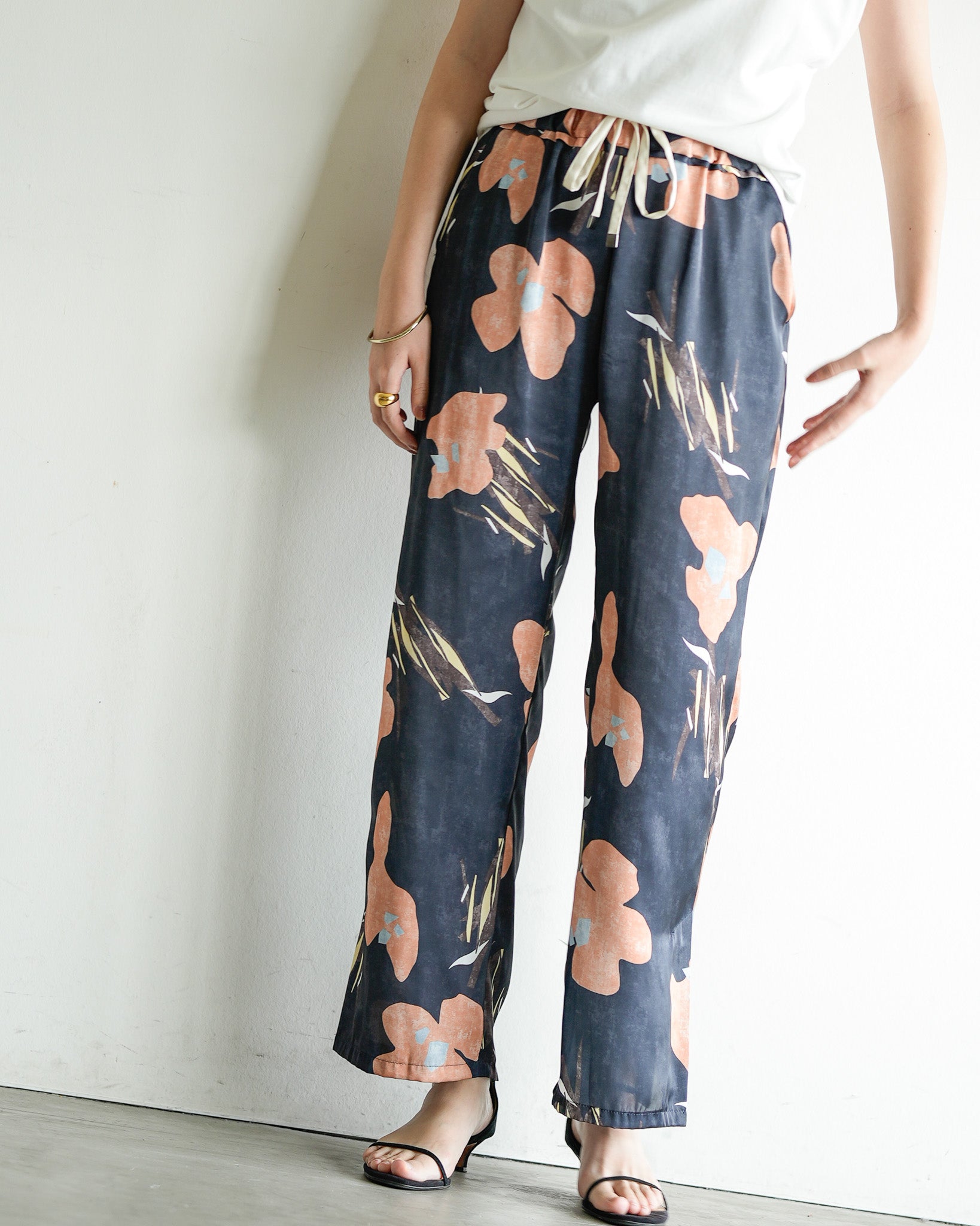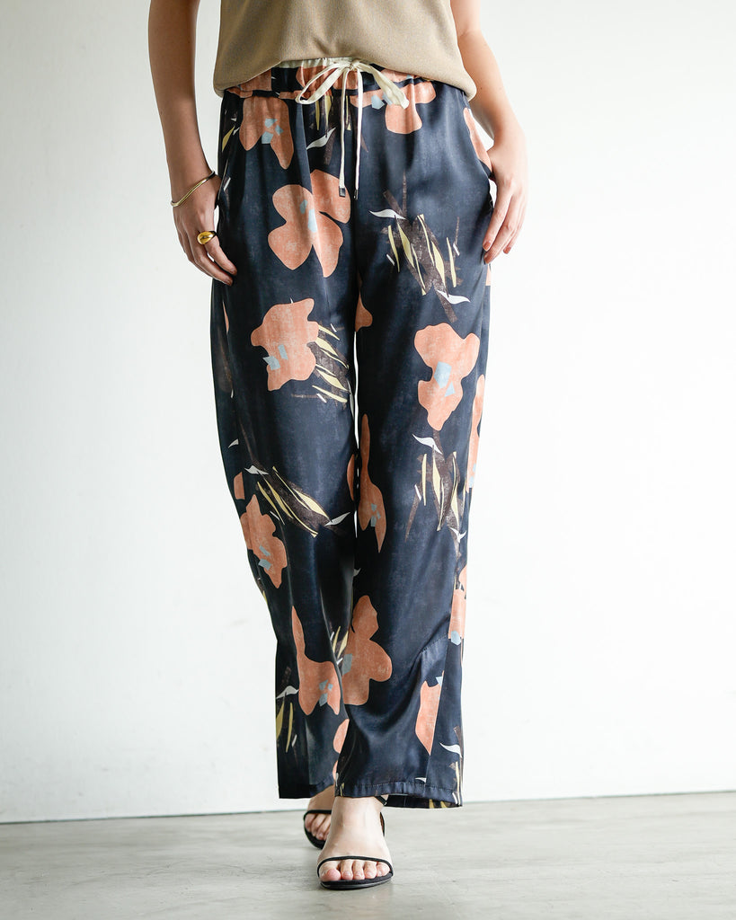 ラリア・ムーの企画チームが一から制作した、オリジナルサテンのプリント生地を使用したイージーパンツ。ウエストは総ゴム仕様で、締め付け感がなくストレスフリーな穿き心地。レッグラインを拾いすぎない生地感と、美脚に見せるパターン設計で、柄のパンツもカジュアルになりすぎず、上品なムードを保ちます。素足が見えにくい仕様の裾のベンツは足元に夏らしい抜け感をプラスしてくれます。