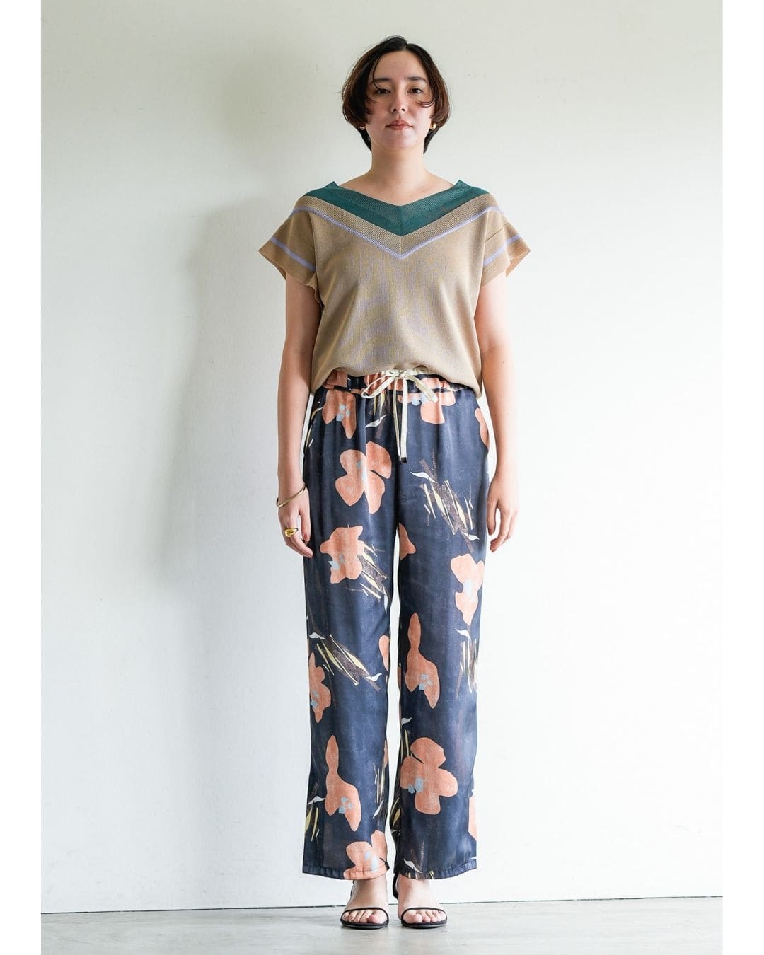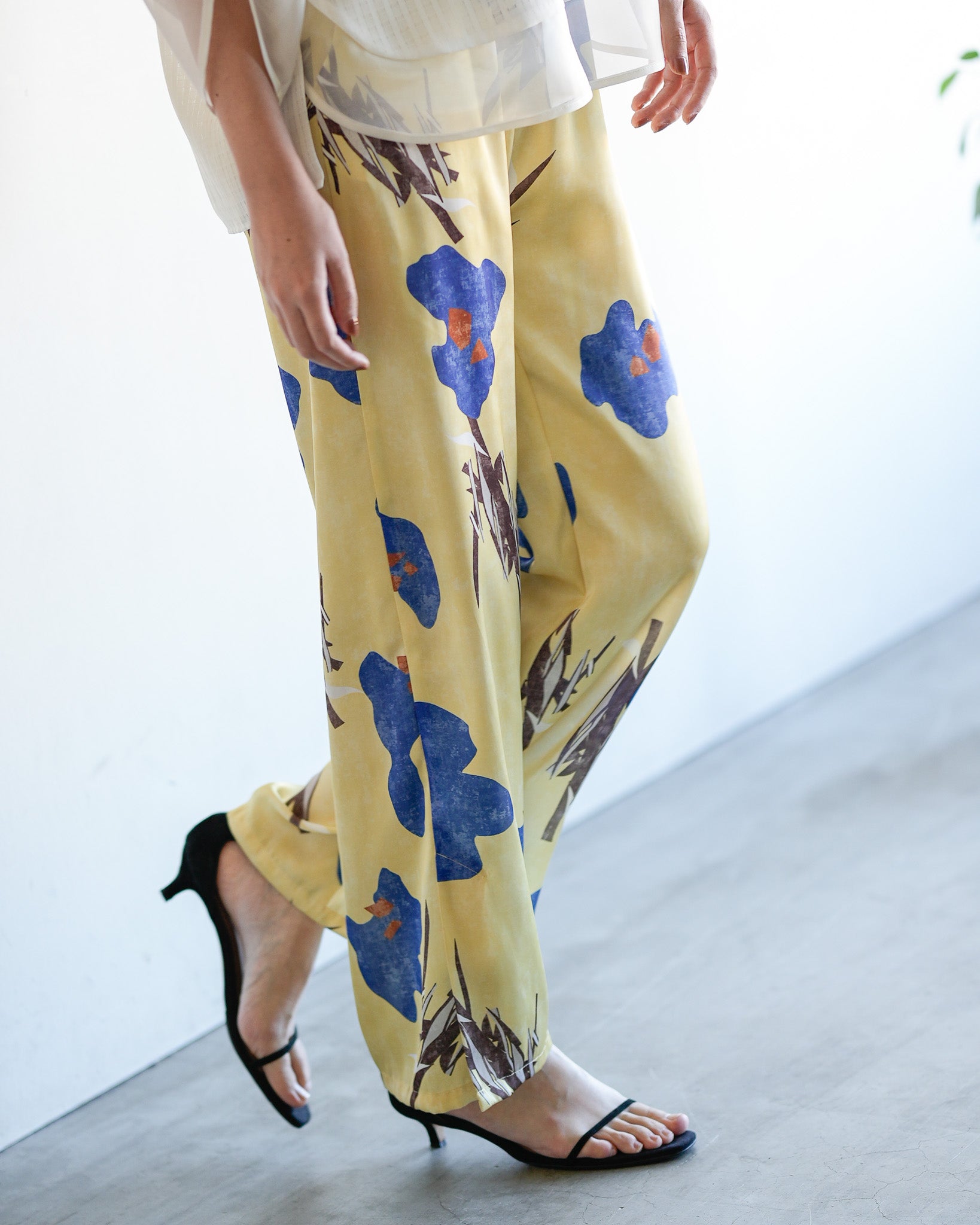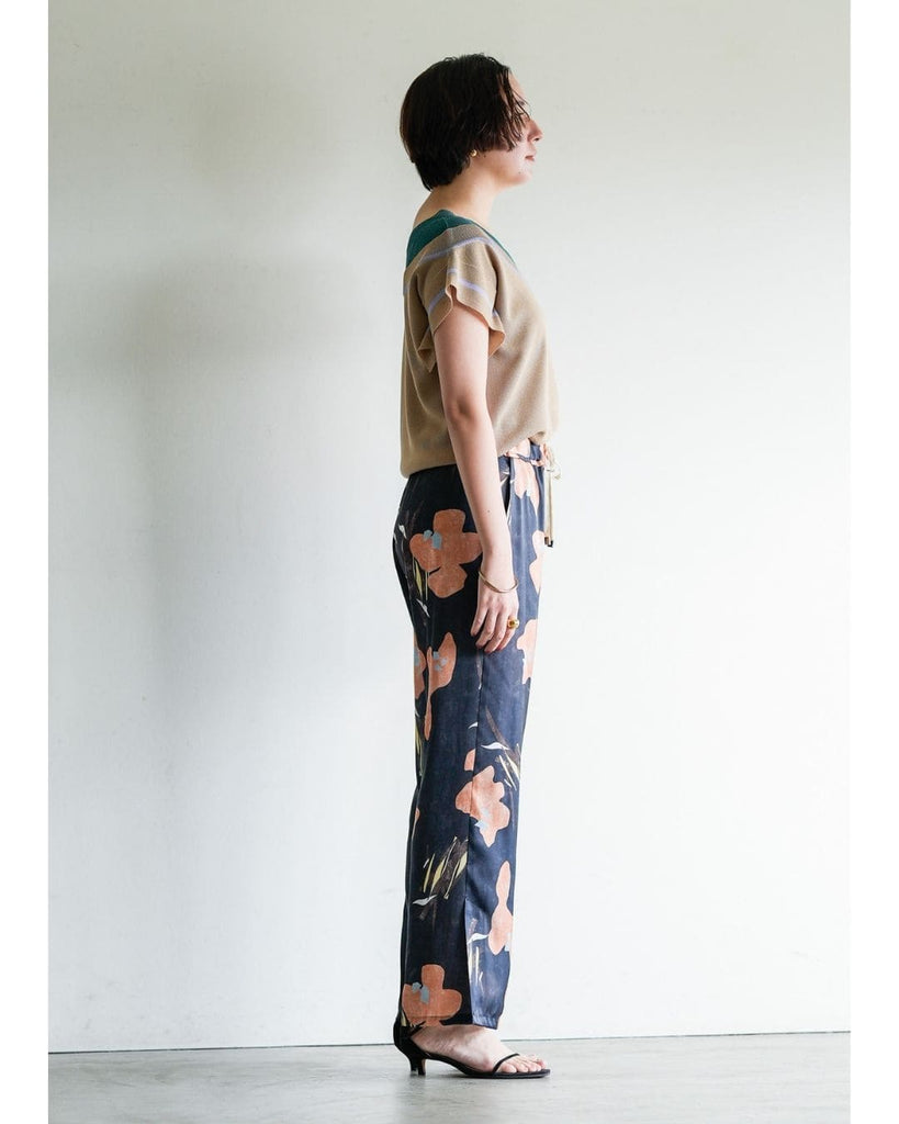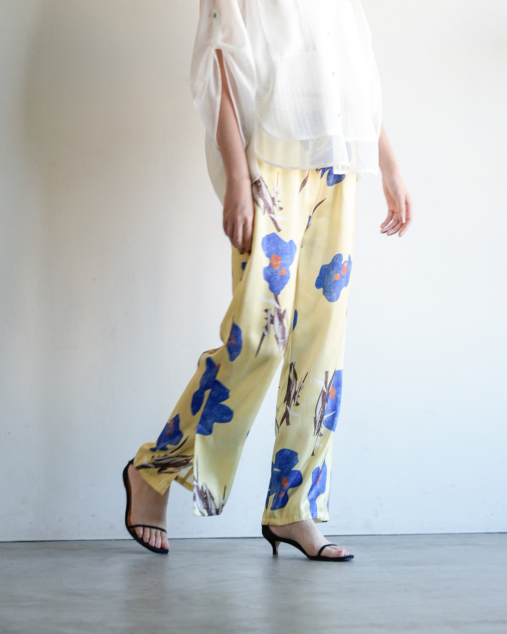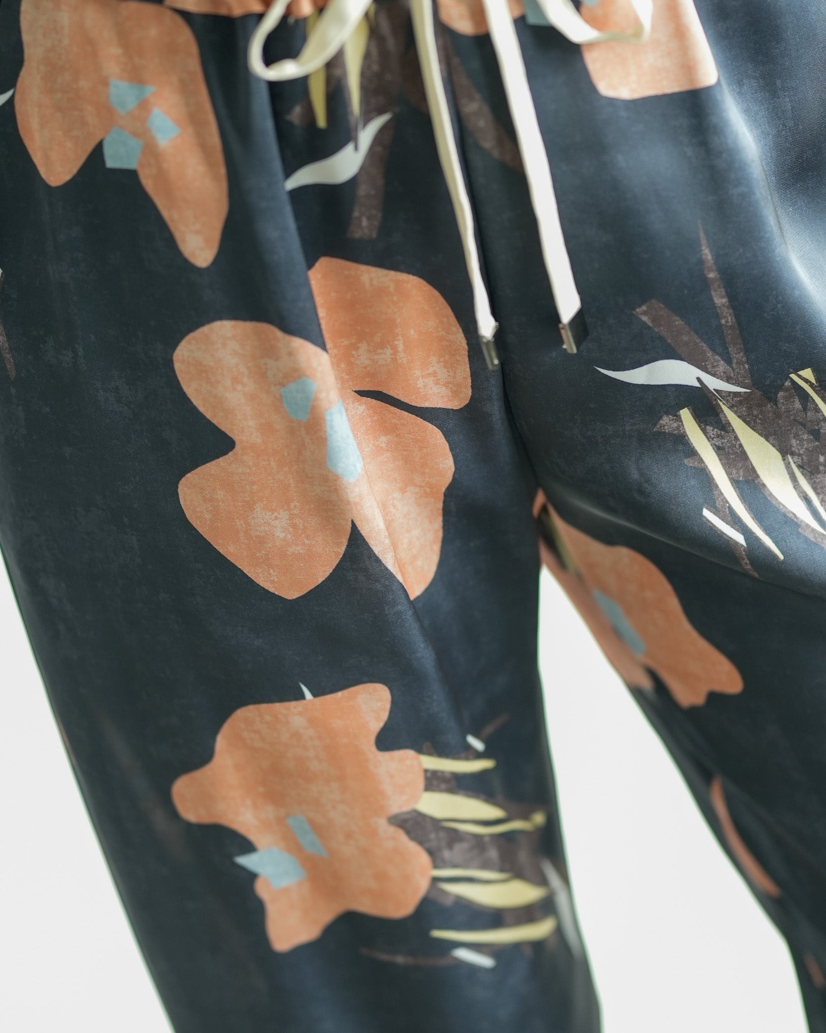 ラリア・ムーの企画チームが一から制作した、オリジナルサテンのプリント生地を使用したイージーパンツ。ウエストは総ゴム仕様で、締め付け感がなくストレスフリーな穿き心地。レッグラインを拾いすぎない生地感と、美脚に見せるパターン設計で、柄のパンツもカジュアルになりすぎず、上品なムードを保ちます。素足が見えにくい仕様の裾のベンツは足元に夏らしい抜け感をプラスしてくれます。